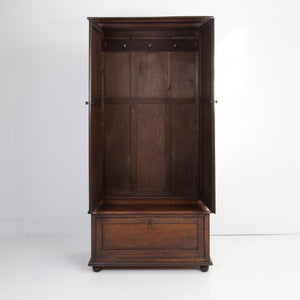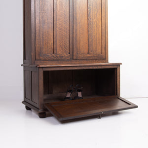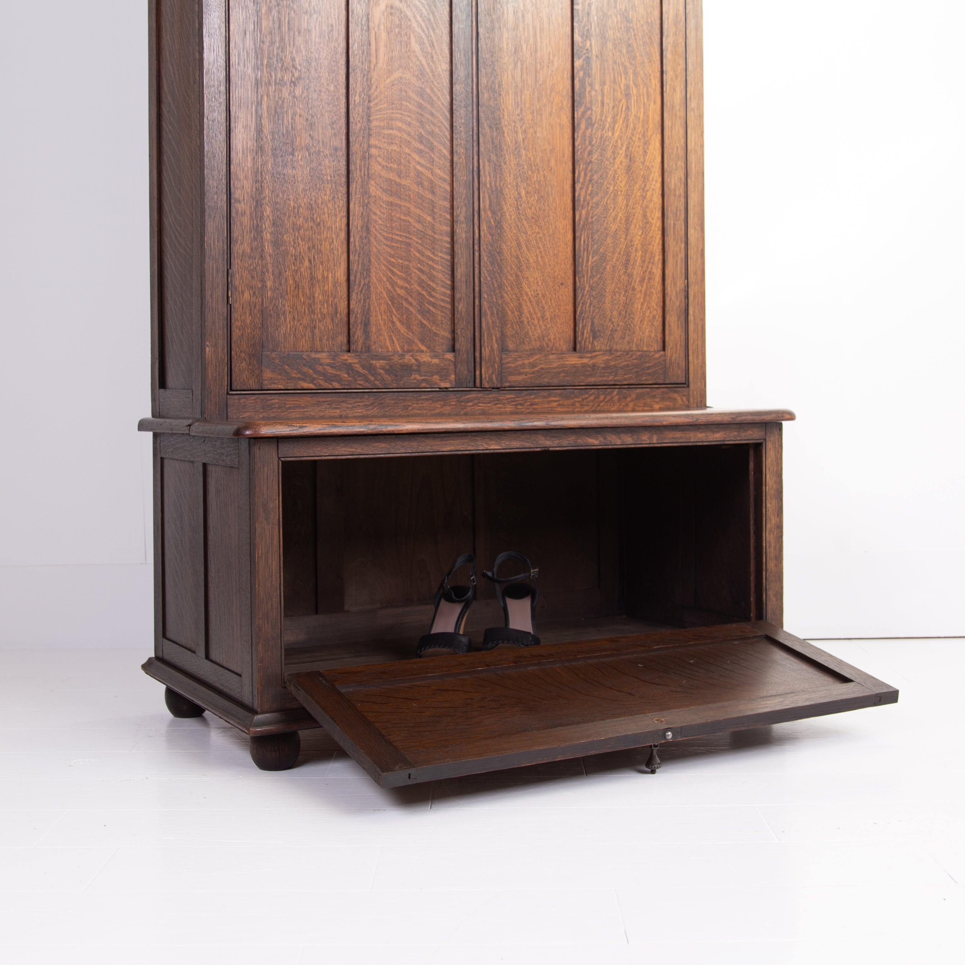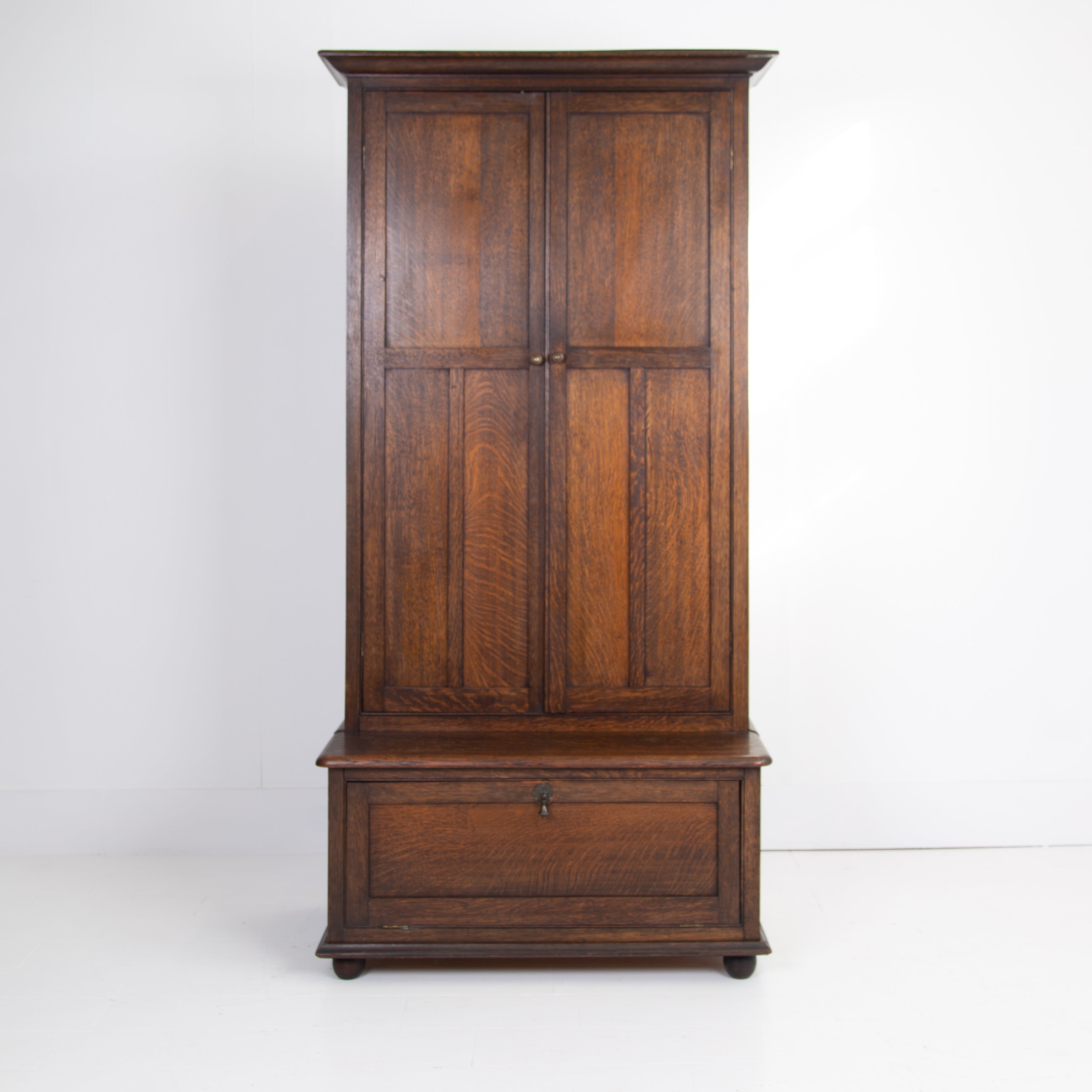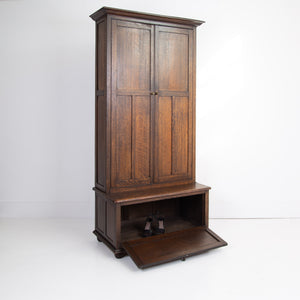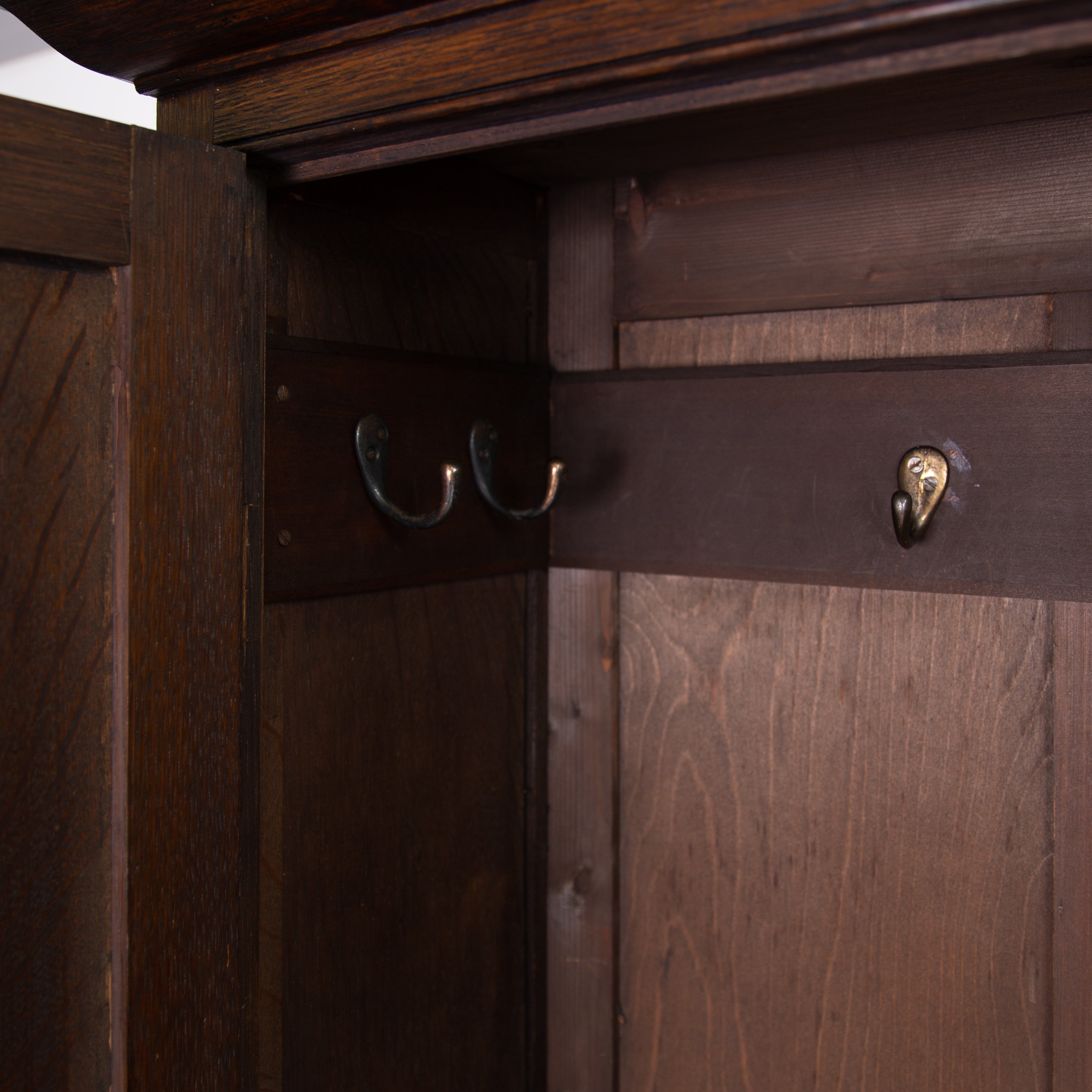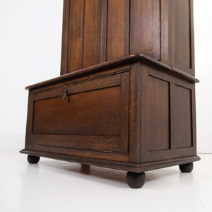 The two long doors hide a number of hooks likely for coats or perhaps it may originally have been a church piece for the storage of cassocks. Underneath this we have a drop down door exposing a long cupboard space for shoes, trainers and slippers. The piece sits in good historical order with age knocks and bumps. We have cleaned the piece and ensured its ready to place.