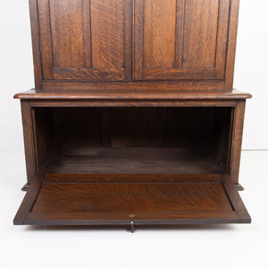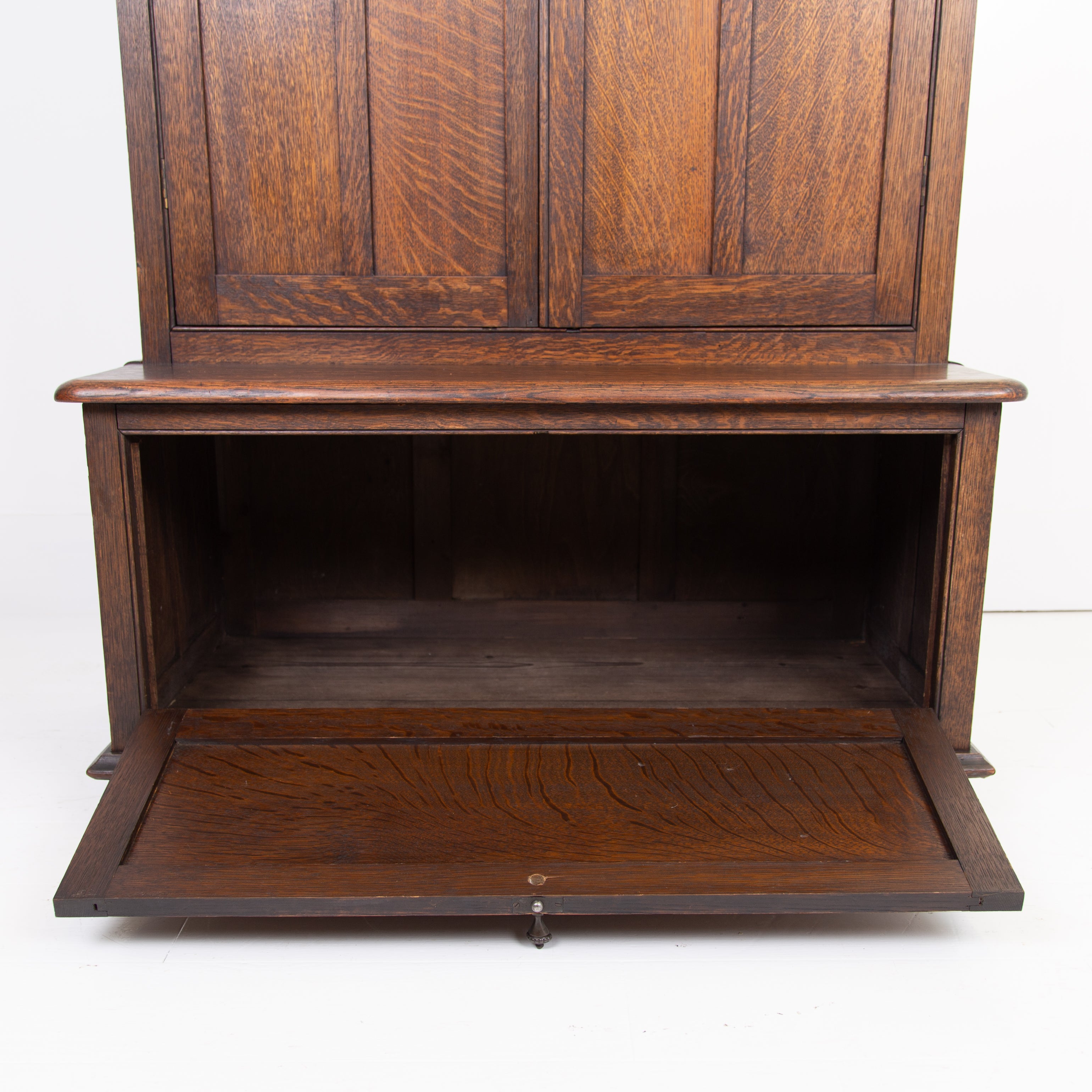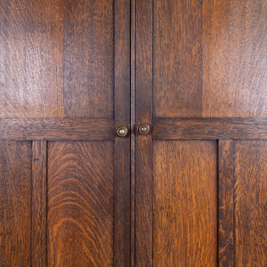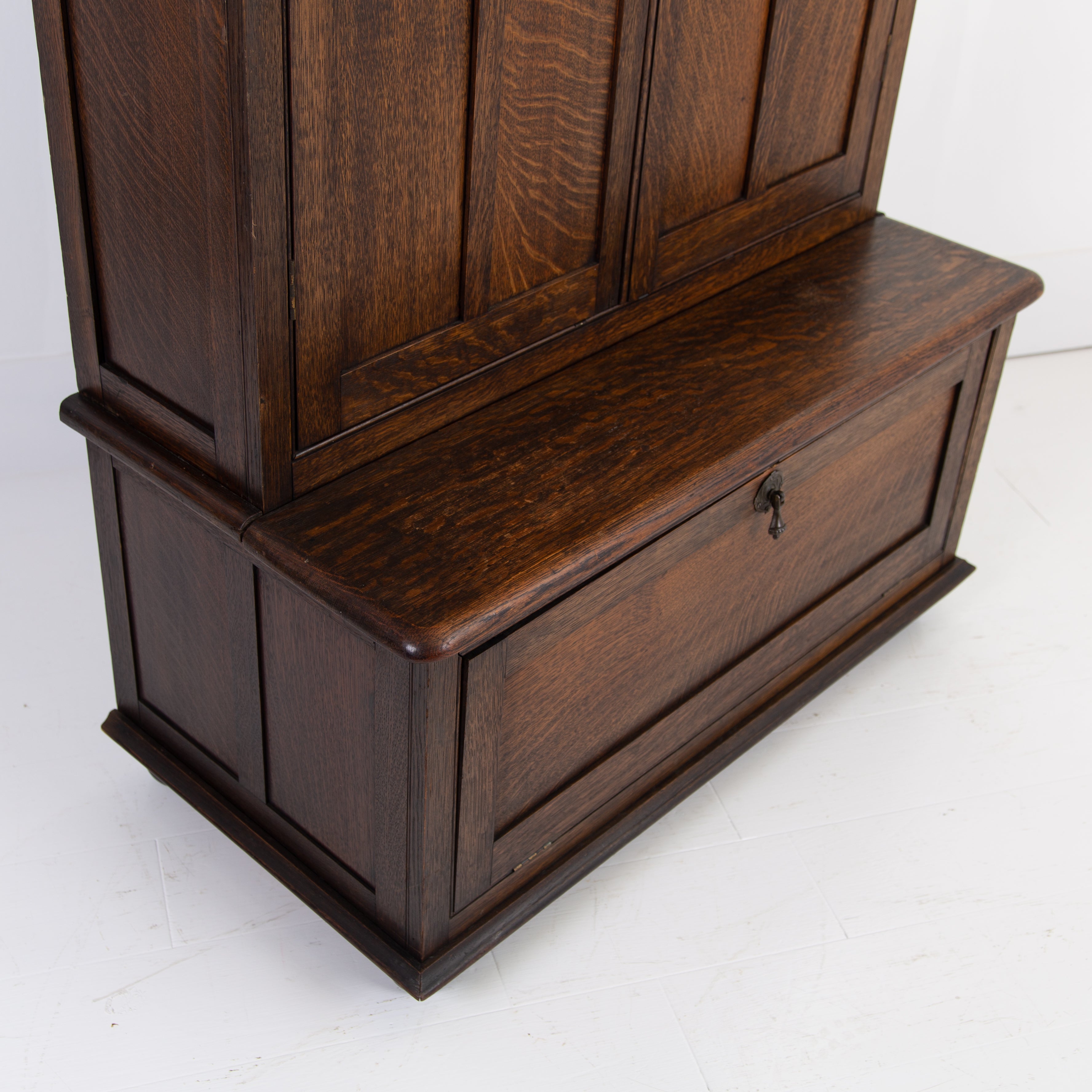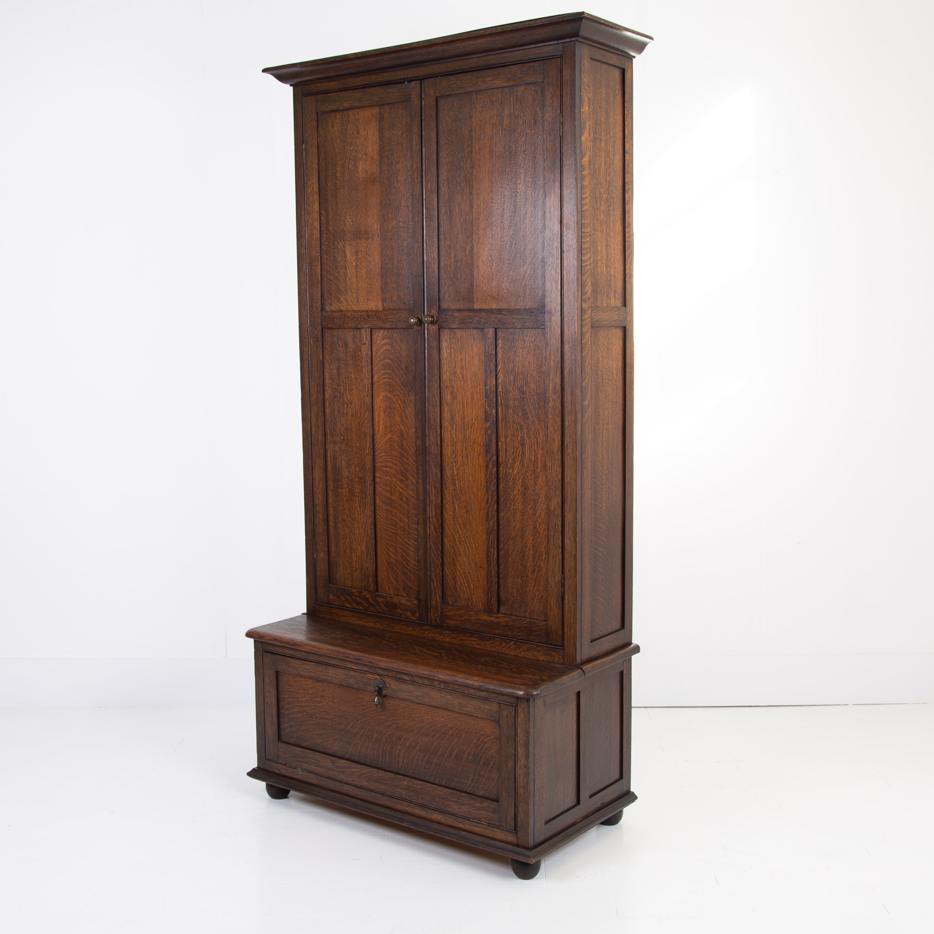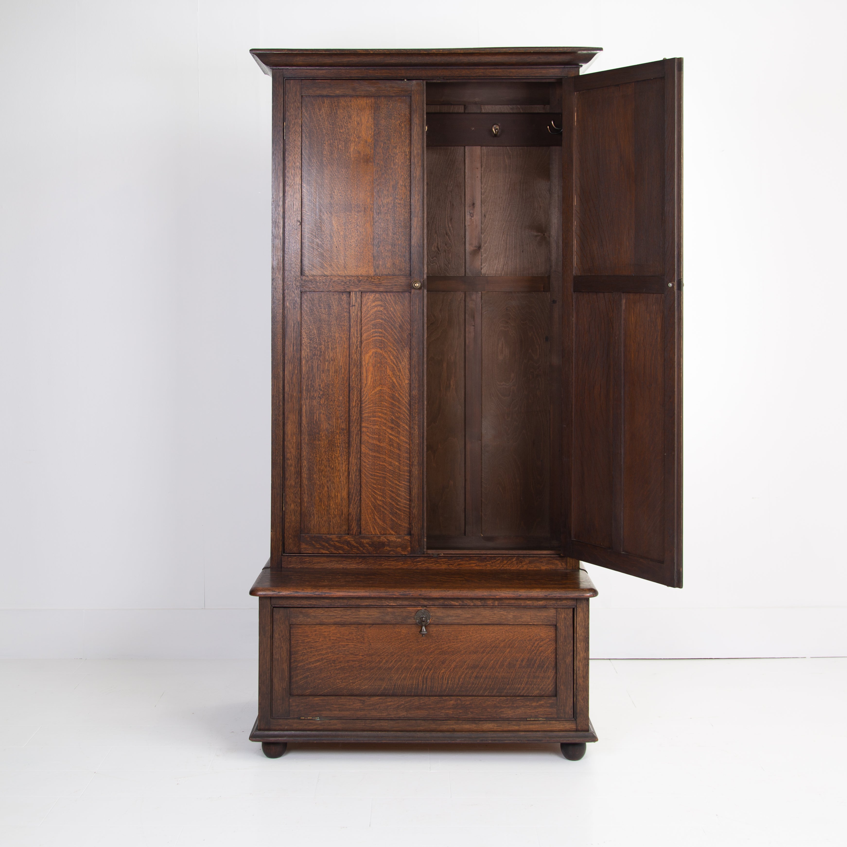 The two long doors hide a number of hooks likely for coats or perhaps it may originally have been a church piece for the storage of cassocks. Underneath this we have a drop down door exposing a long cupboard space for shoes, trainers and slippers. The piece sits in good historical order with age knocks and bumps. We have cleaned the piece and ensured its ready to place.