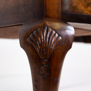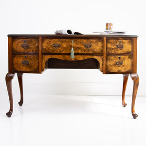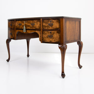 Lovely looking and good quality 1930s English 5 drawer desk with burr walnut to the drawers and top and sitting on cabriole legs with shell motif and pad feet.