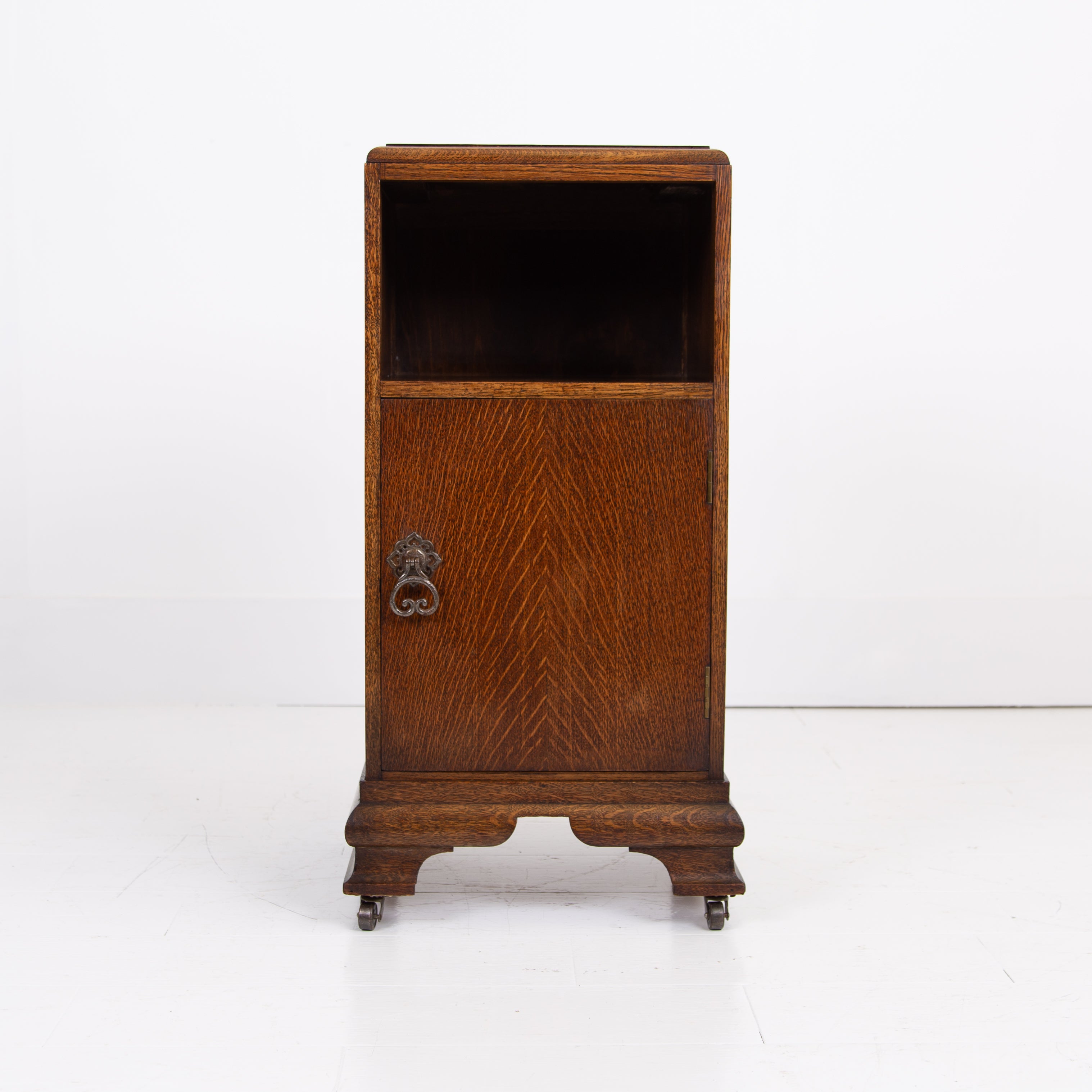 We have a good looking oak side cabinet C1930s which could be placed in the bedroom, small hallway or maybe the living room. The design is attractive on this one - we have original iron castors sitting under the ogee style bracket feet on which a single cupboard sits with an open space above this, with the top having a small upstand. The cabinet also benefits from a glass top if required…