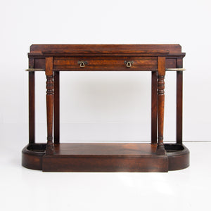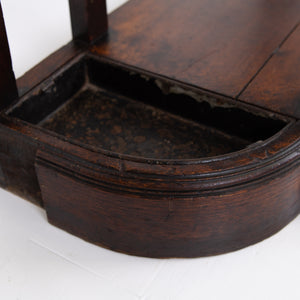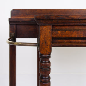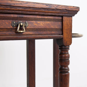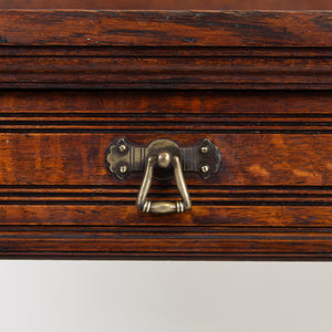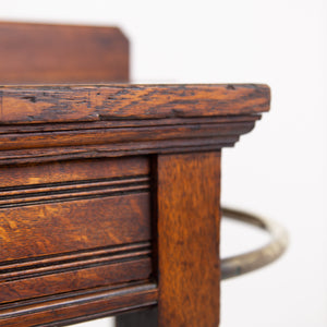 We're loving the look and style of this one, a recent find alongside a few oak chests of drawers. It has a rather grand look and feel to it with its curved brass, turned oak supports to the front, well toned oak and overall scale. It survives in pretty much untouched condition and is pleasingly complete with both shaped drip trays, well cast brass handles to the slender drawer and low back plinth.