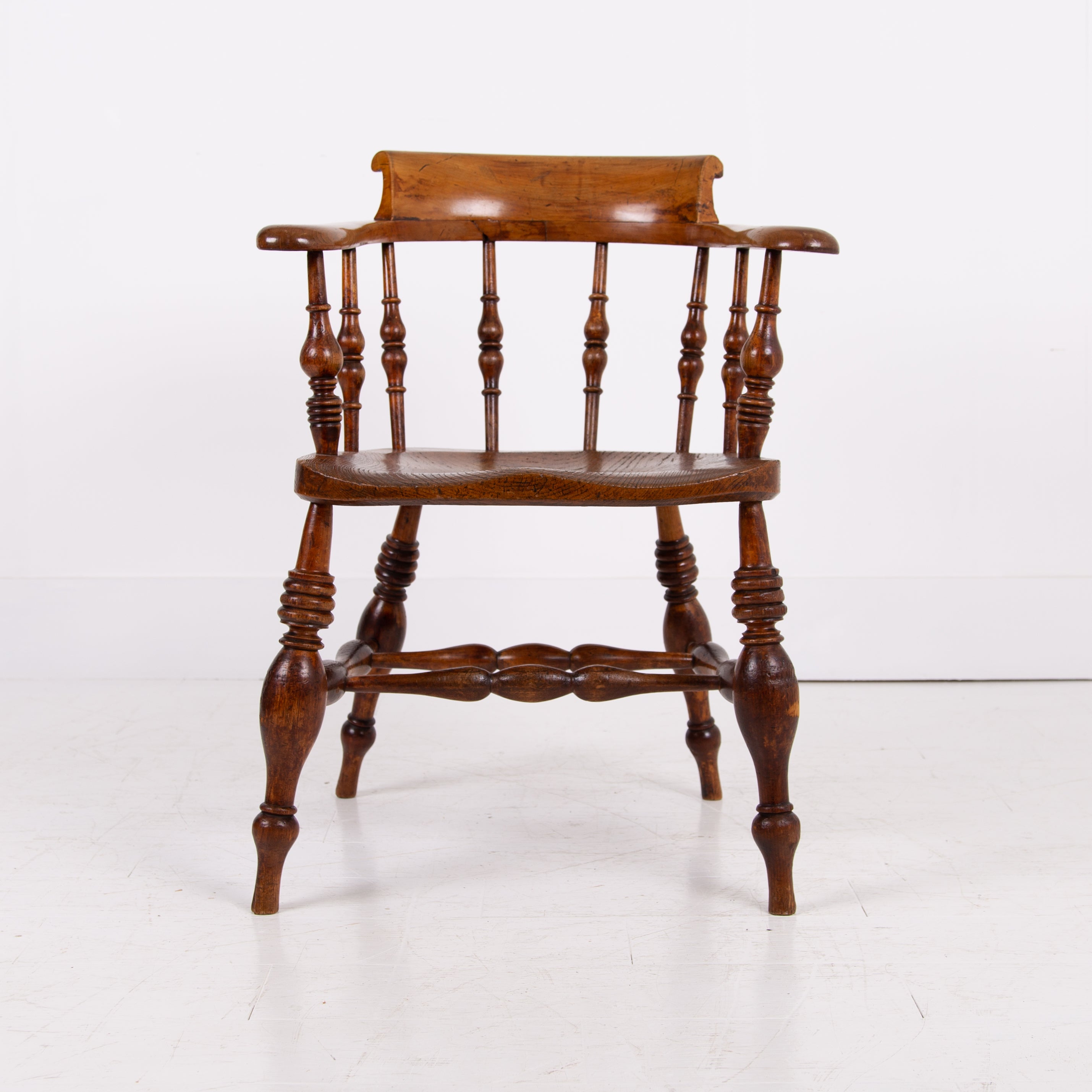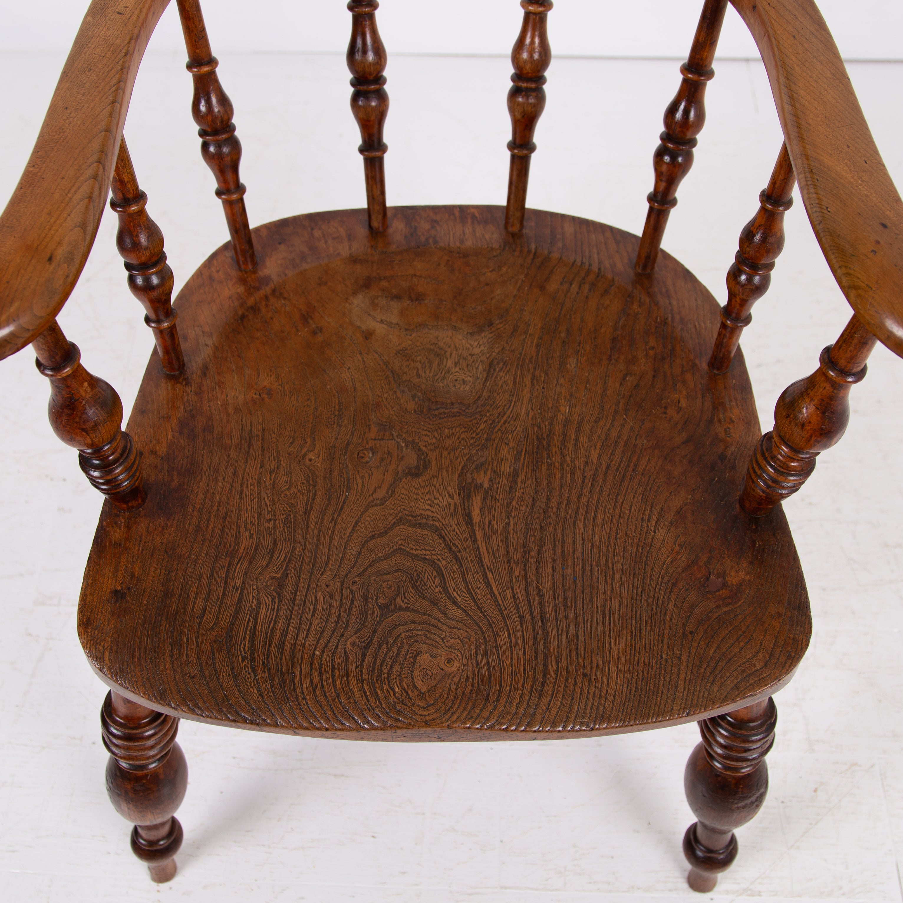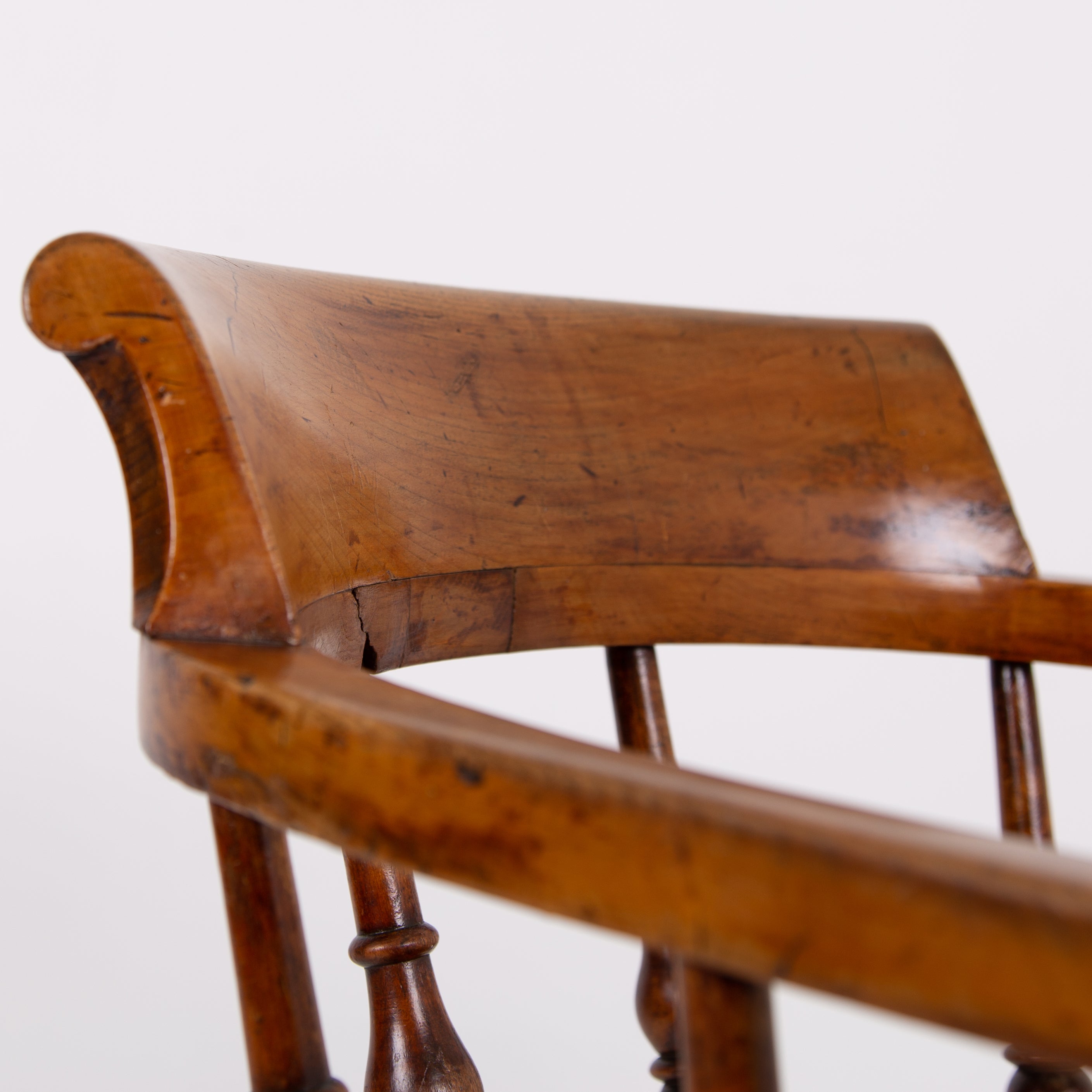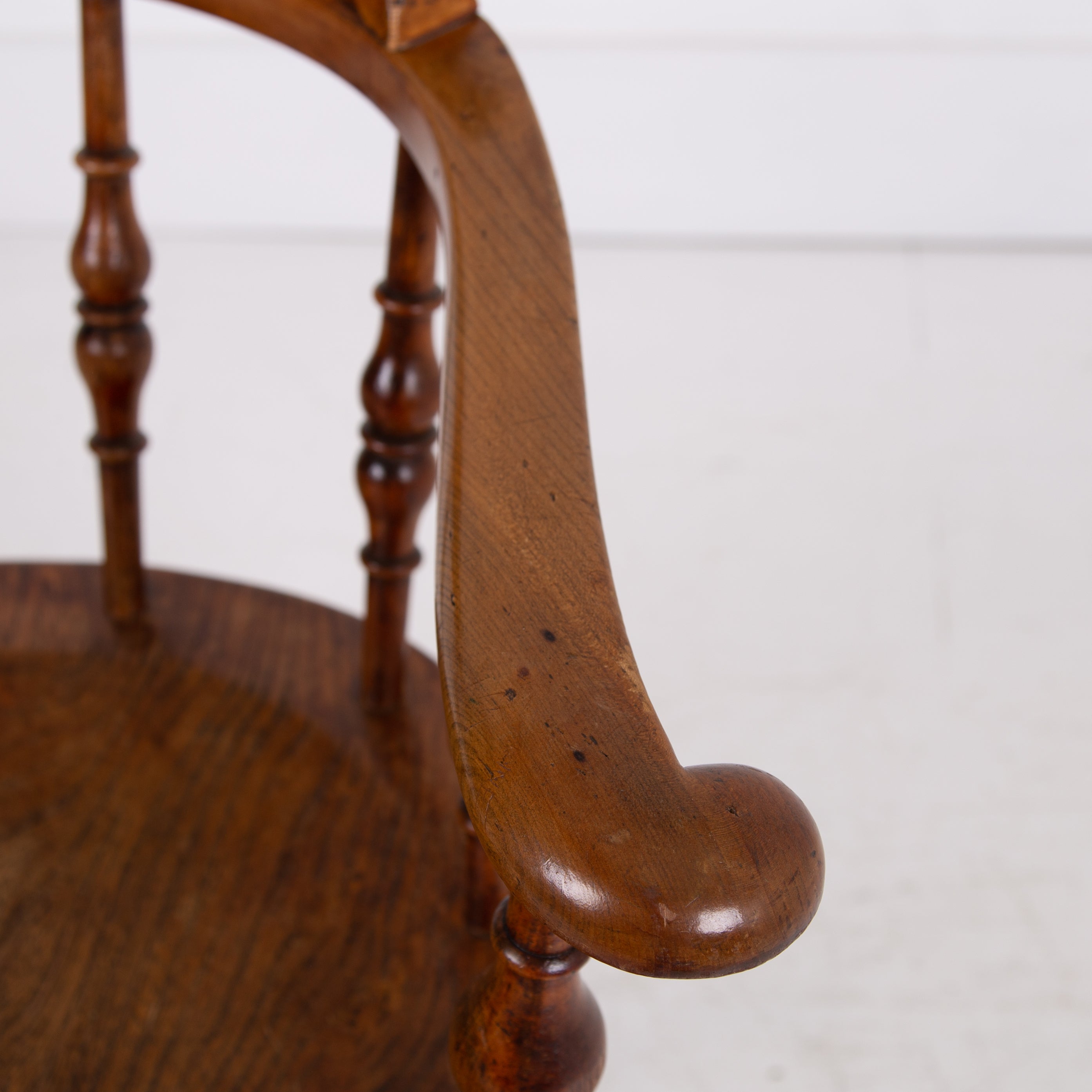We have some attractive grains and hues to the timber and genuine wear in the right places. The upper rail is crowned with a pleasing arched back rest making it comfortable and supportive and the attractive ring turned spindles supporting the distinctive horseshoe armrest. We have carefully lightly waxed the piece and ensured its ready to place.