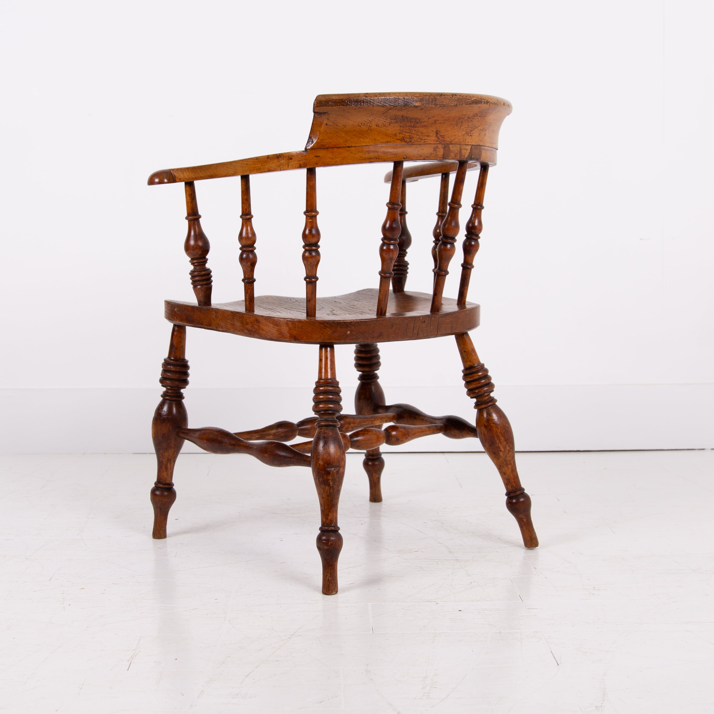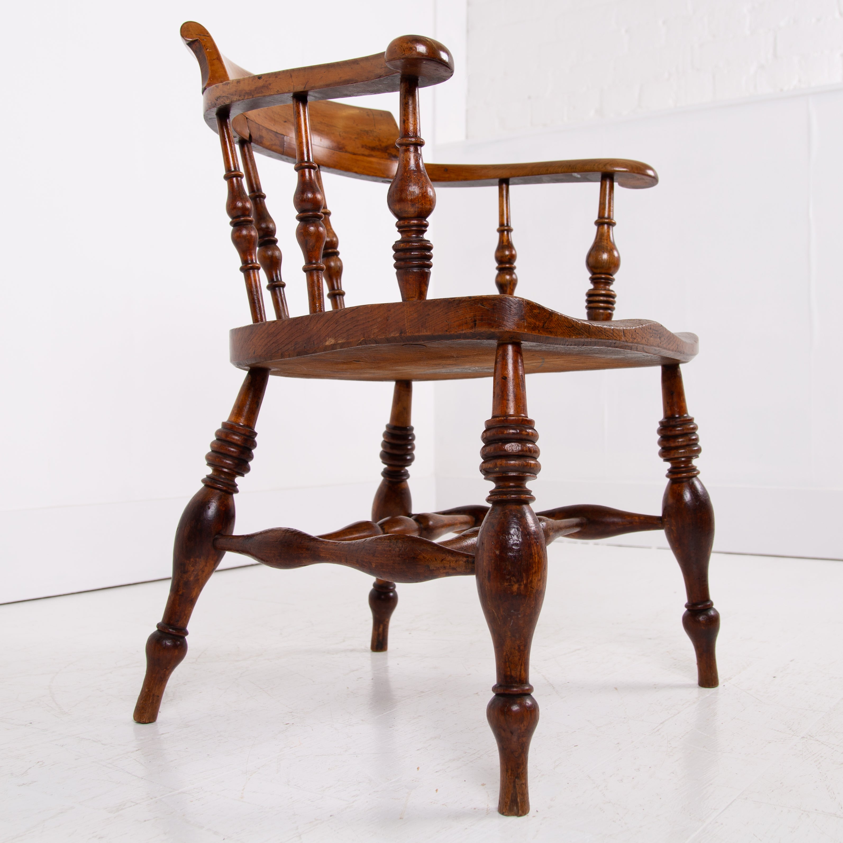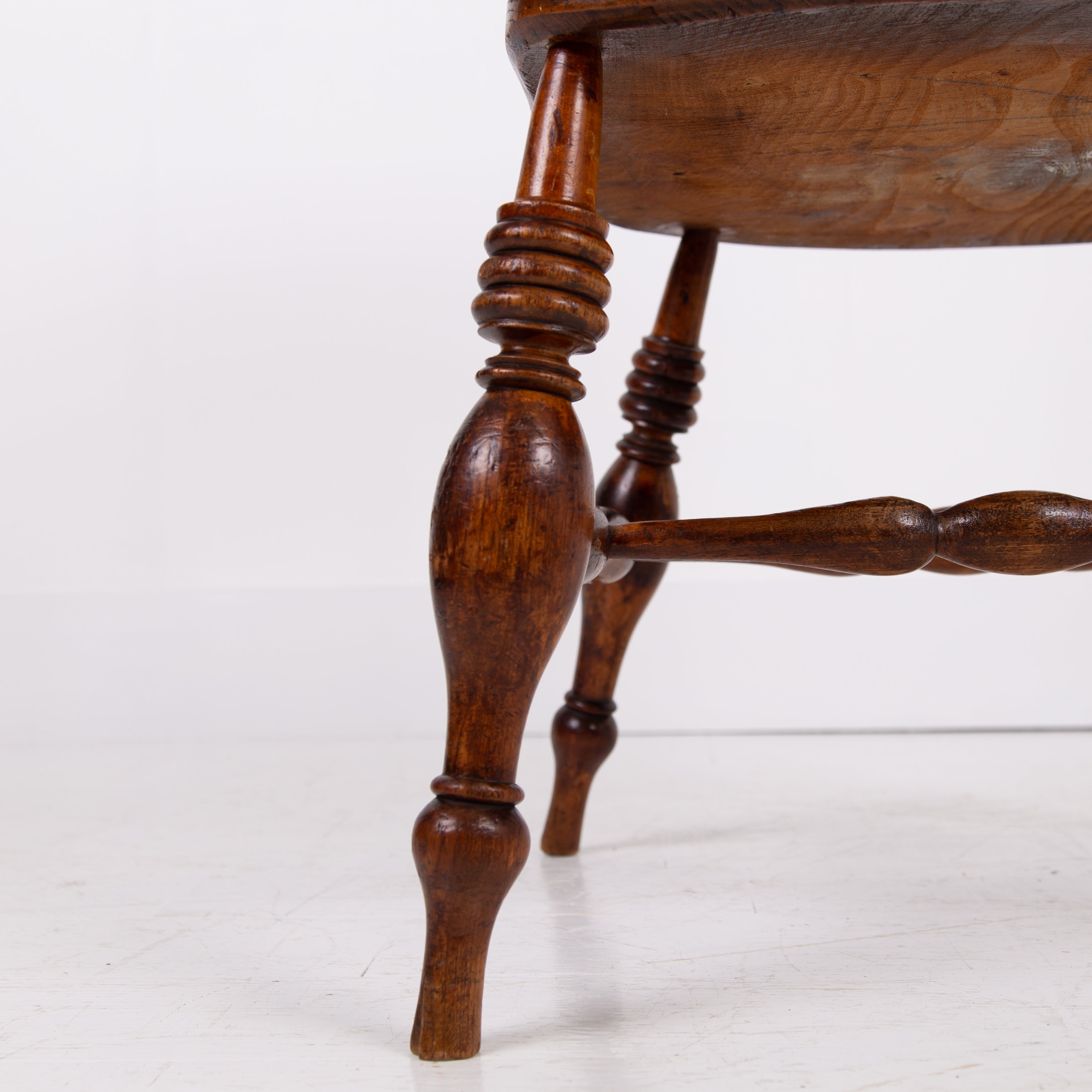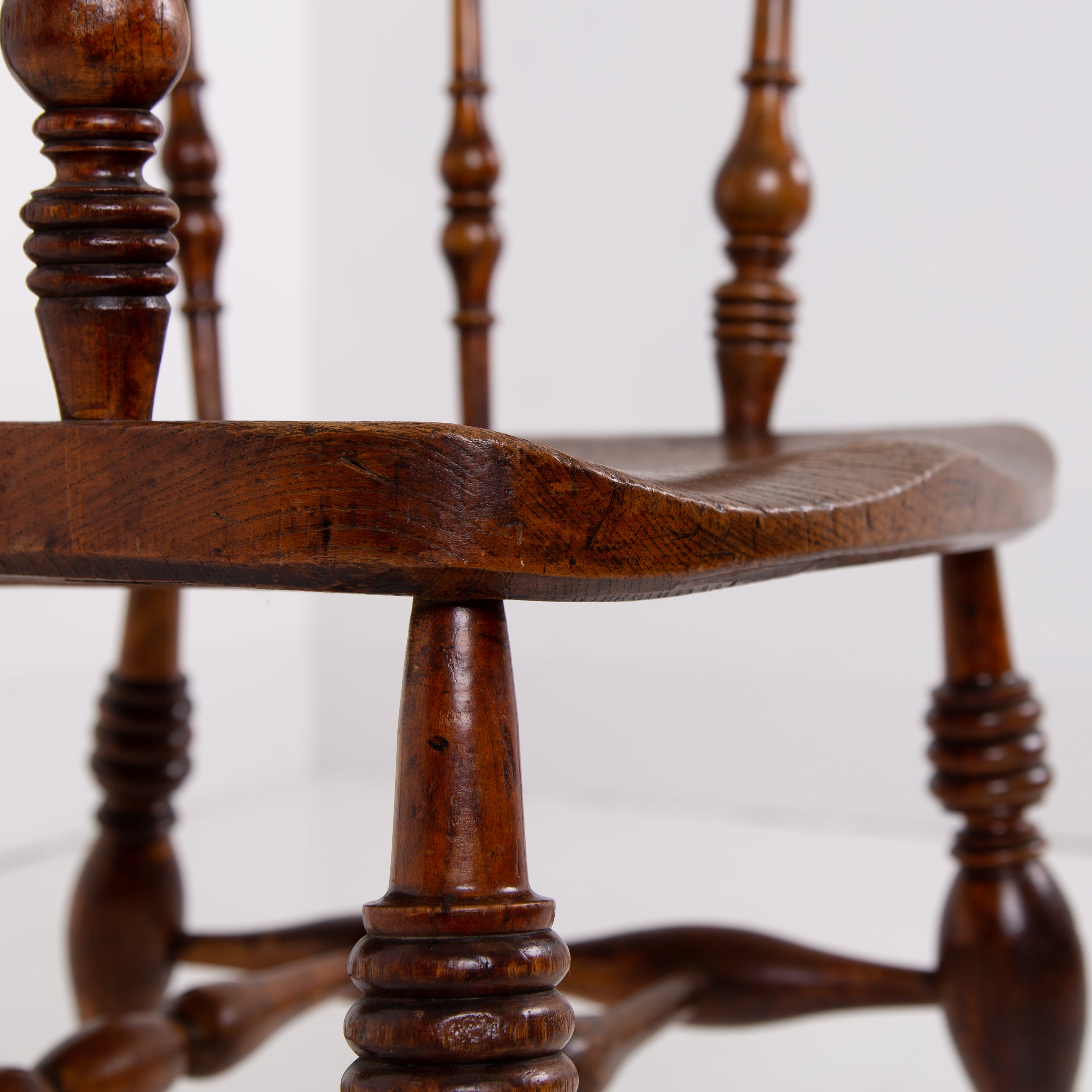 We have some attractive grains and hues to the timber and genuine wear in the right places. The upper rail is crowned with a pleasing arched back rest making it comfortable and supportive and the attractive ring turned spindles supporting the distinctive horseshoe armrest. We have carefully lightly waxed the piece and ensured its ready to place.