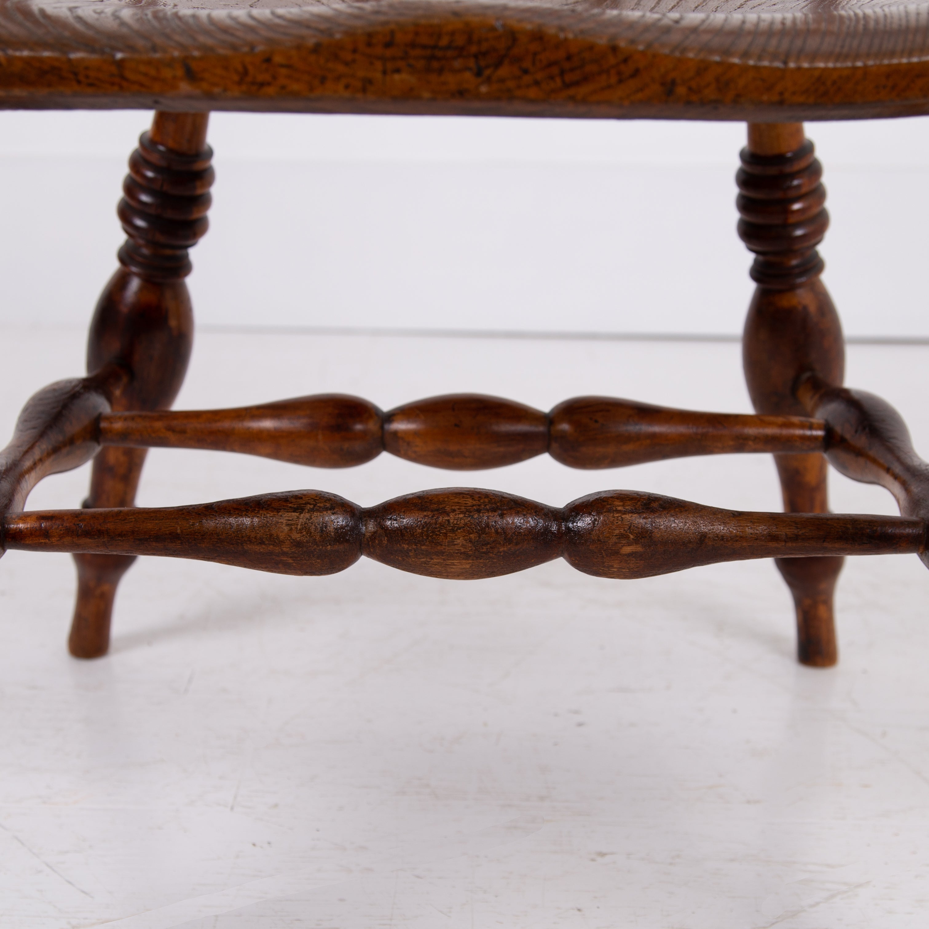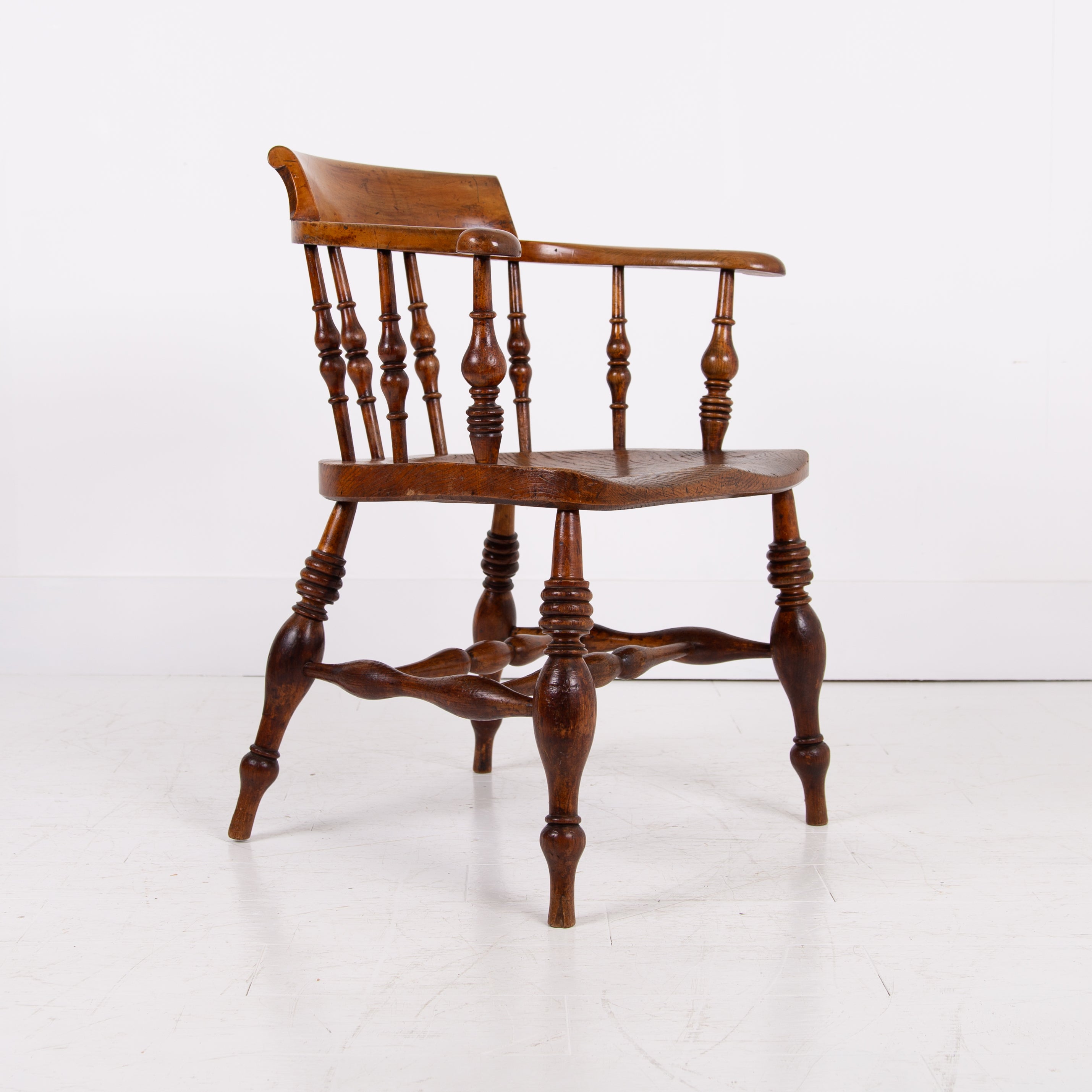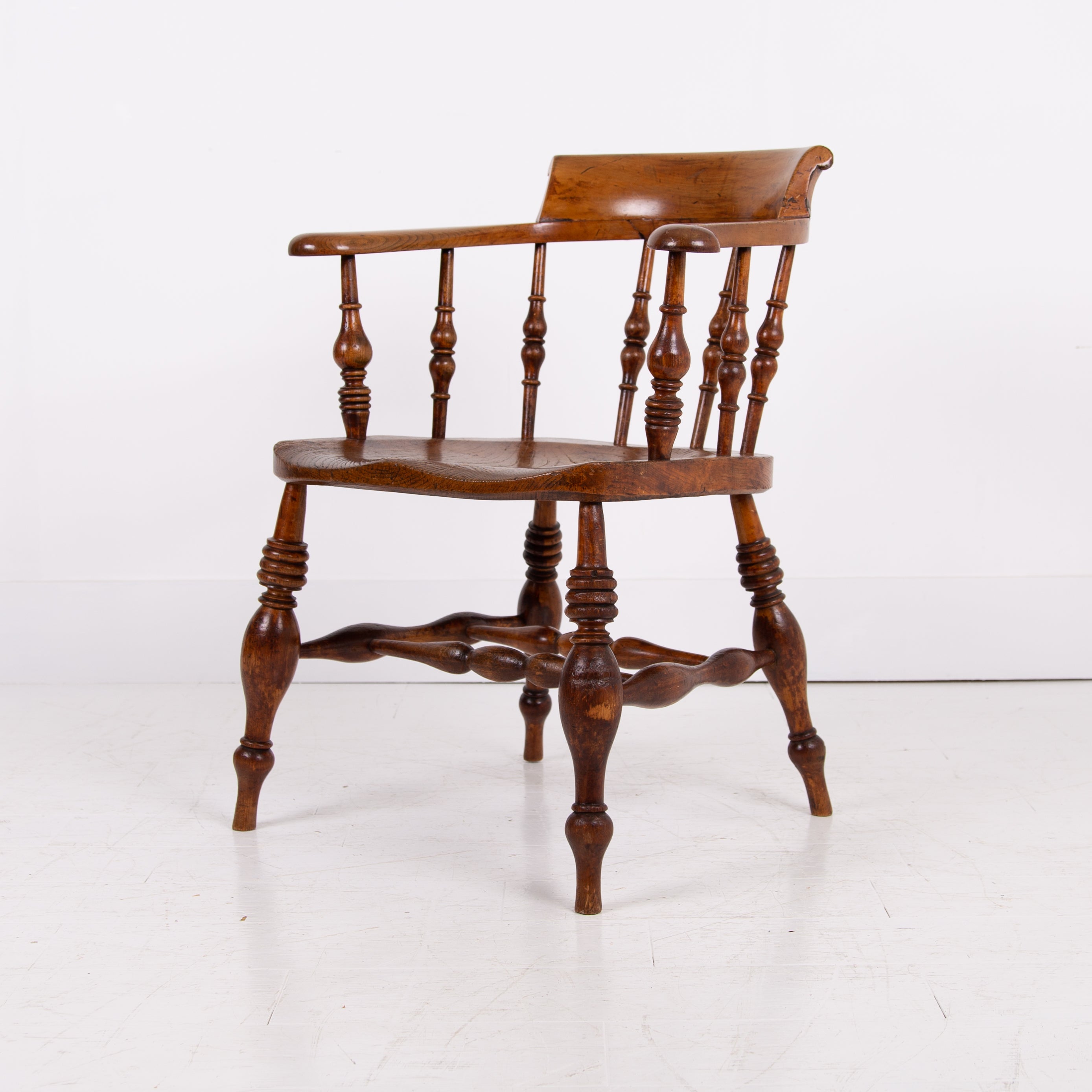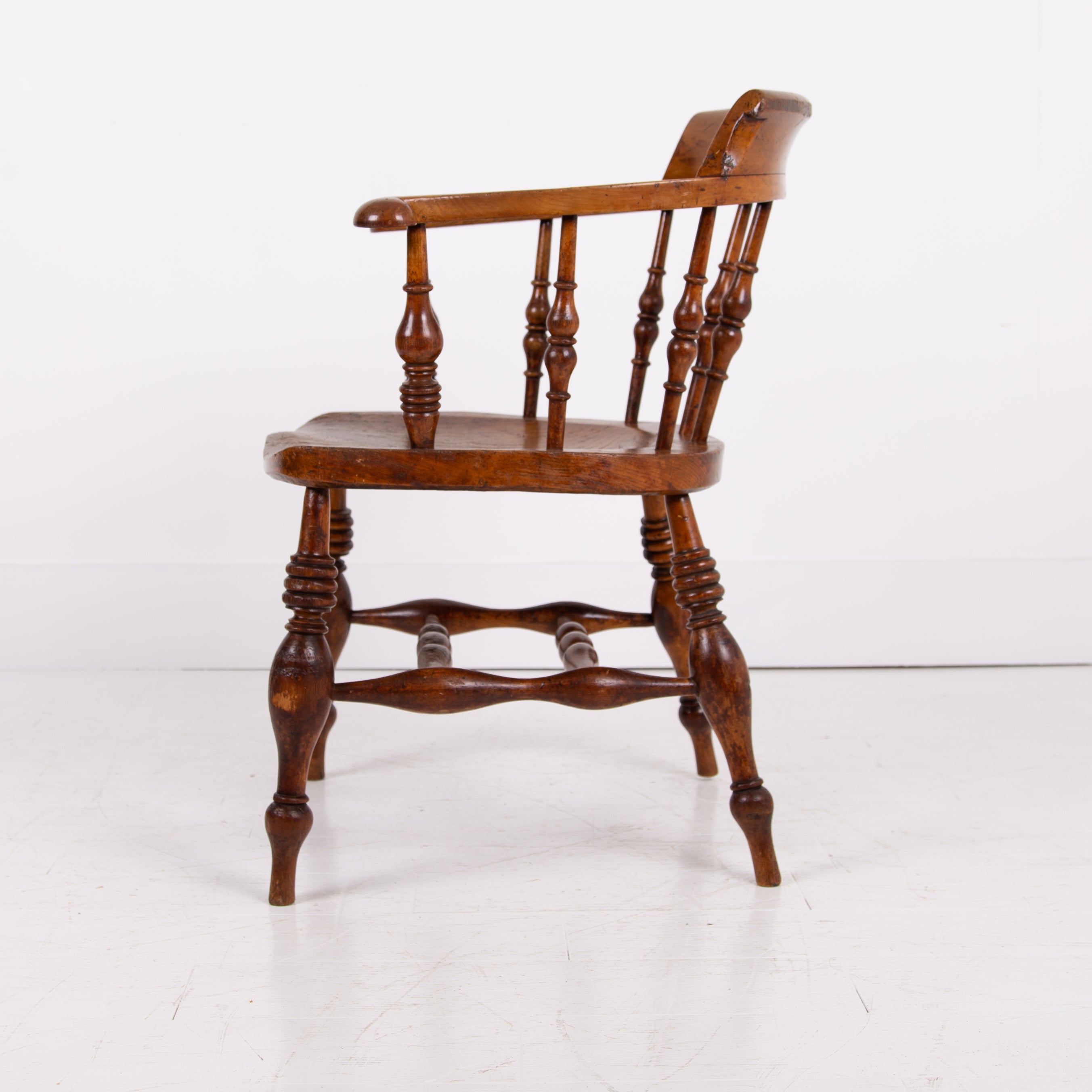 We have some attractive grains and hues to the timber and genuine wear in the right places. The upper rail is crowned with a pleasing arched back rest making it comfortable and supportive and the attractive ring turned spindles supporting the distinctive horseshoe armrest. We have carefully lightly waxed the piece and ensured its ready to place.