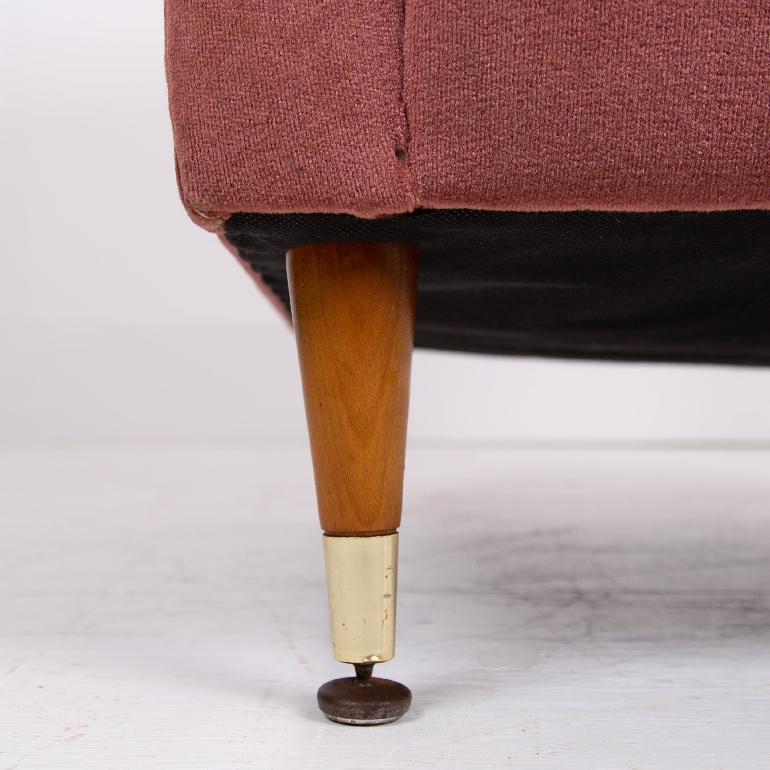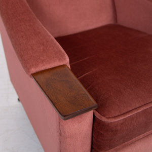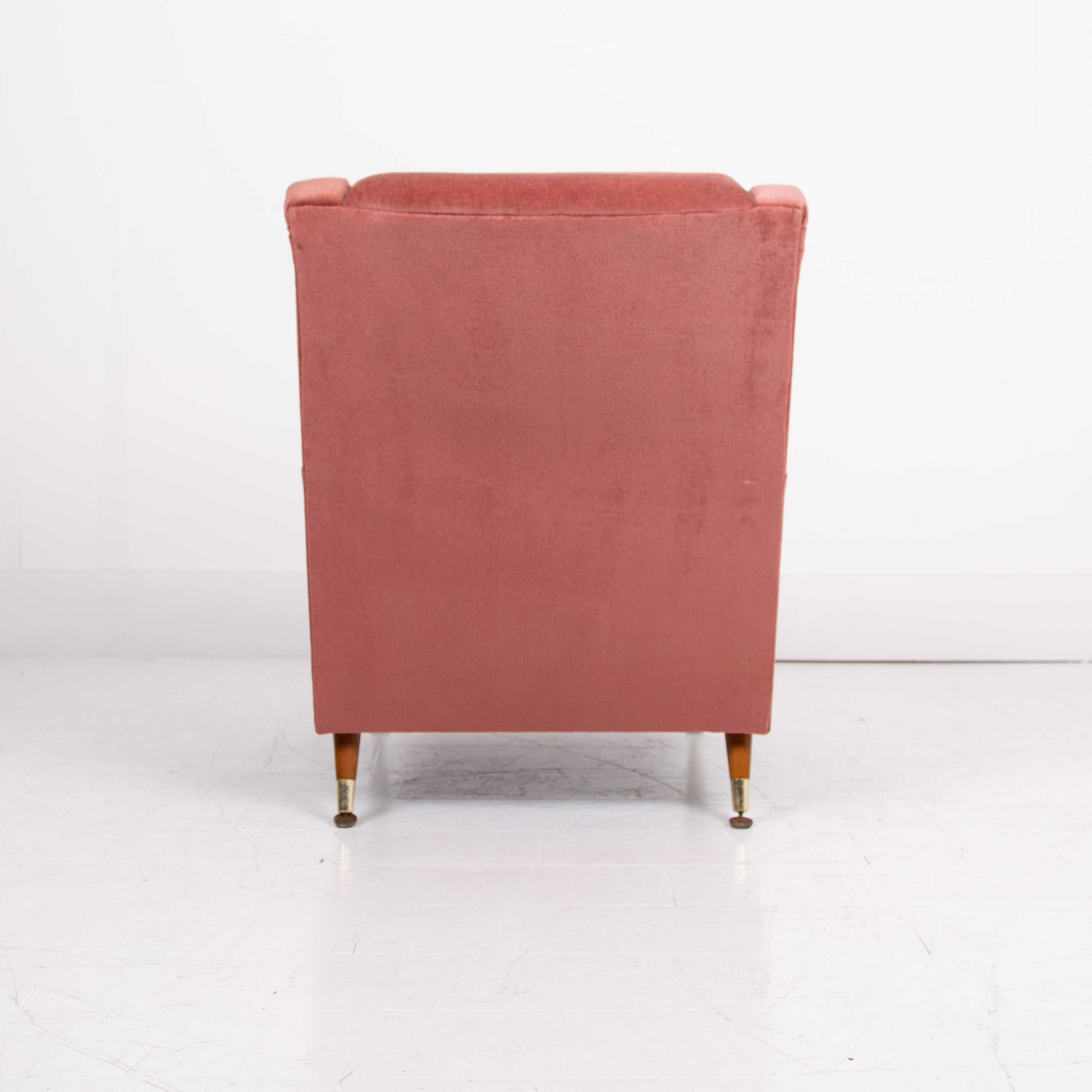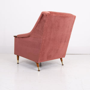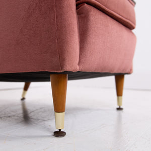 Both chairs sit in the same condition , the dusky pink short velvet fabric is very good with light wear, no holes, fading or marks with the upholstery being well executed, the legs also have sensible light aging and all have the original brass accents and original feet pads. We have ensured the chairs are ready to place and enjoy. If you wish for new upholstery, Mark the upholsterer could complete a professional job for £415 plus VAT per chair - you would require 3-4 metres of fabric per chair which we can assist with sourcing samples etc, let us know when you purchase.