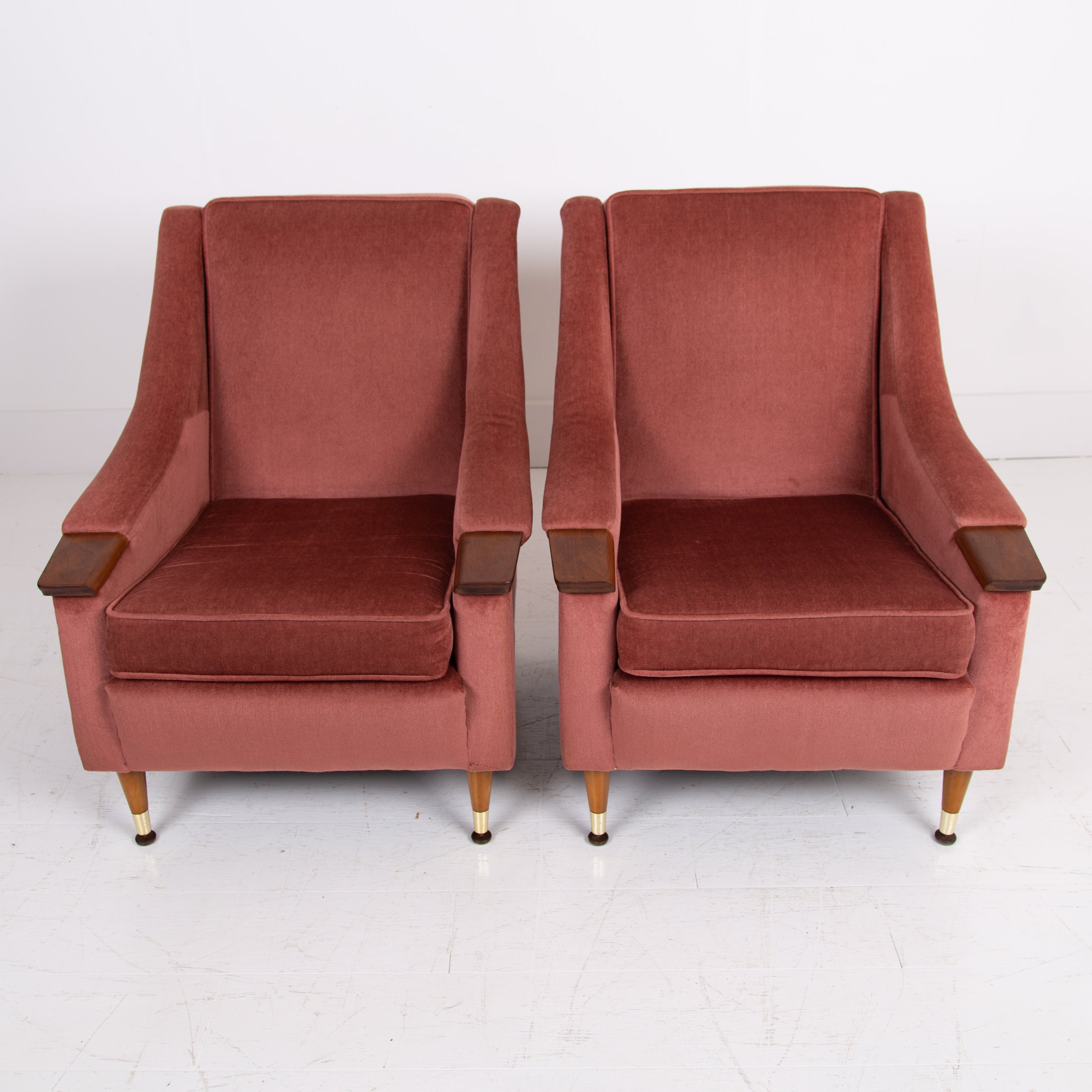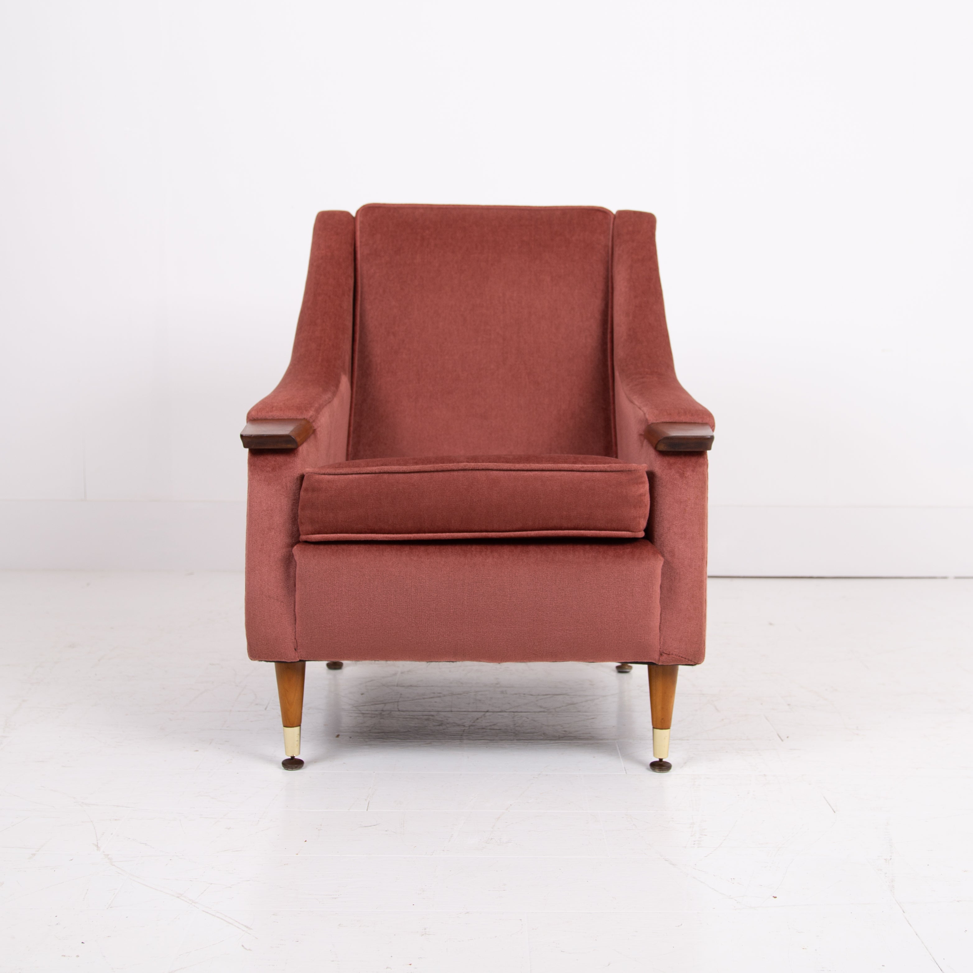 A great looking pair of British lounge armchairs C1960s in lovely cherished condition. The pair have plenty going for them - the slender brass capped tapered legs, those well shaped sweeping arms, the little solid teak arm pads, perfect for a cuppa and the overall scale, about the right size.