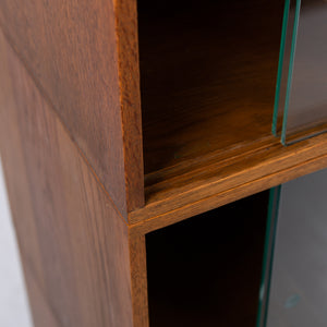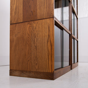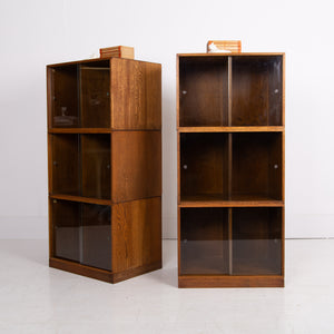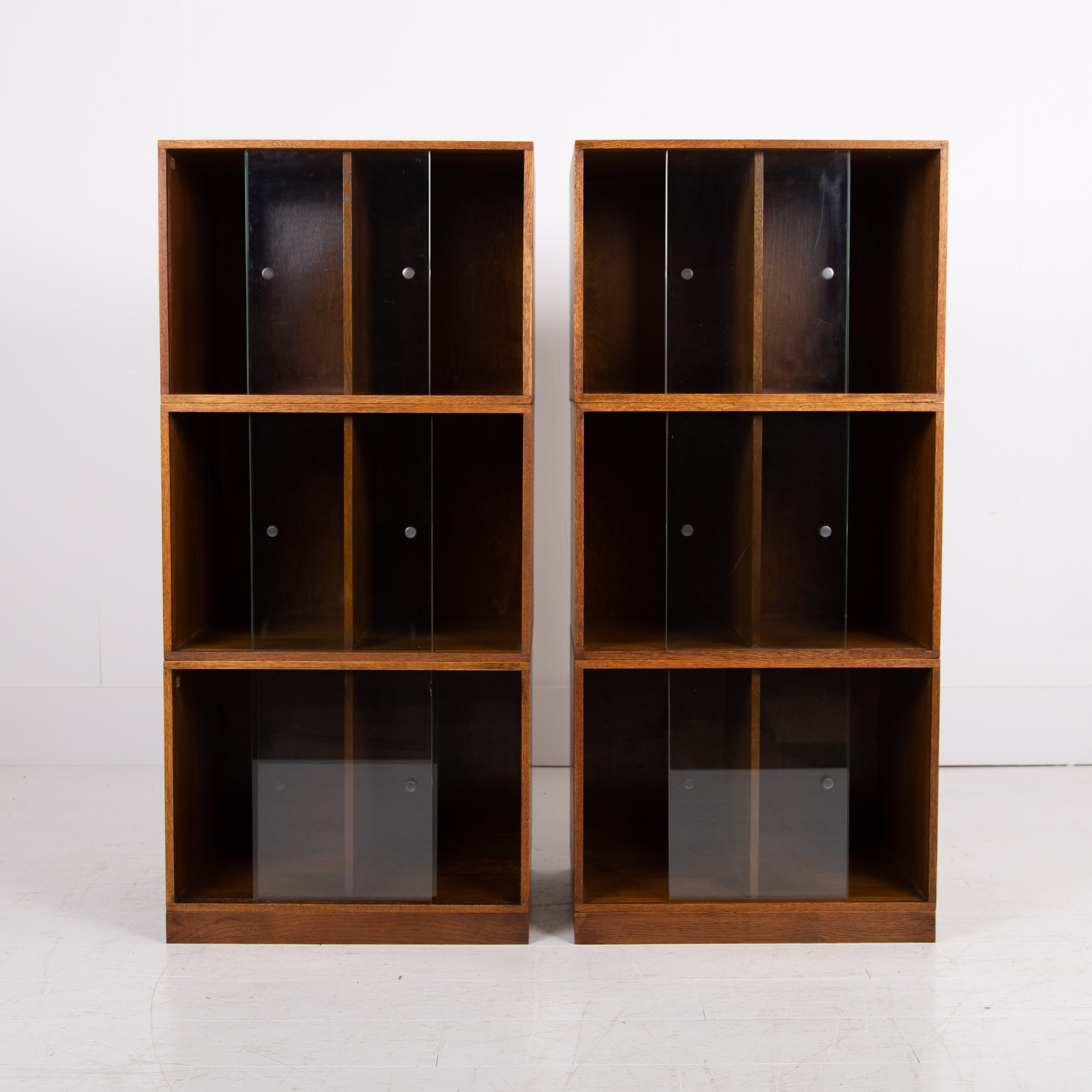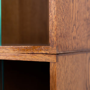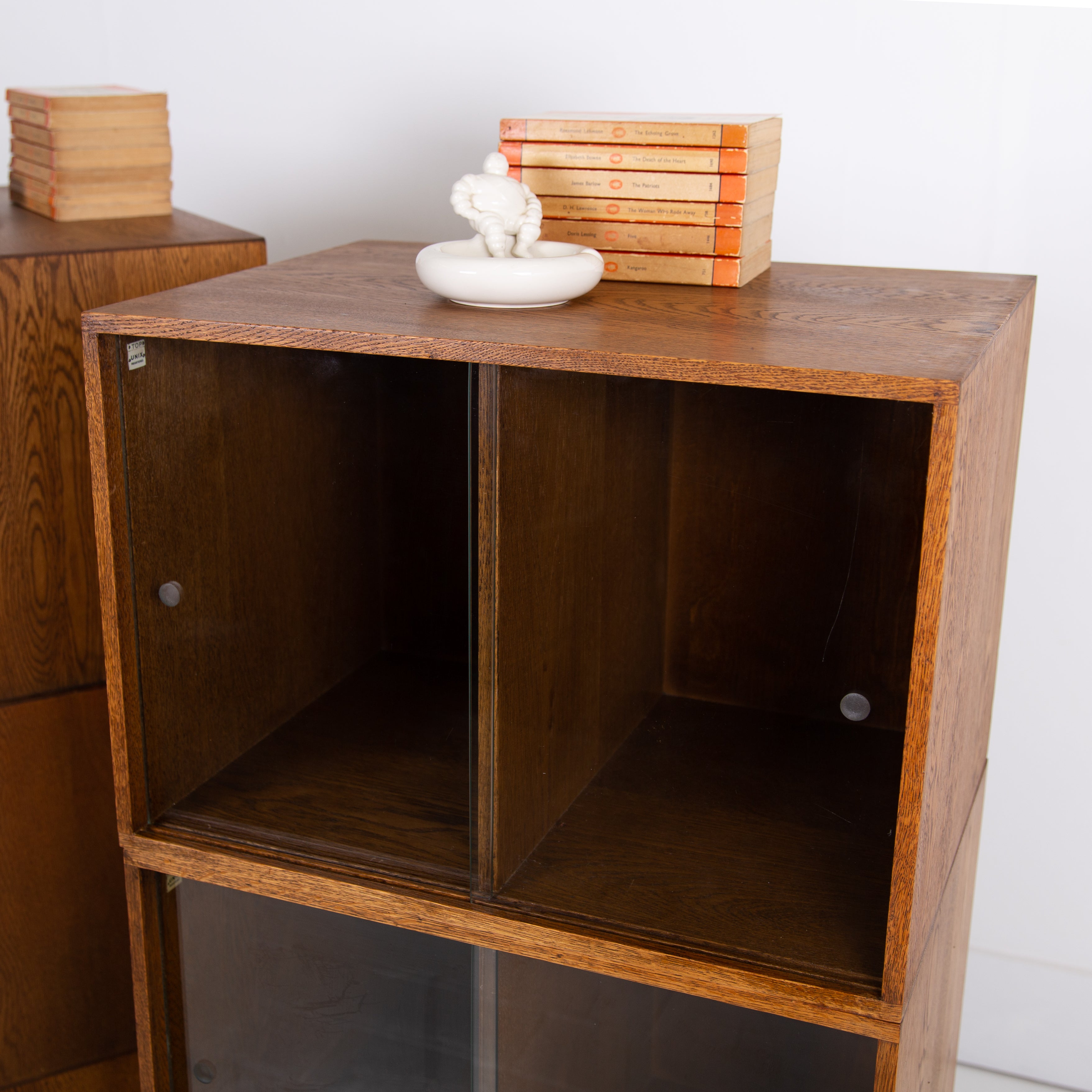 The design is perfect and effortless in looks - we have 3 oak sections, all with two sliding glass doors which will fit records perfectly. The Unix units on this one separate into 3 and a base for easier moving and placing. The cabinet has been cleaned and repolished in our workshop so we have sensible wear to the well toned oak. We have a very small chip to one of the doors which you do not see when closed and a small sliver to the back side of one of the sections again historic and not particularly noticeable. Both cabinets are the same in configuration and scale.