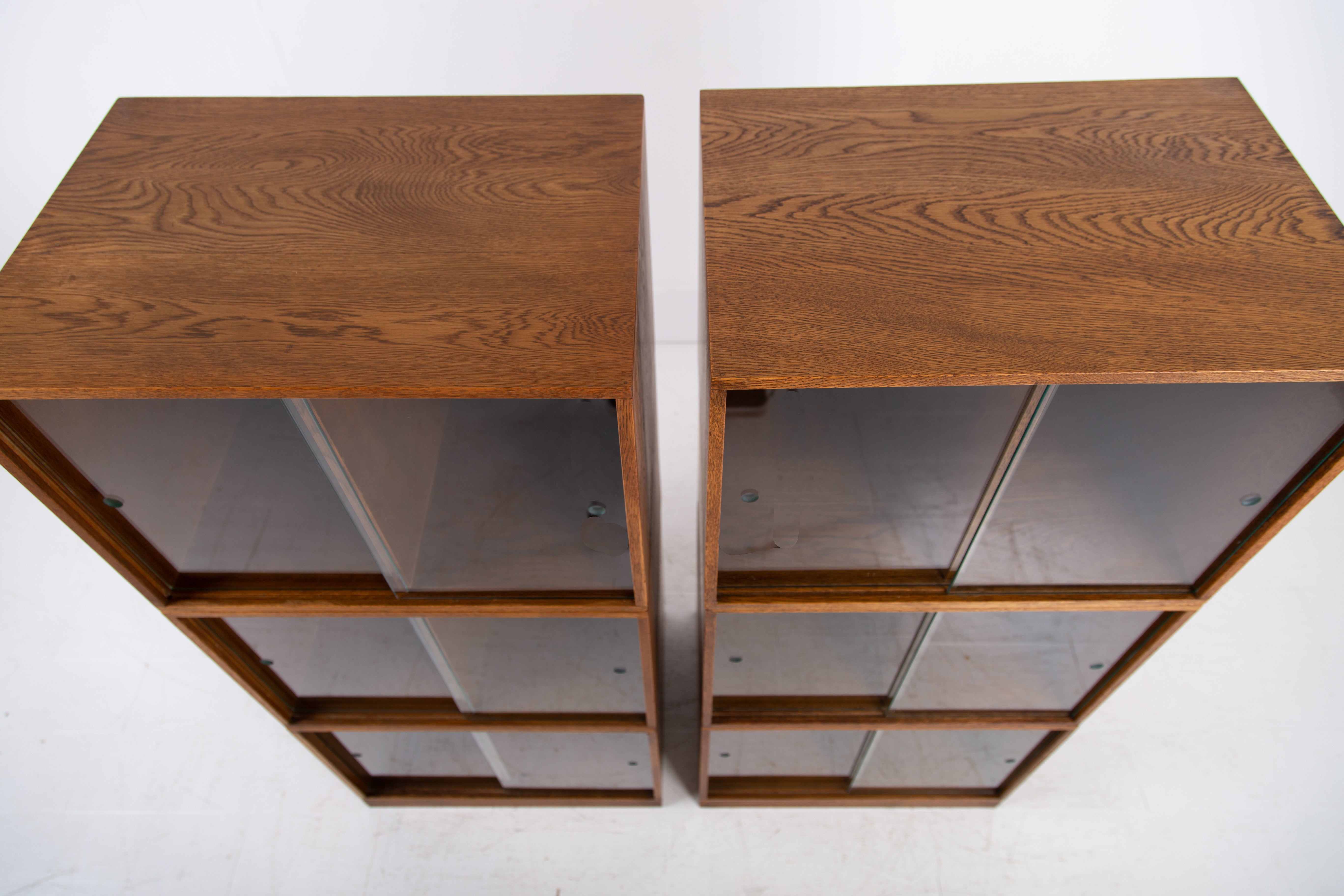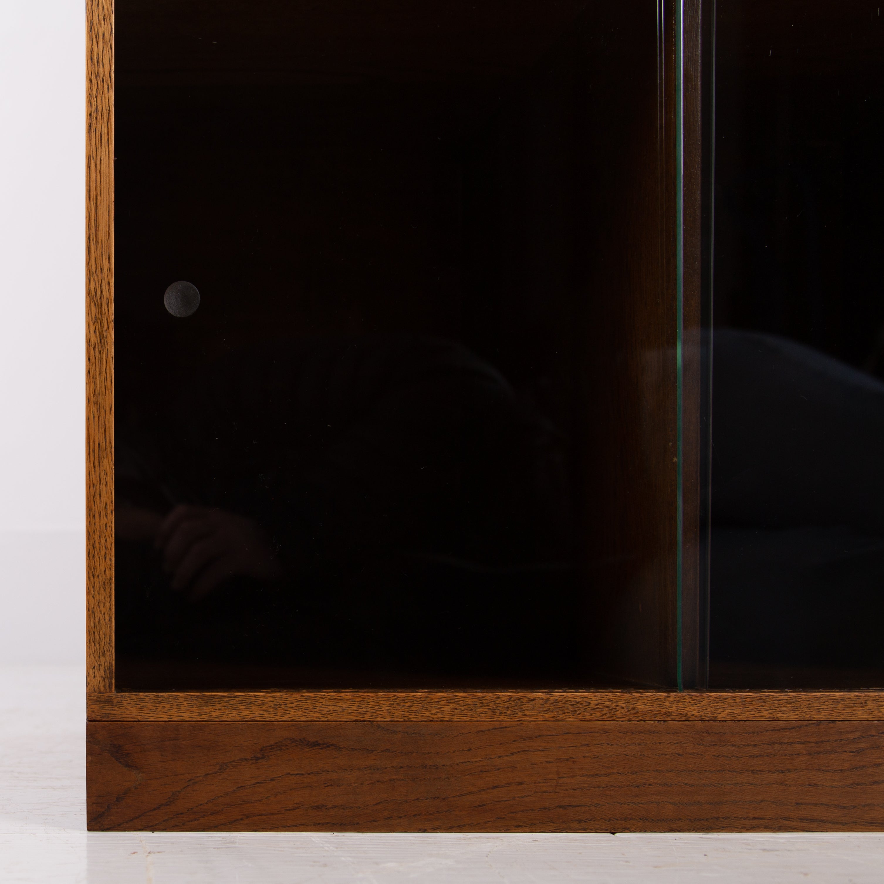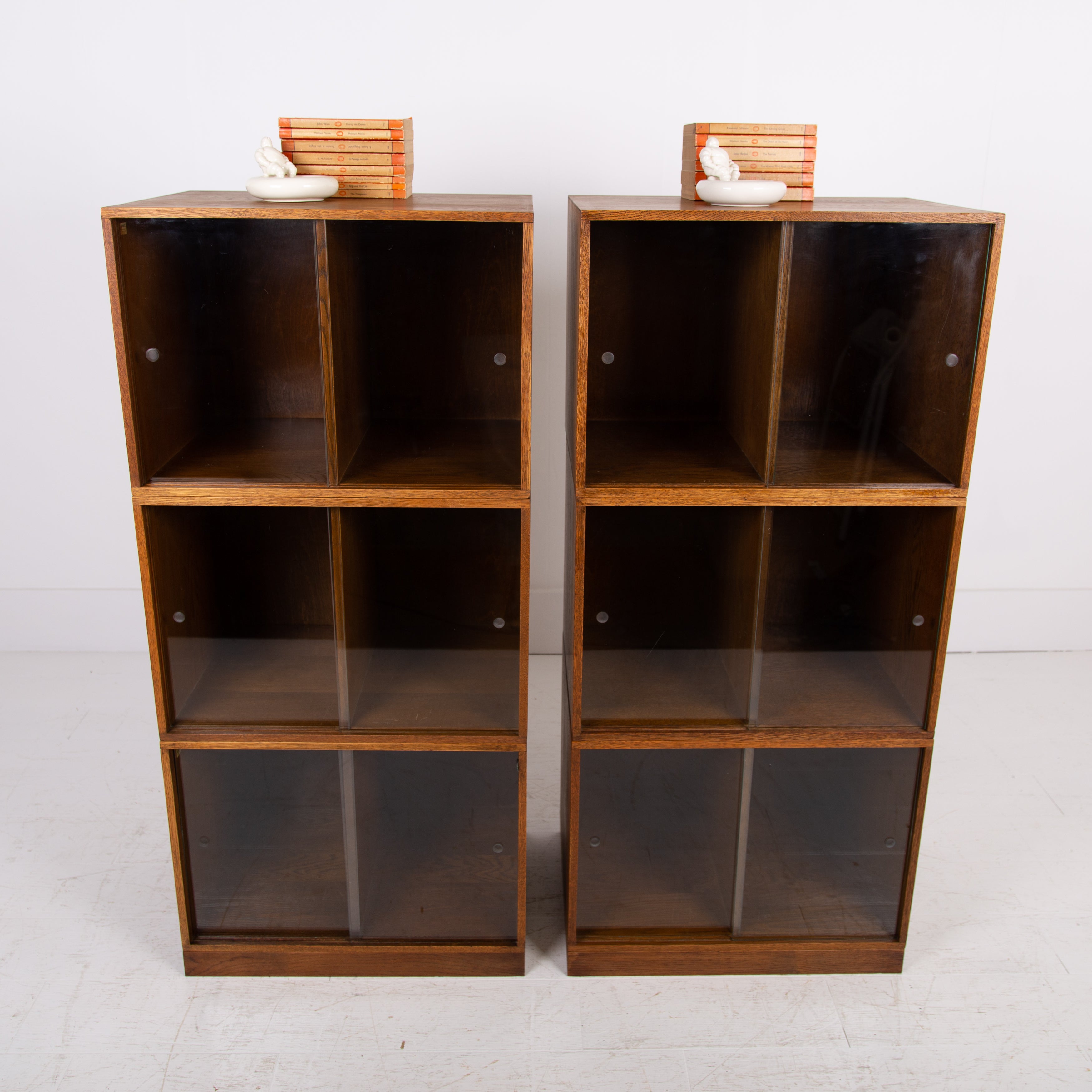 The design is perfect and effortless in looks - we have 3 oak sections, all with two sliding glass doors which will fit records perfectly. The Unix units on this one separate into 3 and a base for easier moving and placing. The cabinet has been cleaned and repolished in our workshop so we have sensible wear to the well toned oak. We have a very small chip to one of the doors which you do not see when closed and a small sliver to the back side of one of the sections again historic and not particularly noticeable. Both cabinets are the same in configuration and scale.