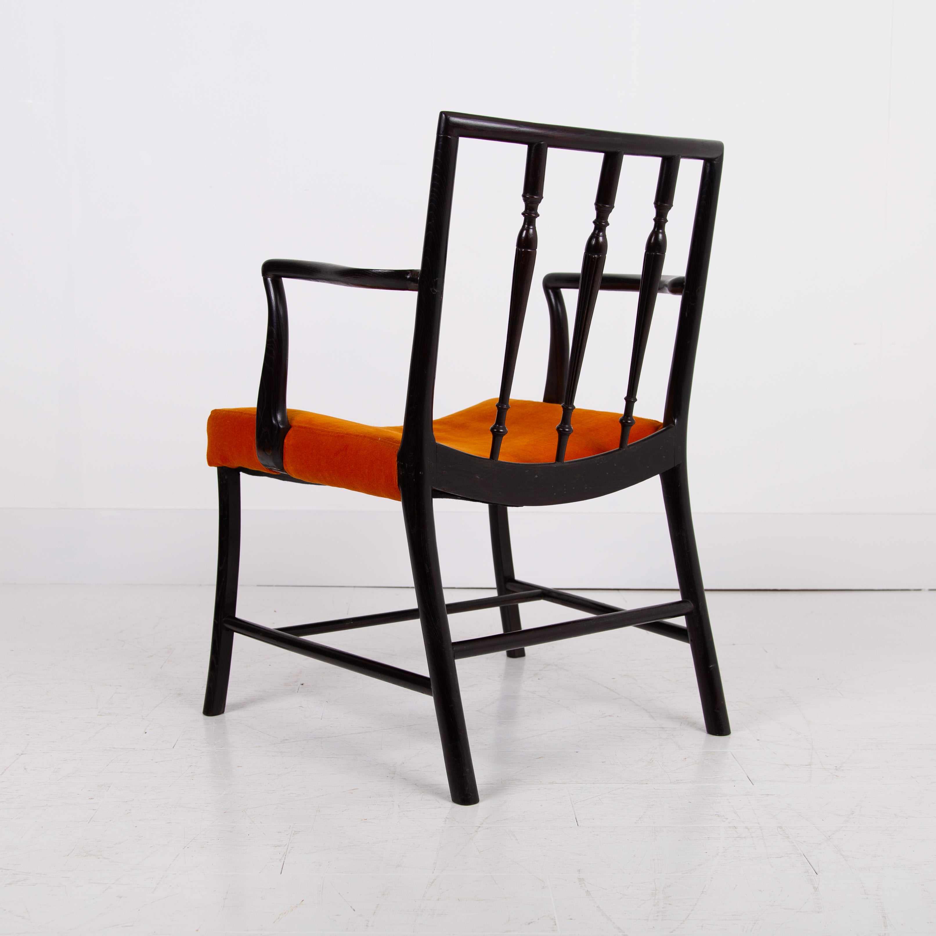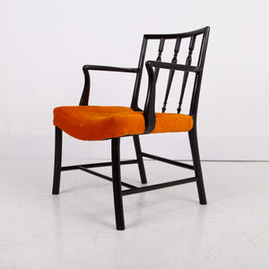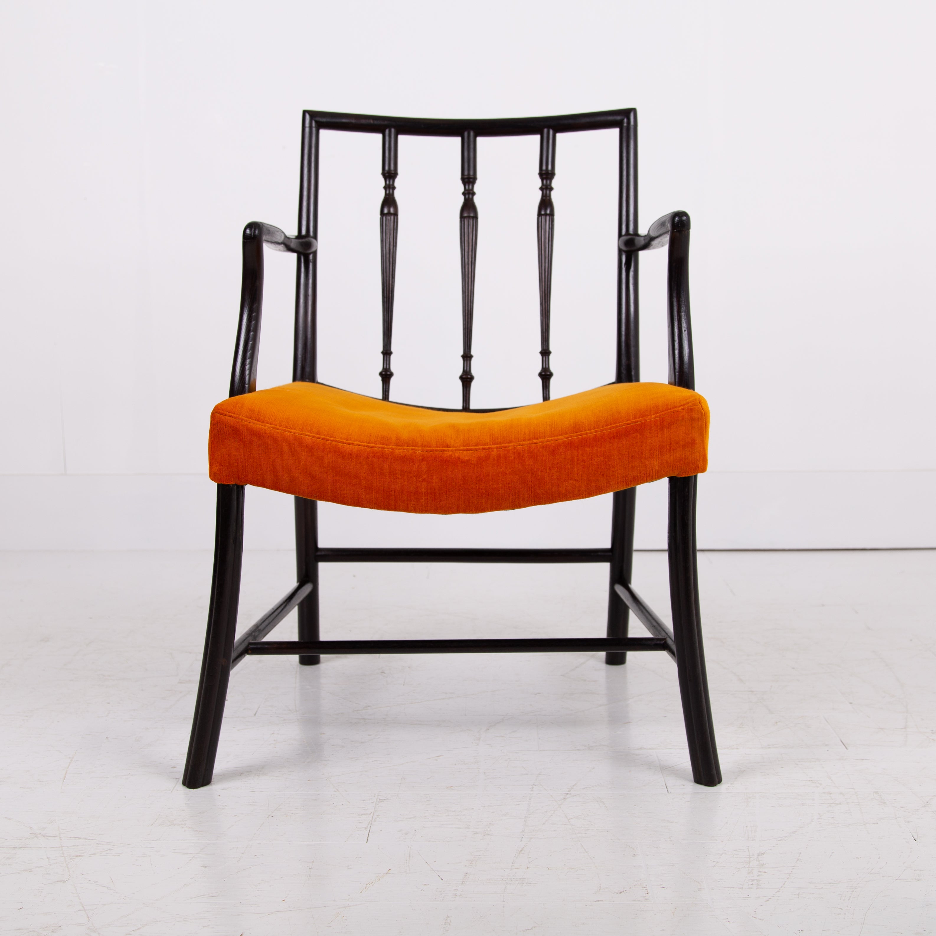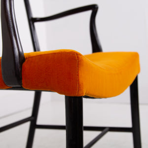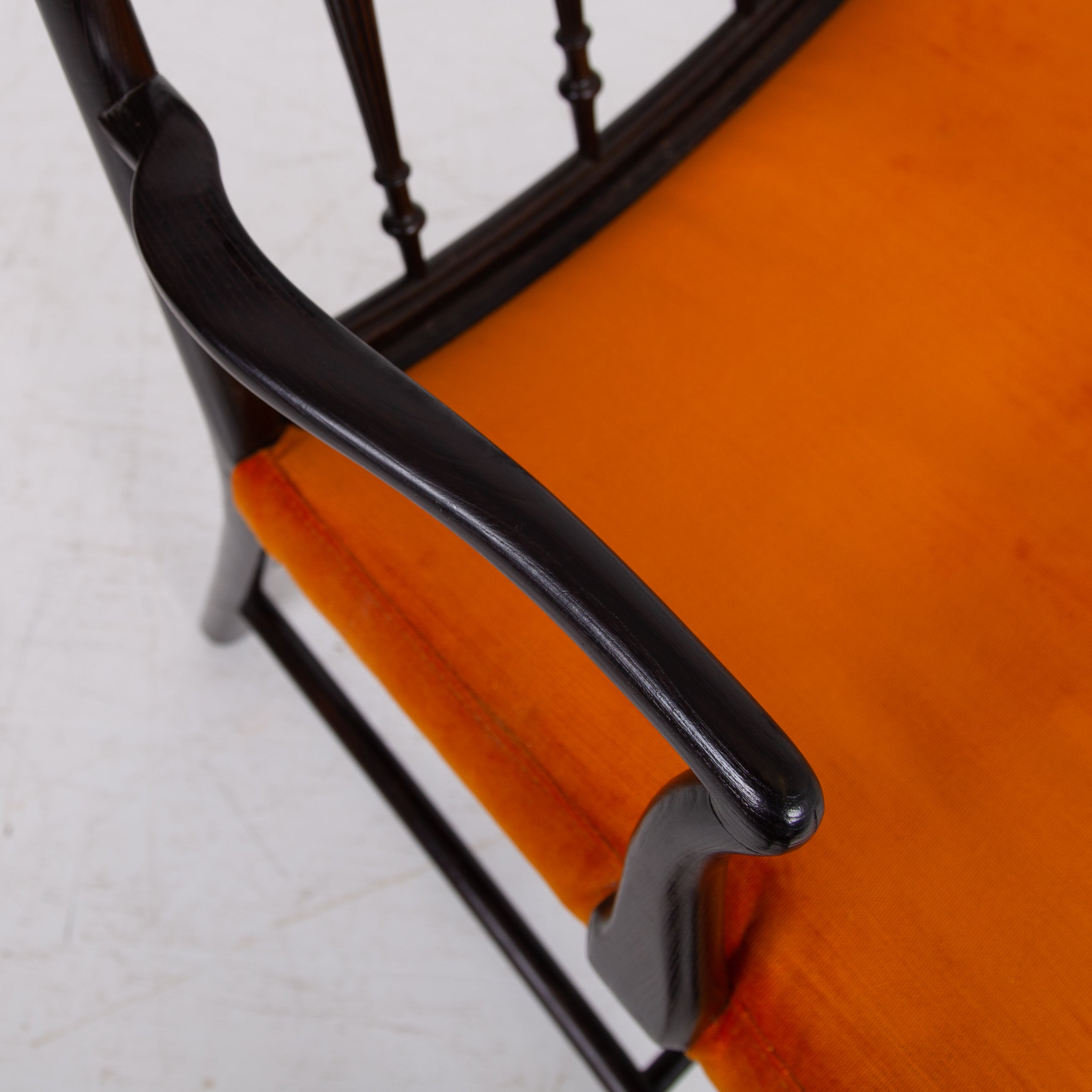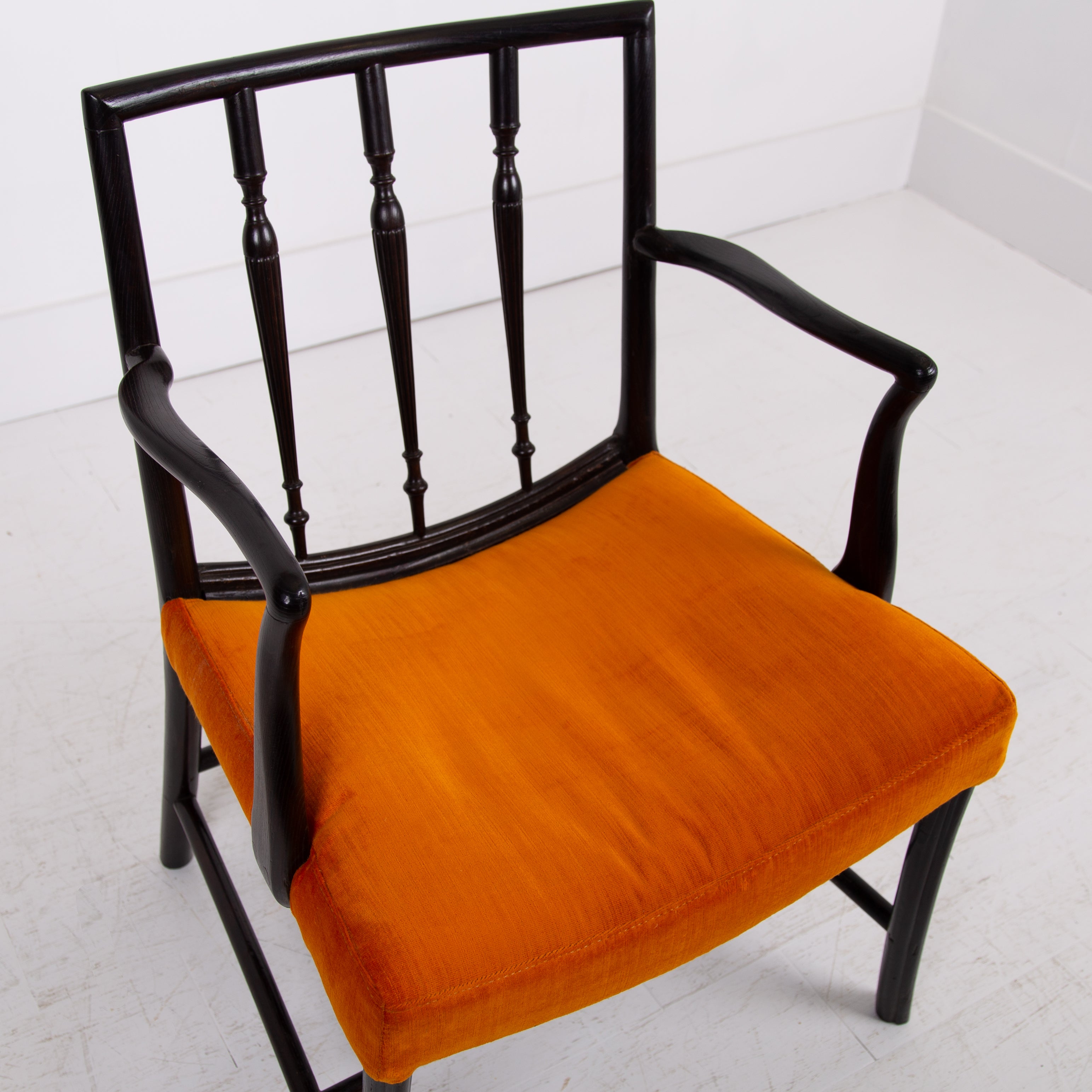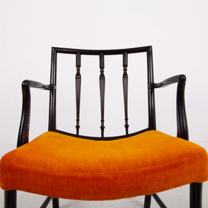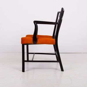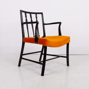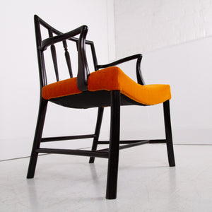 Having enjoyed a sensible refurbishment, this one sits well with its tangerine coloured soft strie velvet seat and good looking sheen to the frame. A couple of good sensible historic repairs but the chair sits very well and is ready for use.