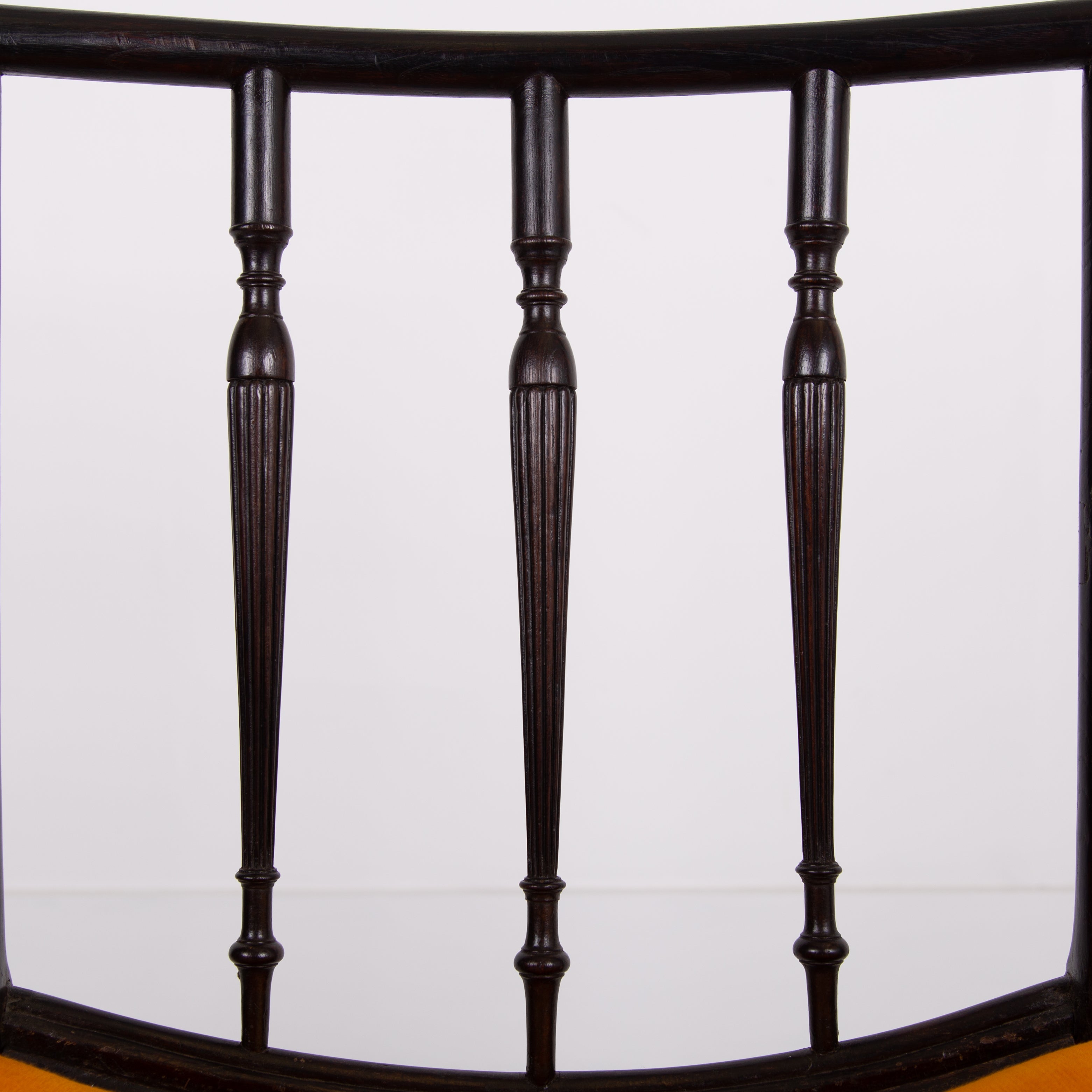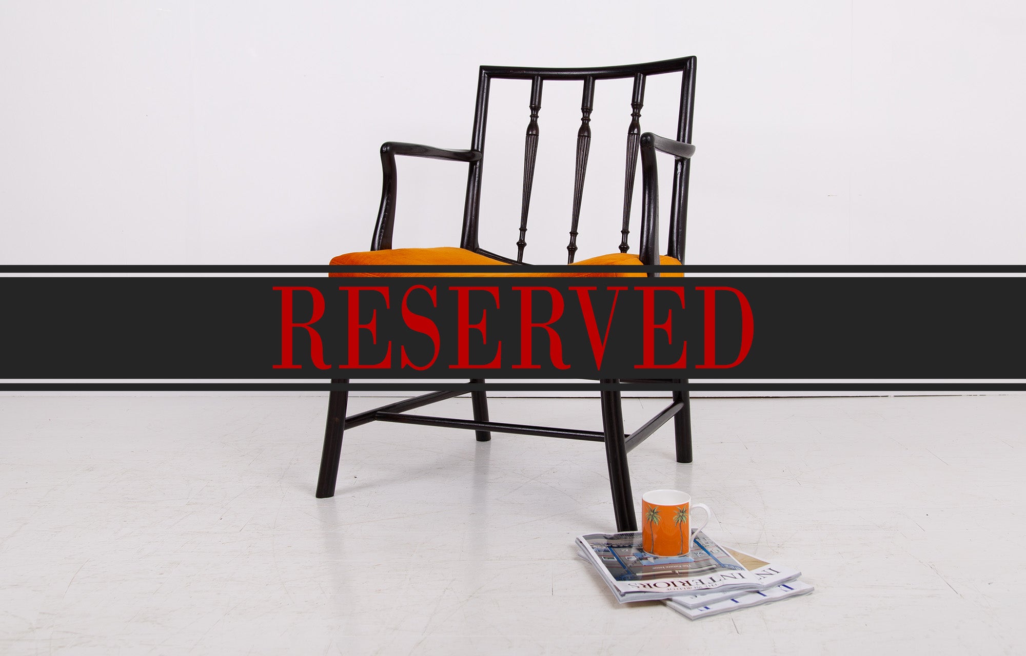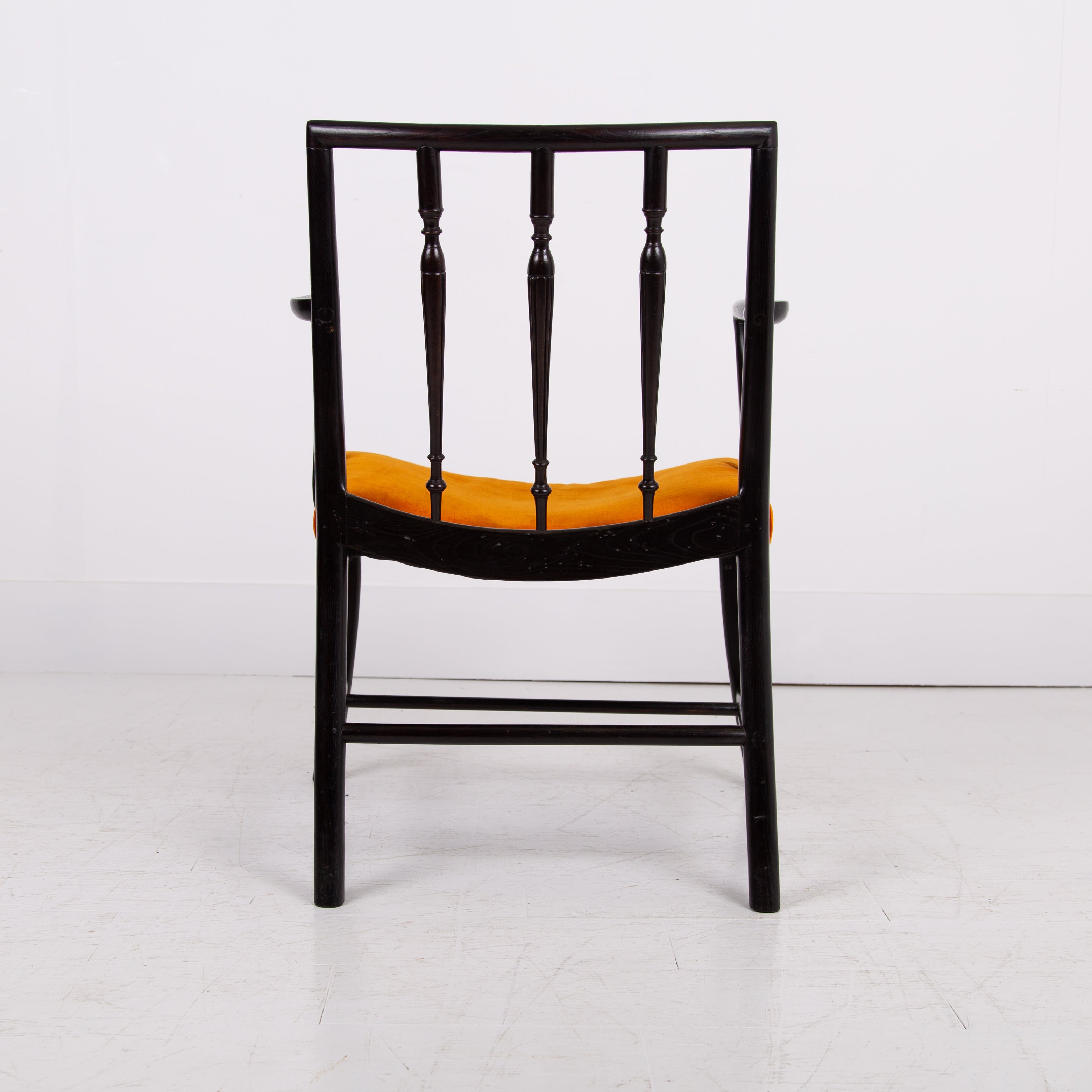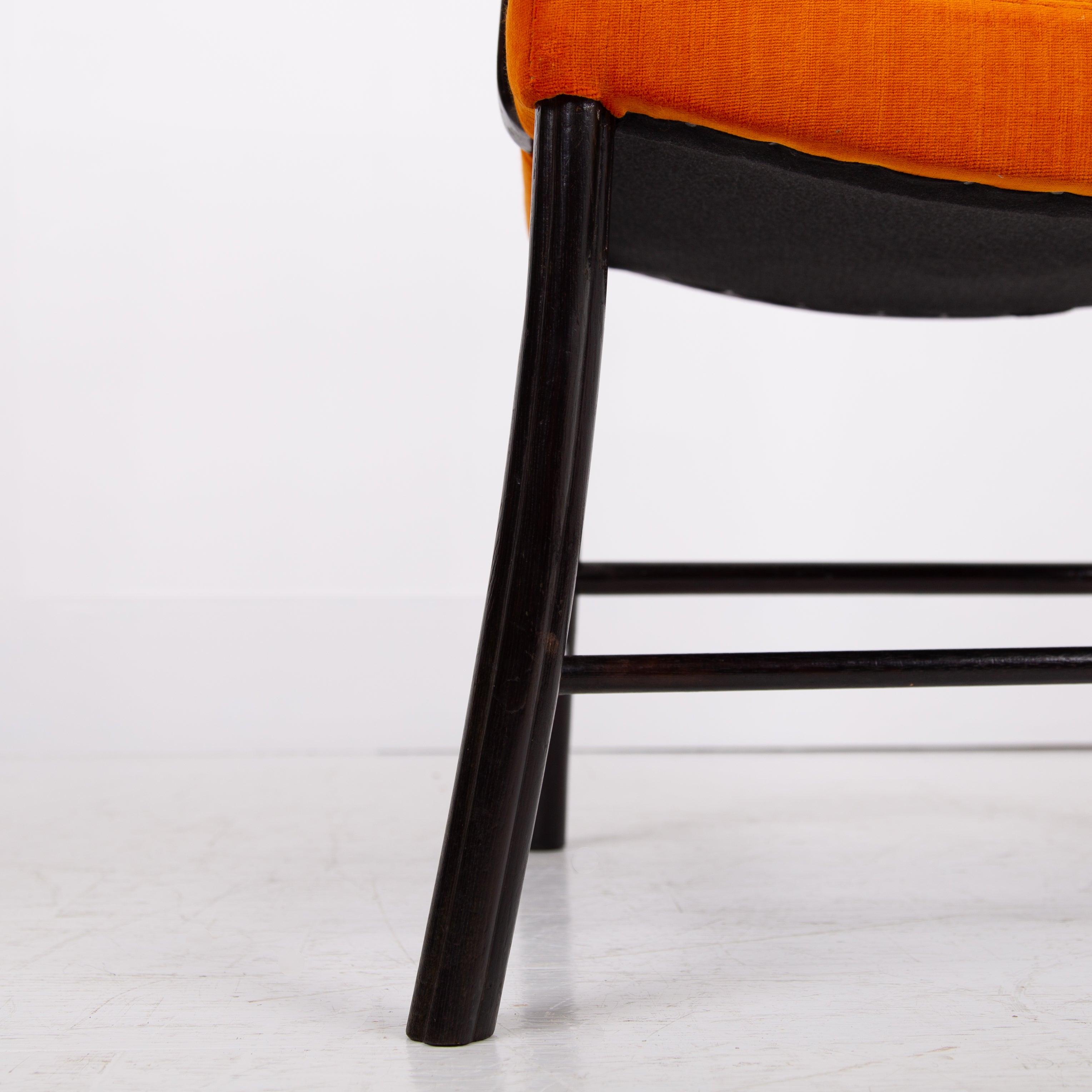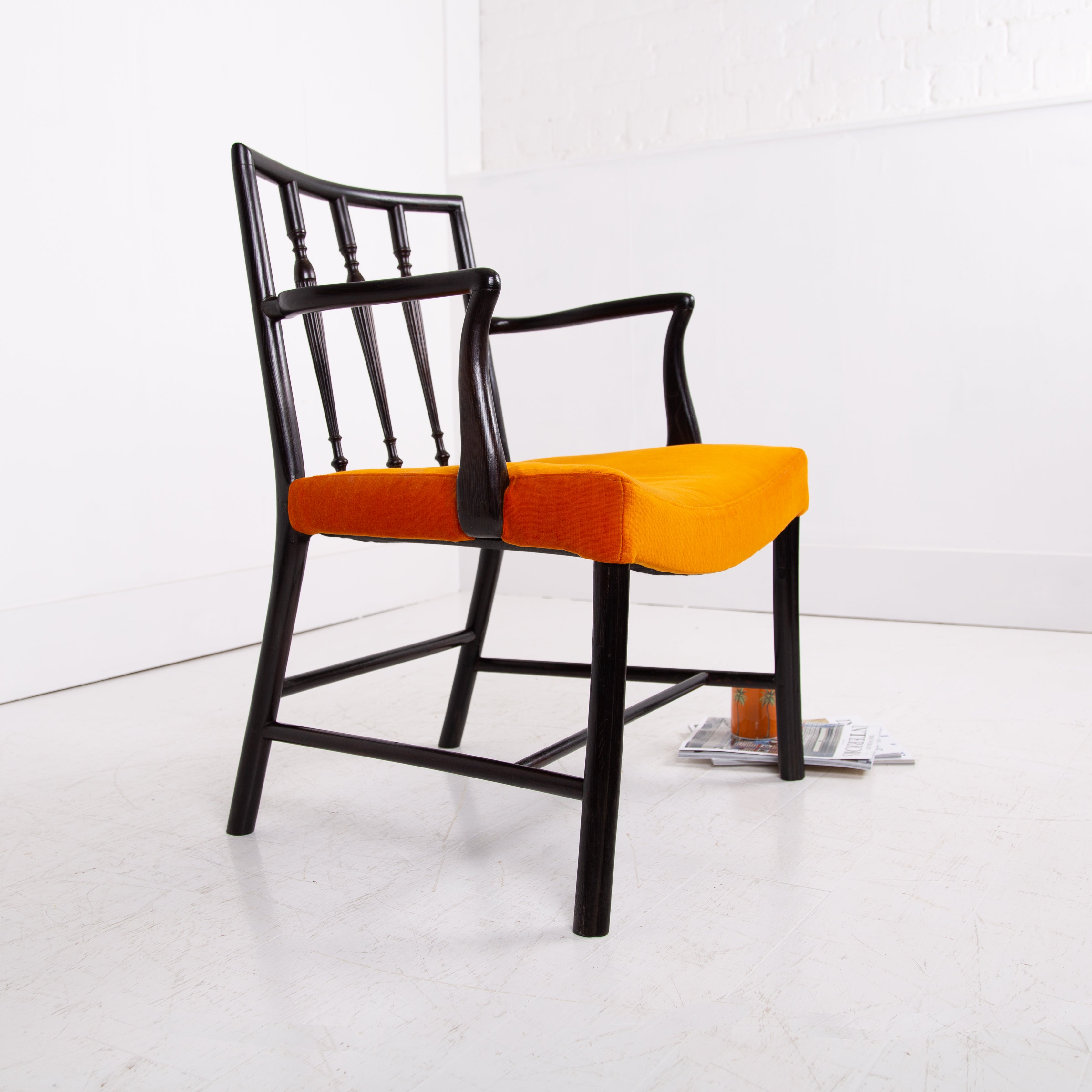 Having enjoyed a sensible refurbishment, this one sits well with its tangerine coloured soft strie velvet seat and good looking sheen to the frame. A couple of good sensible historic repairs but the chair sits very well and is ready for use.
