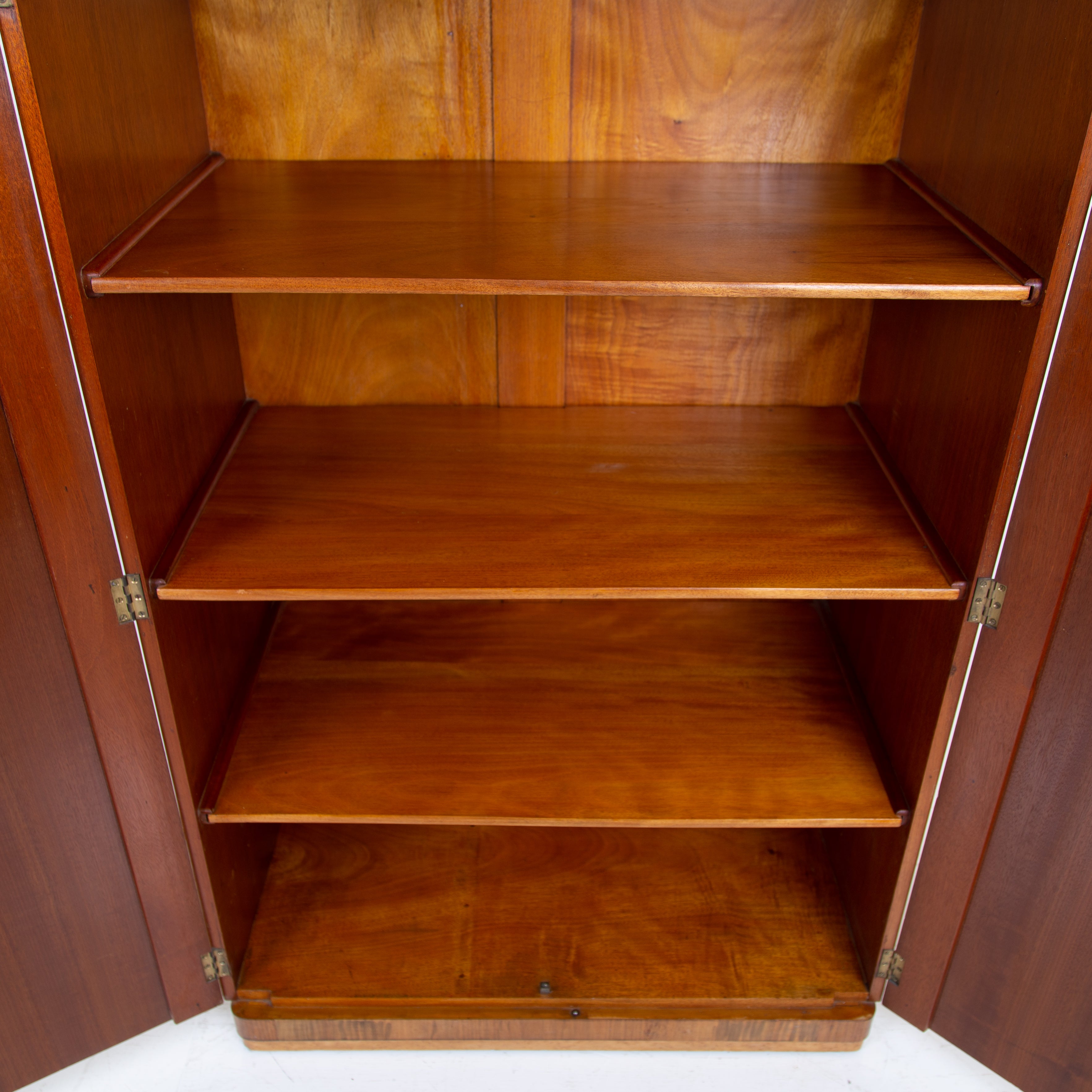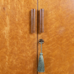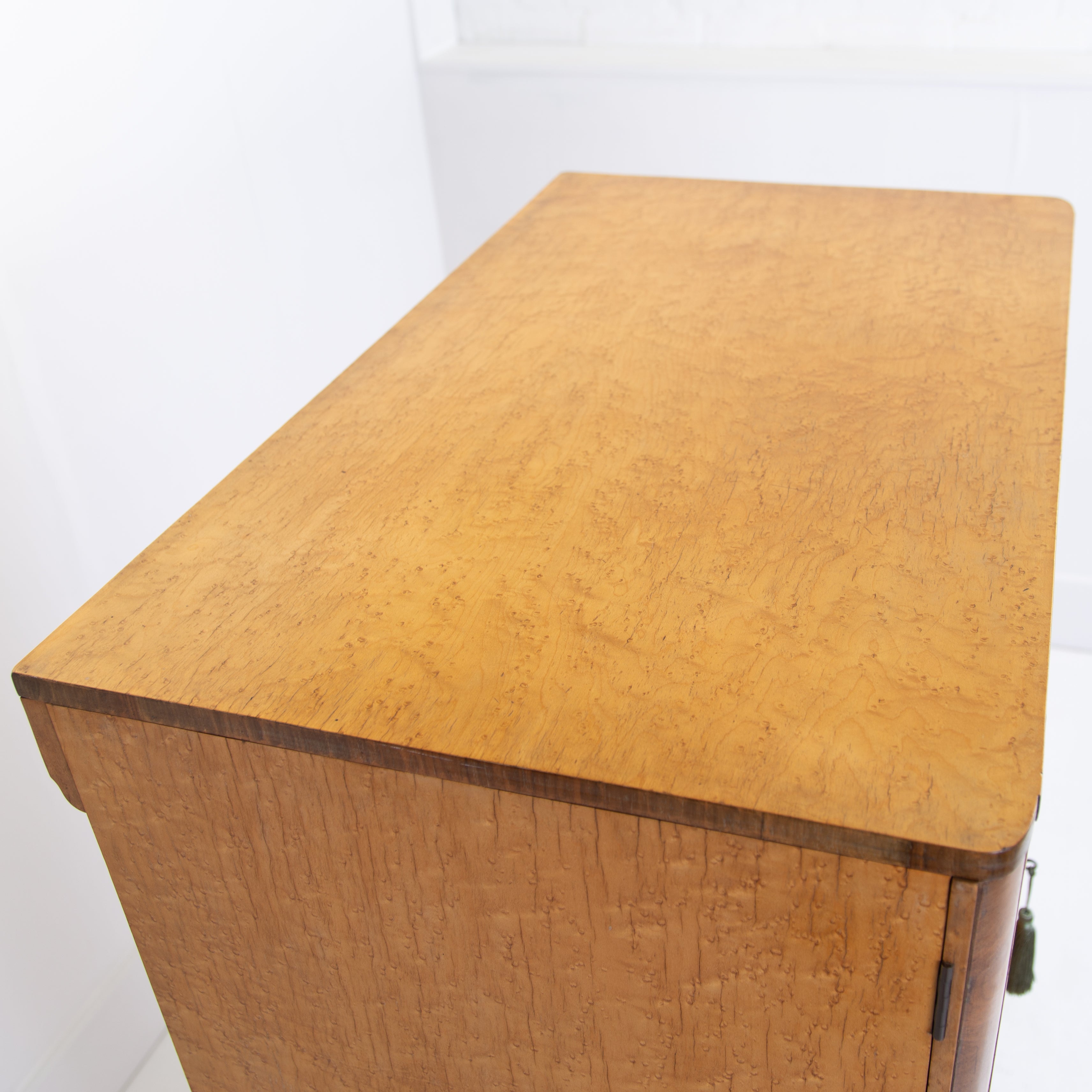 We have gentle, handsome hints of the deco period with this piece: the gentle shape to the top matched with the doors, a band of walnut to the edging - the top matched with one at the bottom, a lovely inverted plinth of birds eye maple tucked under this at the base, a very smart coloured interior, smart long handles and the original period escutcheon with working lock and key.