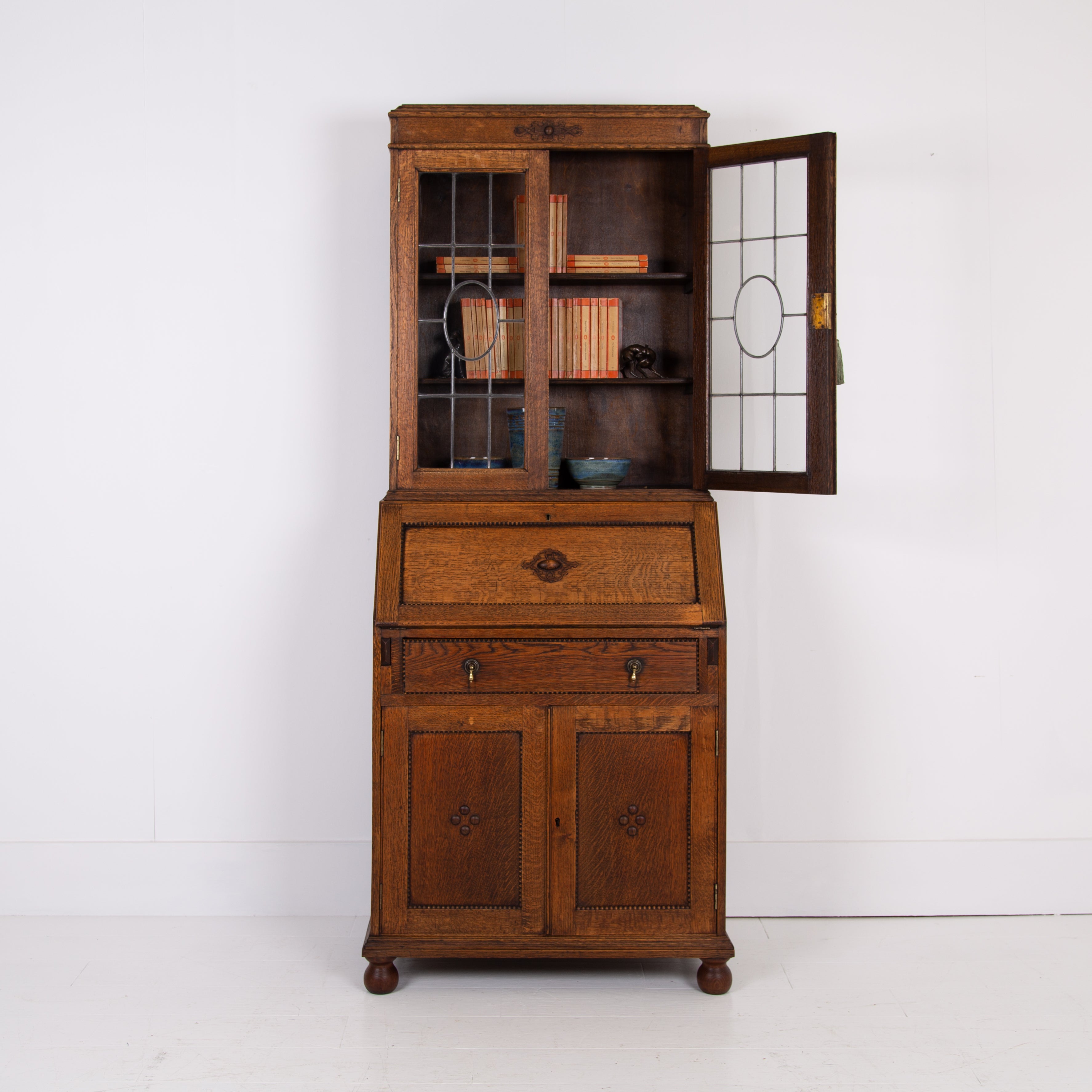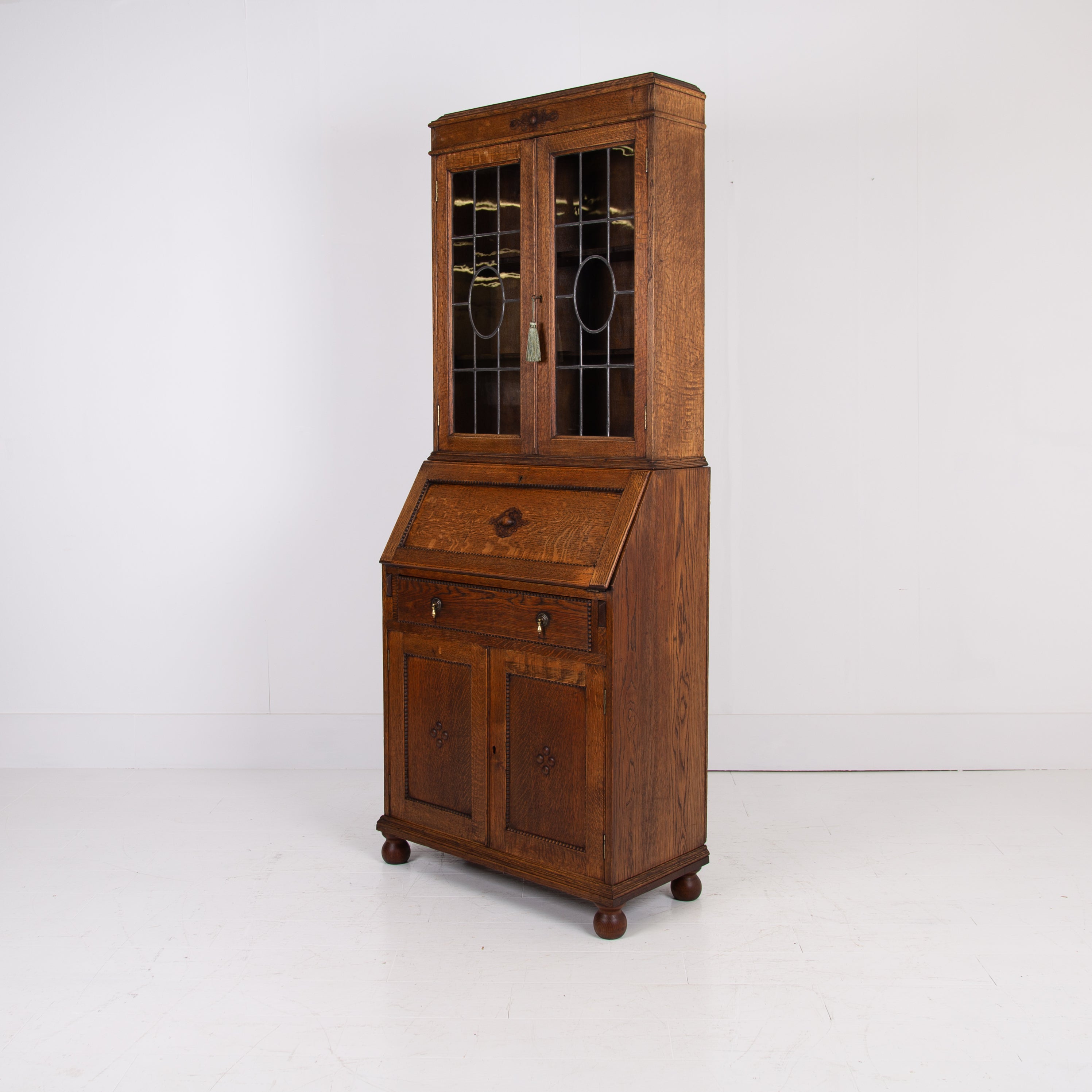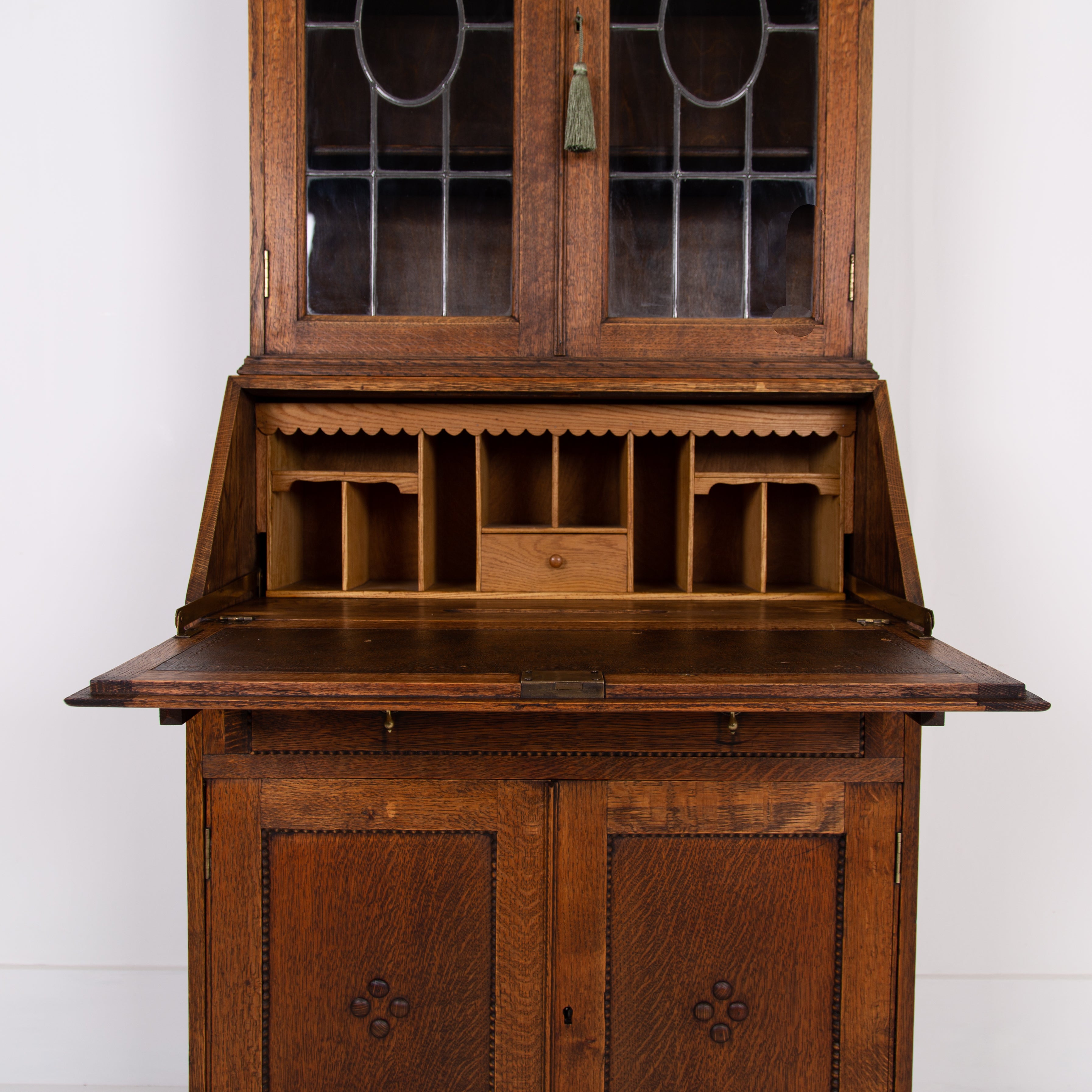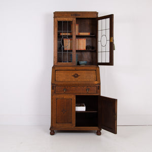 It sits in fine order with its appealing patterned lead glazed oak framed top section, fitted drop down interior, original leather writing area, attractively beaded long drawer with solid brass drop knobs, beaded door cupboard and ball feet.