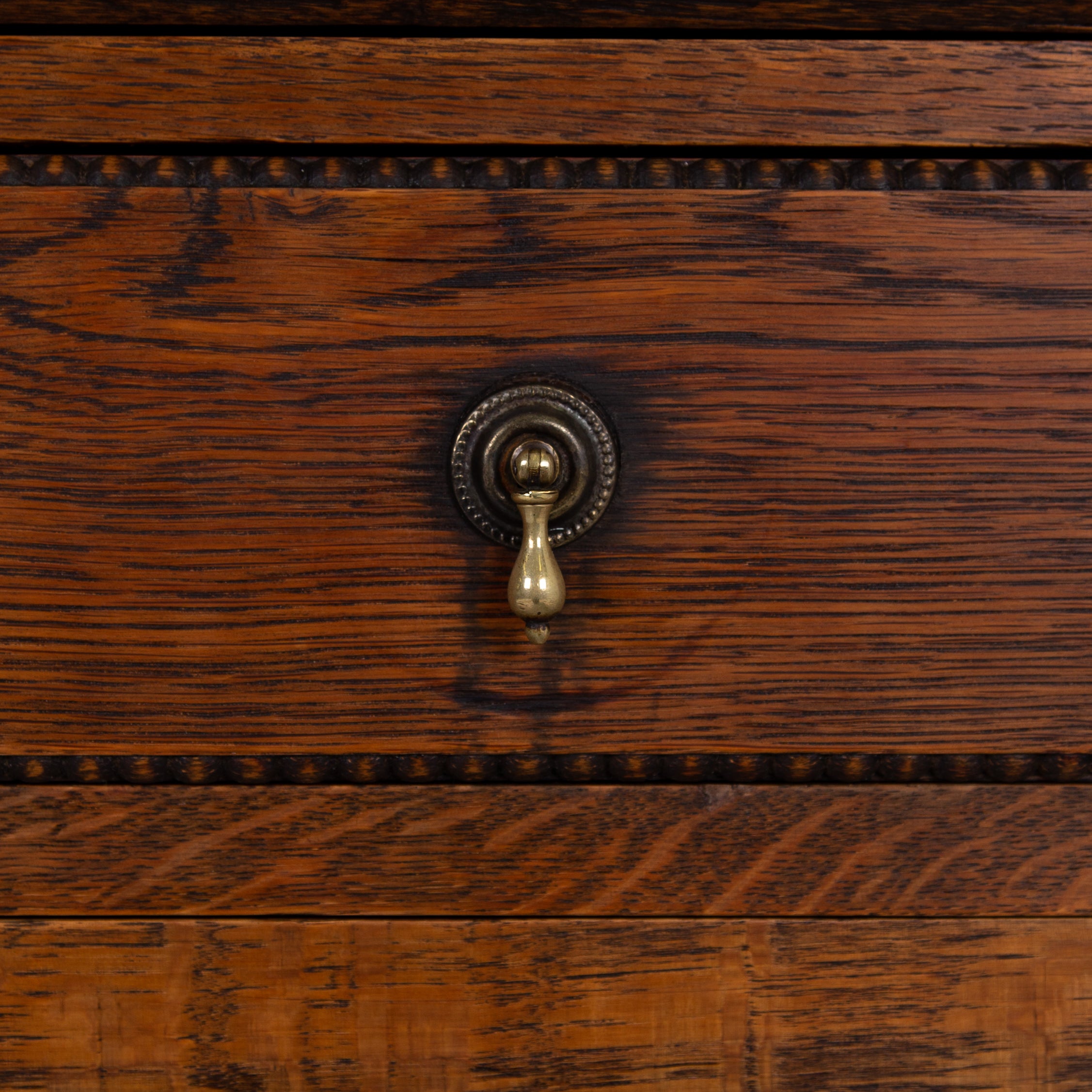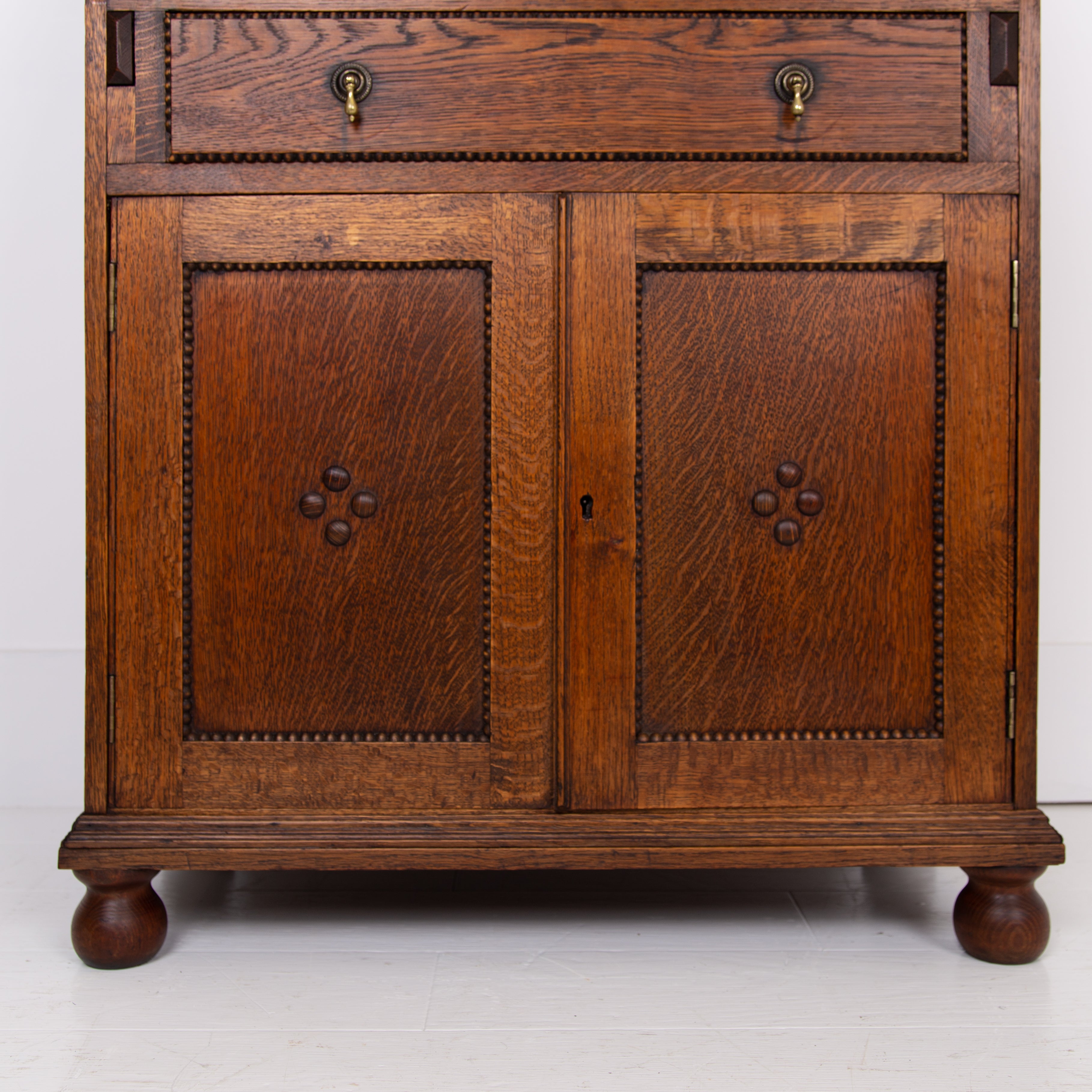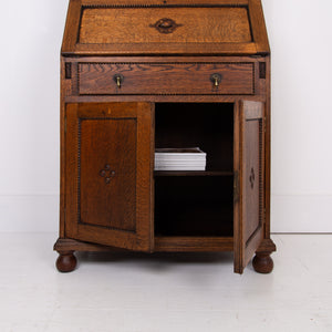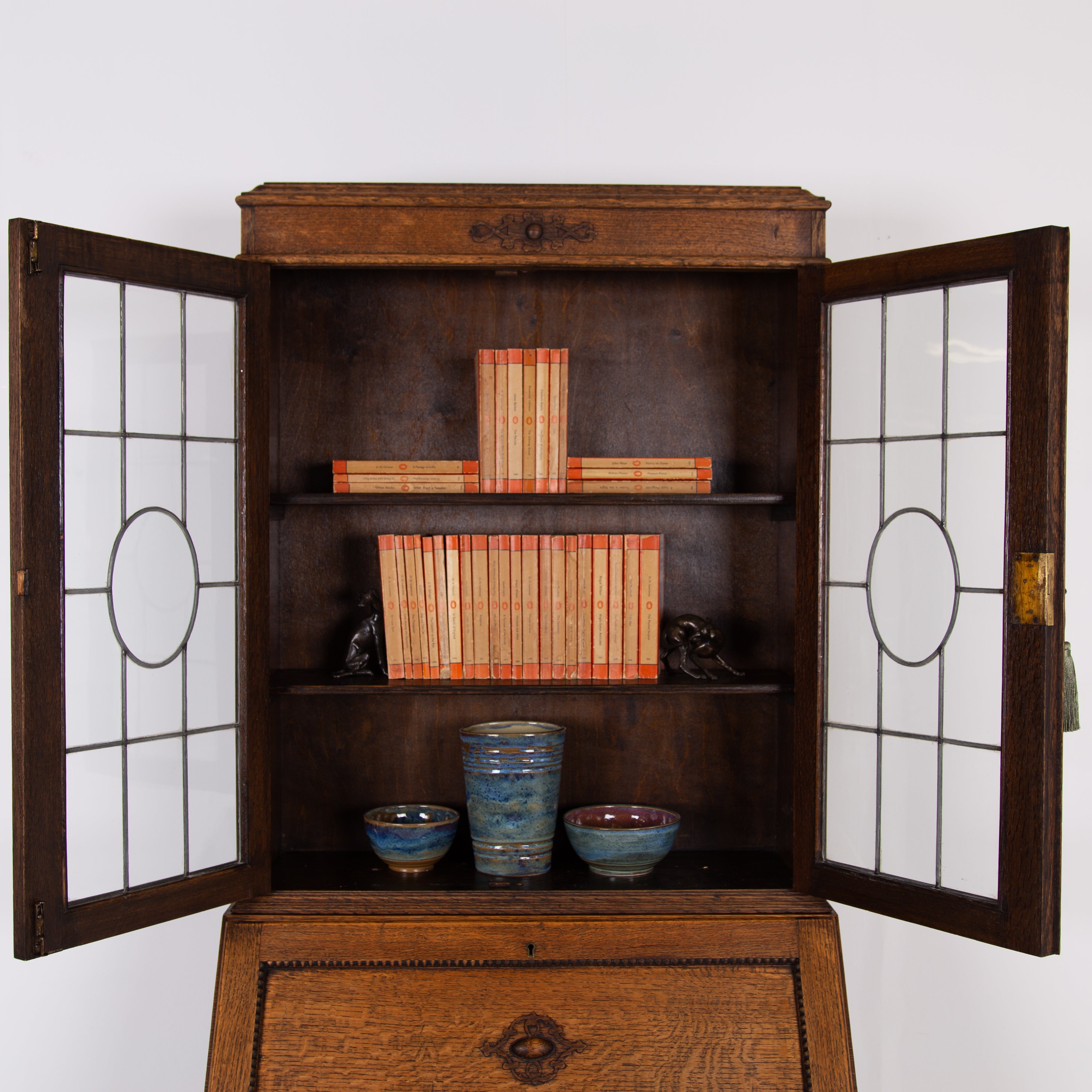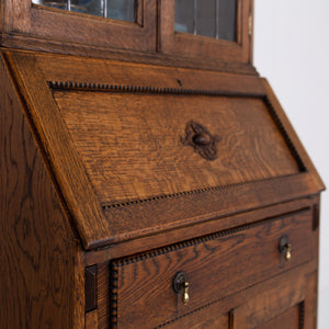 It sits in fine order with its appealing patterned lead glazed oak framed top section, fitted drop down interior, original leather writing area, attractively beaded long drawer with solid brass drop knobs, beaded door cupboard and ball feet.