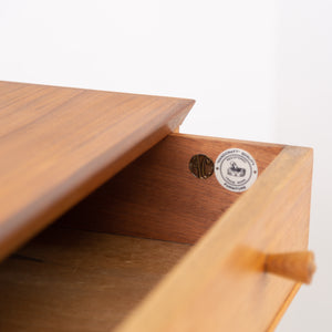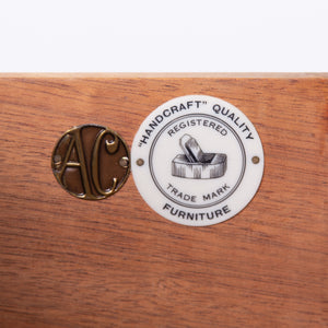 Alfred Cox retailed in the top department stores including Heal’s and the simple, sleek design and the use of the right timber makes this one shine. The attention to detail is wonderful. So often makers use substandard timber on the sides, however this chest possesses a stunning grain to the walnut on both sides. The graduated drawers are a perfect fit in a lighter shade of walnut and sit neatly perched on well angled legs. Perfect for so many spaces in the home, C.1960 with makers badges in the top drawer.