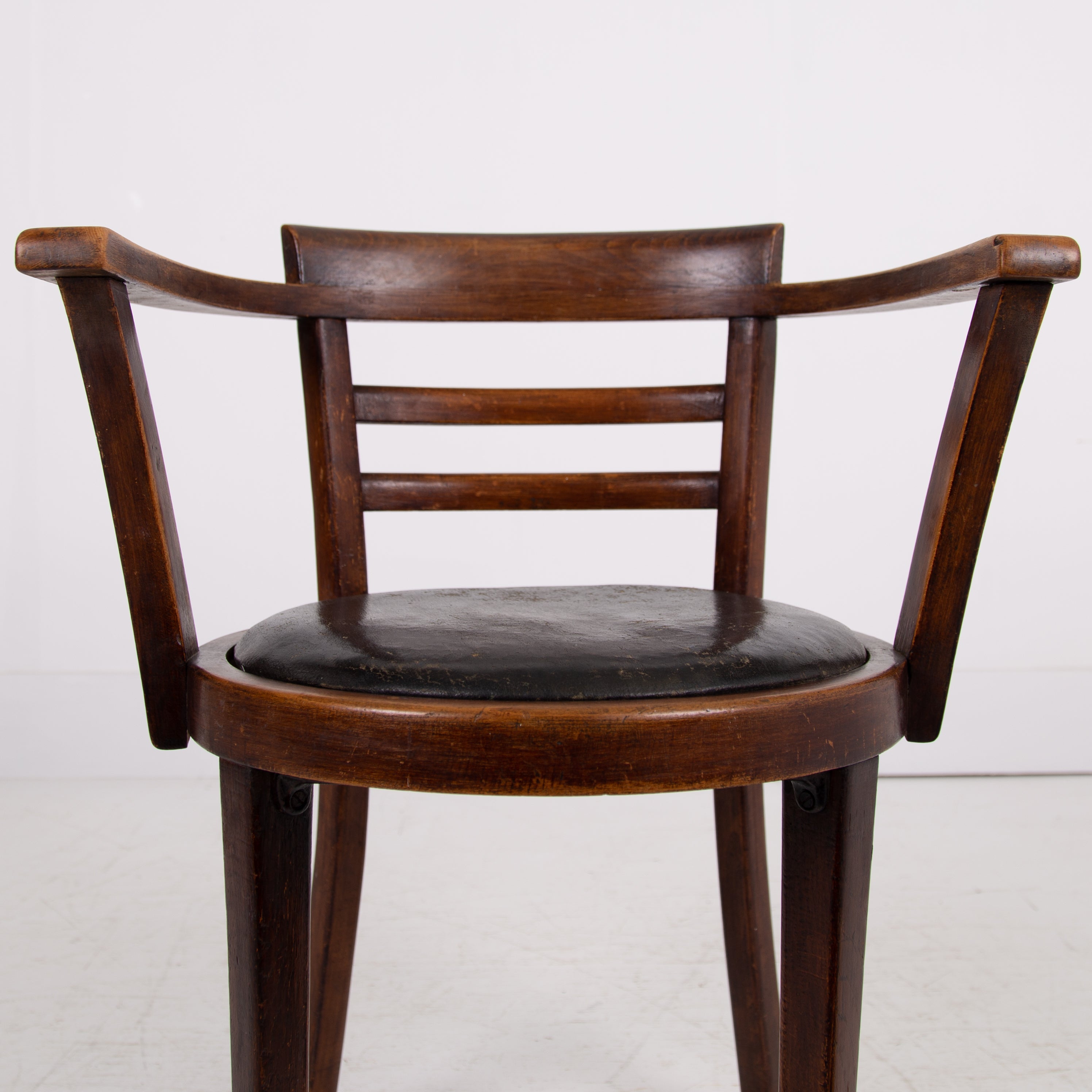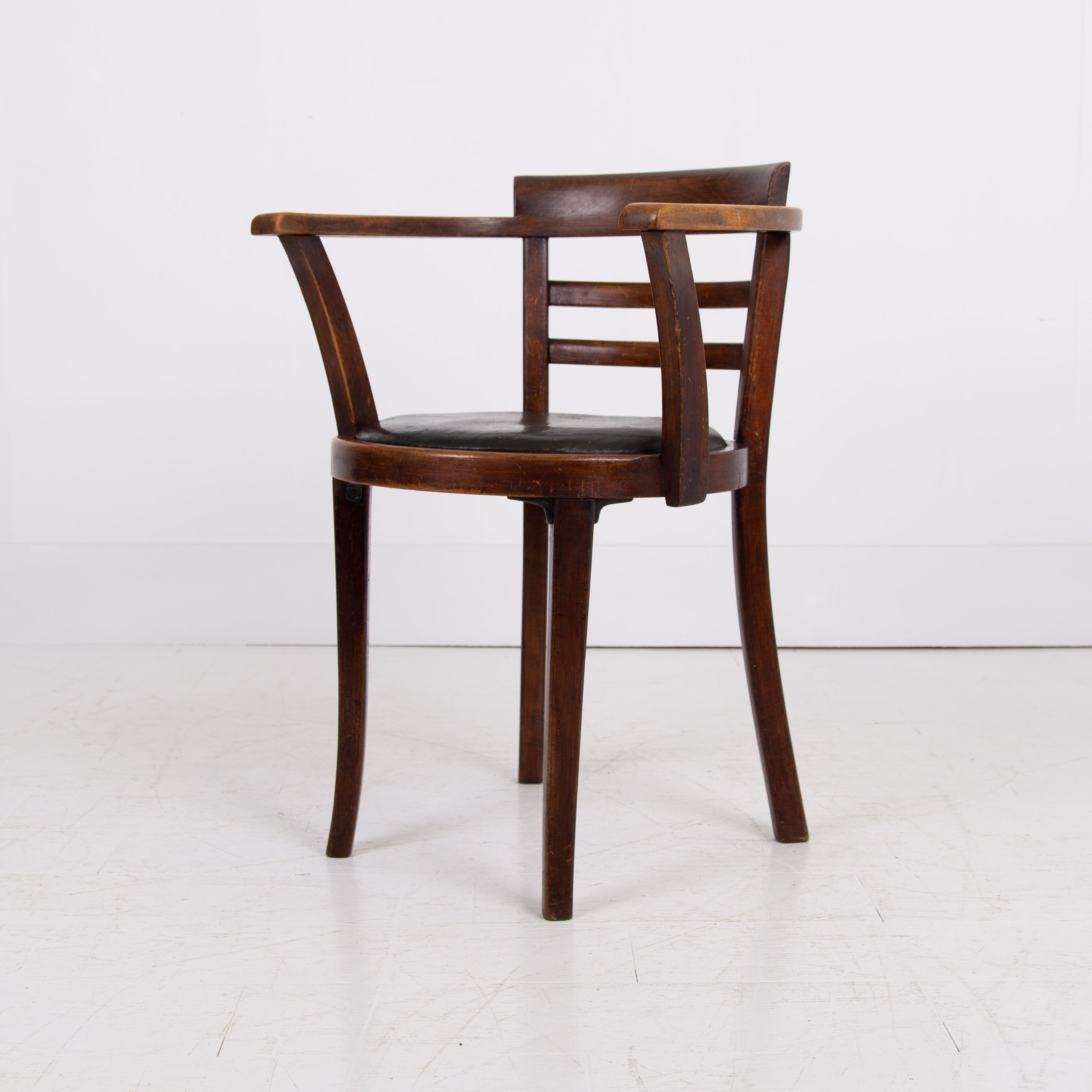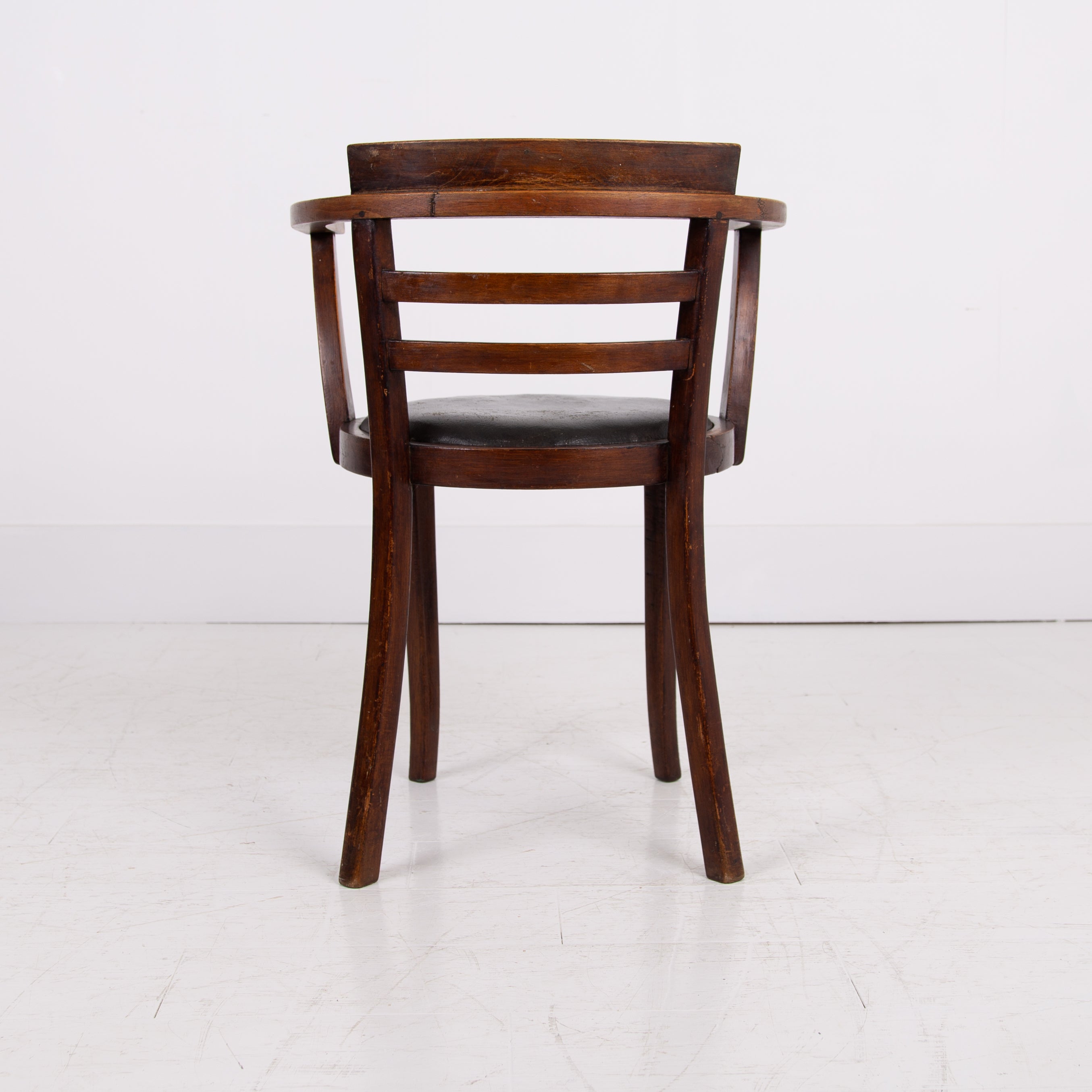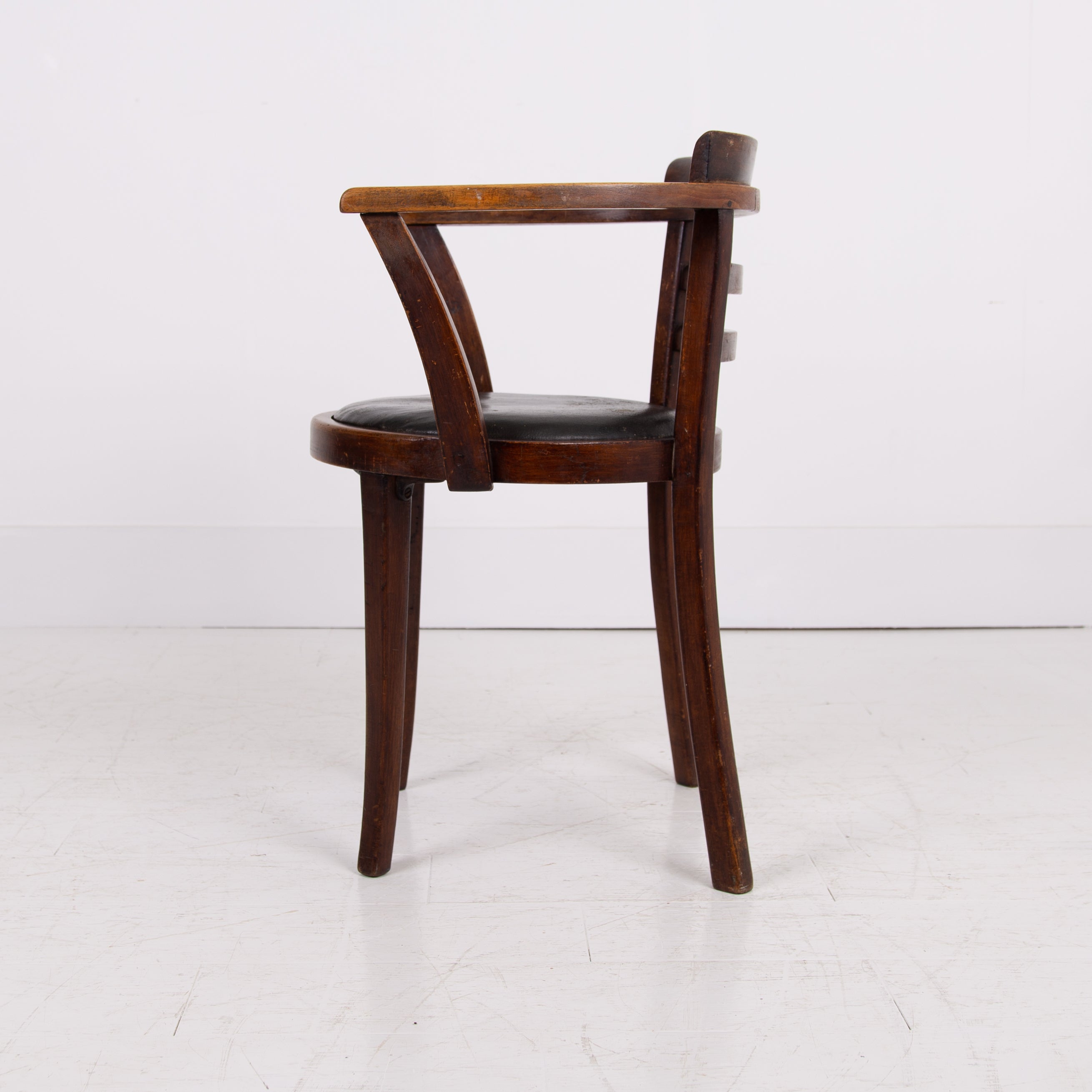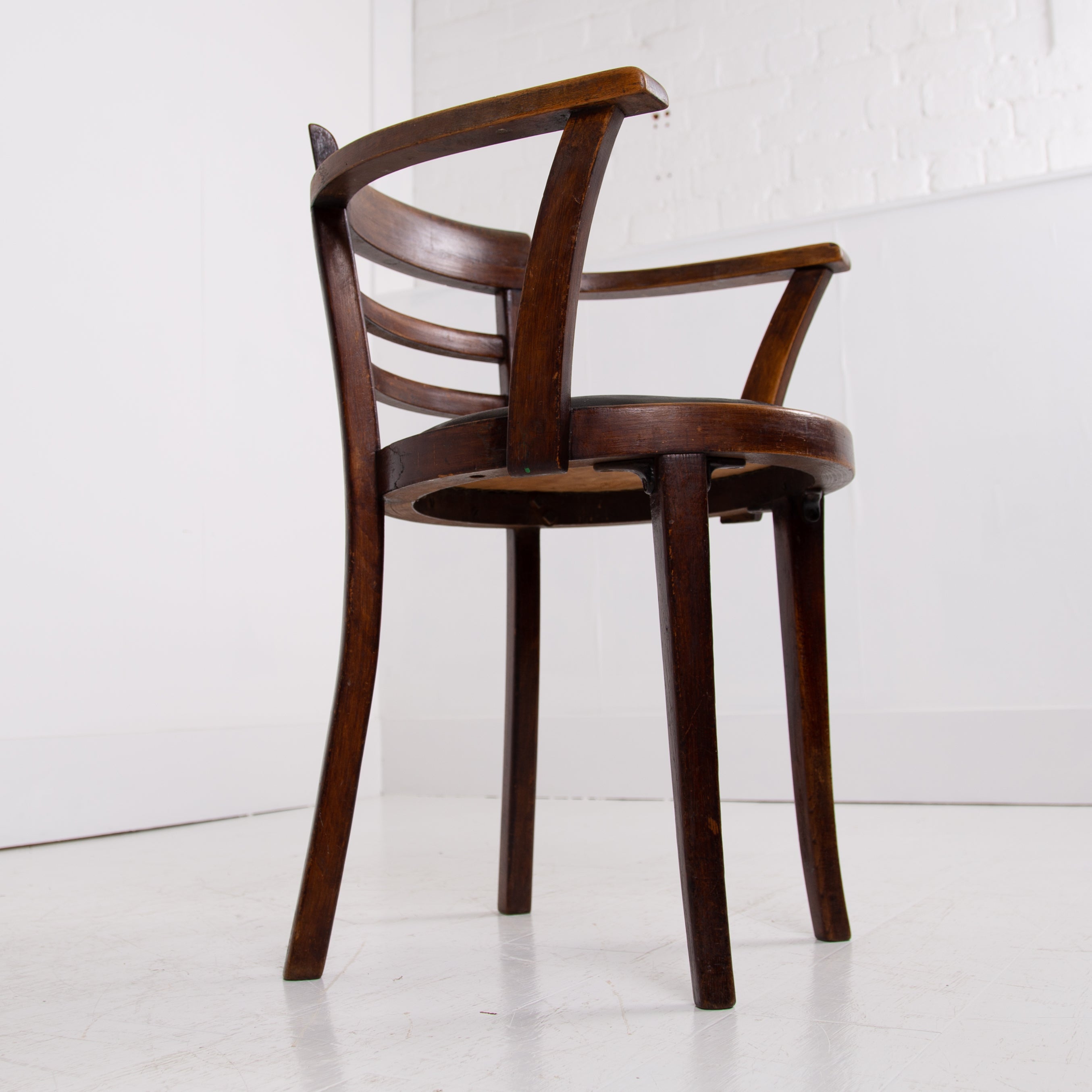 It's got a lovely design and form to it, especially liking the stepped back rail - very much of the era and original black aged Rexine seat - so many times replaced. Condition is good with plenty of aging to the bentwood frame and the seat but perfectly usable. We have lightly cleaned the piece and ensured its ready to place - expect wear and patina on this one.