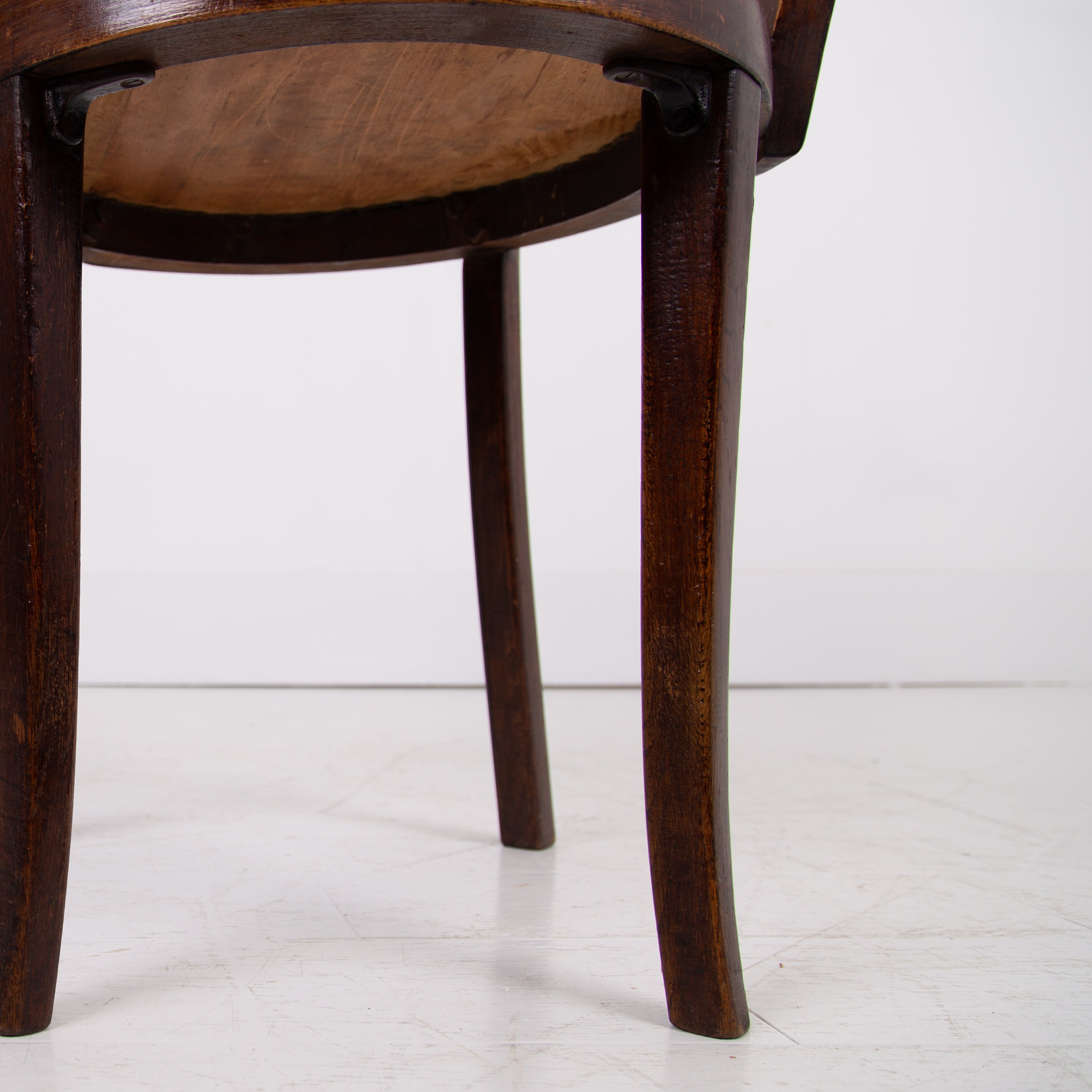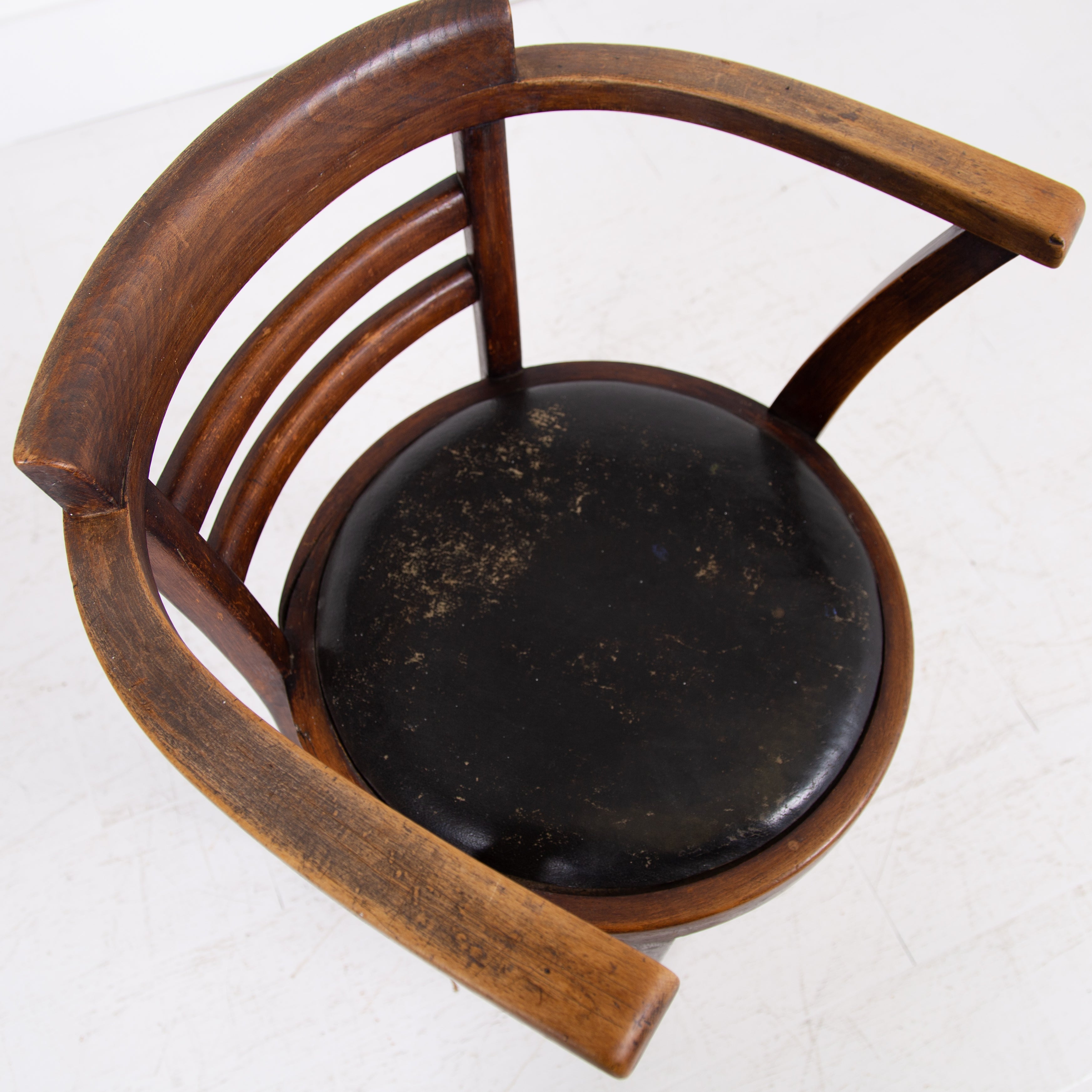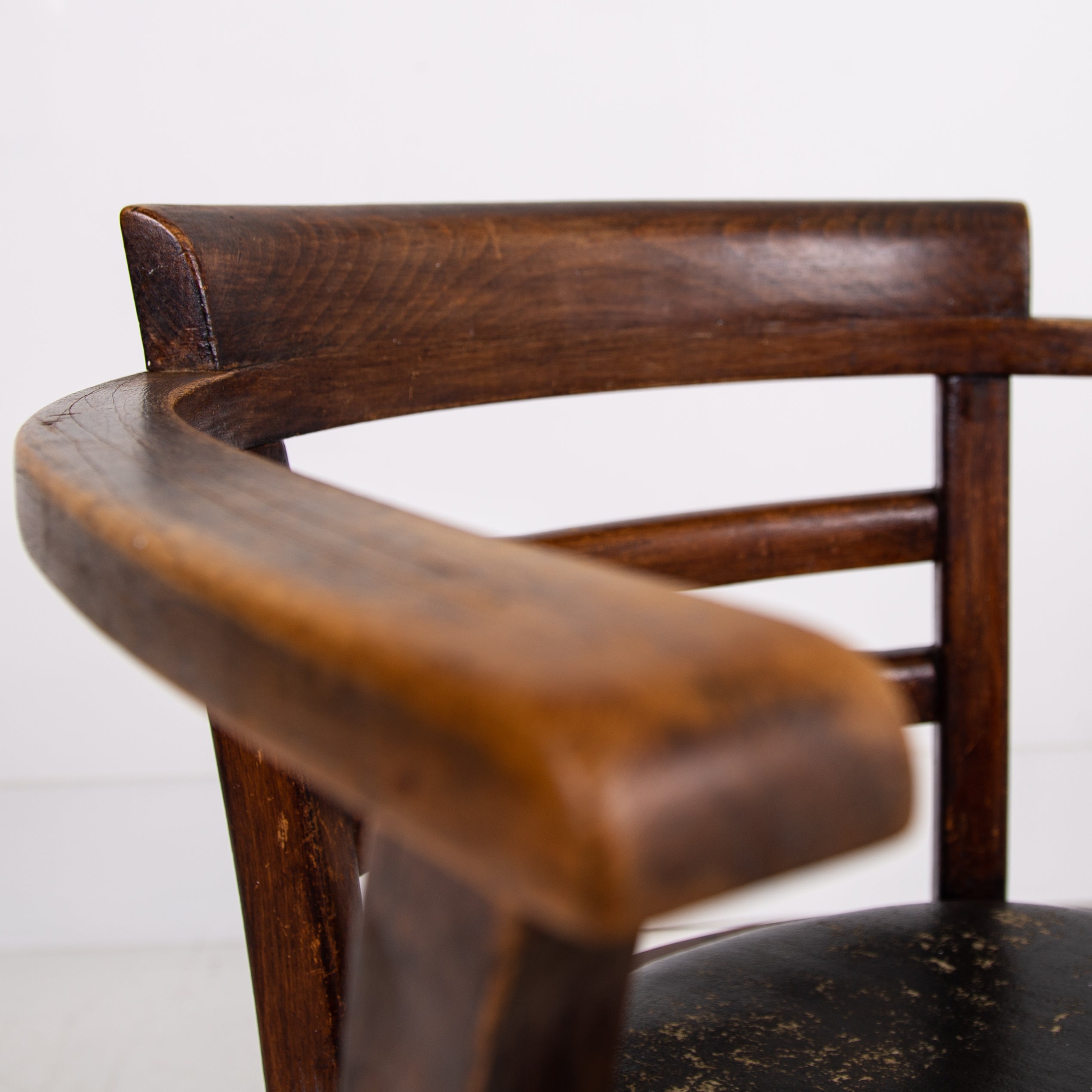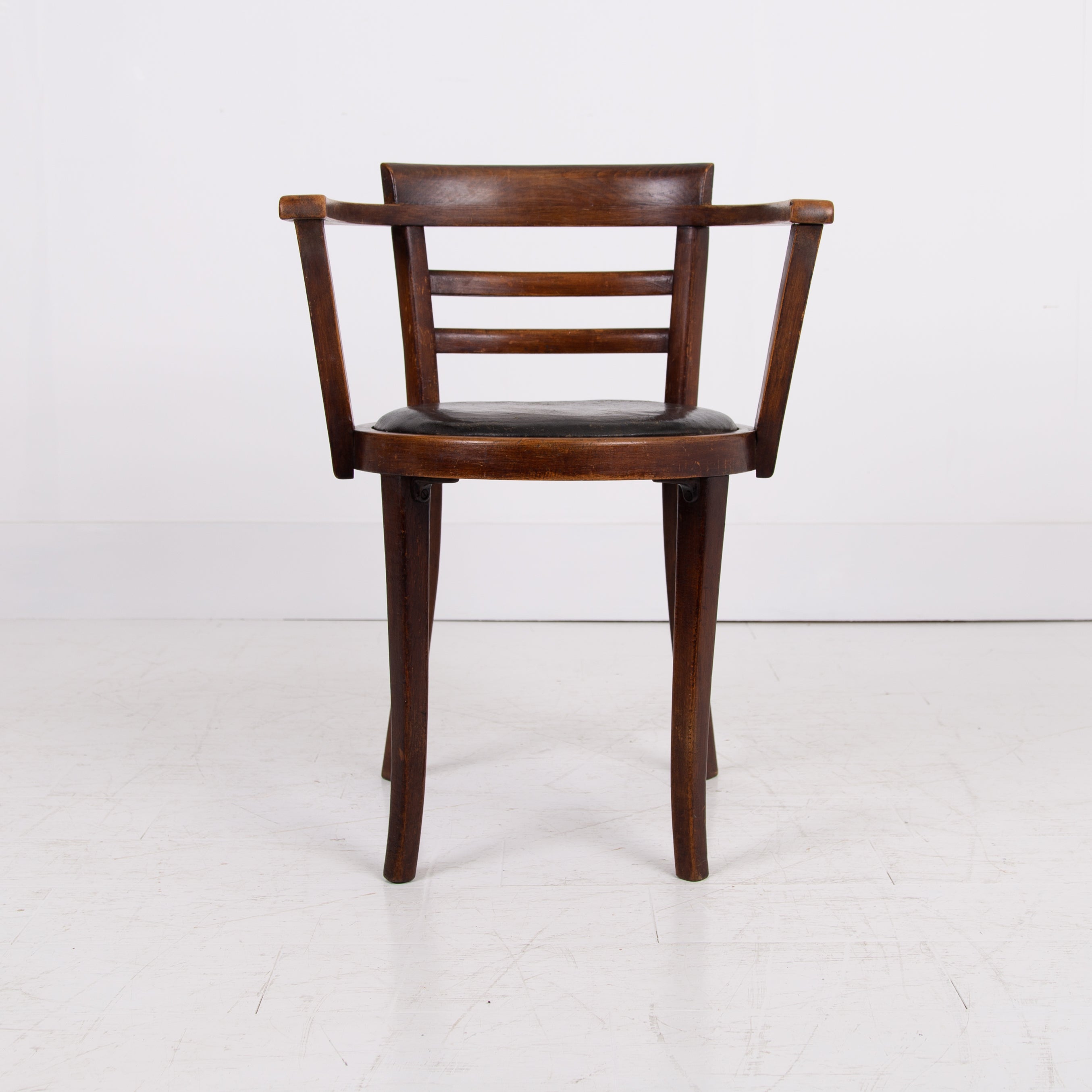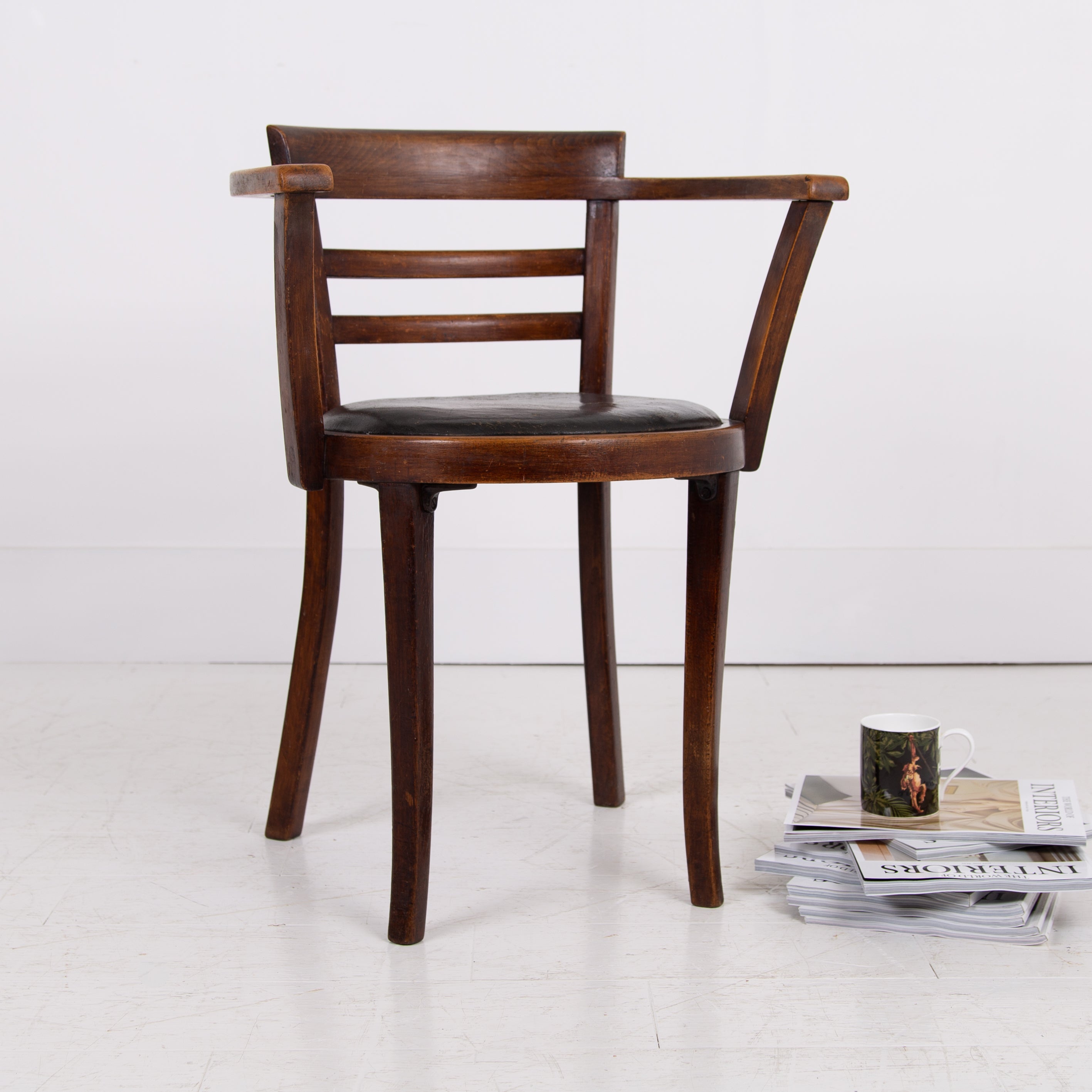 It's got a lovely design and form to it, especially liking the stepped back rail - very much of the era and original black aged Rexine seat - so many times replaced. Condition is good with plenty of aging to the bentwood frame and the seat but perfectly usable. We have lightly cleaned the piece and ensured its ready to place - expect wear and patina on this one.