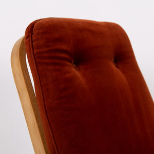 The chair sits in good order with its spring base and back giving good support to the burnt orange velvet buttoned shaped cushions, not new but in good order and usable. If you wish, our upholsterer could offer new cushions in a similar style and a cover for the rear springs at a cost of £310 plus VAT. You would require approximately 3 metres of fabric which we can assist with sourcing swatches etc. The frame has no cracks and comes with sensible day to day wear. We have carefully repolished the frame and ensured its ready for placing.