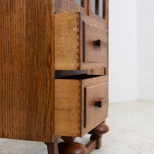 We would assume a commission piece with skilful craft and great design. We have a lot to admire about this piece; the glazed doors with those slightly softened curved corner frames, the little oak reeded handles to the two lower drawers, the oak bentwood base with the bulbous oval shaped spheres and let's face it the condition is superb with working locks and key to the 2 shelved glazed section and little cupboard.