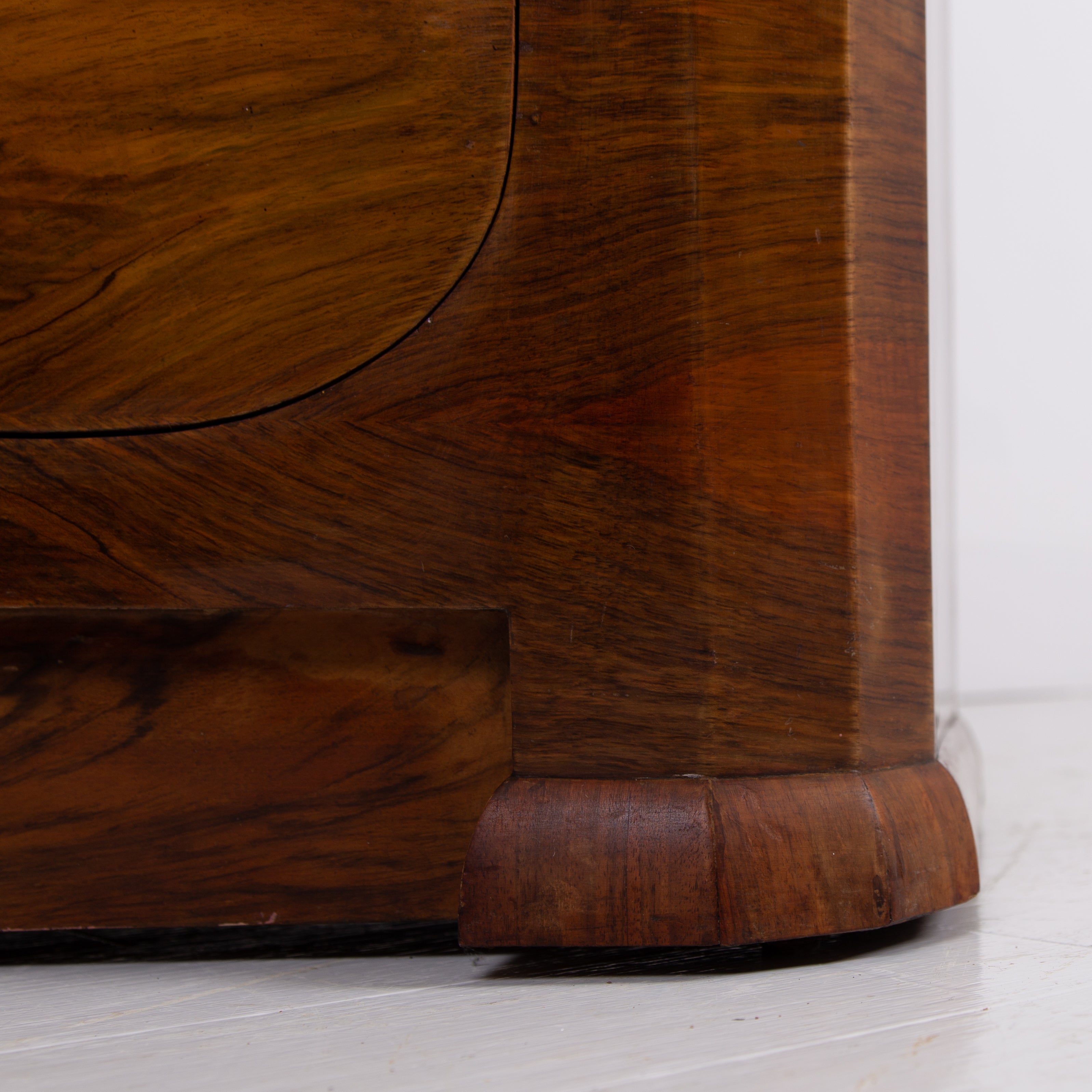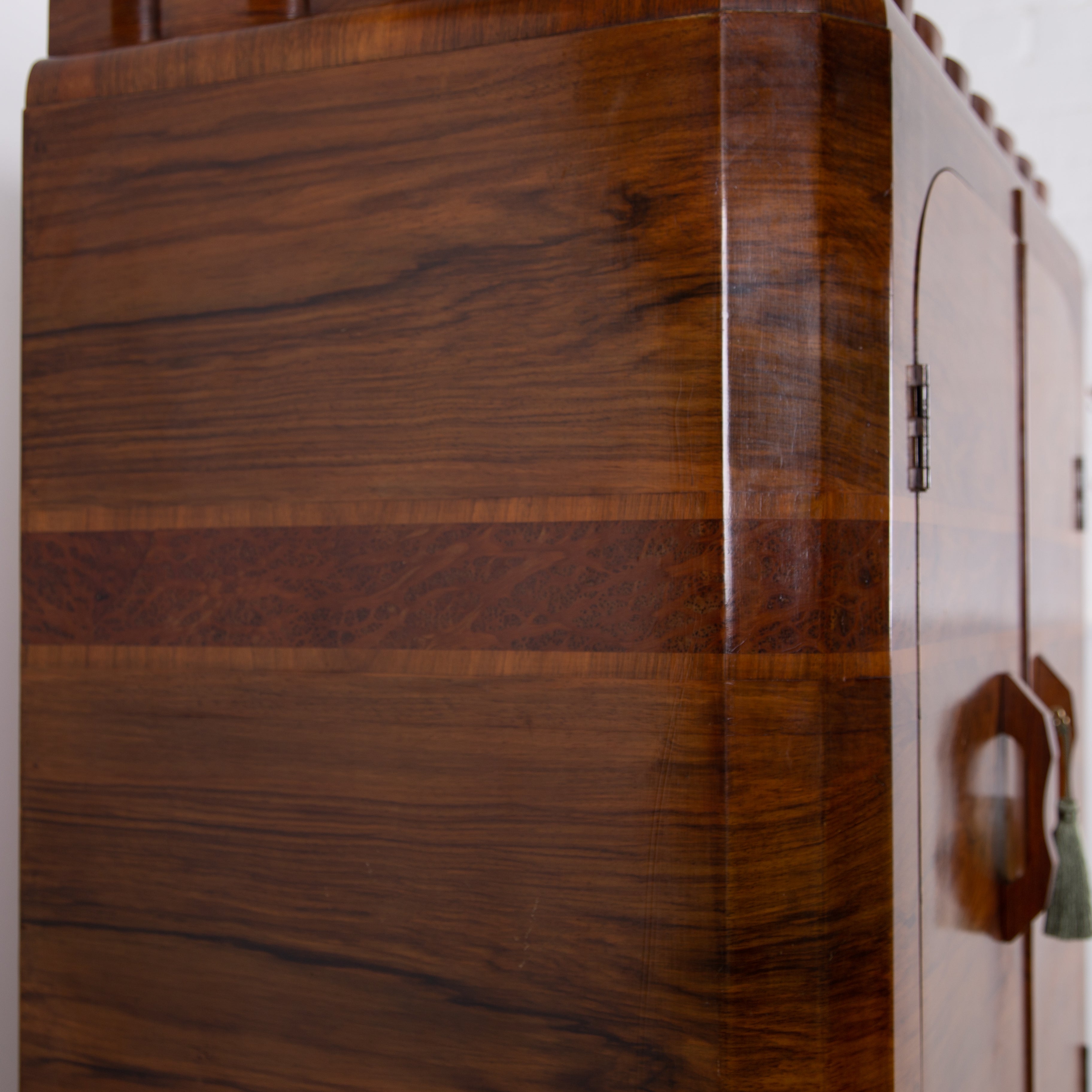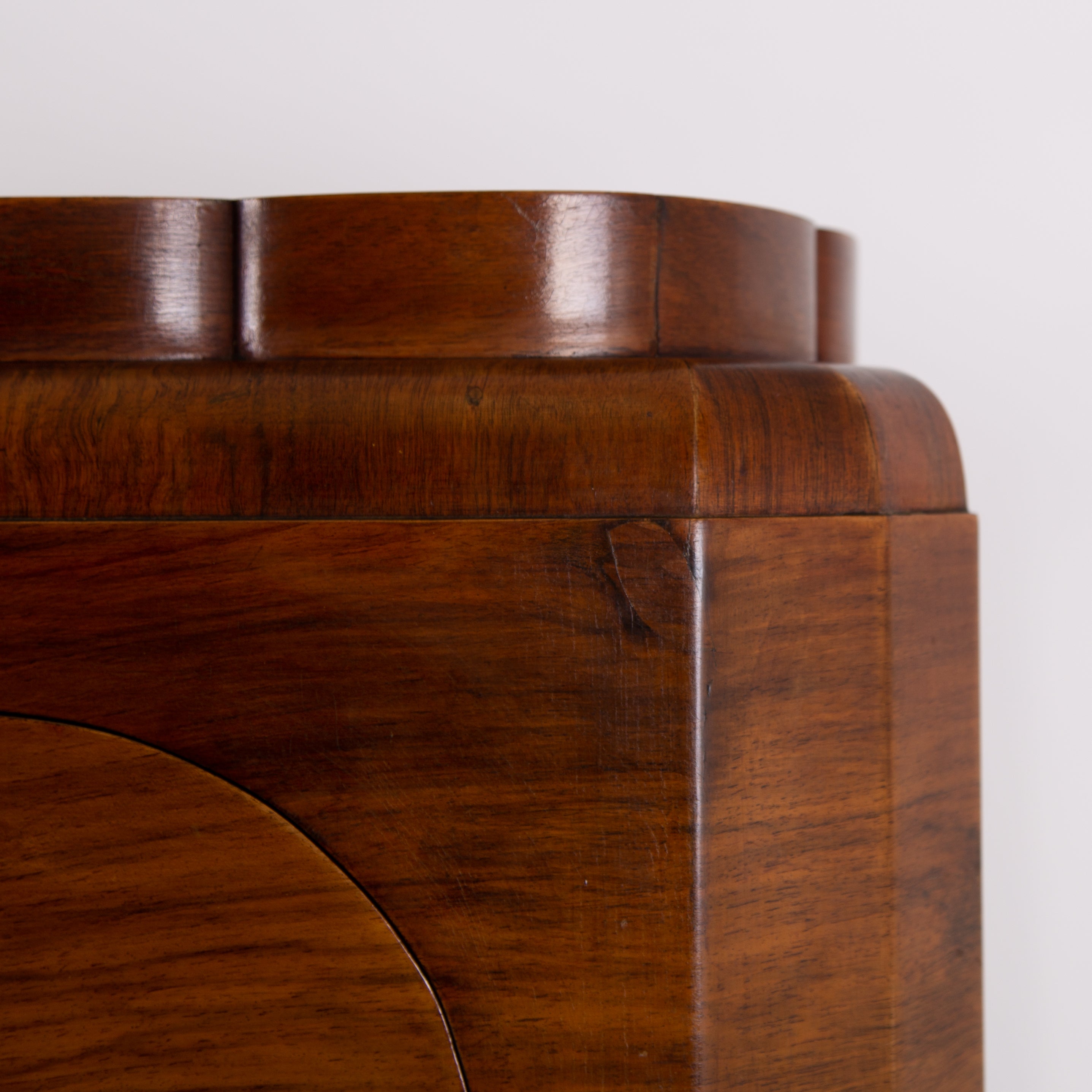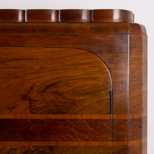 Fabulous Art Deco piece C1930 in walnut of good scale and wonderful design - especially enjoying the shapely top. This one is true Deco in style and design with its decorative walnut veneer finish with its contrasting band of burr walnut wrapped around the front and sides.