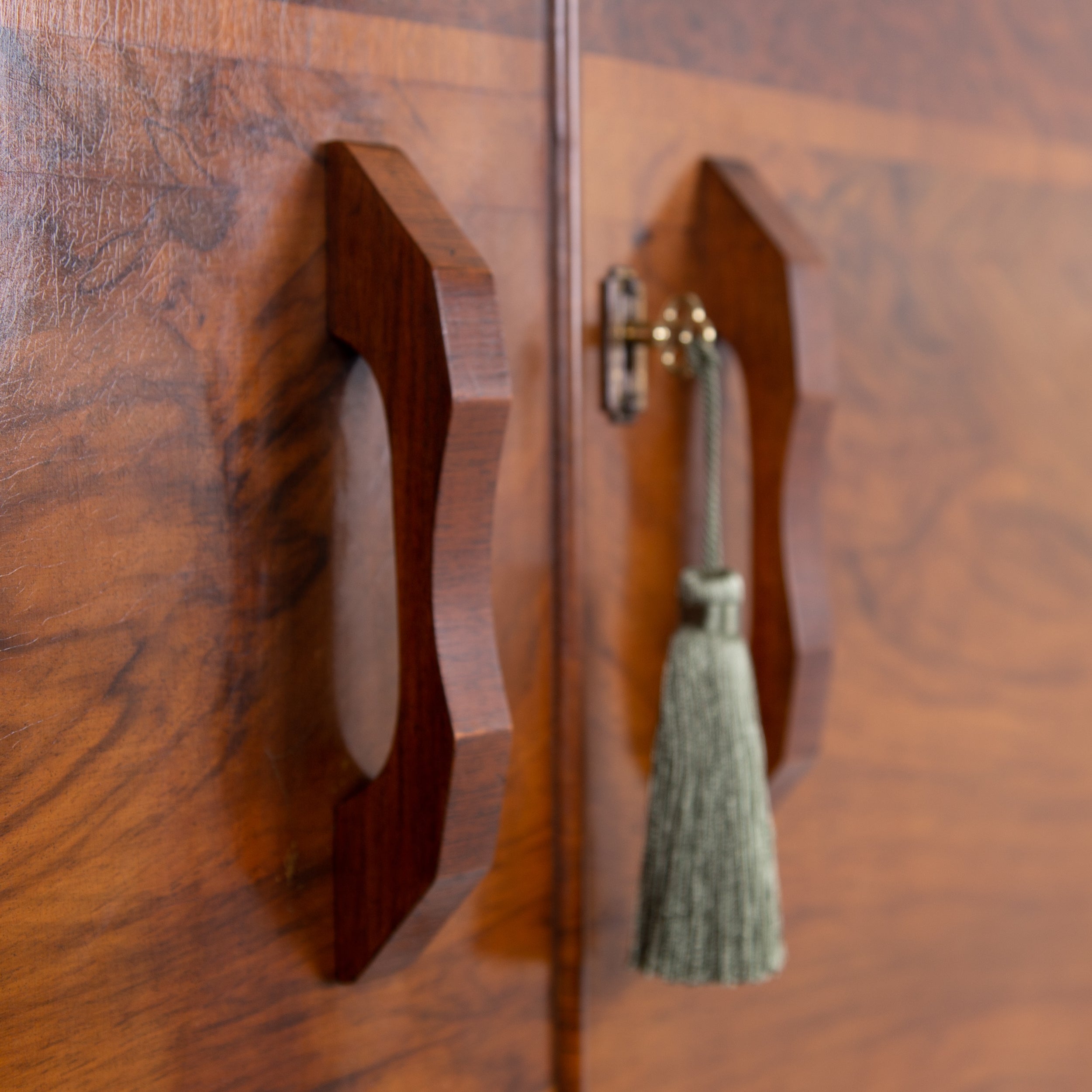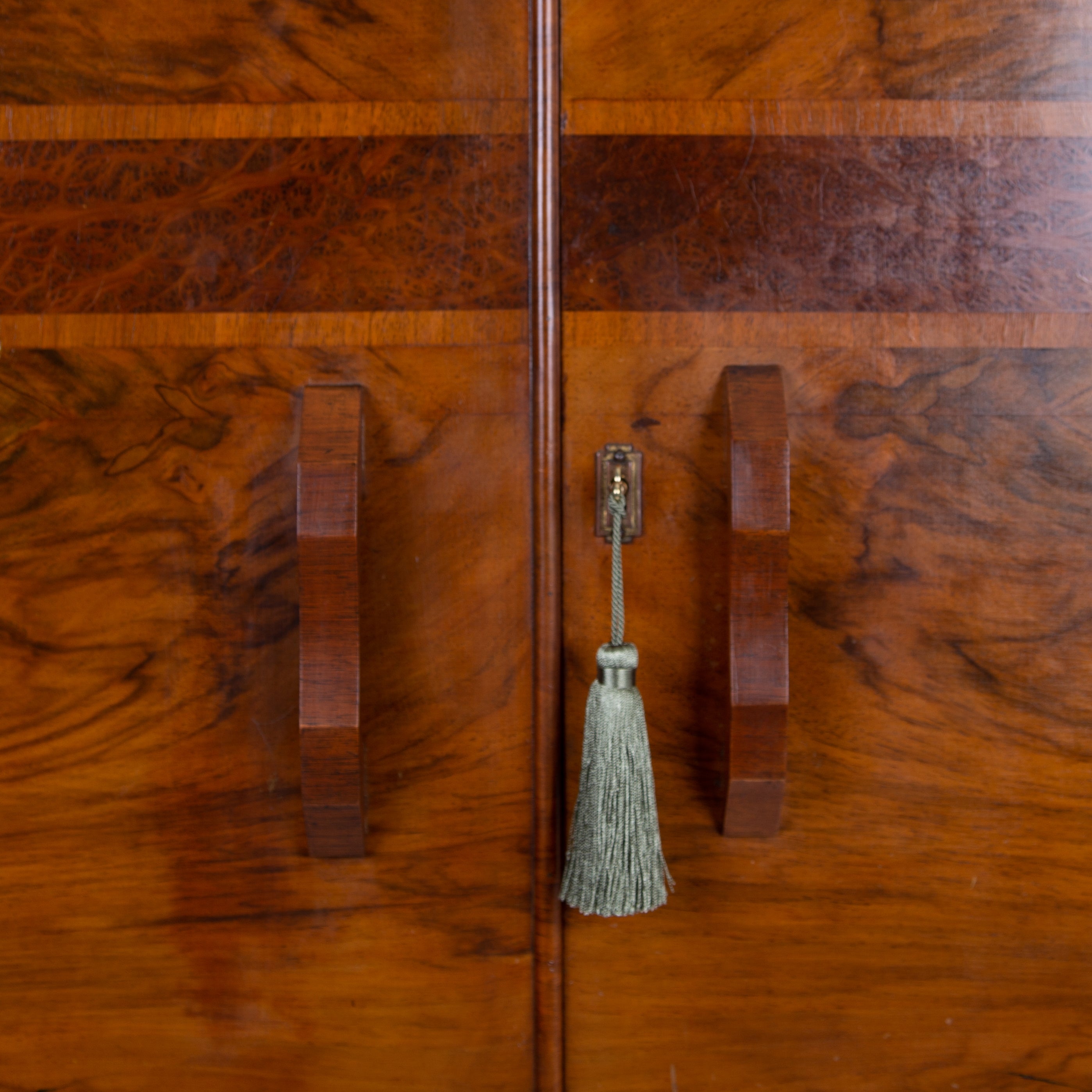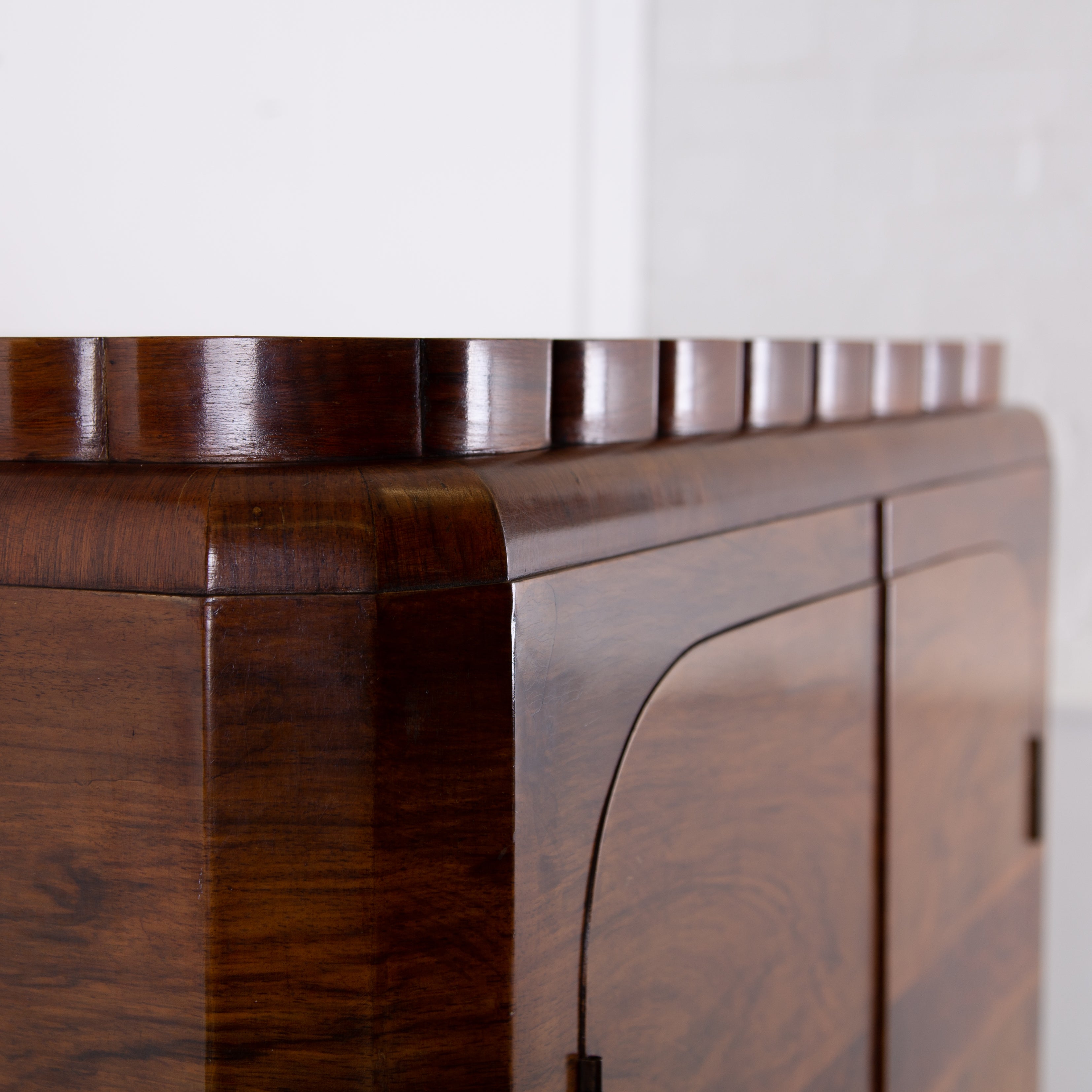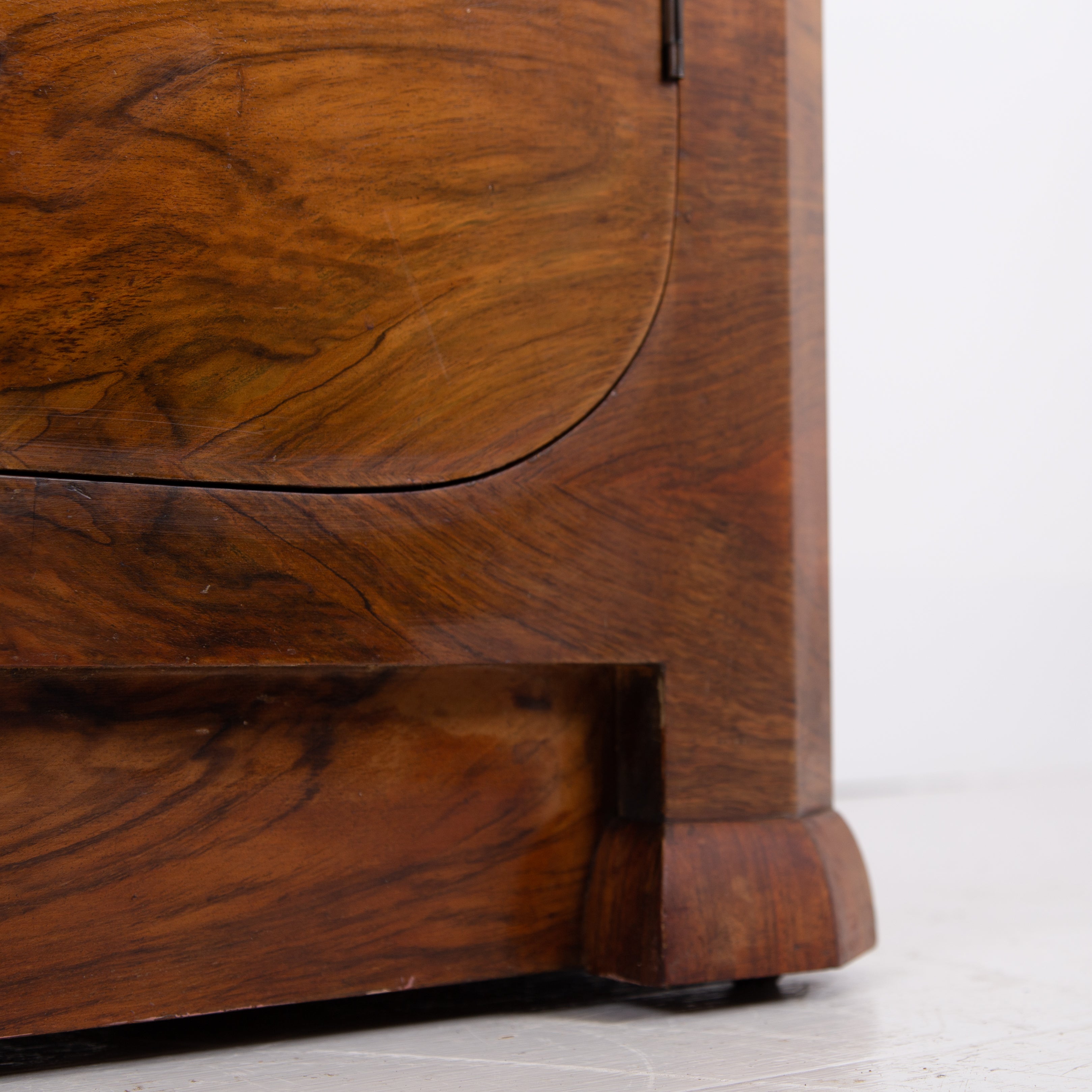 Fabulous Art Deco piece C1930 in walnut of good scale and wonderful design - especially enjoying the shapely top. This one is true Deco in style and design with its decorative walnut veneer finish with its contrasting band of burr walnut wrapped around the front and sides.