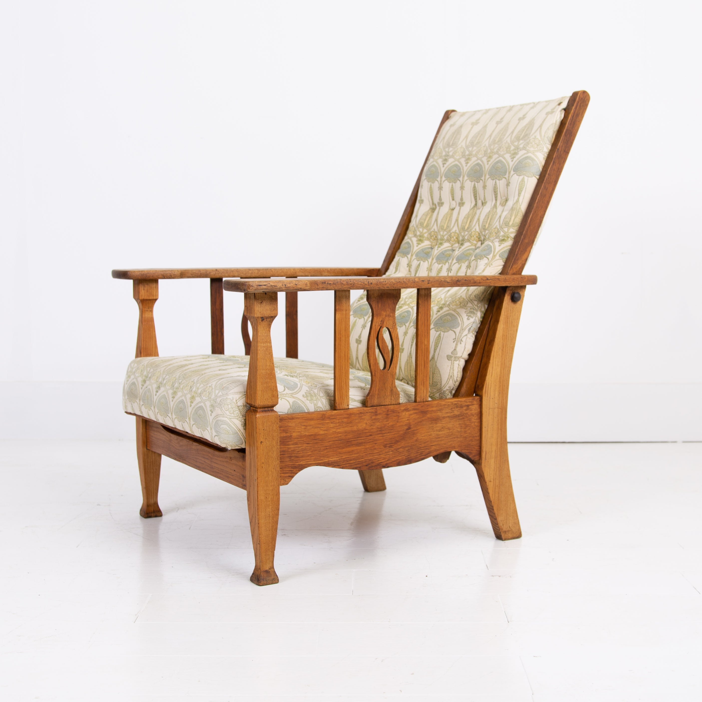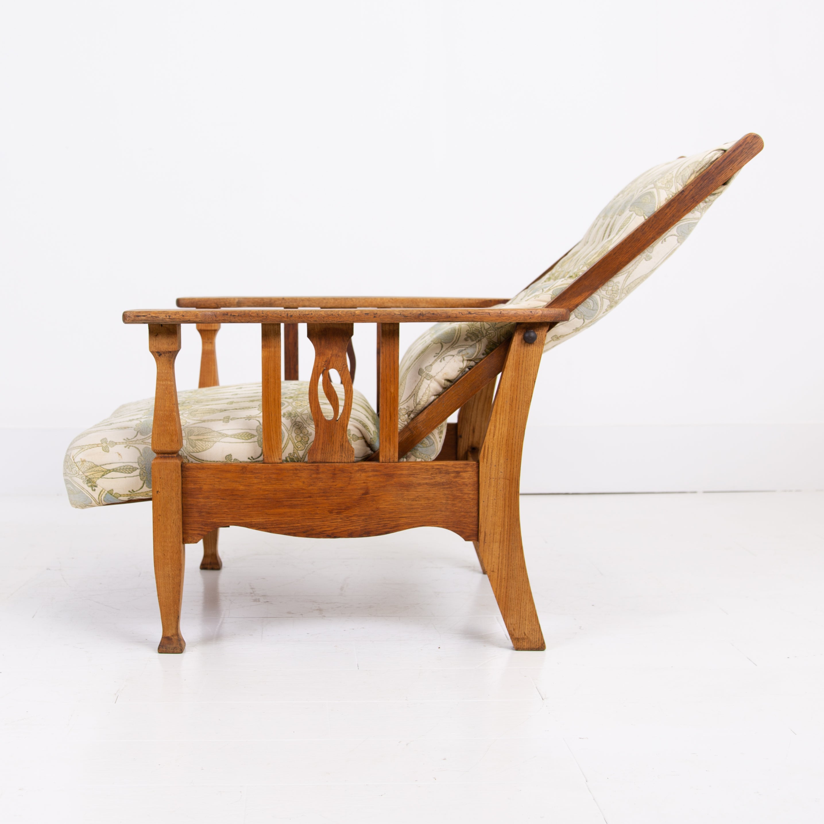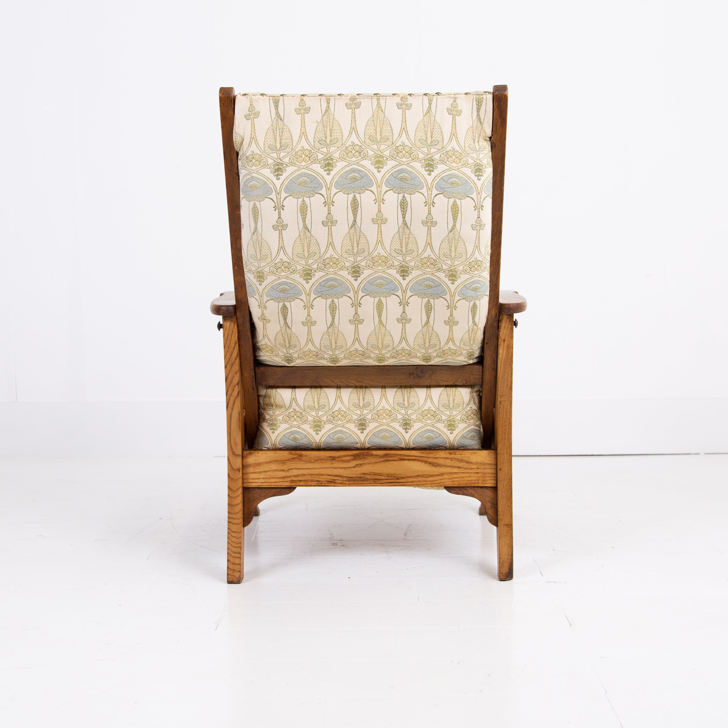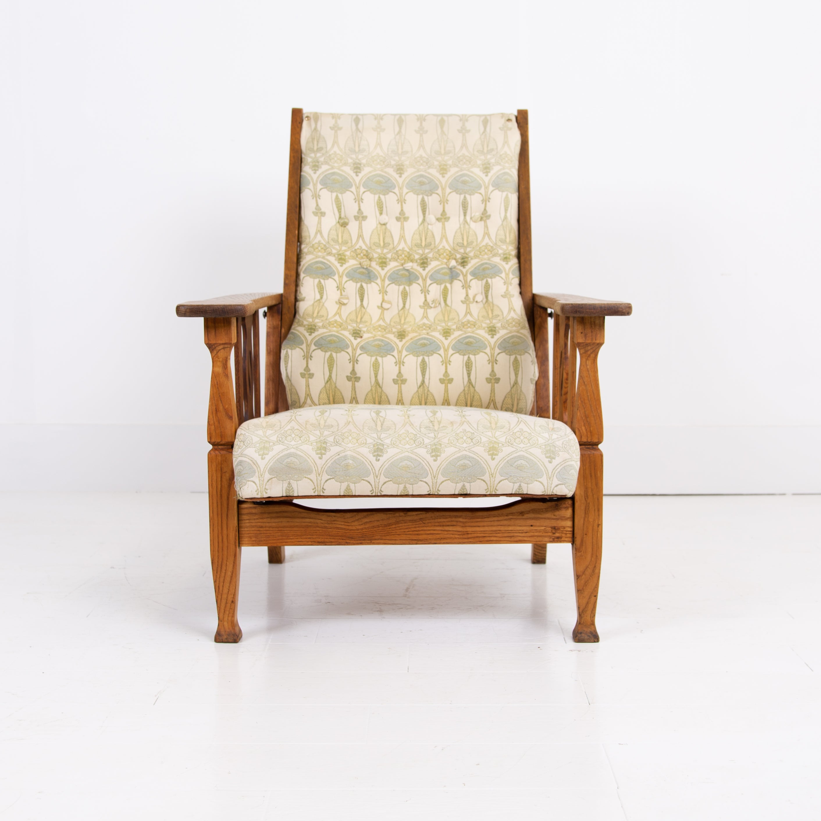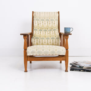 The chair currently sits in a worn and marked patterned Mackintosh woven jacquard fabric and our upholsterer Mark would be happy to fully reupholster at a cost of £380 plus VAT and you would require around 4 metres of fabric which we are happy to assist in sourcing etc. The lighter oak frame has historic aging and as mentioned offers a light reclining motion if you wish to chill.