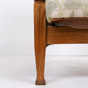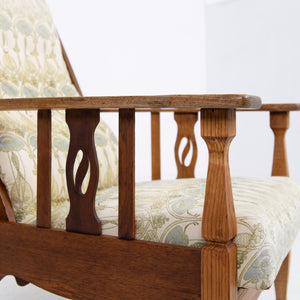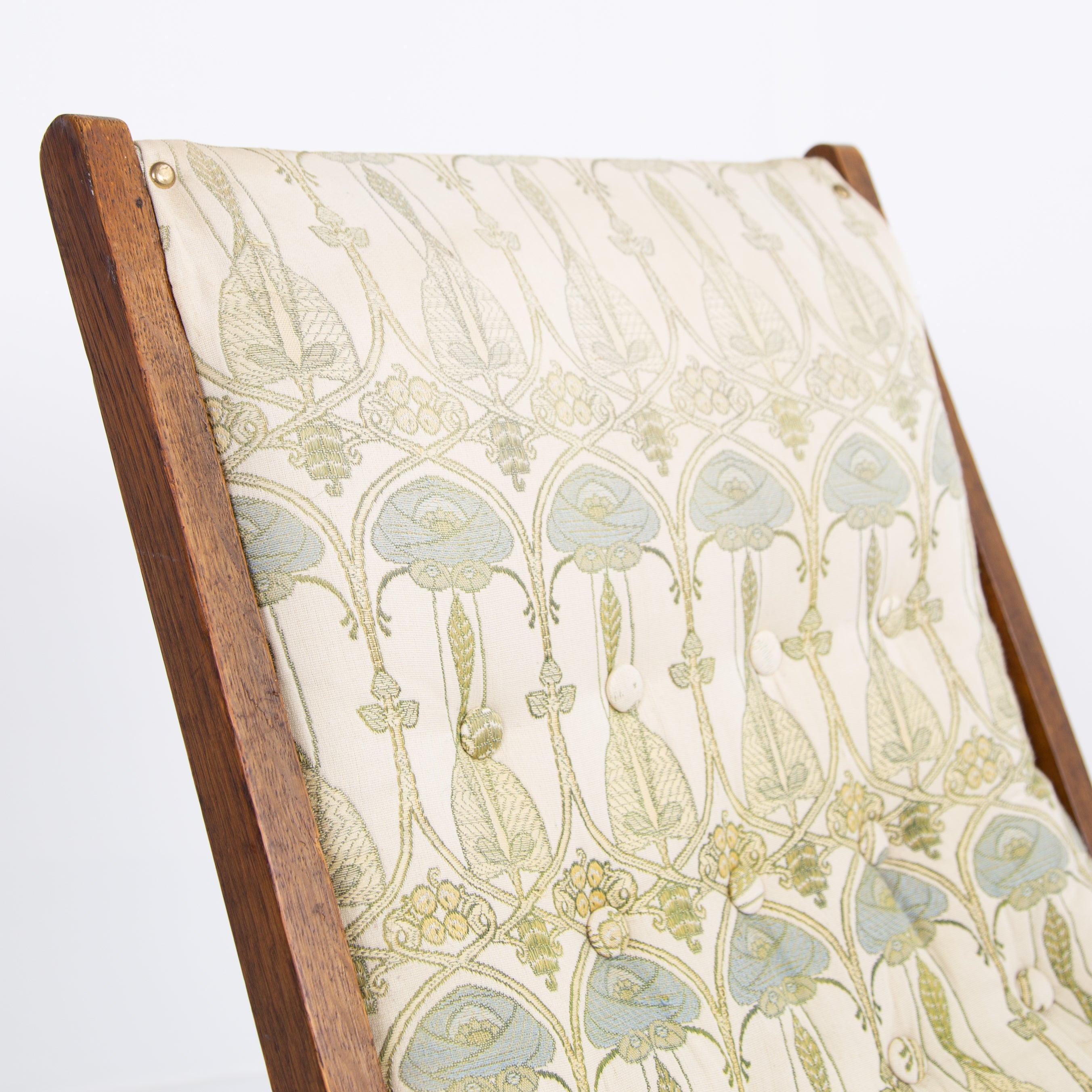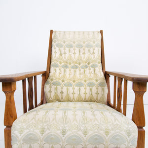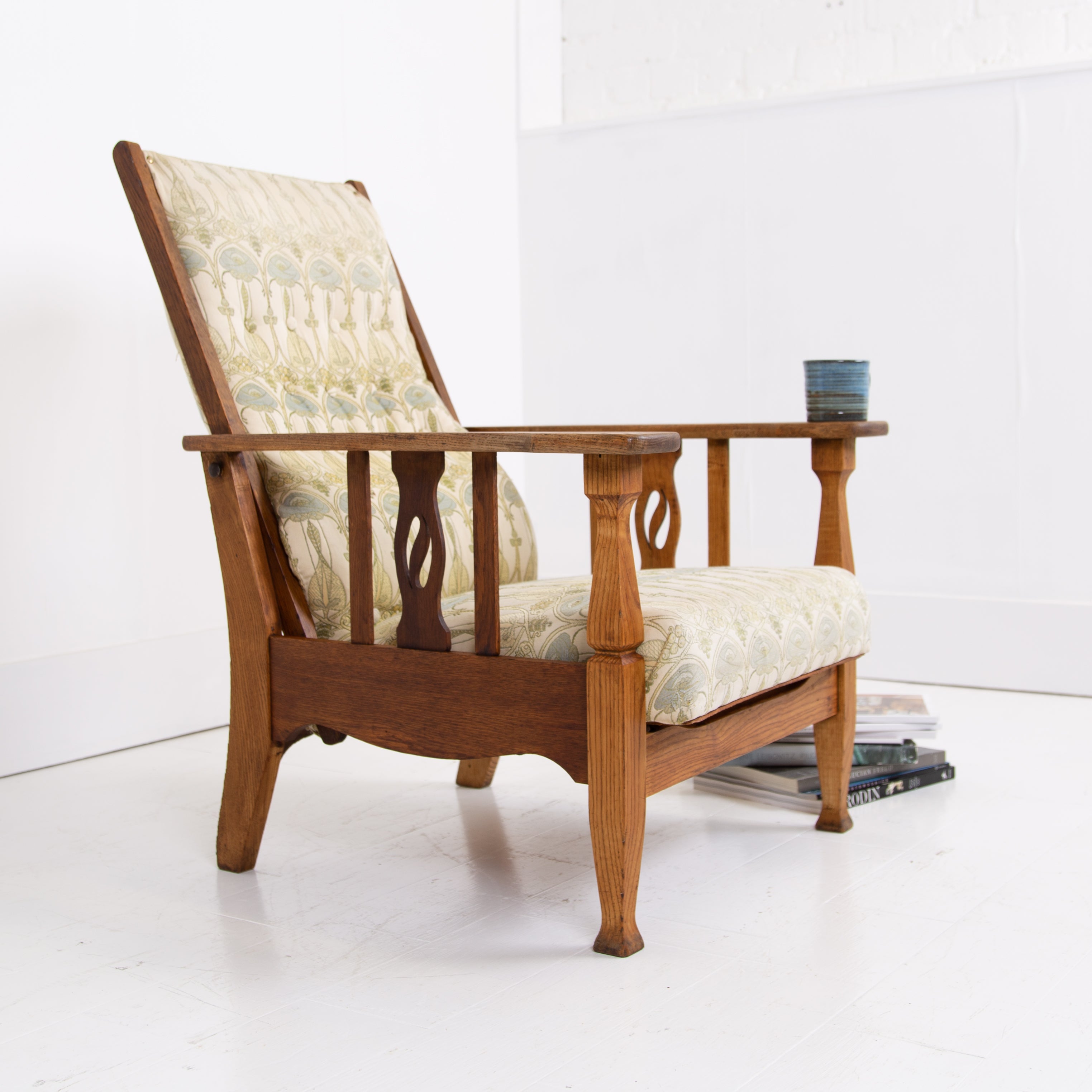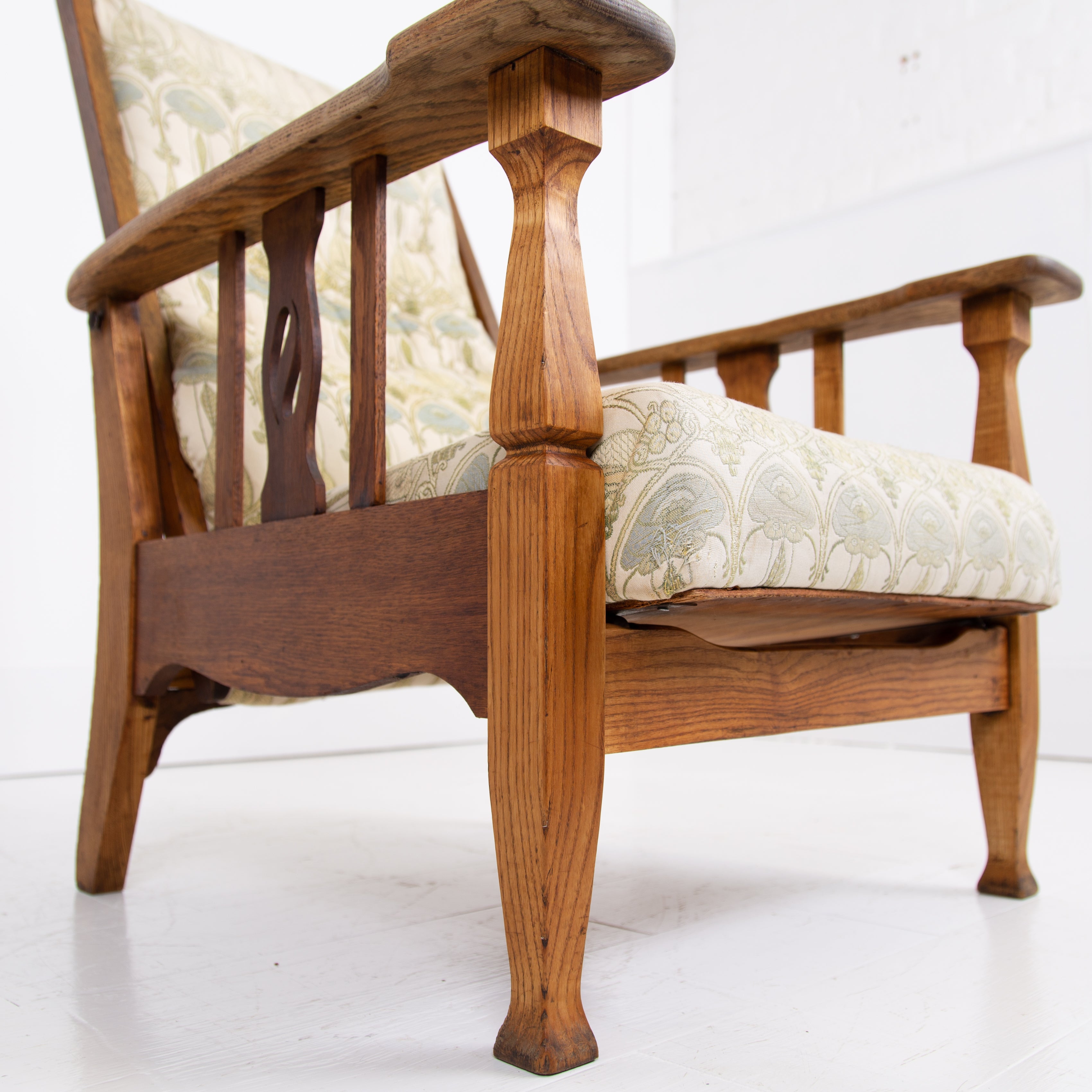 The chair currently sits in a worn and marked patterned Mackintosh woven jacquard fabric and our upholsterer Mark would be happy to fully reupholster at a cost of £380 plus VAT and you would require around 4 metres of fabric which we are happy to assist in sourcing etc. The lighter oak frame has historic aging and as mentioned offers a light reclining motion if you wish to chill.