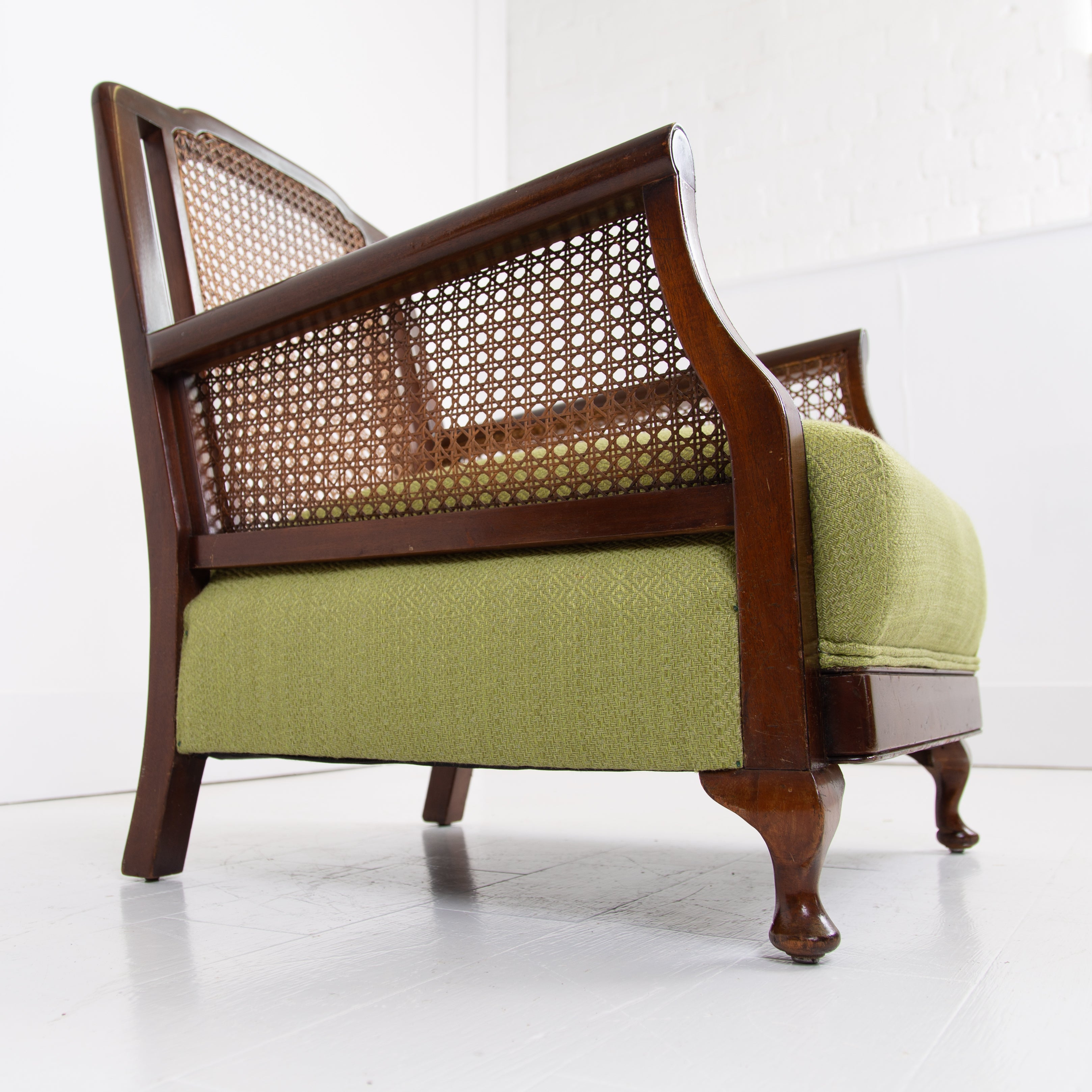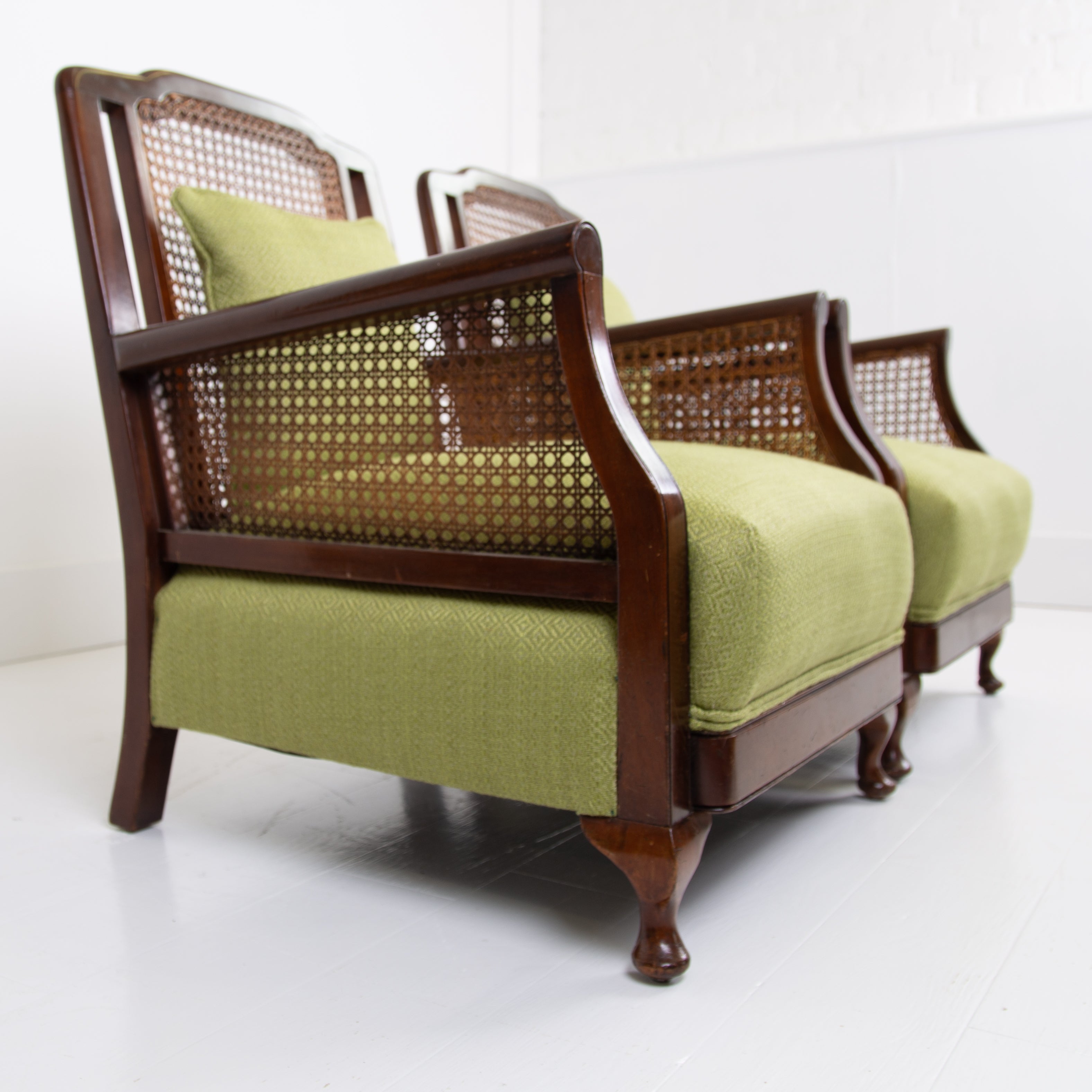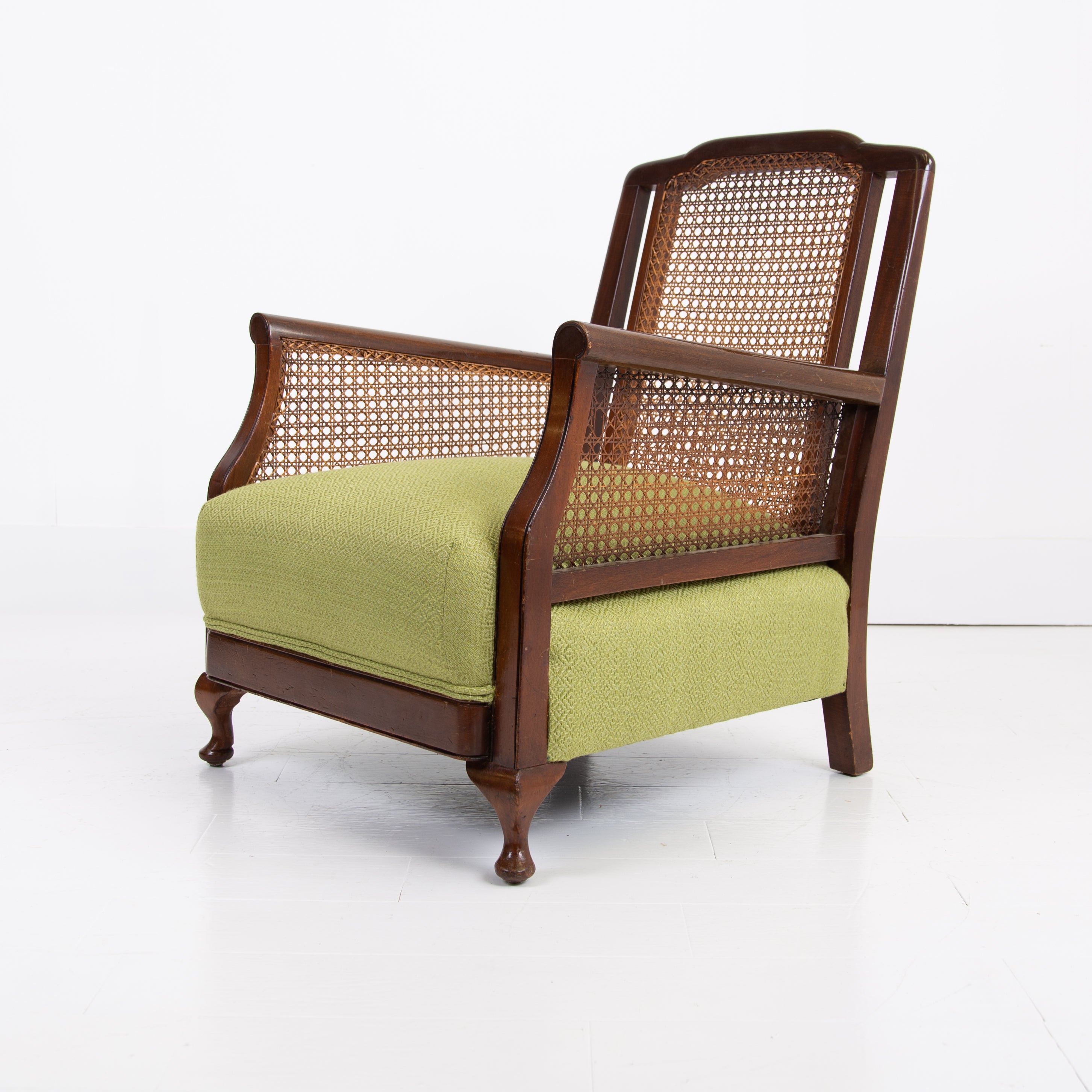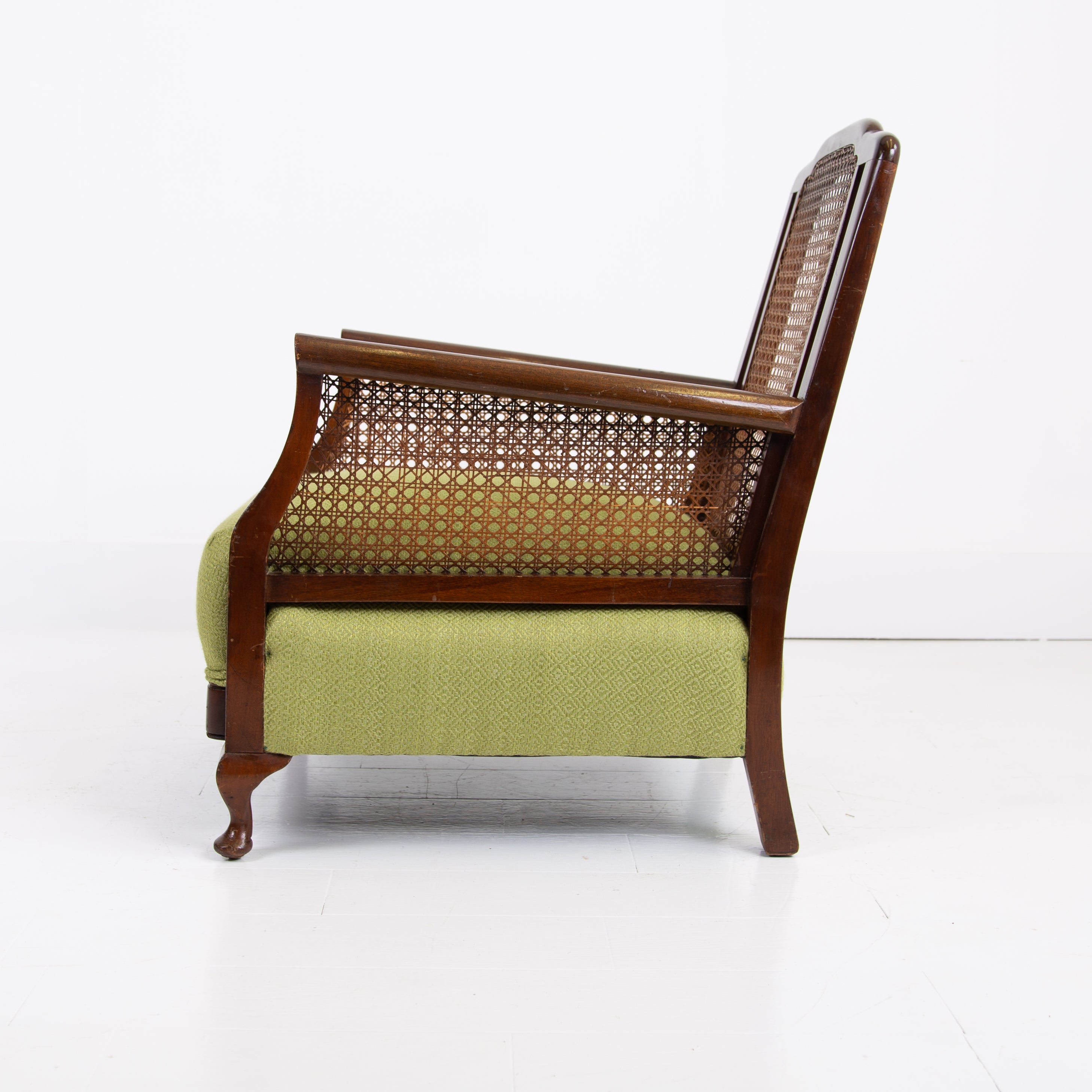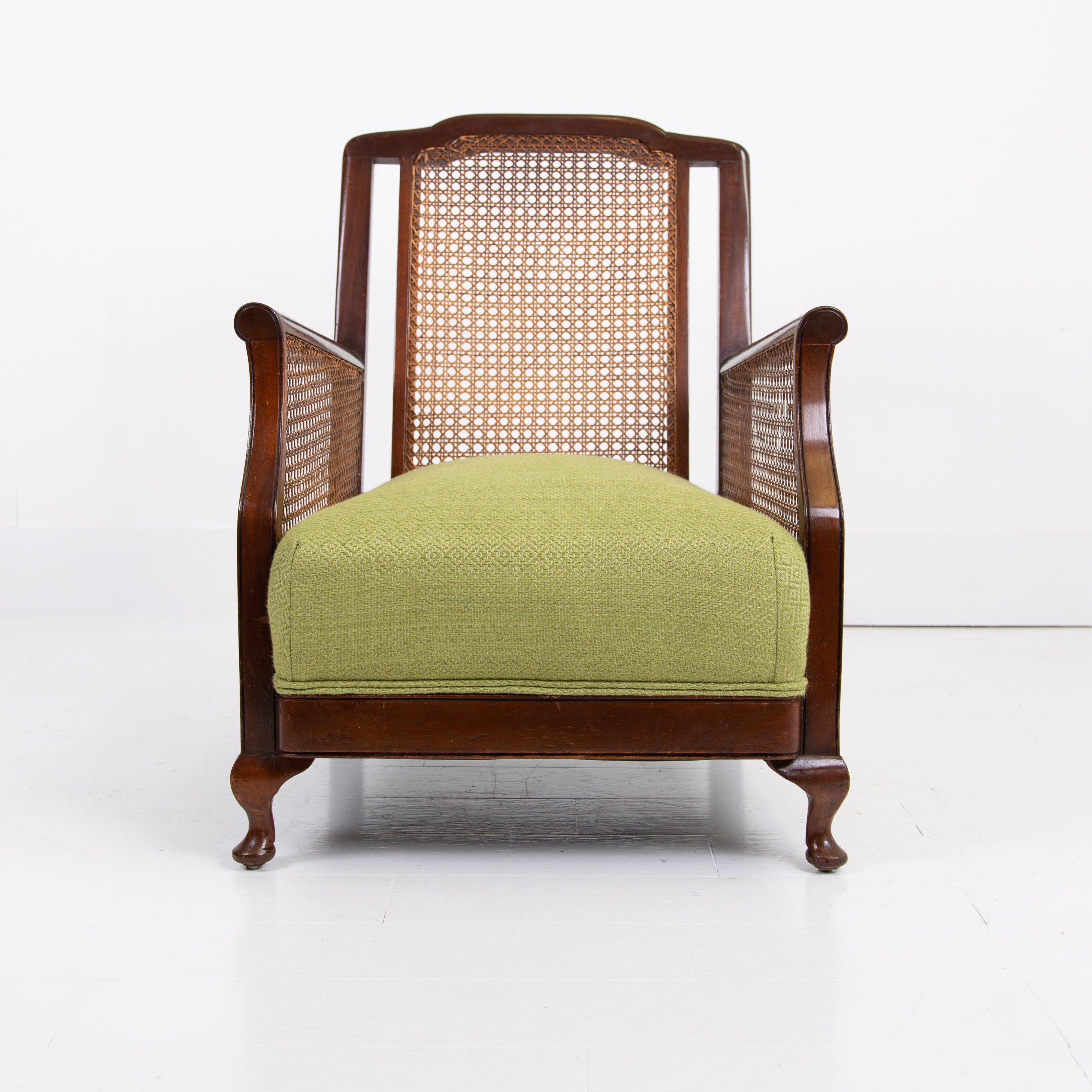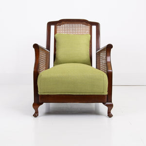 We have a matching pair if you desire two of these well shaped and comfortable Bergere armchairs which have enjoyed a trip to our upholsterer with new plump seats and a feathered filled cushion in a lovely leaf green coloured heavy weighted woven Duresta fabric. Both chairs are in similar condition with aging and wear in the right places, scuffs, rubbing marks etc but sitting firm with no wobbles, repairs or movement in the arms and only a few nicks to the caning.