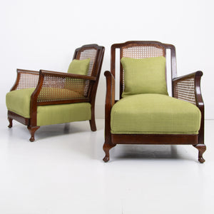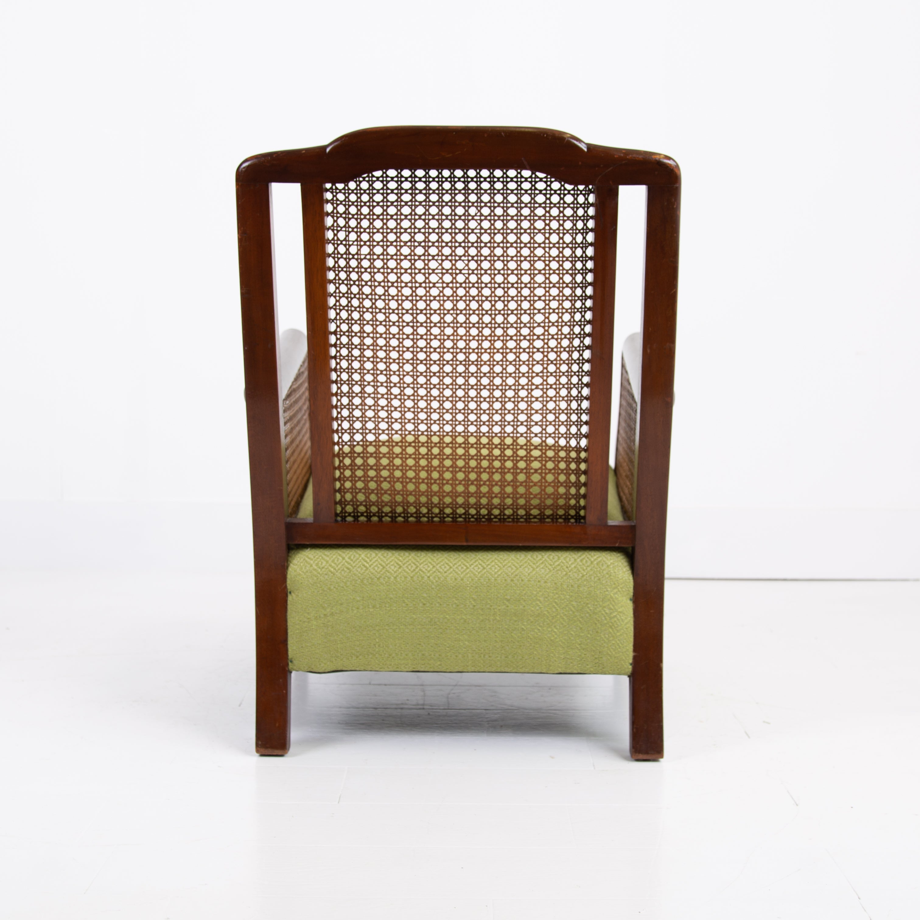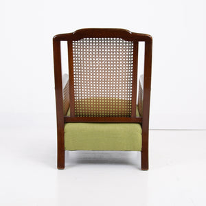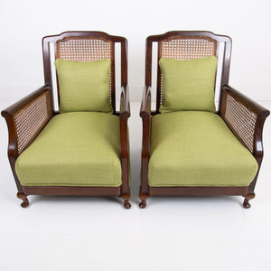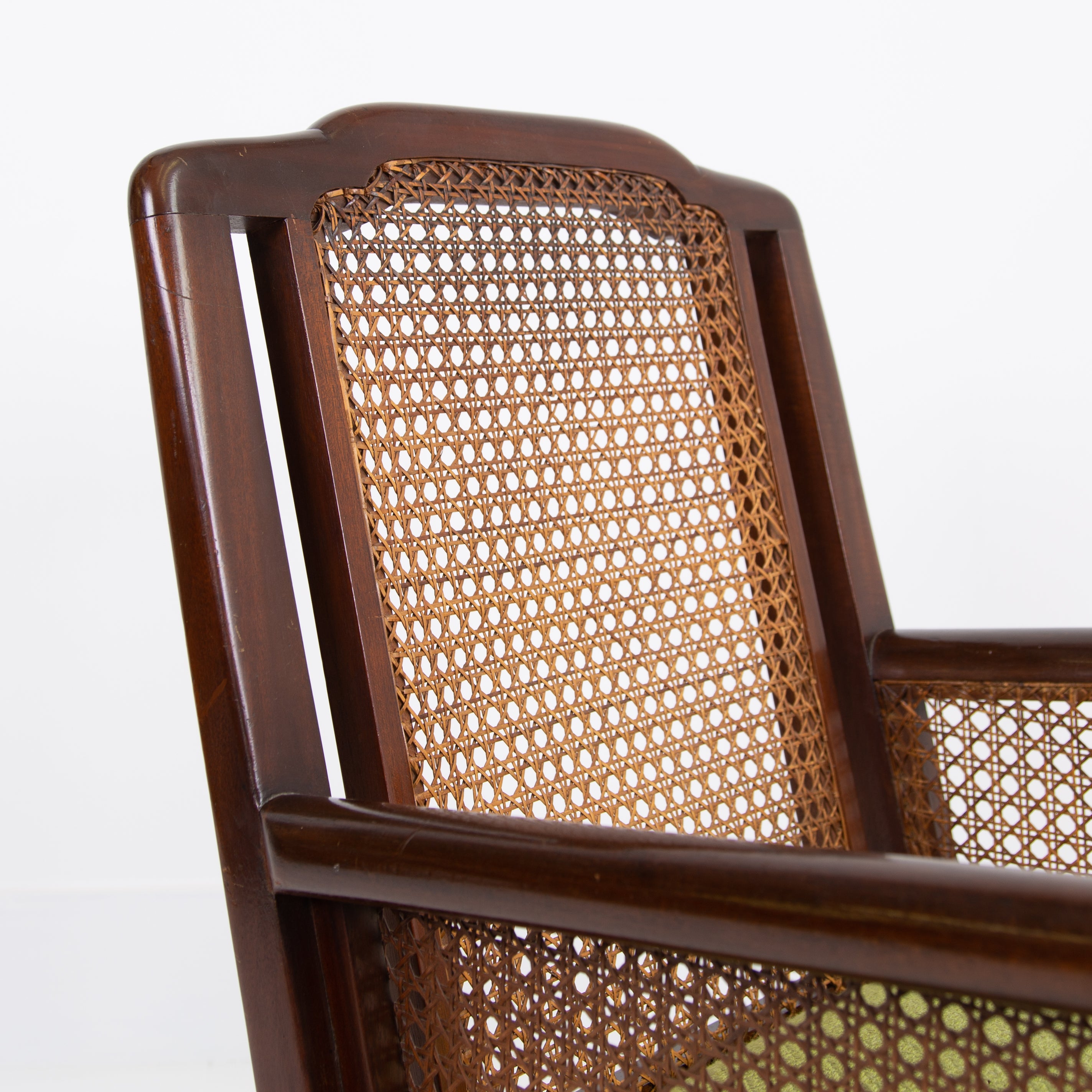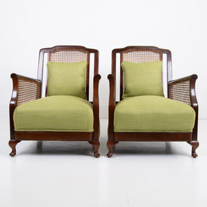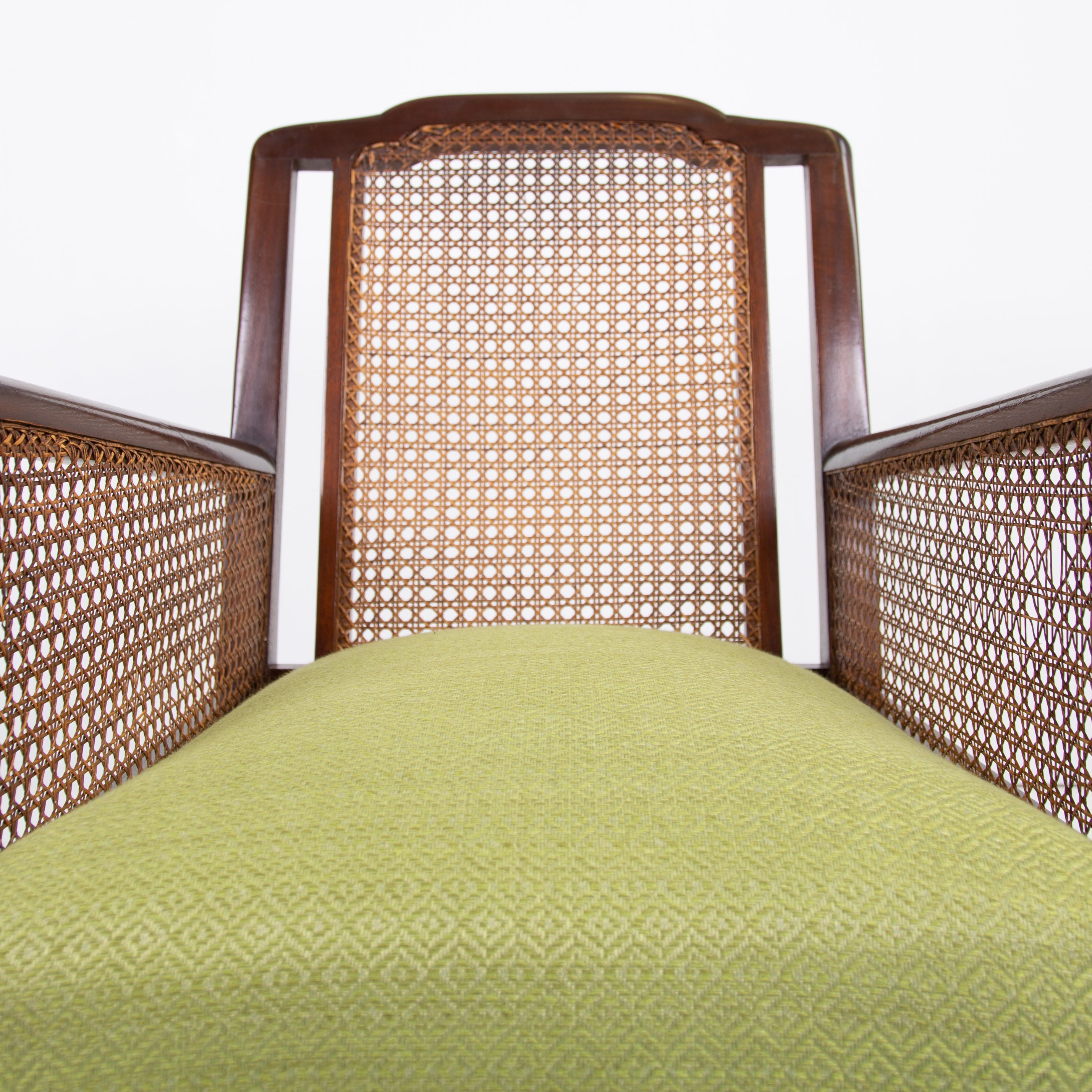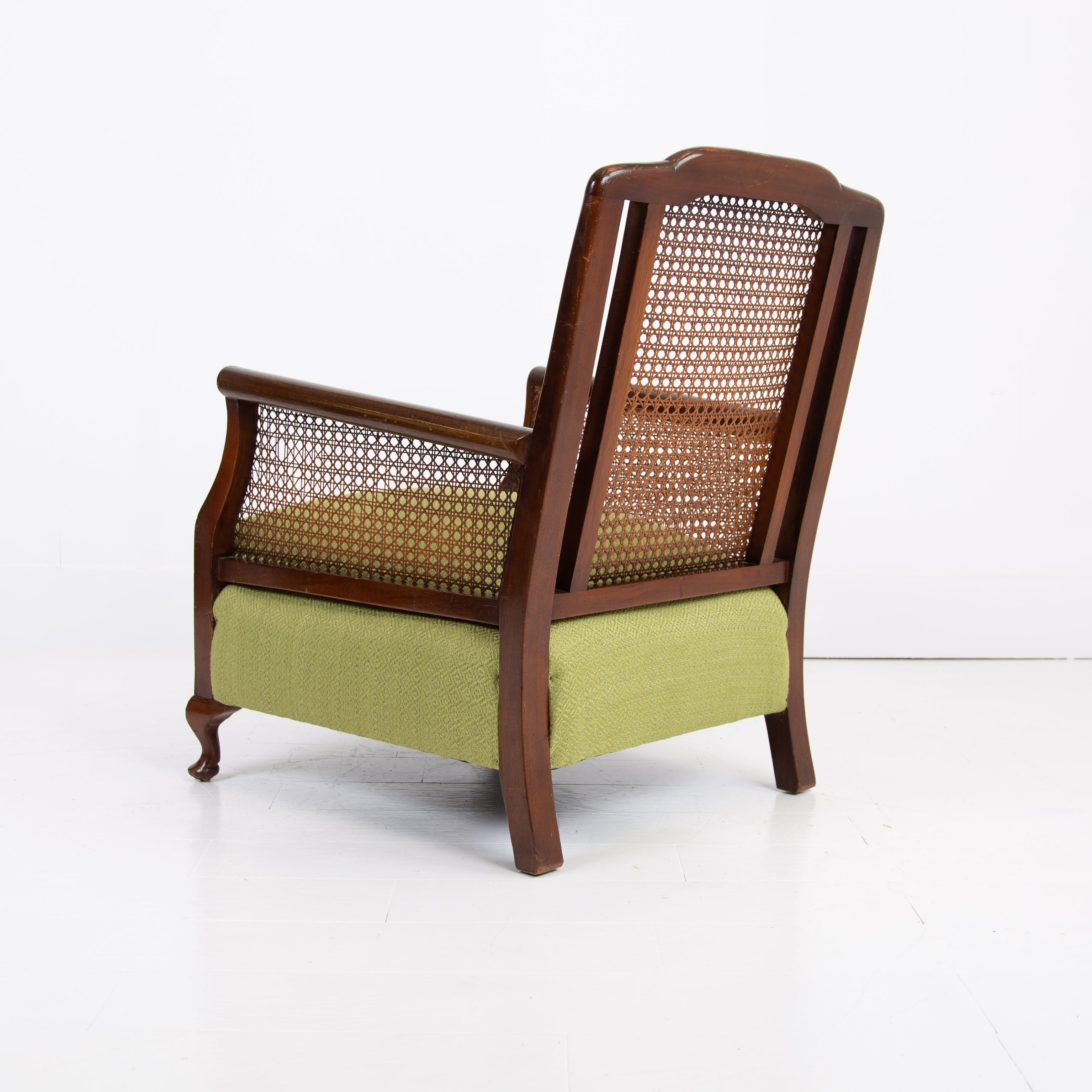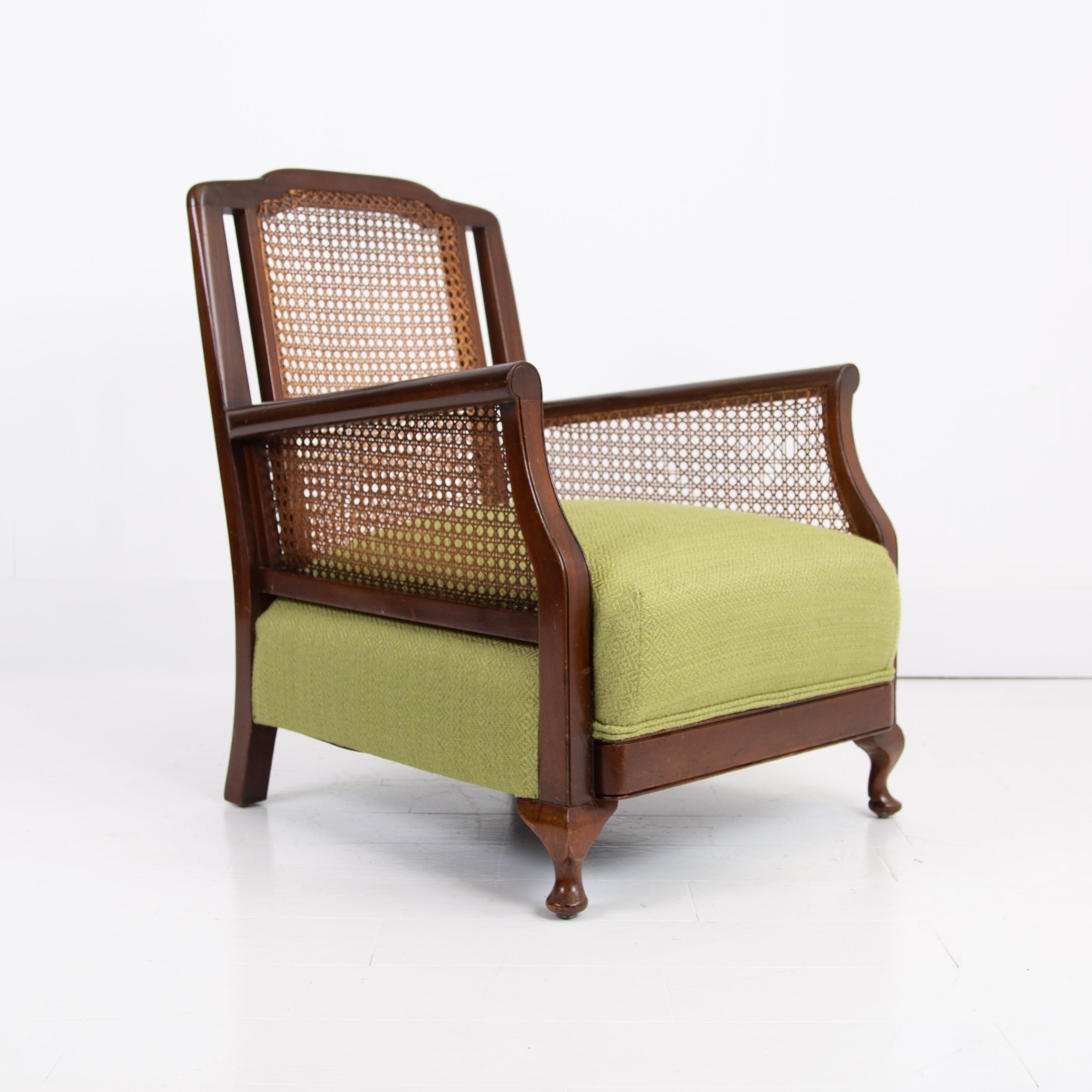 We have a matching pair if you desire two of these well shaped and comfortable Bergere armchairs which have enjoyed a trip to our upholsterer with new plump seats and a feathered filled cushion in a lovely leaf green coloured heavy weighted woven Duresta fabric. Both chairs are in similar condition with aging and wear in the right places, scuffs, rubbing marks etc but sitting firm with no wobbles, repairs or movement in the arms and only a few nicks to the caning.