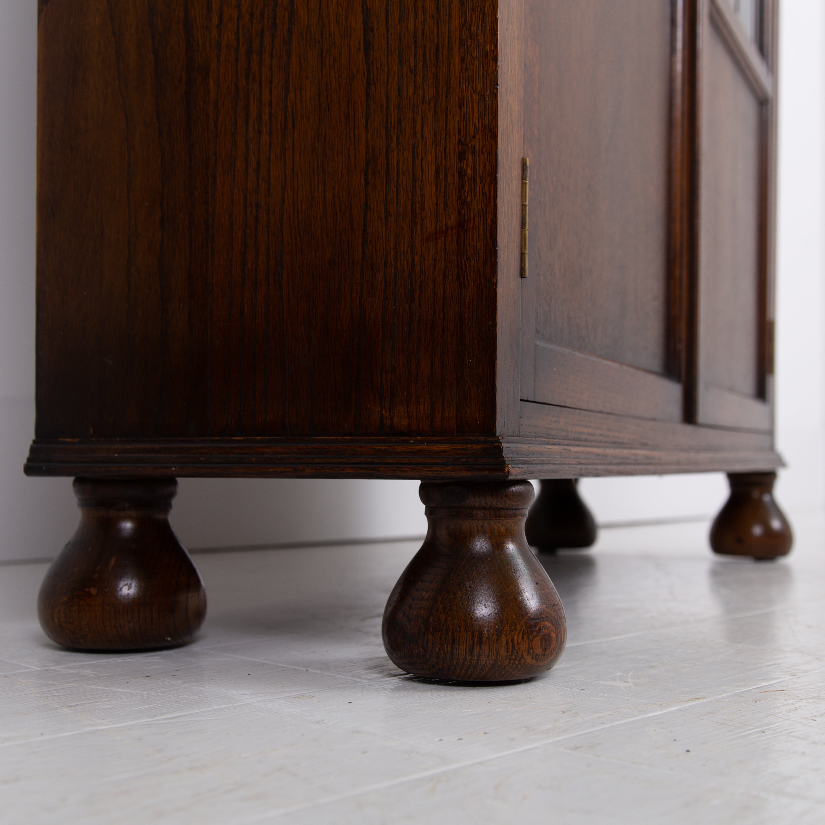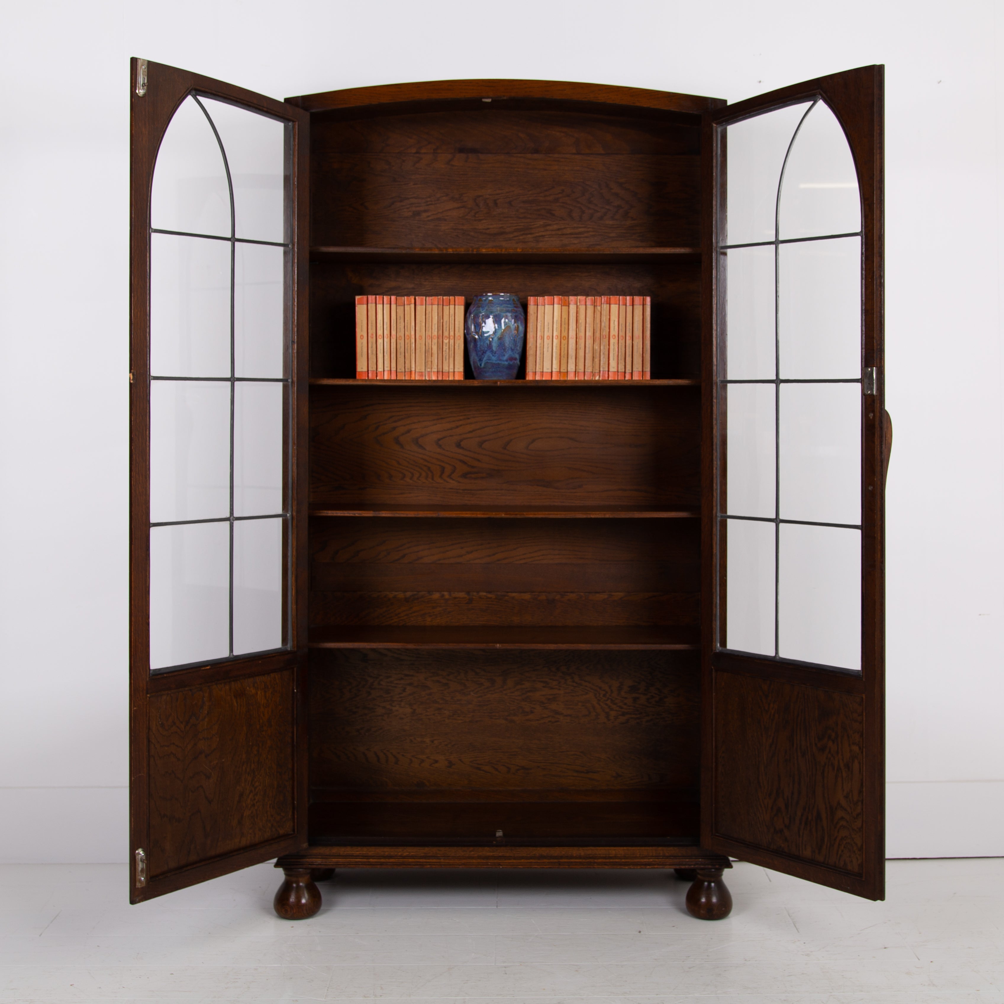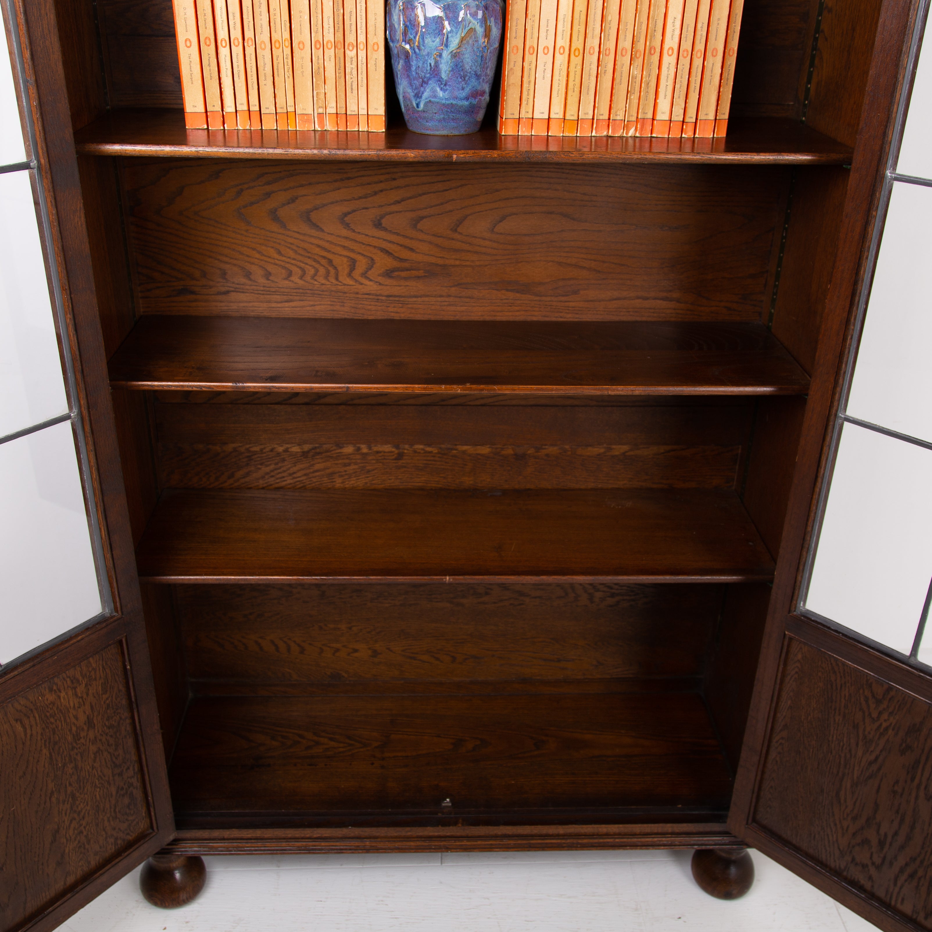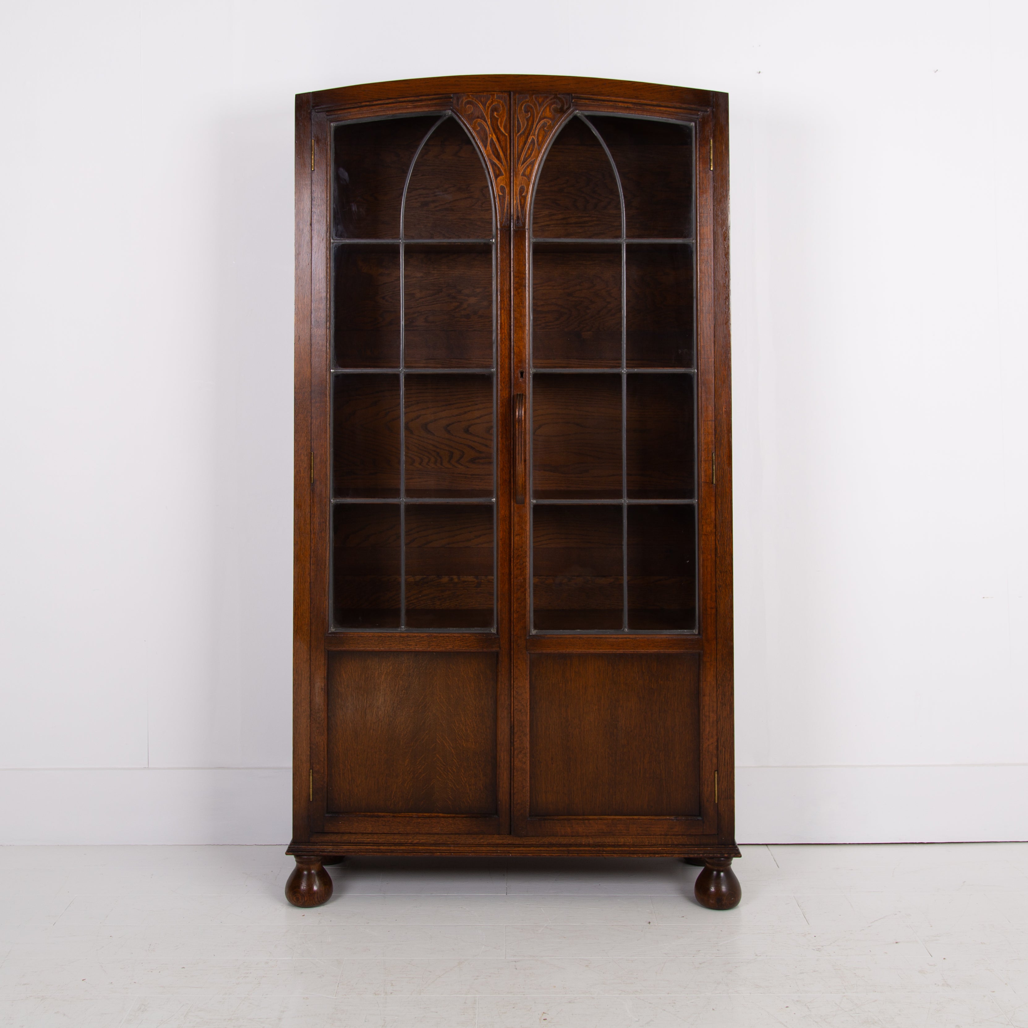 Highly attractive solid English oak 2 door bookcase cabinet early 1930s in lovely condition. We have a good looking piece with its domed top, large solid oak turned feet, original glazed and leaded oak framed doors and attractive shaped oak handle. This one is of a sensible scale compared to some of its era.