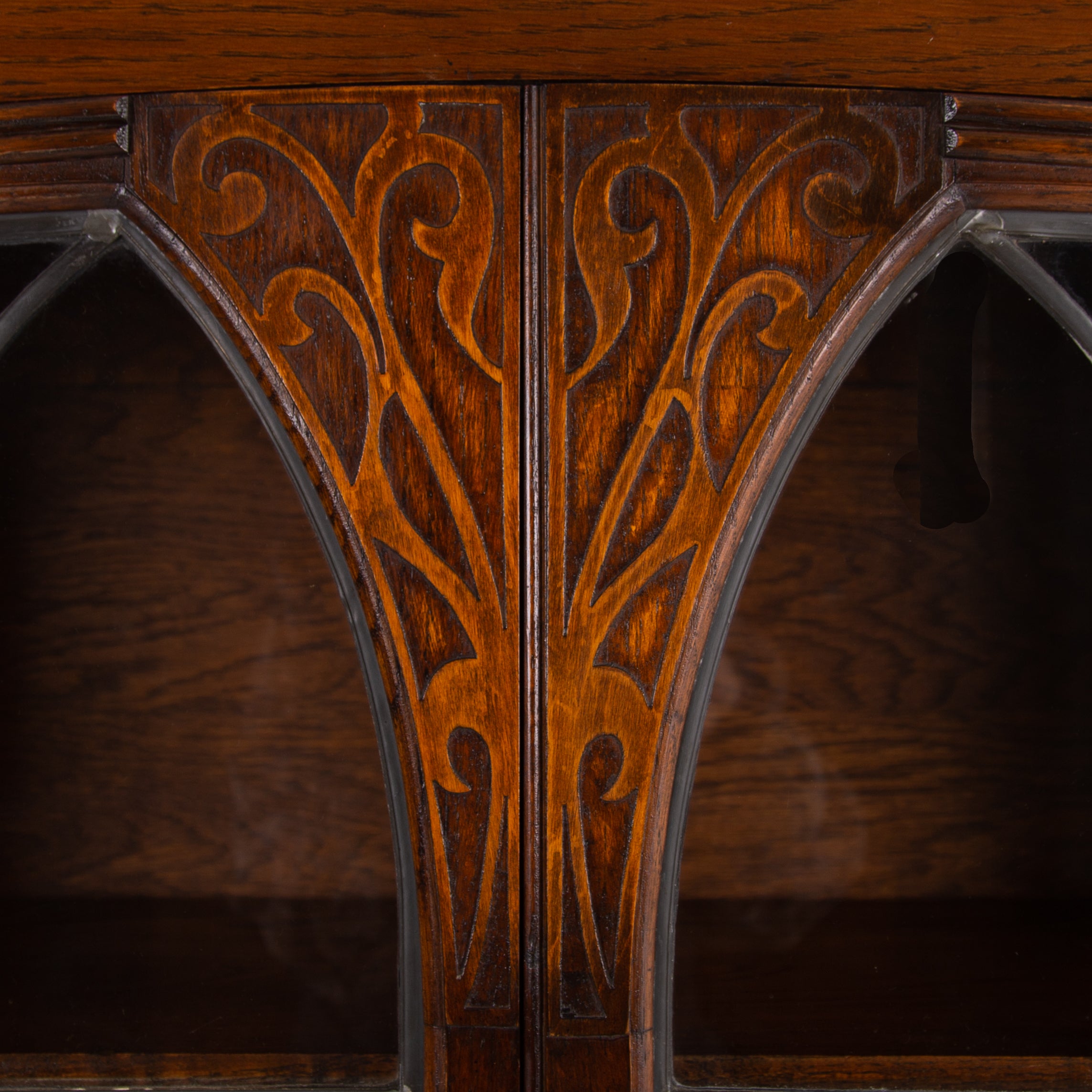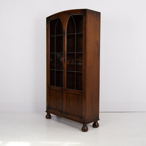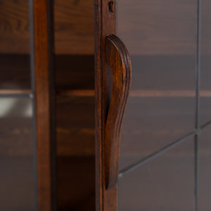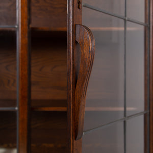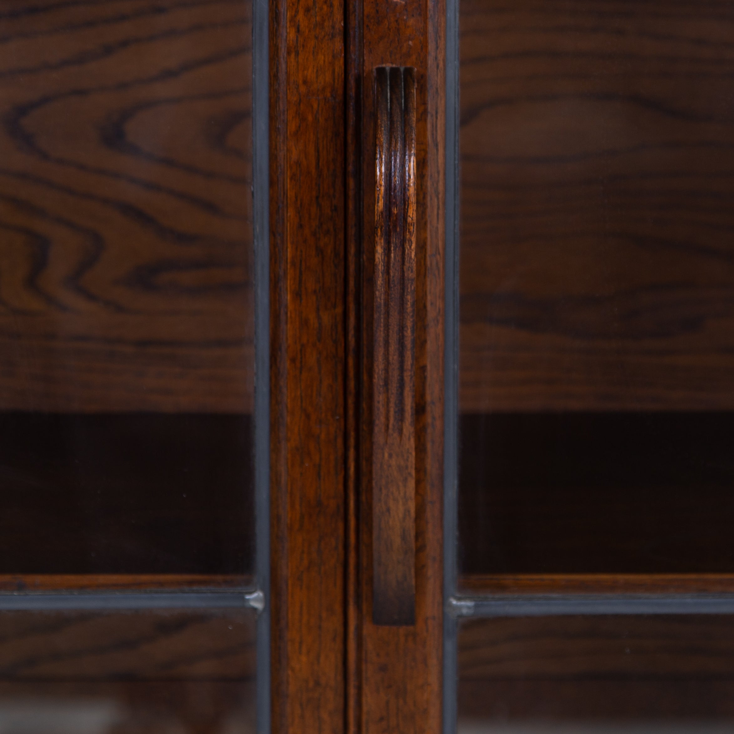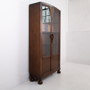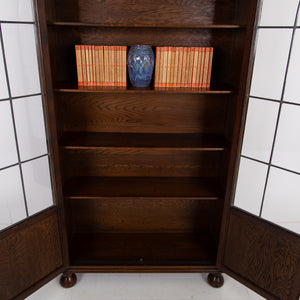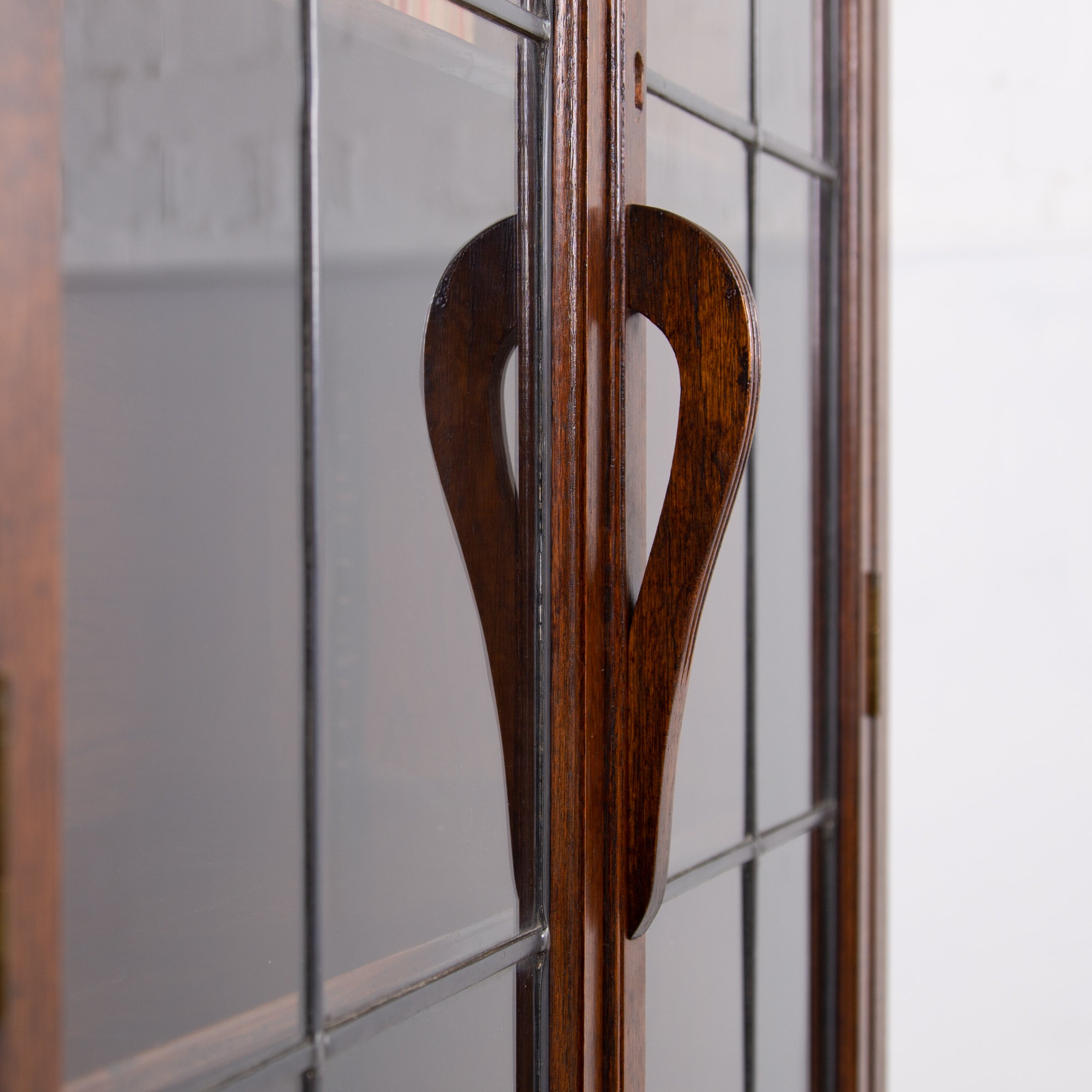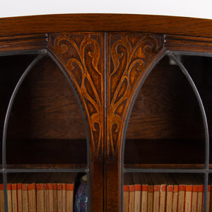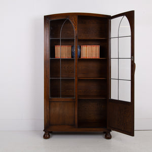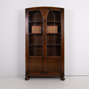 Highly attractive solid English oak 2 door bookcase cabinet early 1930s in lovely condition. We have a good looking piece with its domed top, large solid oak turned feet, original glazed and leaded oak framed doors and attractive shaped oak handle. This one is of a sensible scale compared to some of its era.