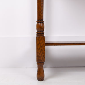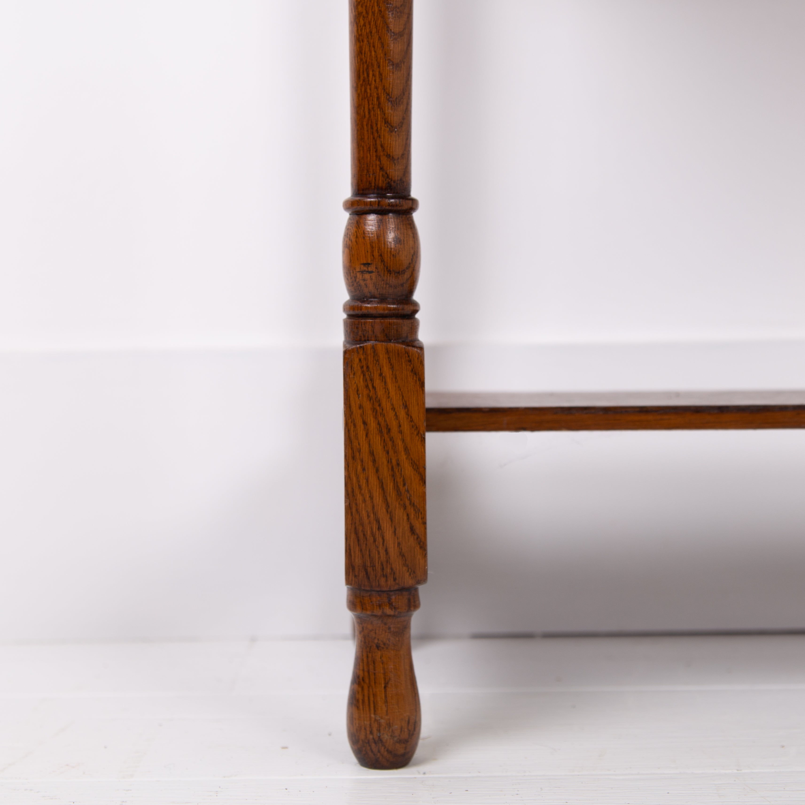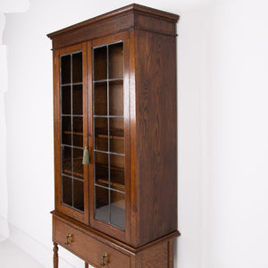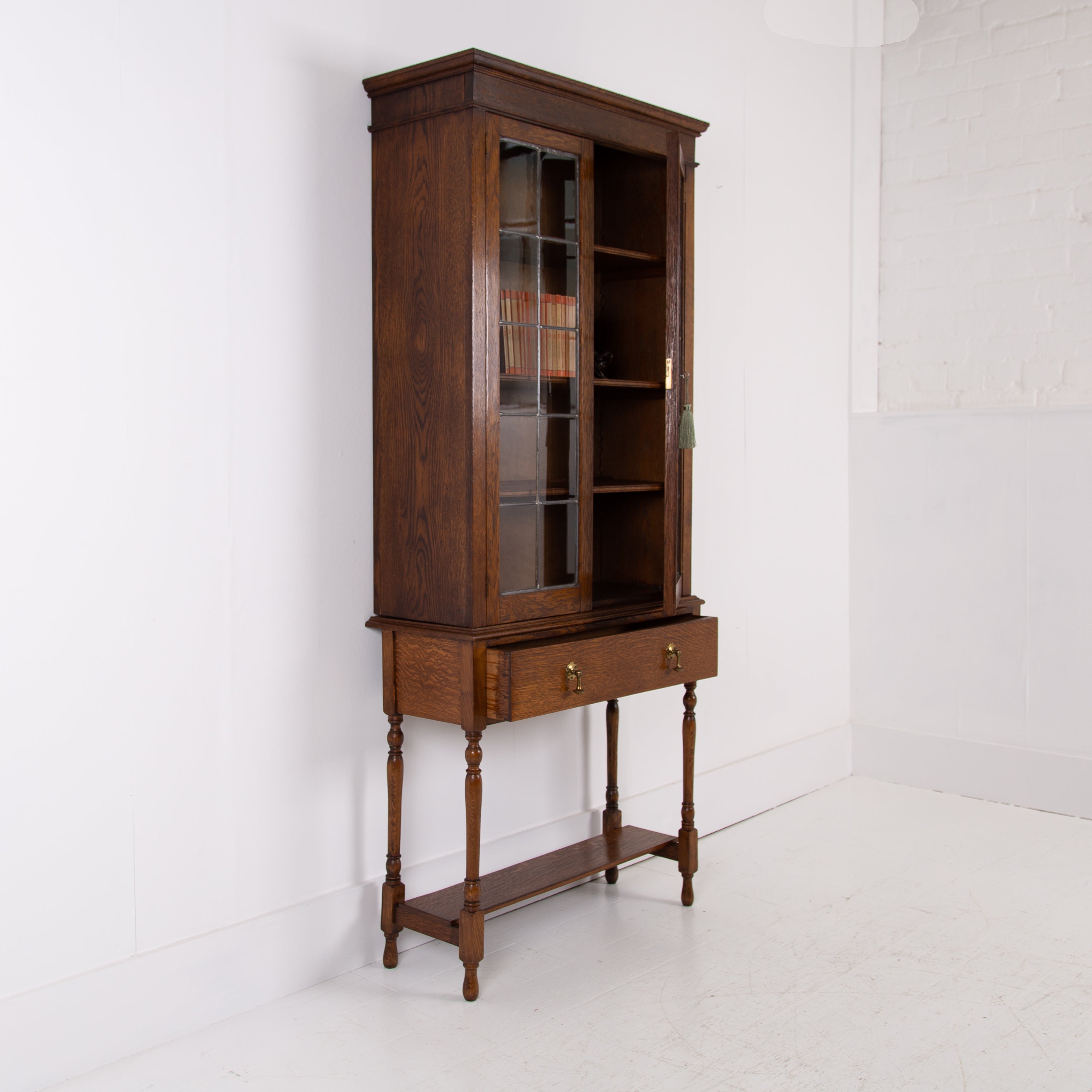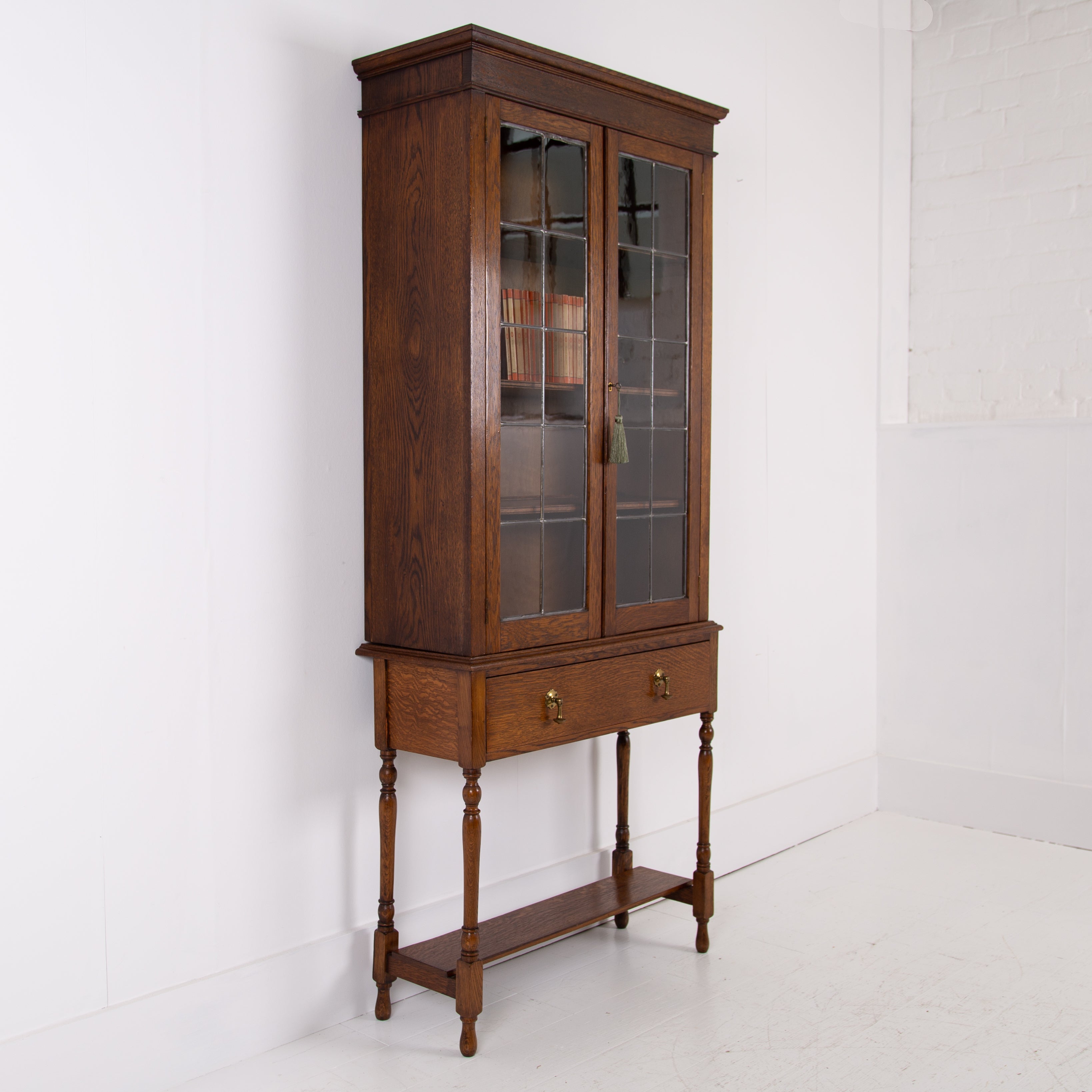 A highly attractive 1920s English oak glazed bookcase with a single drawer and on a stand in lovely condition. Something a little different with its two door leaded glass cabinet with long drawer underneath which in turn sits on a turned legged stand with a lower shelf. All nicely proportioned and well crafted.