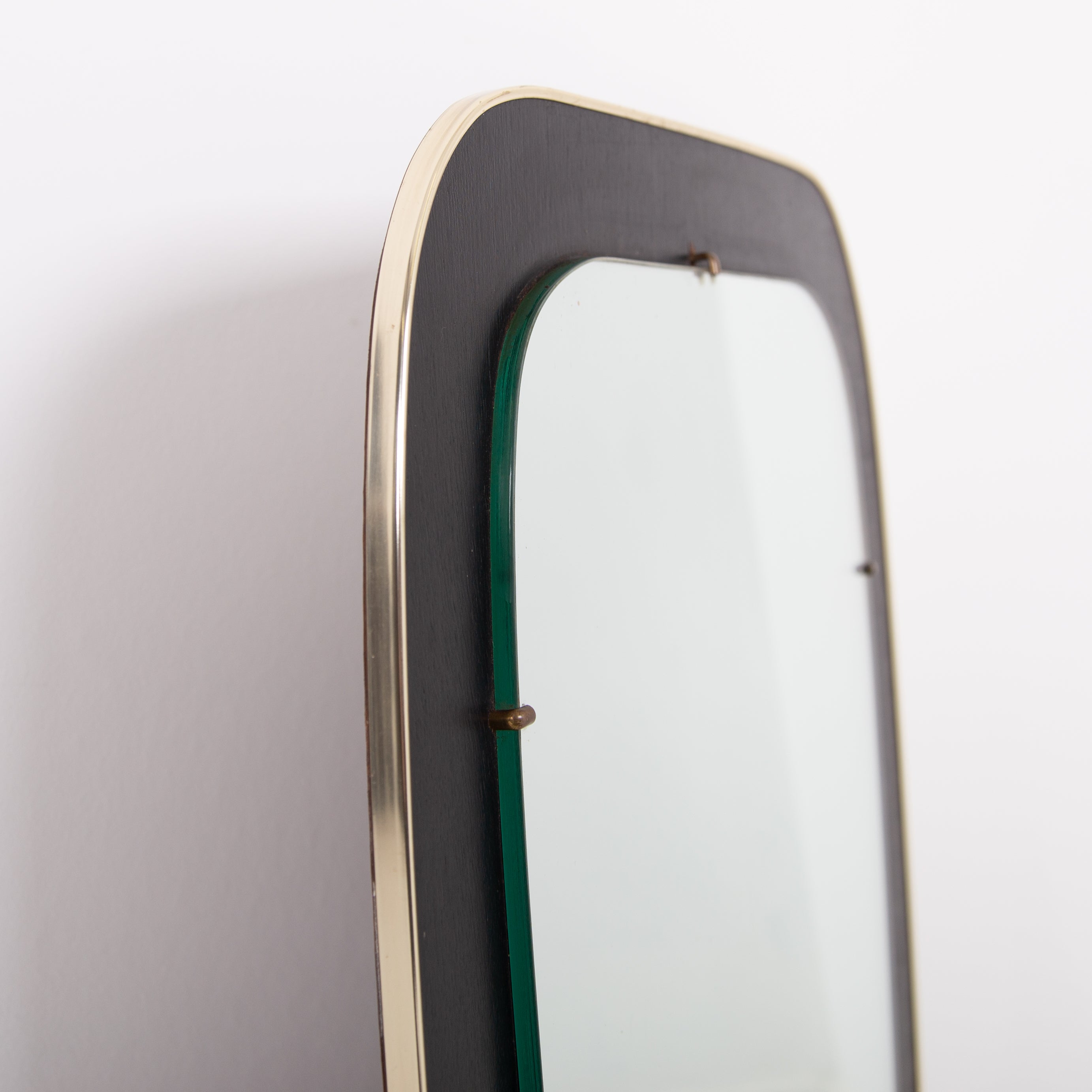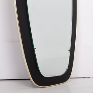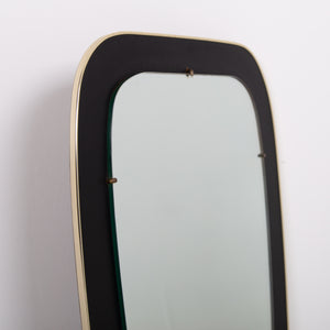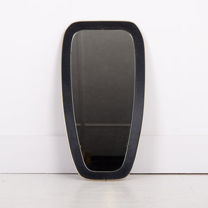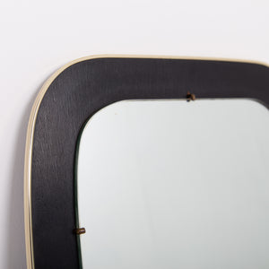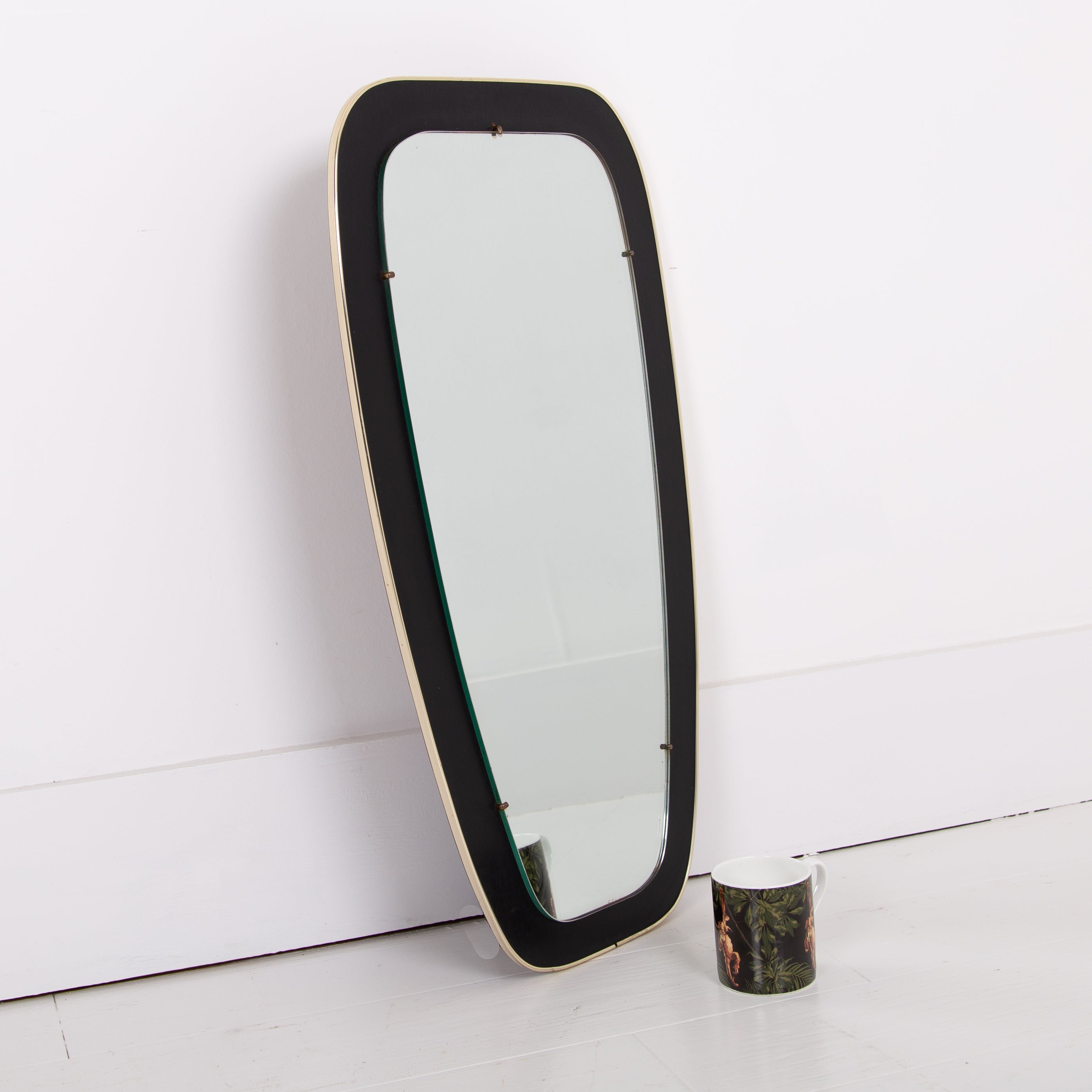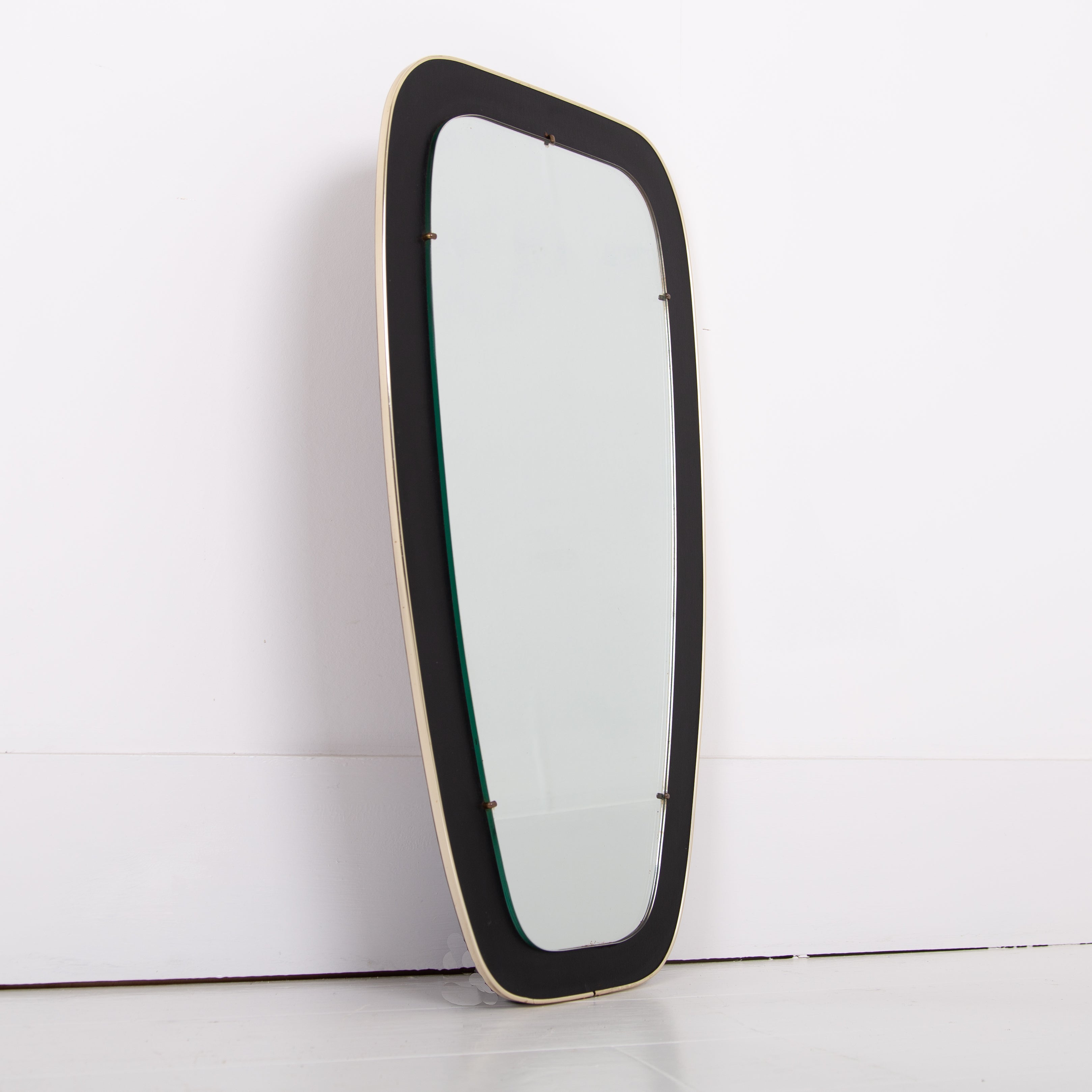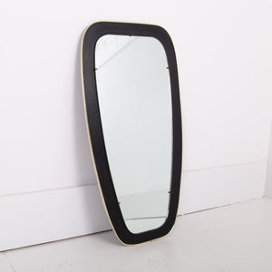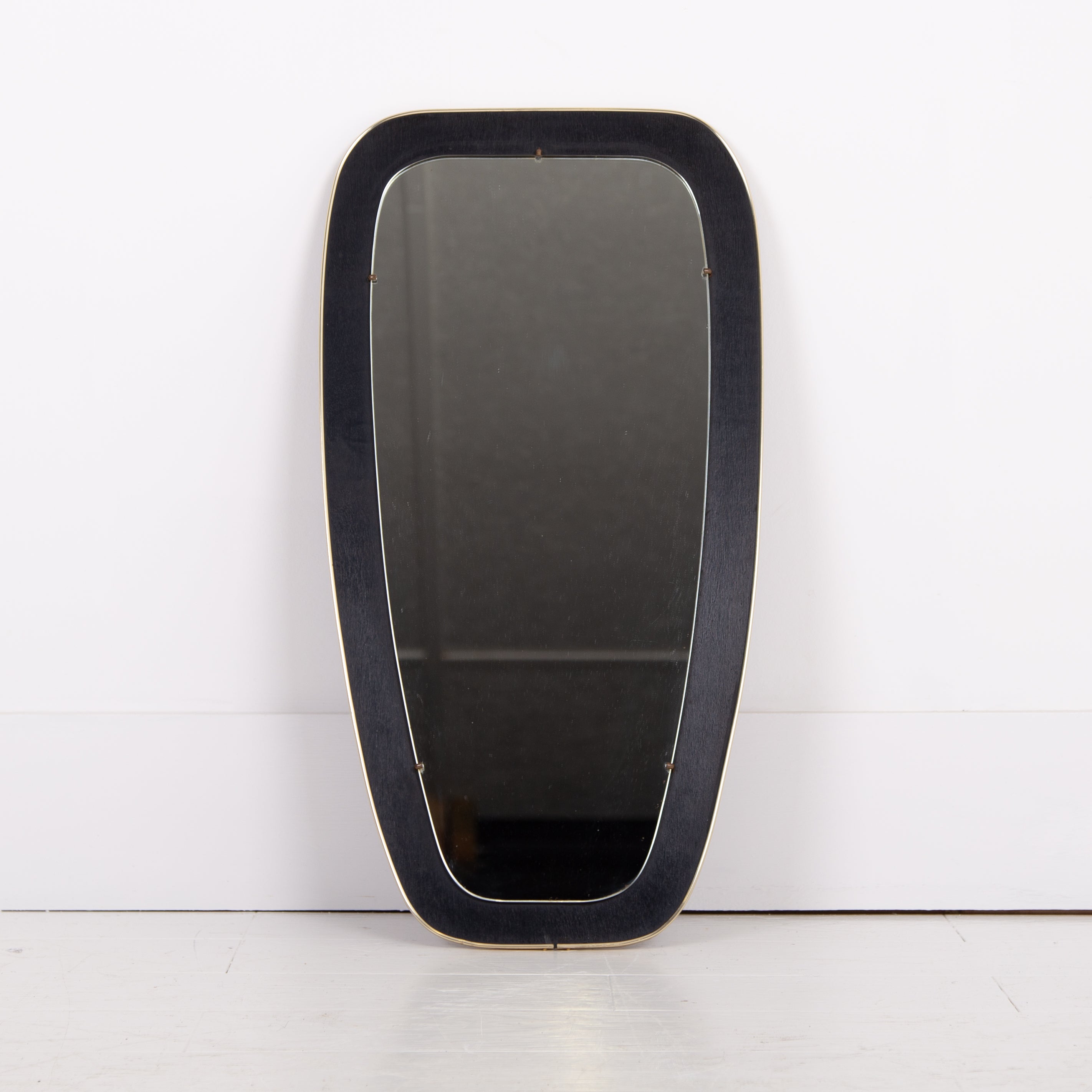 An attractive and well shaped Mid Century mirror, often referred to as kidney shaped, with a deep black border which frames the mirror and is finished with a fine brass edging - in fine order and ready for placing - original fixing to the rear.
