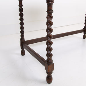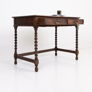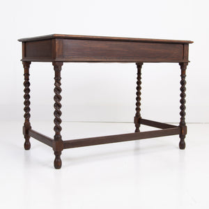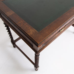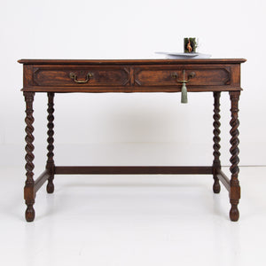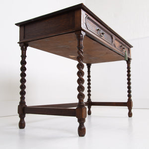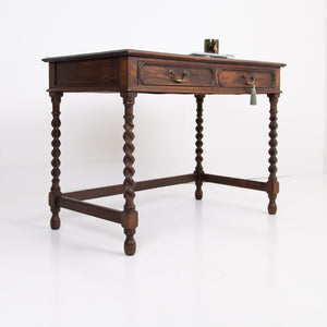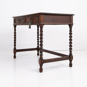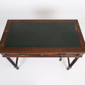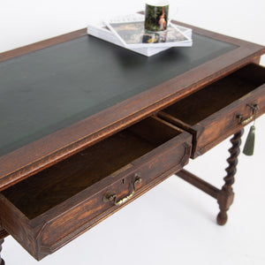 A rather good looking and wonderfully aged late 19th Century English oak desk with attractive barley twist legs and decorative embellishments to the drawers. It possesses a pleasing tone and with just the right amount of age wear to the oak and deep green inset to the top. The drawers are running well with the original swan neck handles in situ, fortunately sitting in lovely historic aged order. We have a working lock and key.