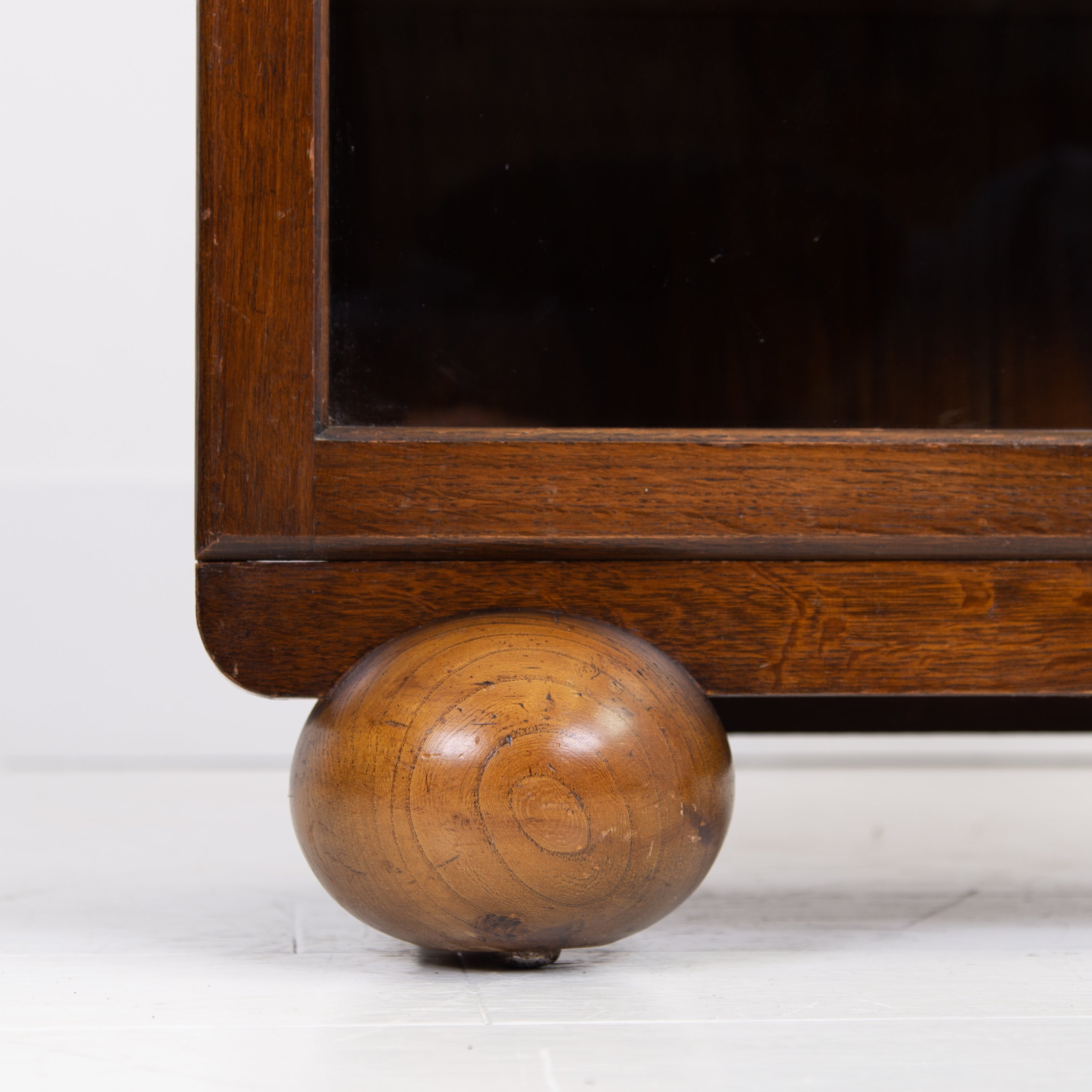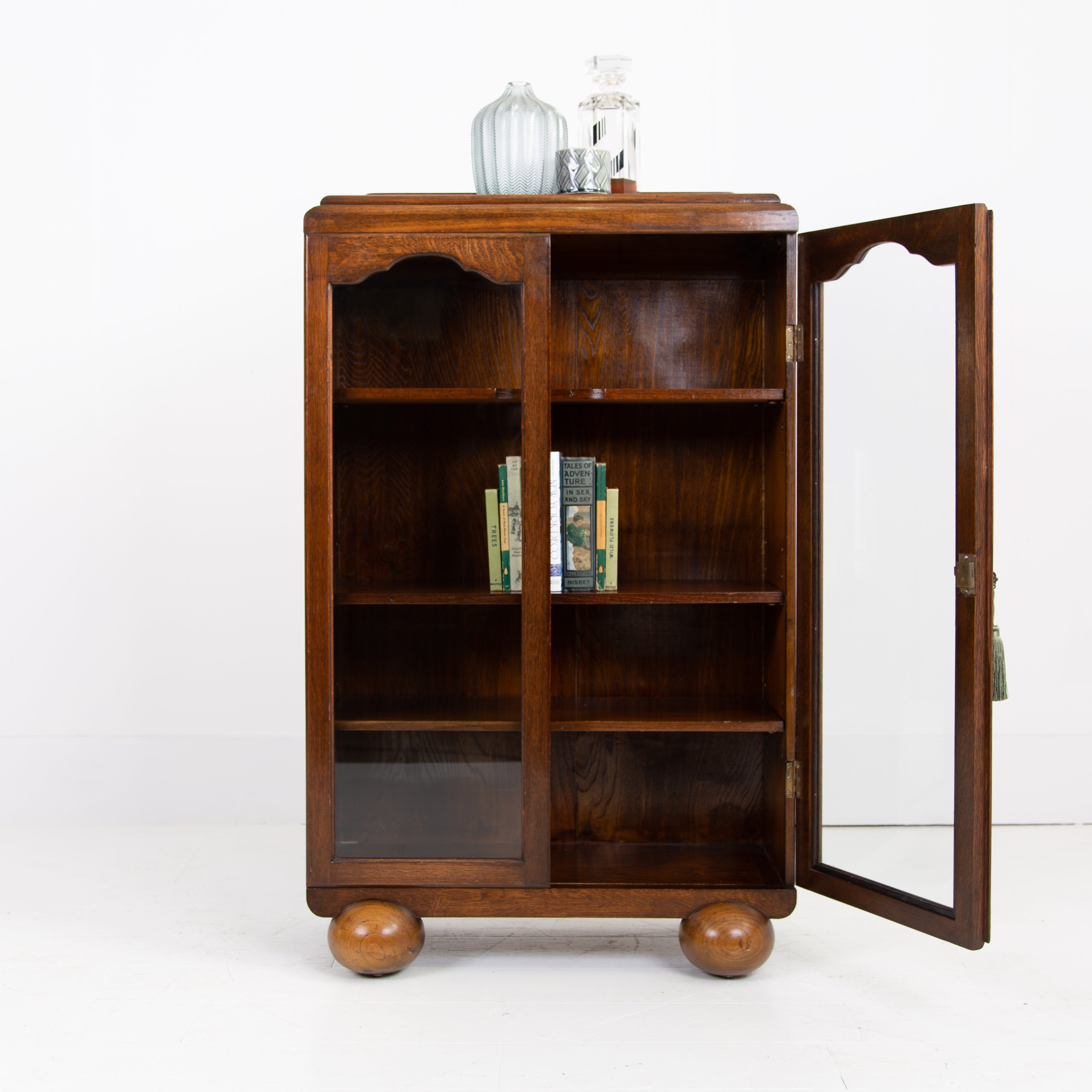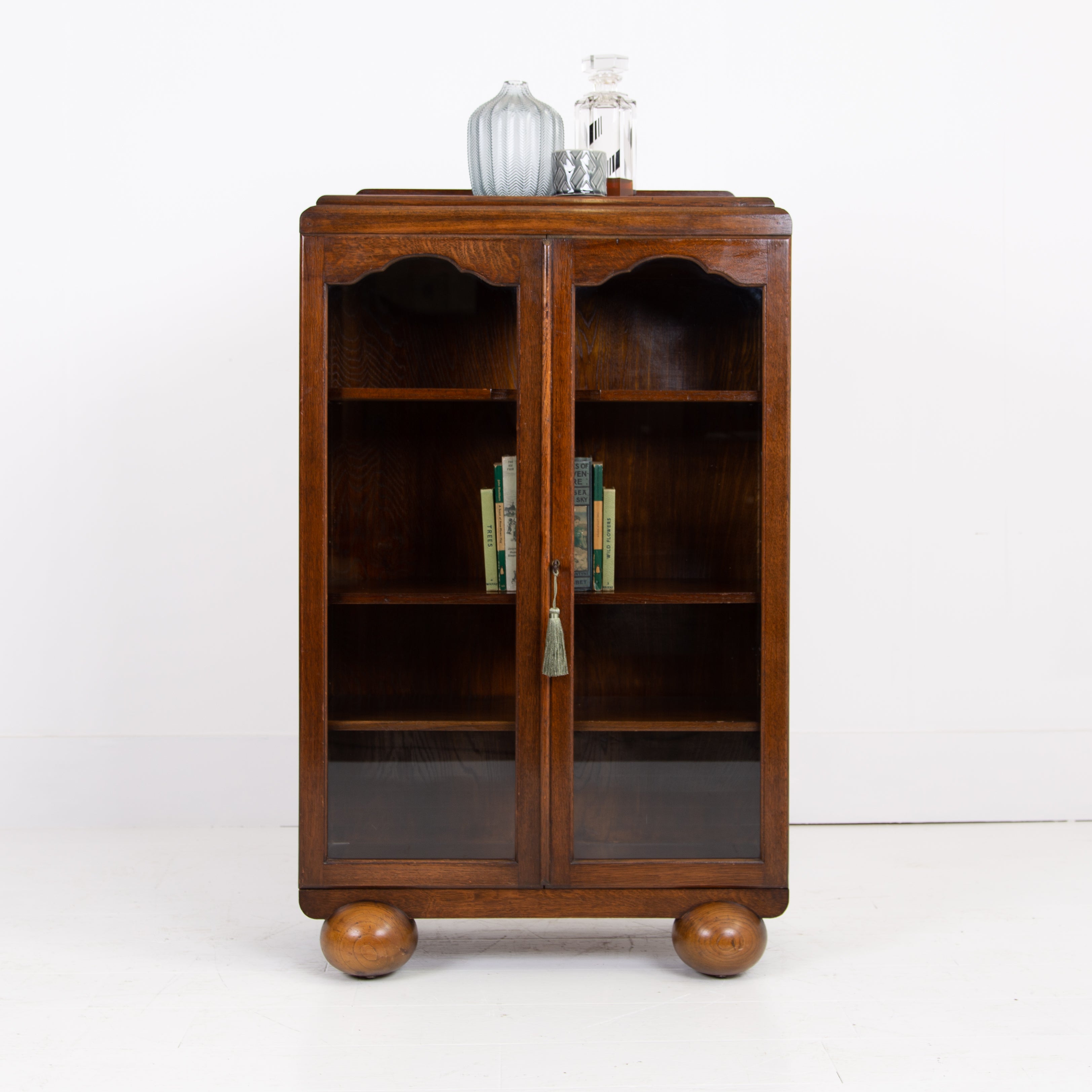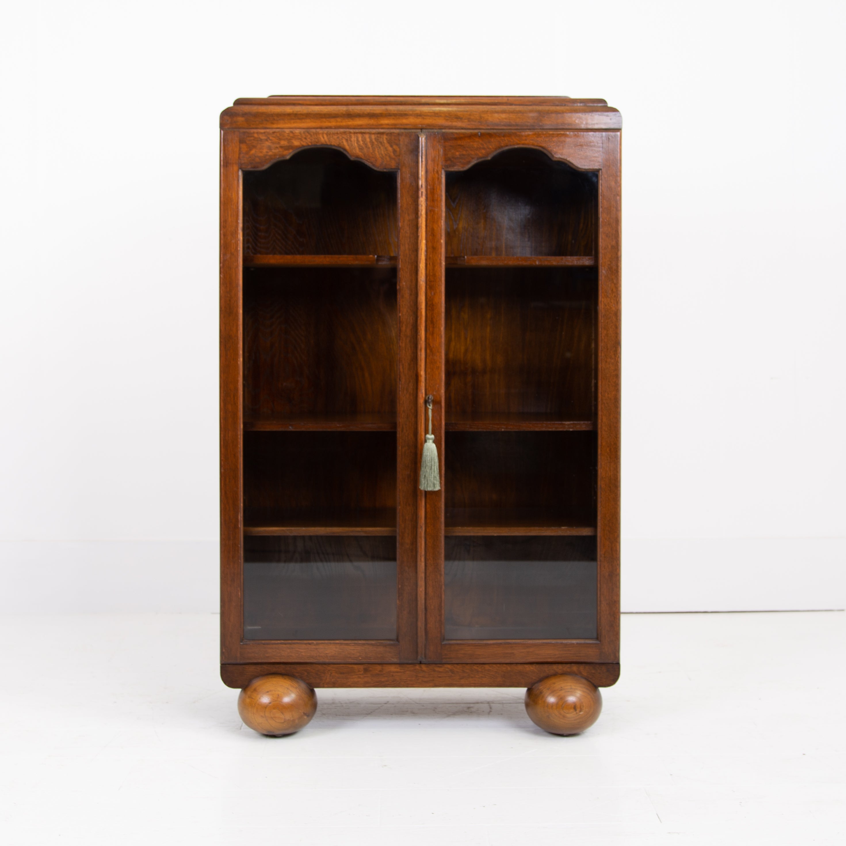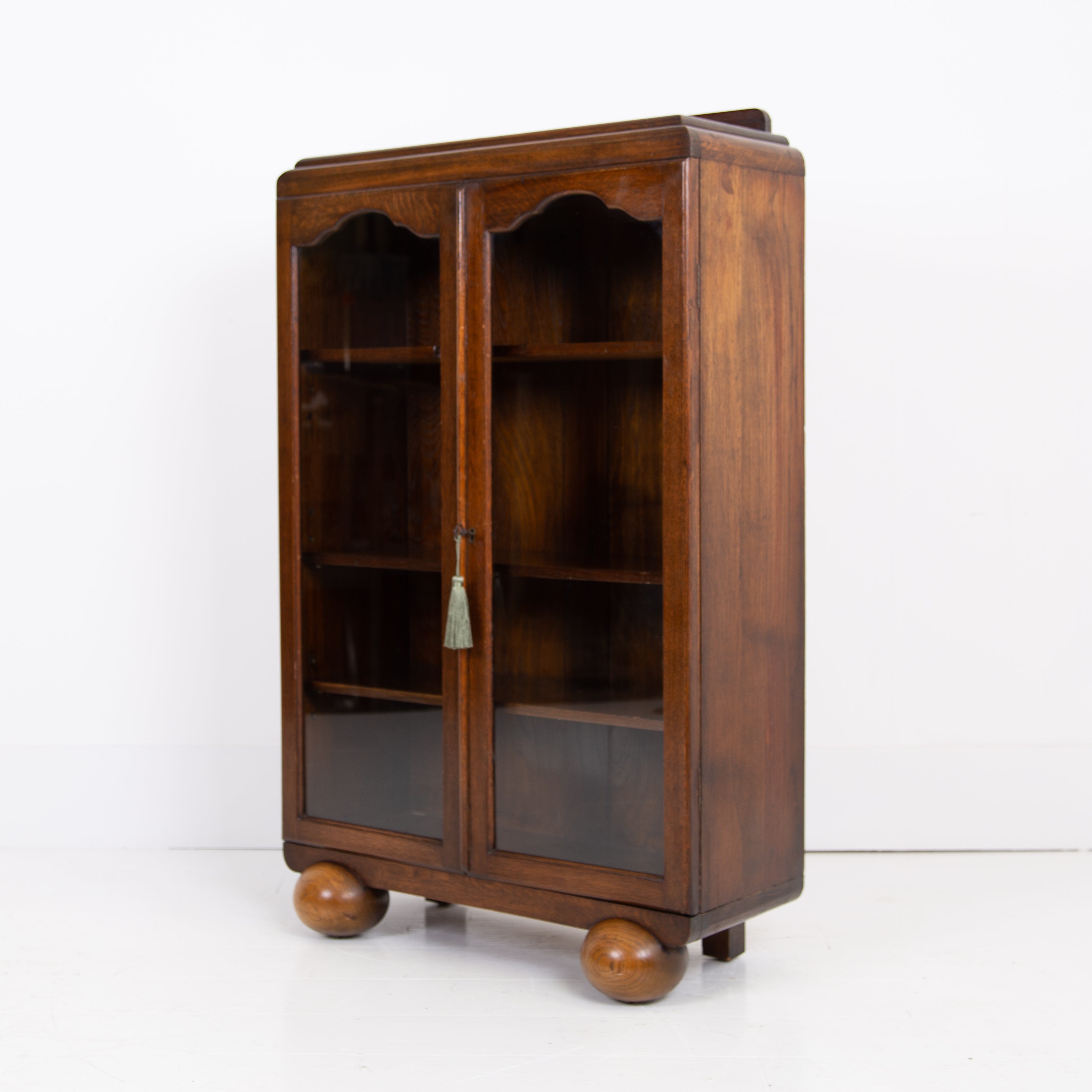 Highly likely made by Gomme this attractive 1930s English oak glazed bookcase/cabinet is of such an accommodating size. It sits well on “oversized” oak spheres and comes with 3 adjustable oak shelves inside and a wording lock and key to the arched glazed glass doors.