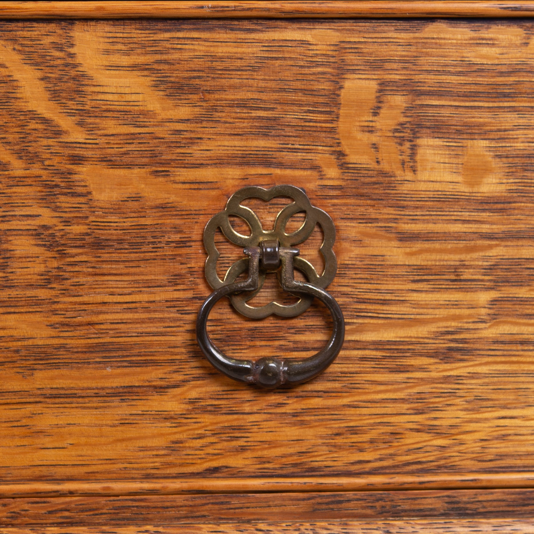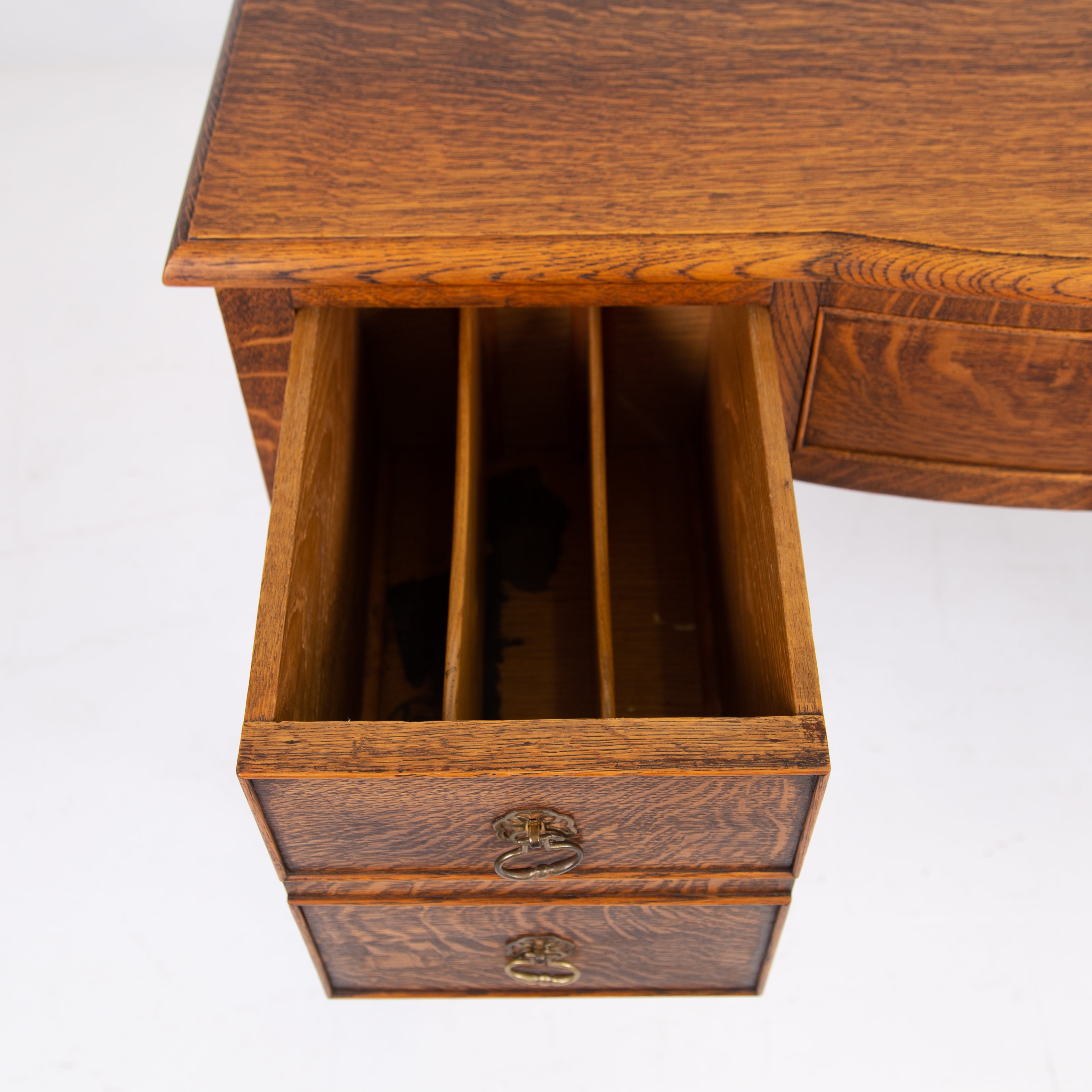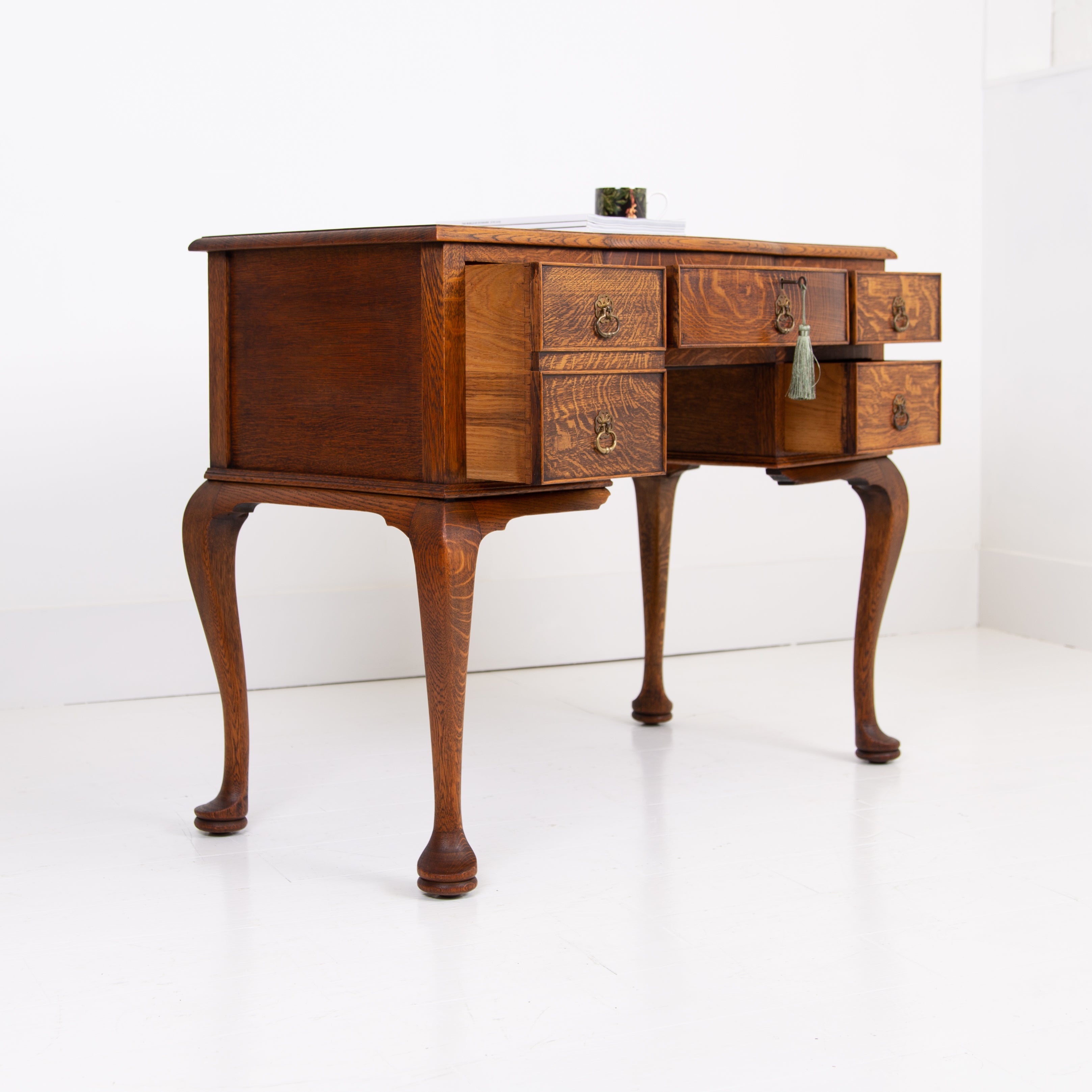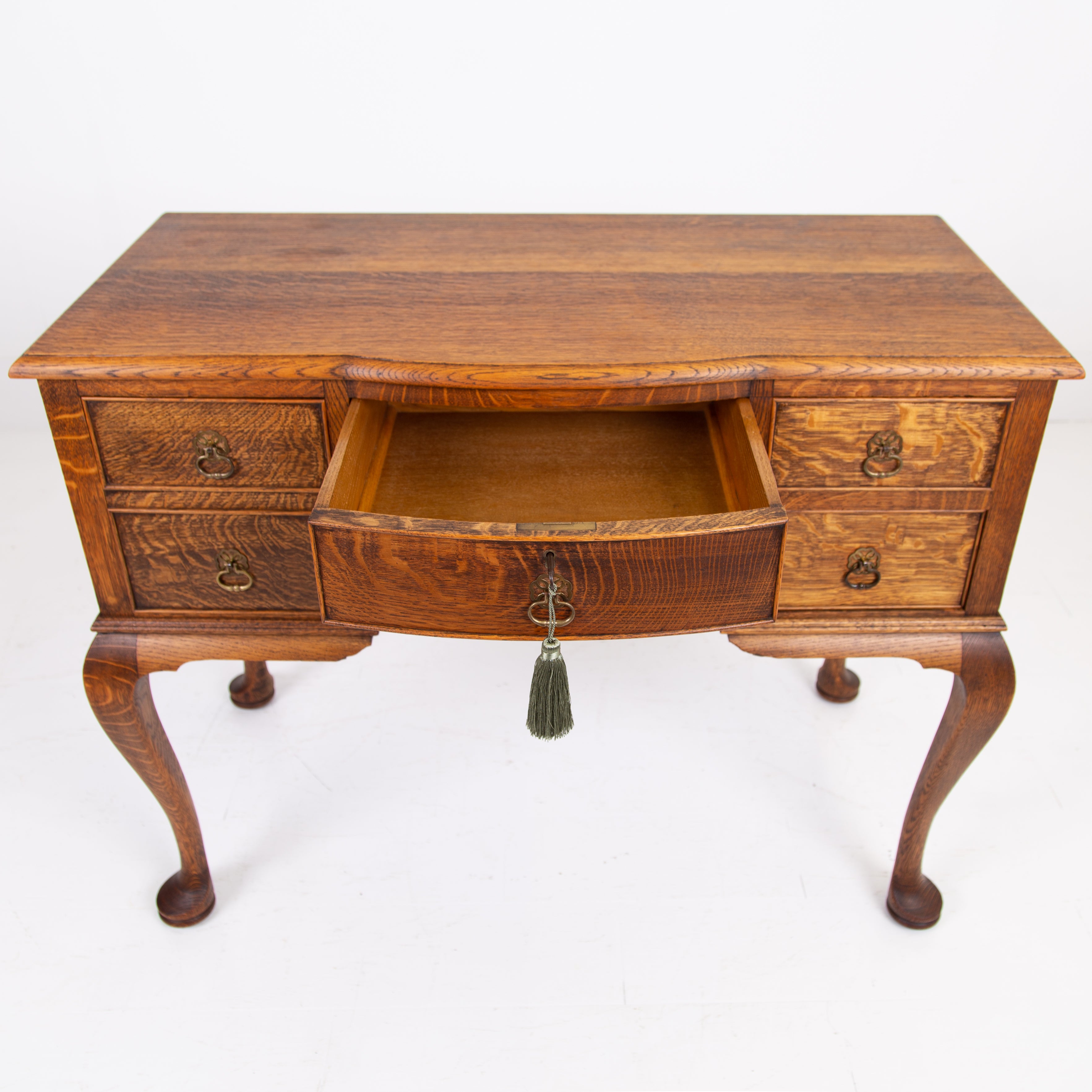 A highly attractive late 1920s 4 drawer desk in a lighter tone of English oak with a wealth of desirable features and of smaller scale than most. The desk sits on lovely pad feet and cabriole legs, we have a pleasing bow to the top drawer which comes with a working lock and key, smart cock beading to all drawers and the tone and colour of the oak is very good. Overall a quality piece for a period or modern home.