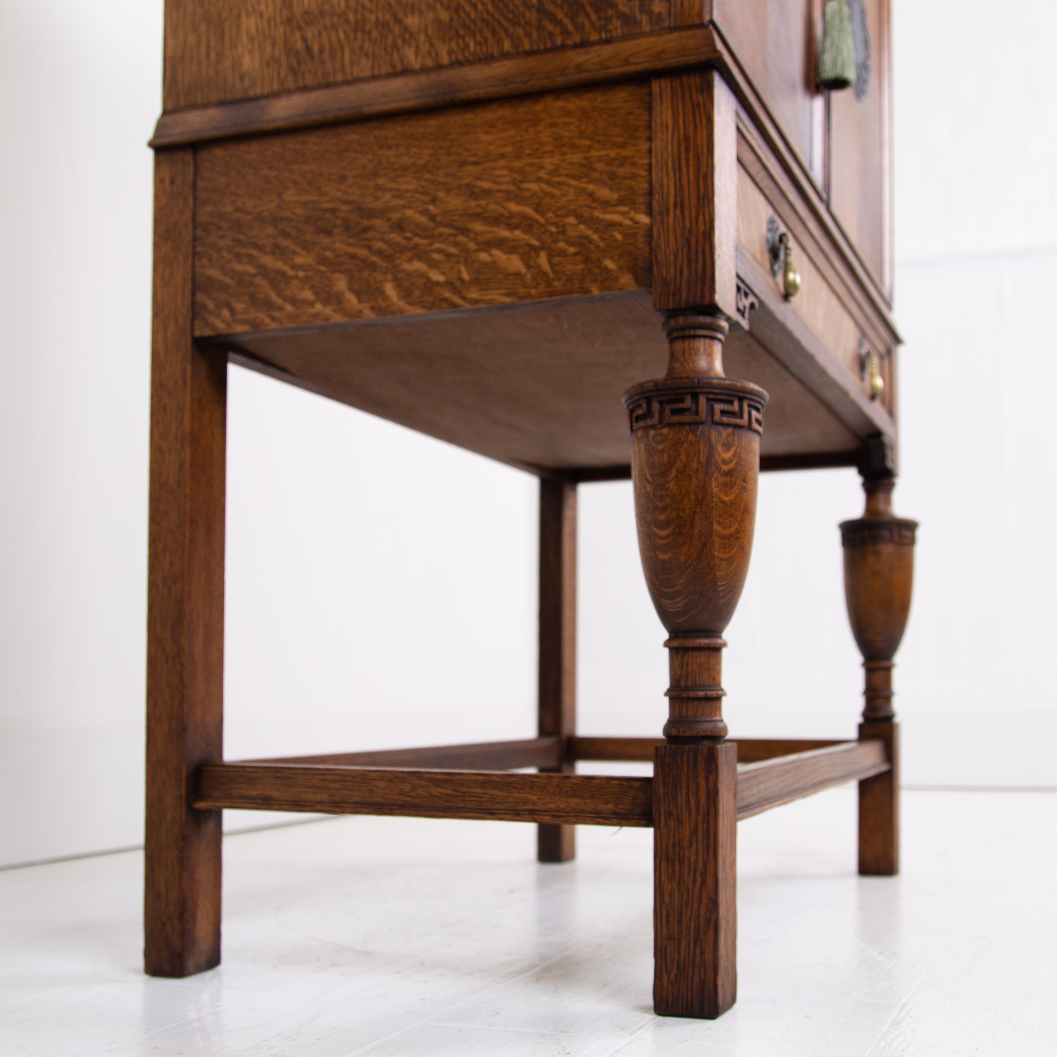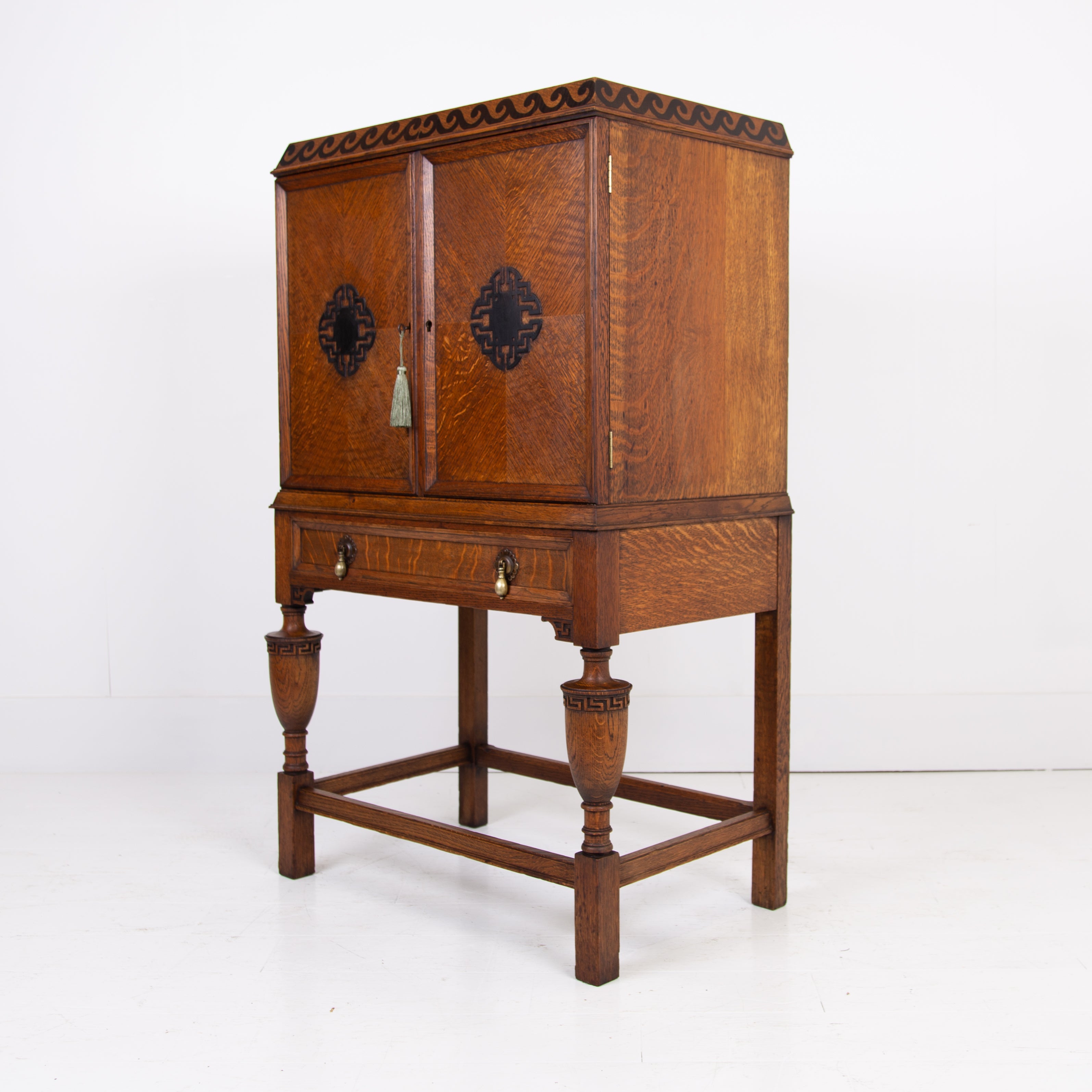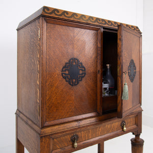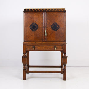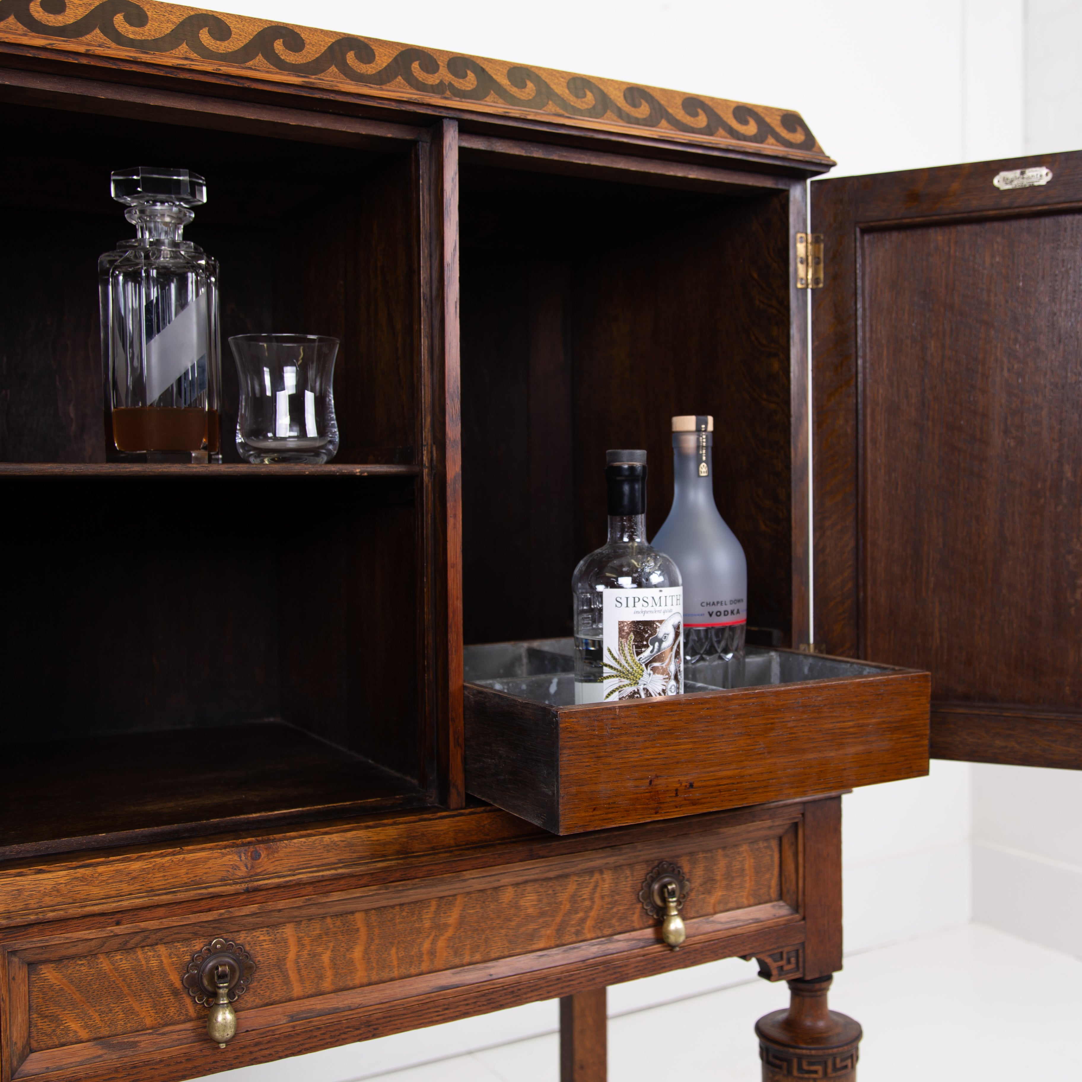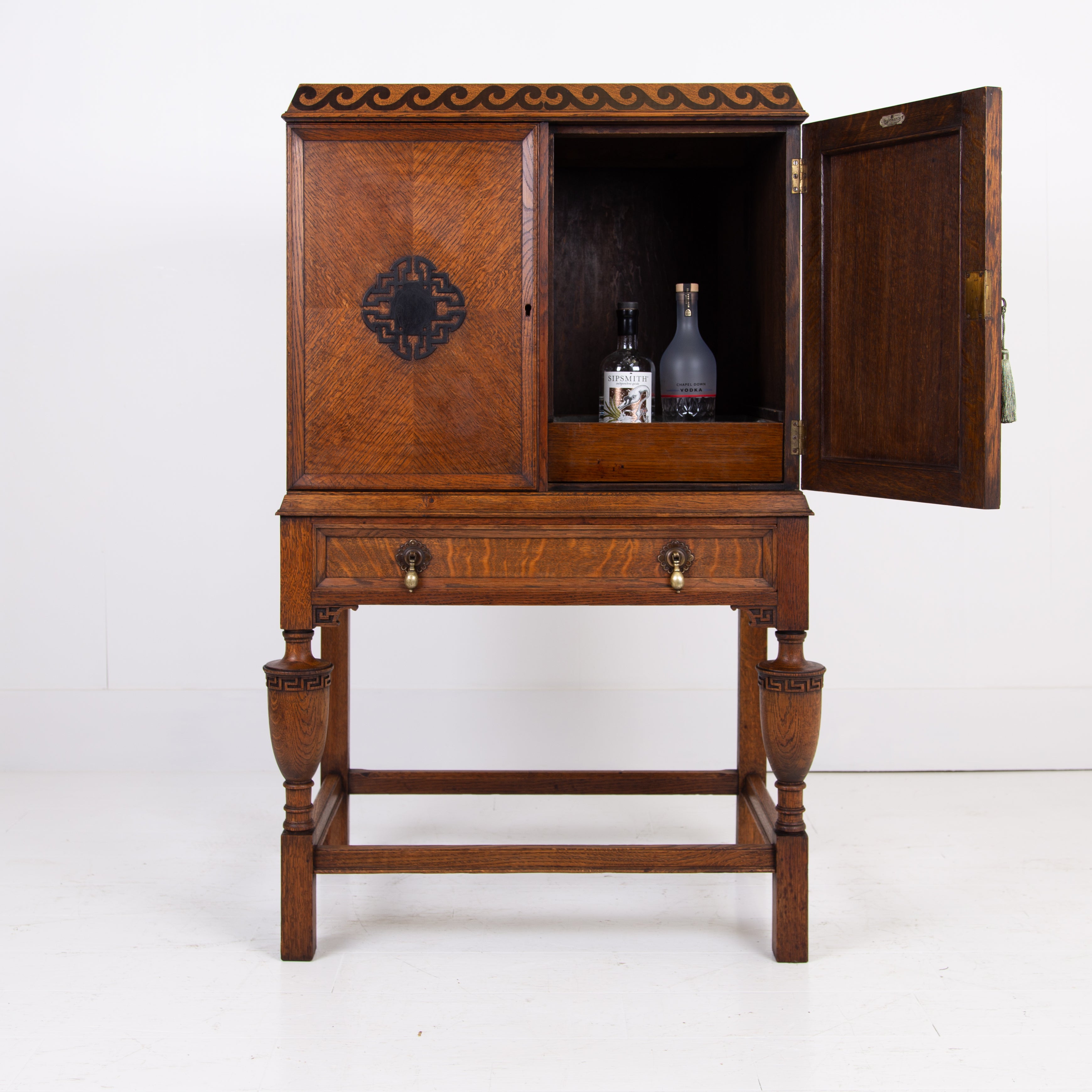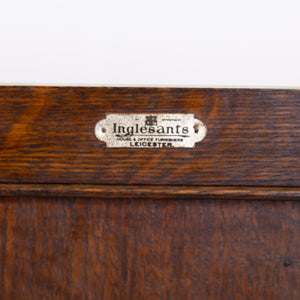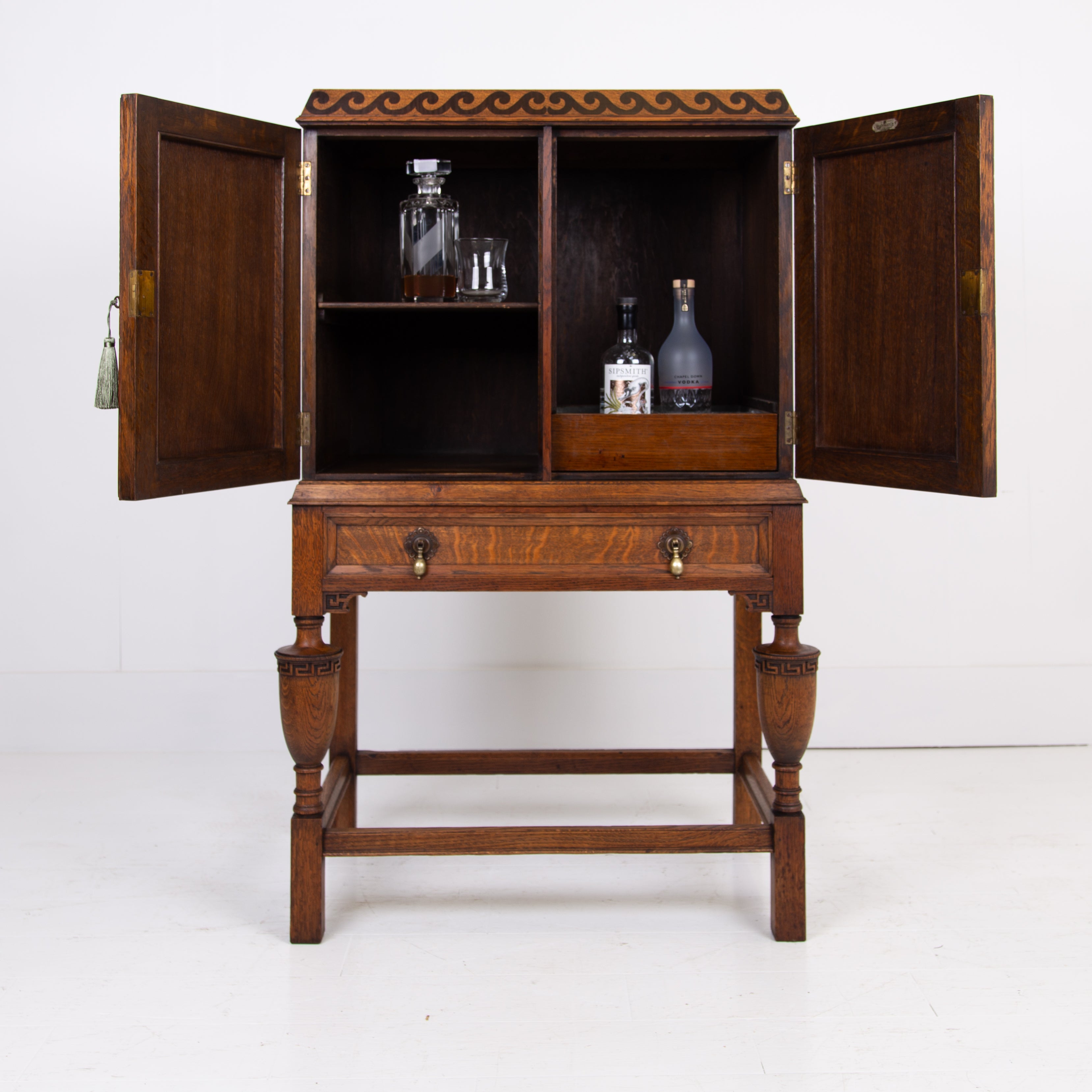 Of super quality we have an English oak 1920s drinks cabinet by Inglesants of Leicester - maker’s badges to the inside of right hand side door and rear. Inglesants were high quality makers in their day - of a similar standard to early Gillows of Lancaster.