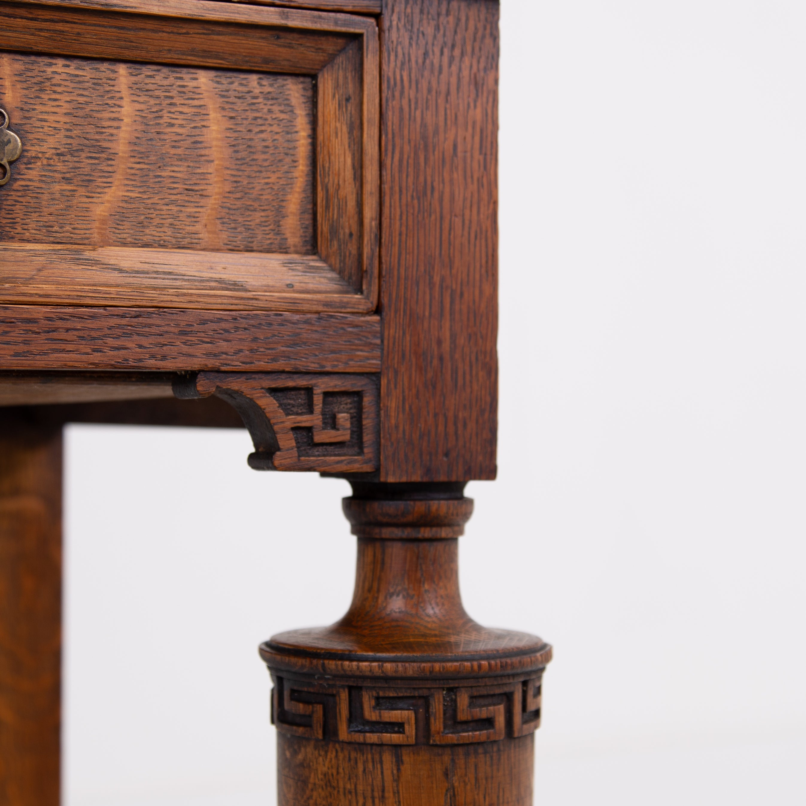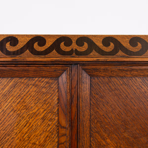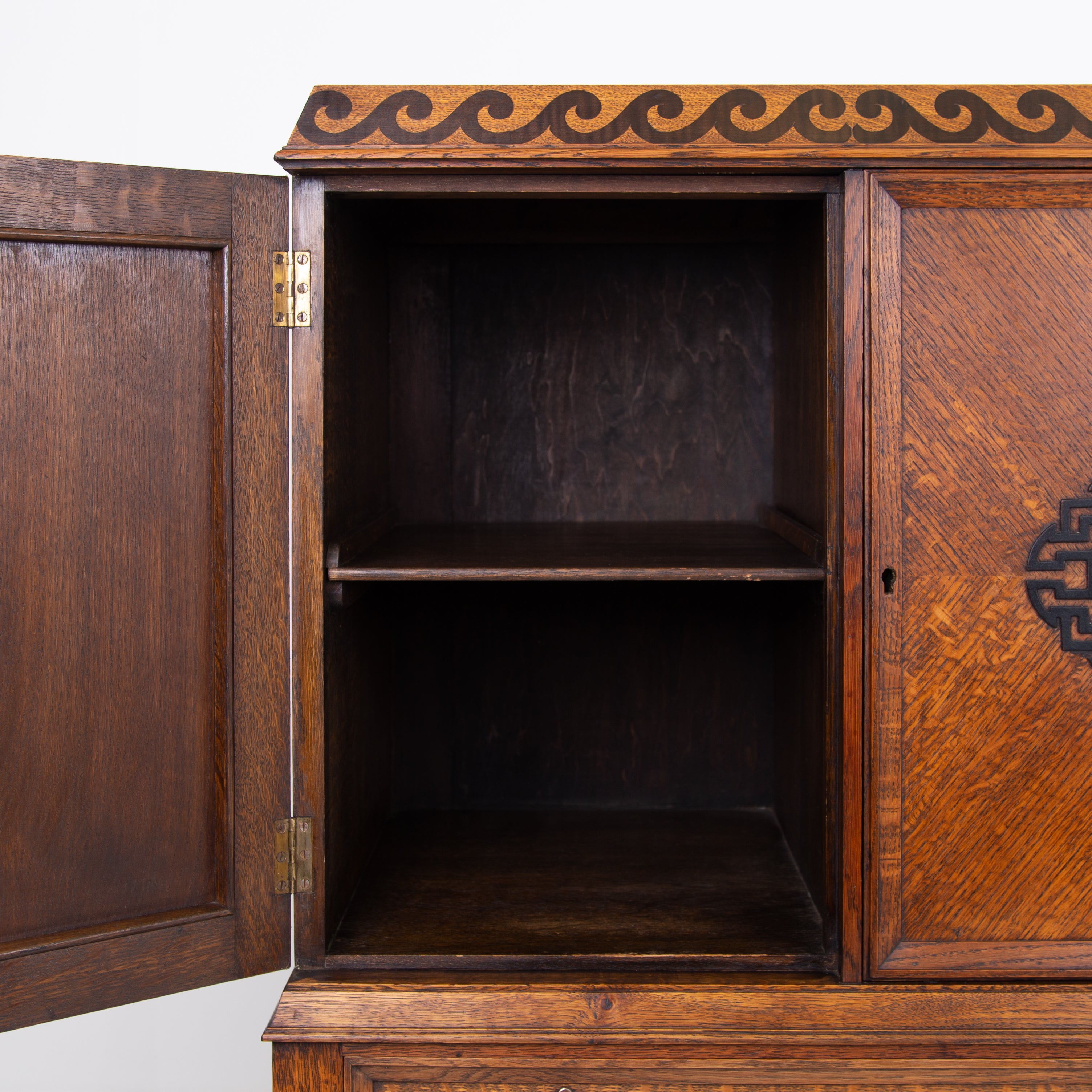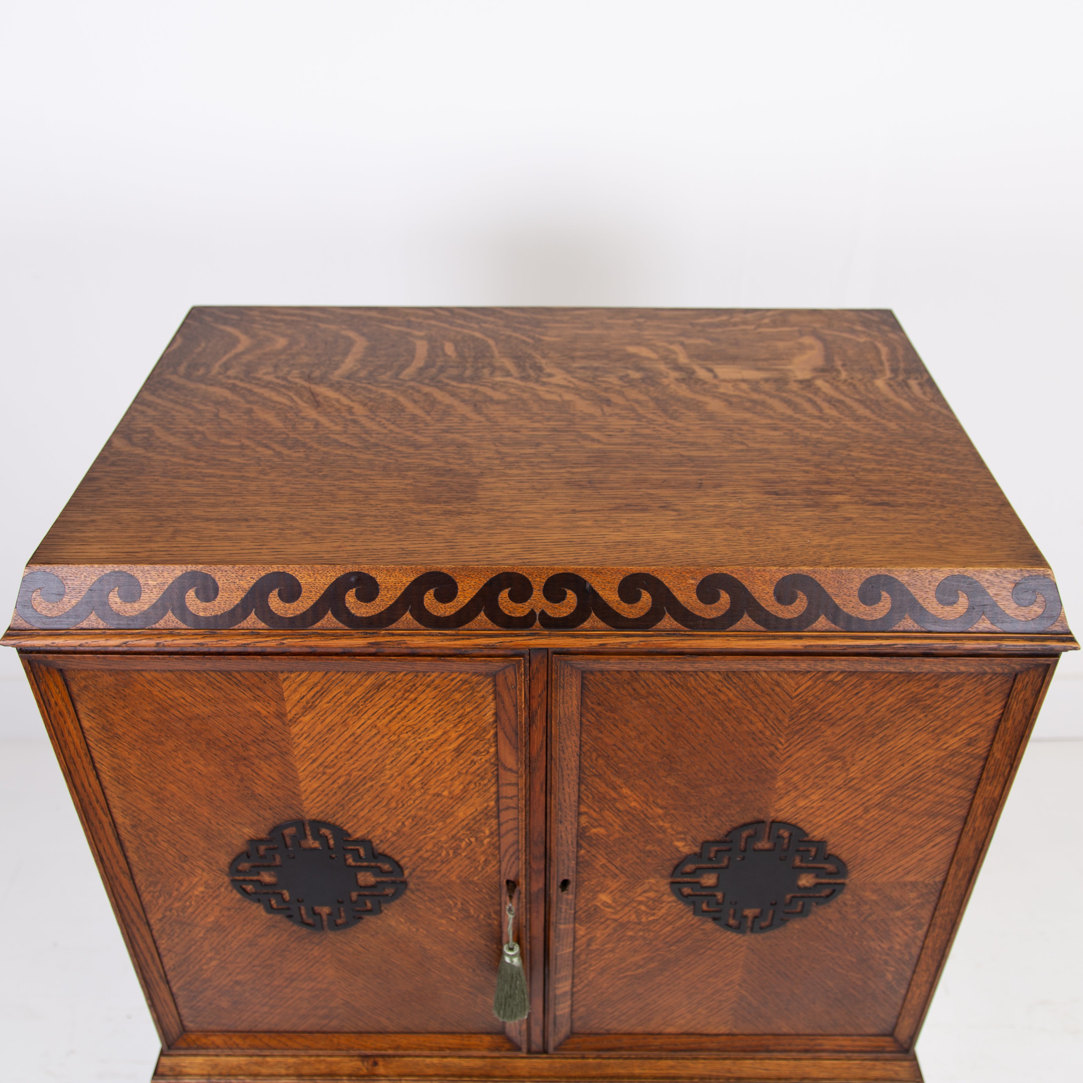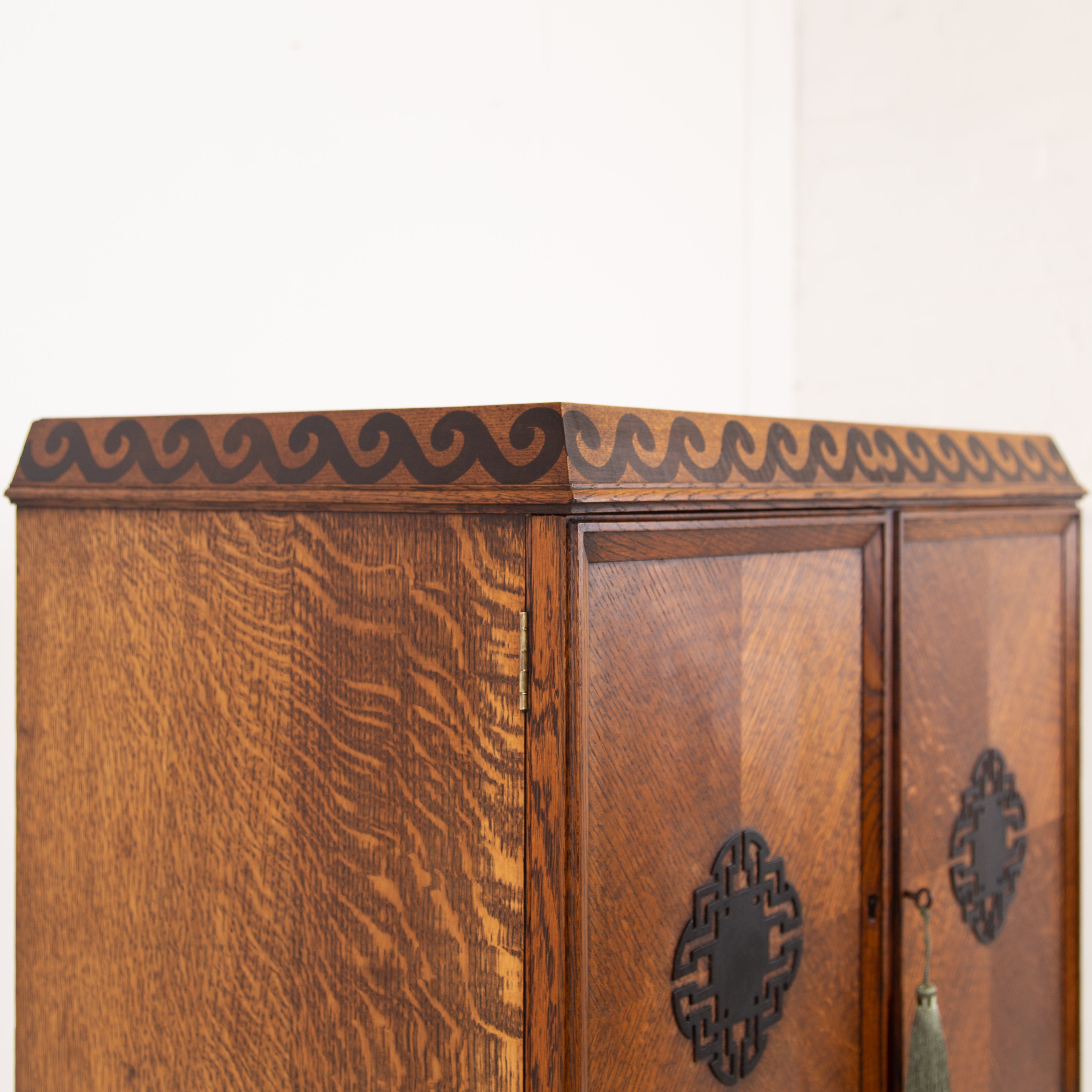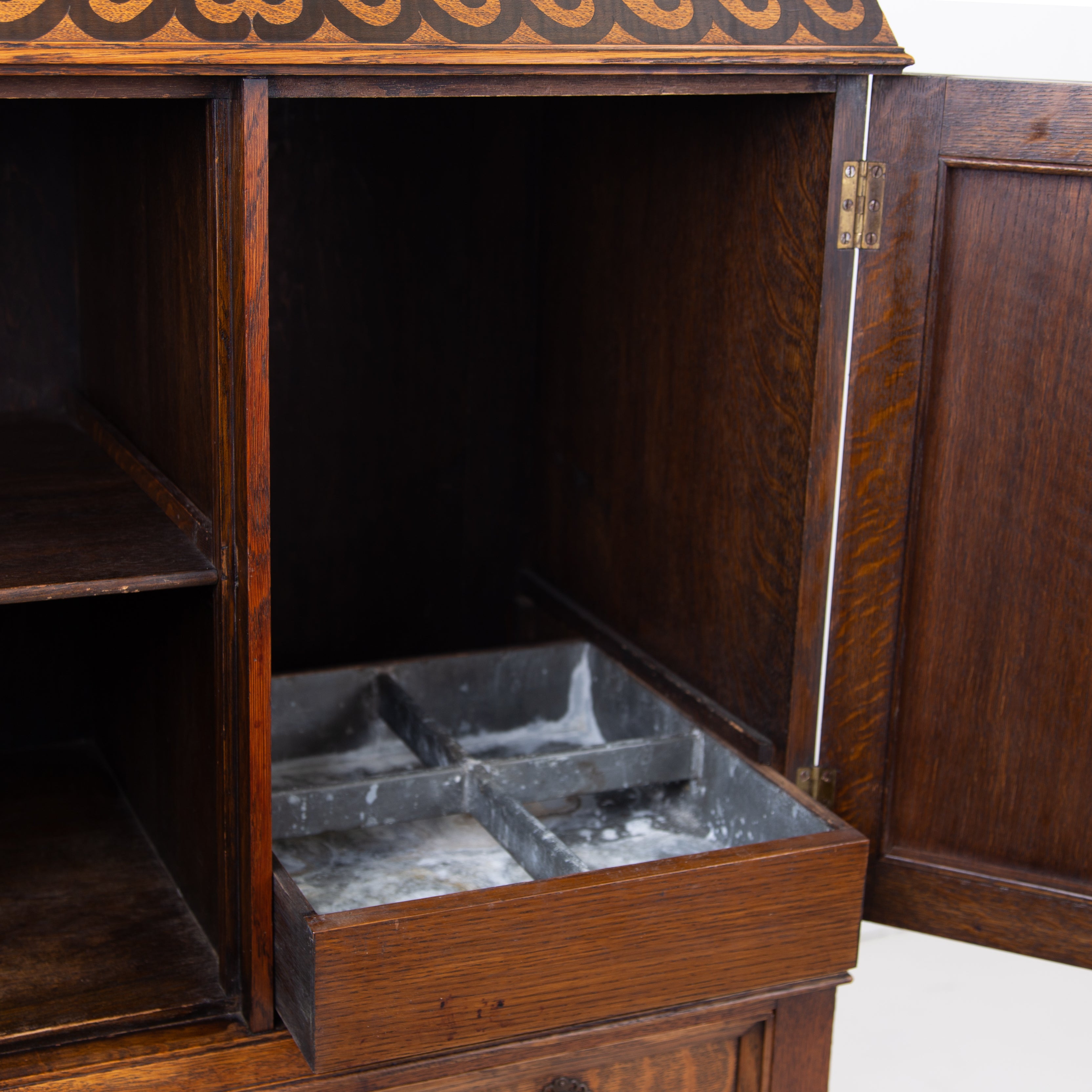 Of super quality we have an English oak 1920s drinks cabinet by Inglesants of Leicester - maker’s badges to the inside of right hand side door and rear. Inglesants were high quality makers in their day - of a similar standard to early Gillows of Lancaster.