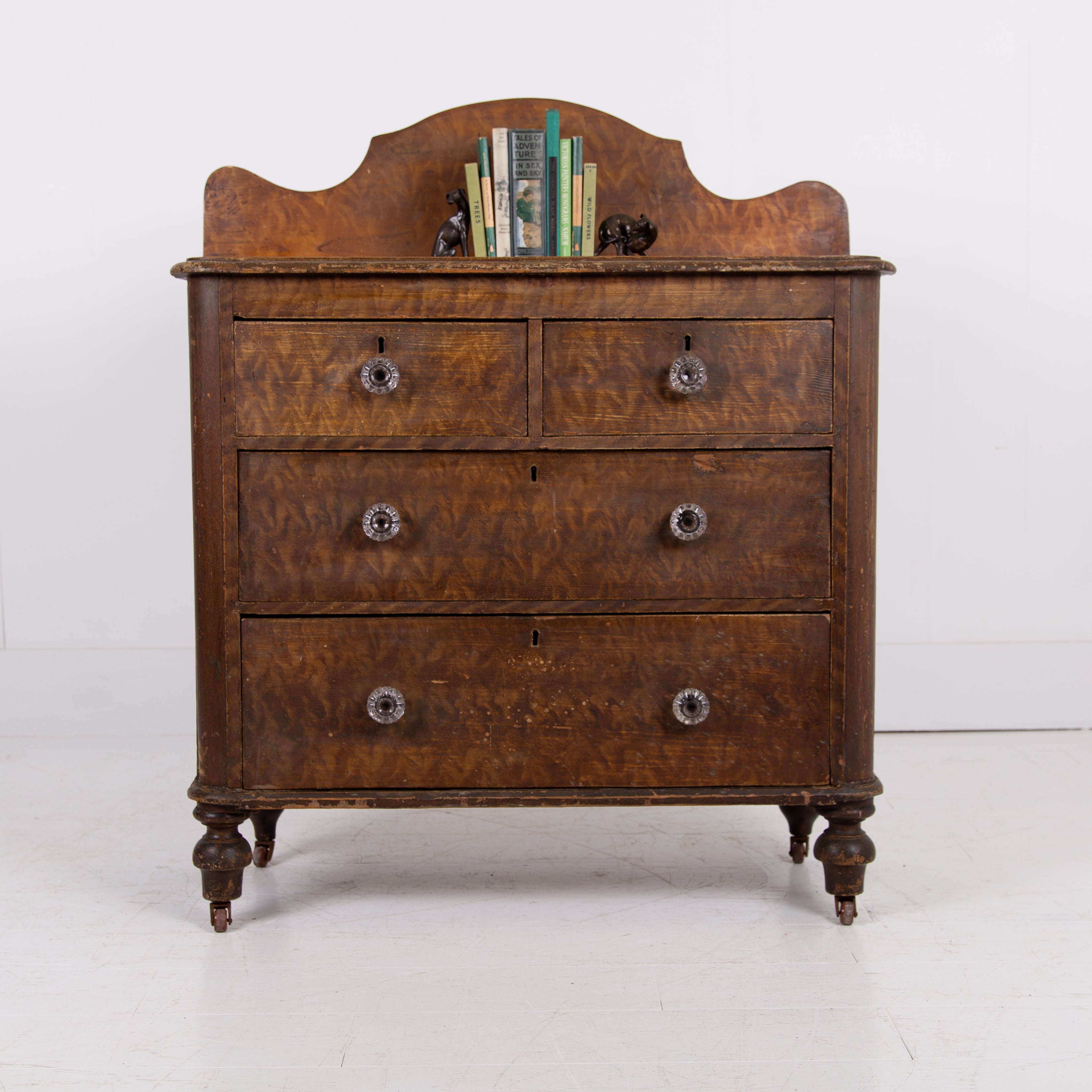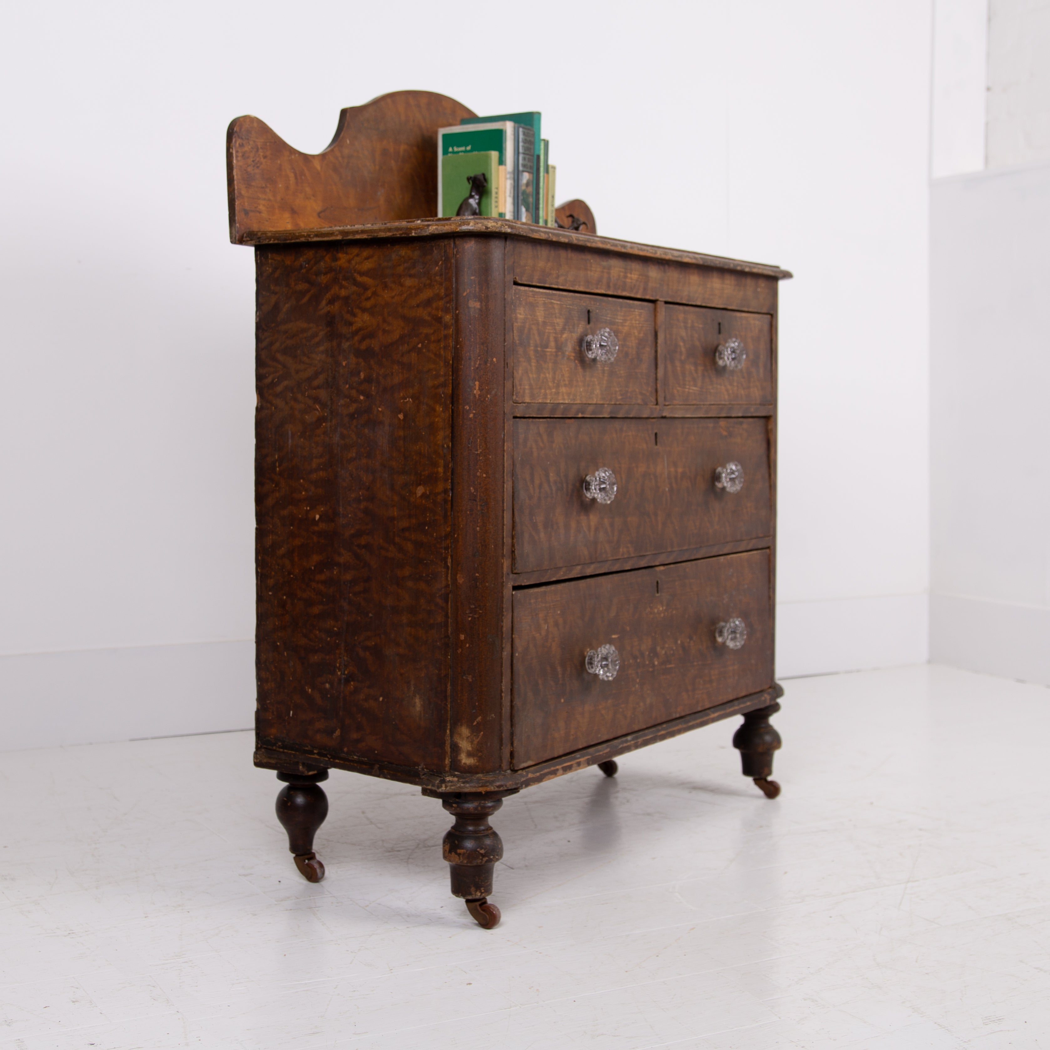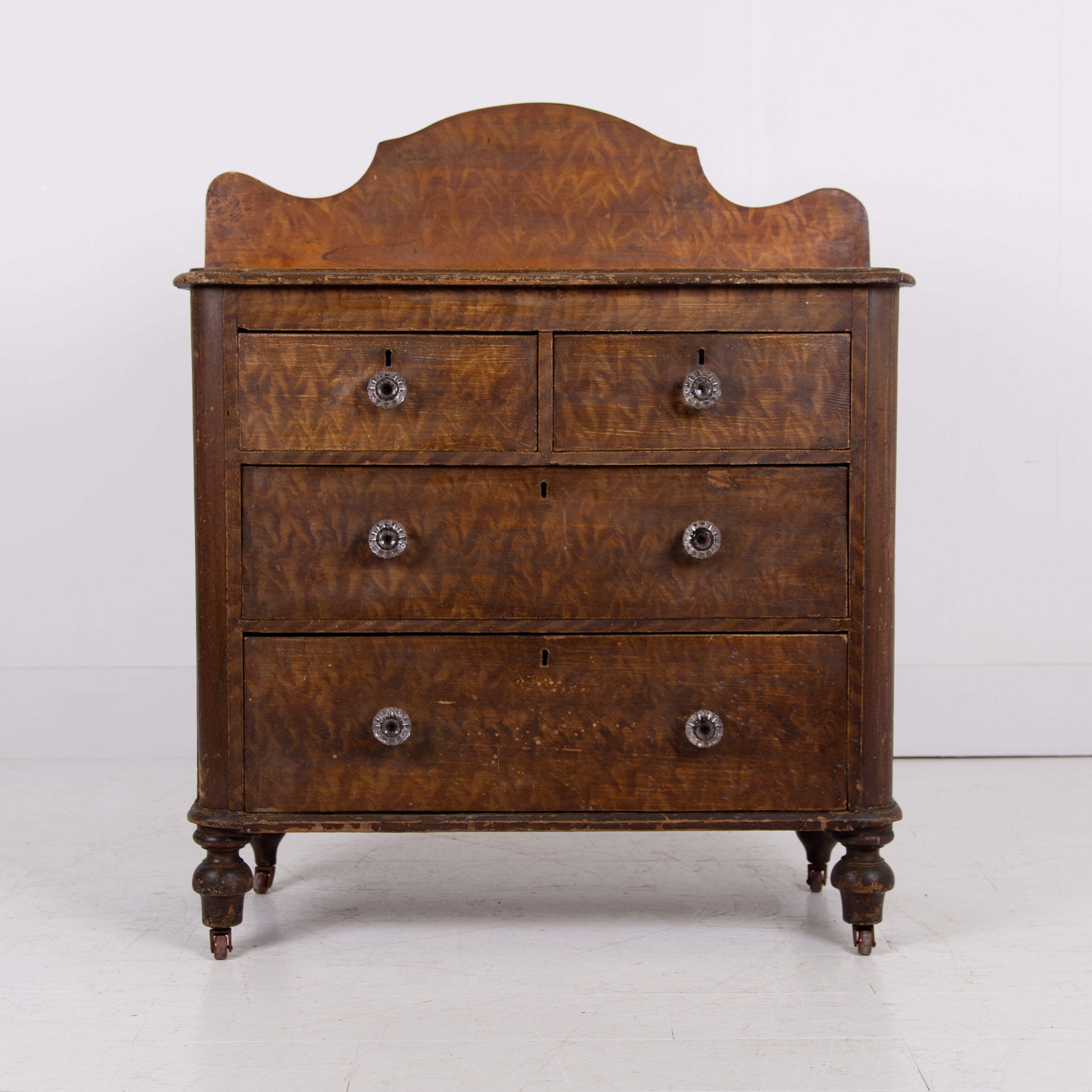 A delightful little Victorian country chest of drawers sitting in the original paint - we love the look, scale and condition on this one. The style is classic country Victorian with the drawer combo of 2 half drawers and 2 long drawers with glass knobs sitting underneath all perched on those lovely turned legs and little pot castors.