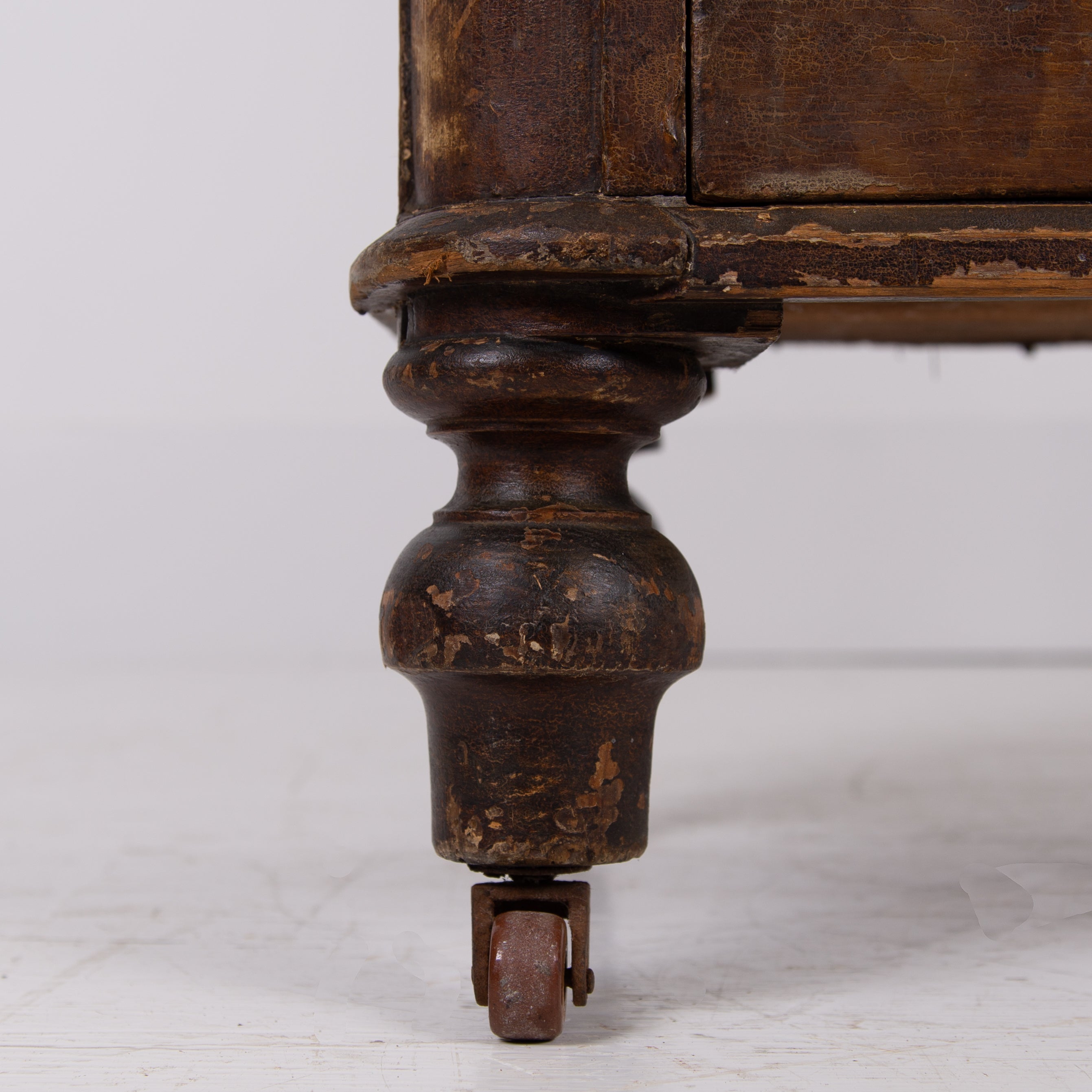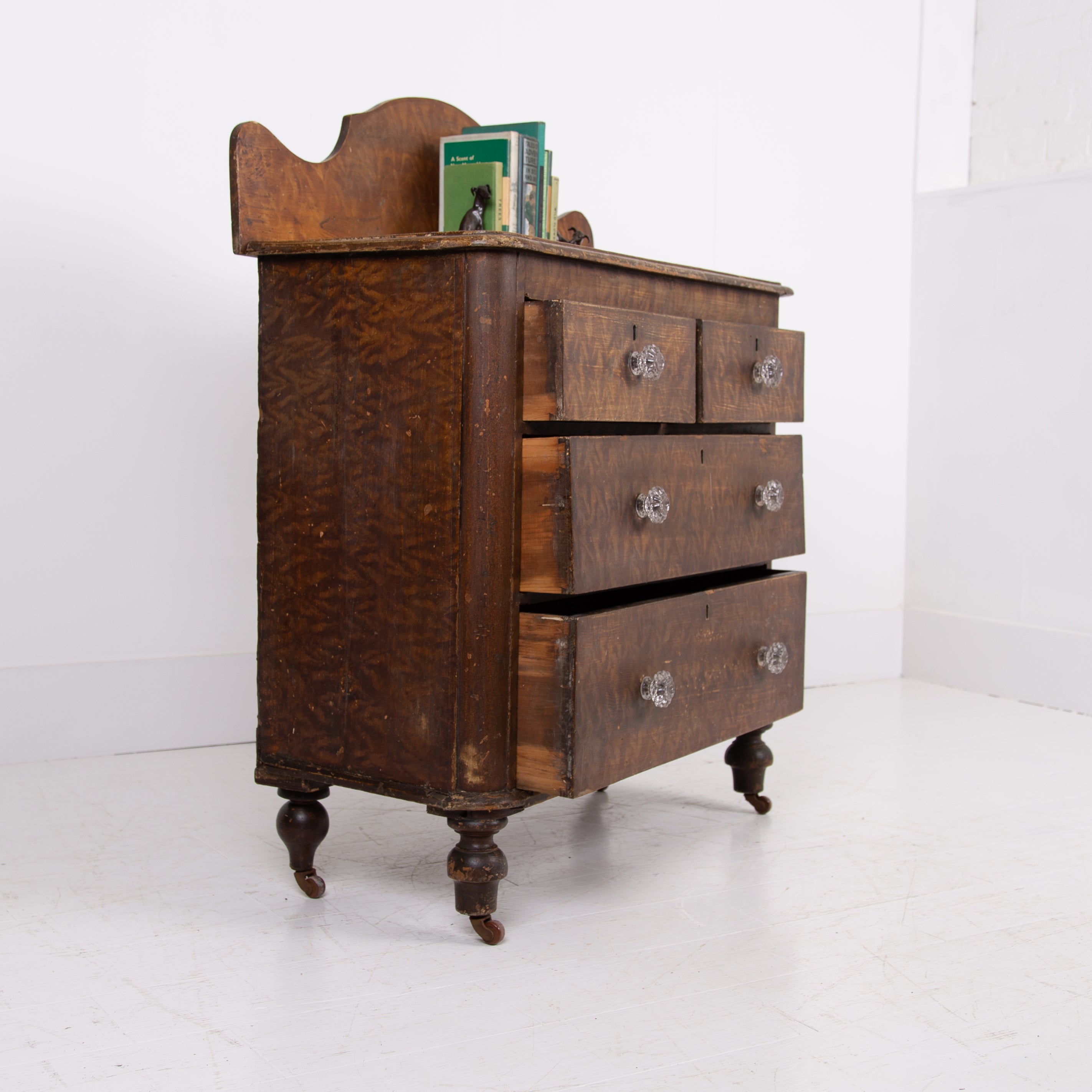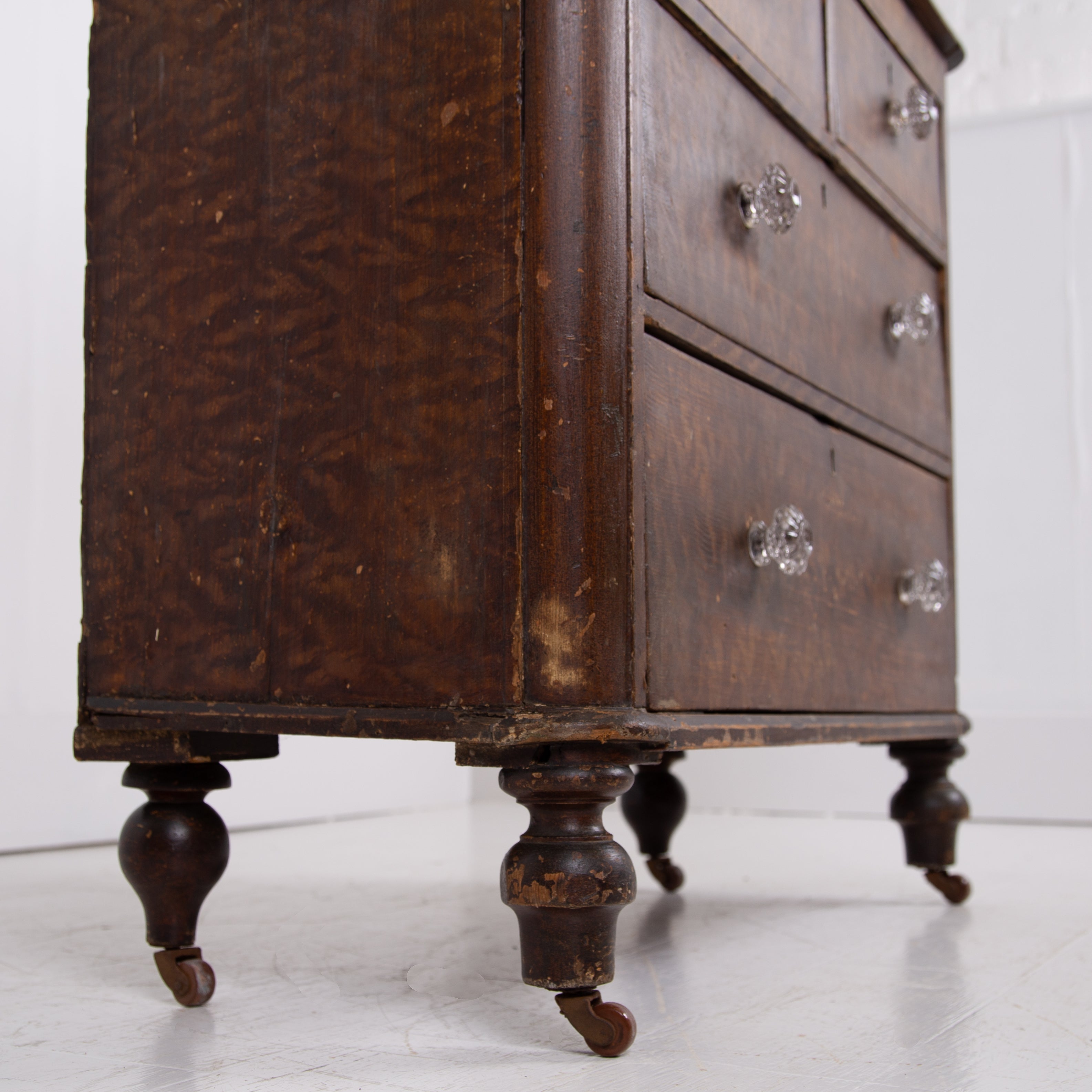 A delightful little Victorian country chest of drawers sitting in the original paint - we love the look, scale and condition on this one. The style is classic country Victorian with the drawer combo of 2 half drawers and 2 long drawers with glass knobs sitting underneath all perched on those lovely turned legs and little pot castors.