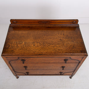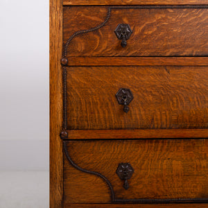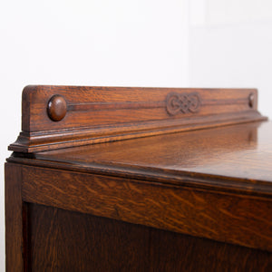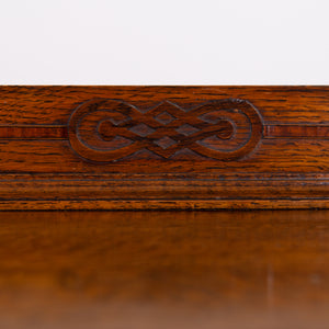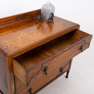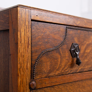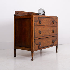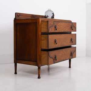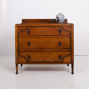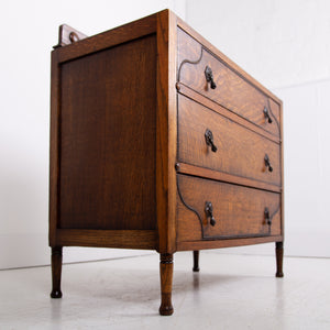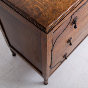 A rather charming little oak of 3 drawers which would slot into a period or modern home with ease. It's an attractive little number with slender oak turned legs supporting 3 deep drawers which are decorated with a trail of small oak beading and cast drop handles.