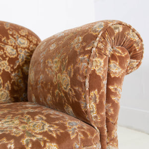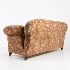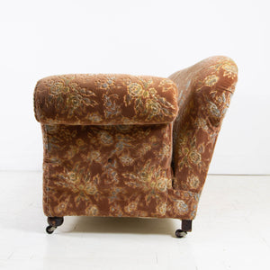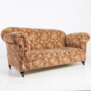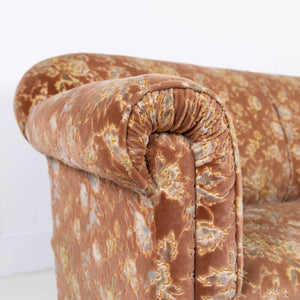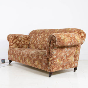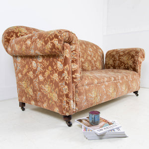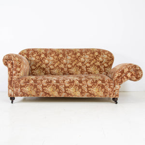 Great shape and rake on this late 1920s drop end sofa which may benefit from upholstery and which our upholsterer would be happy to assist with if required. However the current floral cut velvet damask fabric is very presentable and perfectly usable if you wish.