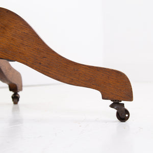 From the Edwardian period, maybe a touch later, in good condition – the frame is firm, the seat is covered in a red, blue and stone leaf and trellis patterned fabric with a little wear but perfectly usable. Mark our upholsterer would be able to recover the seat in leather at a cost of £110 plus VAT which would include leather - we have a few colours in stock. The swivel and height mechanisms are working fine, the casters spinning as they should and the seat rotating. Expect pleasing day to day wear on the frame. We have waxed the oak on the frame and base, so very much ready to place…