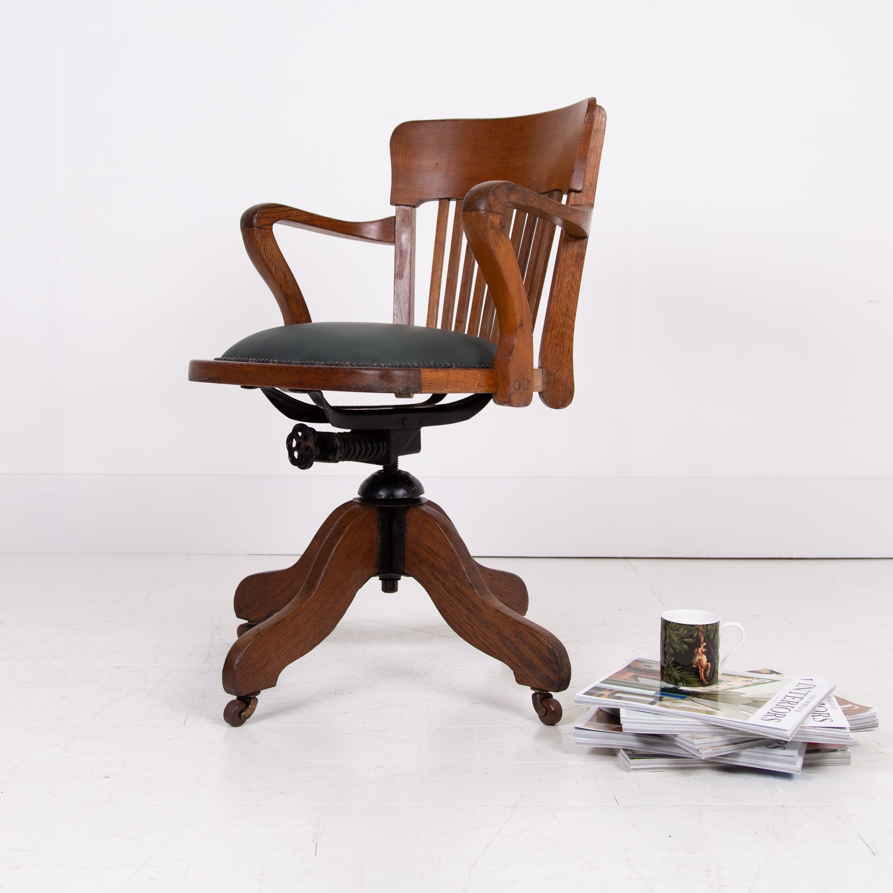 From the Edwardian period, it sits in good historic condition – the frame possesses sensible aging, the seat as mentioned is plump having been reupholstered including webbing etc in a fine green leather hide secured with aged brass studs which will wear a treat The swivel and height mechanisms are working fine with the seat rotating. Expect pleasing day to day wear on the frame. We have waxed the oak on the frame and base, so very much ready to place…