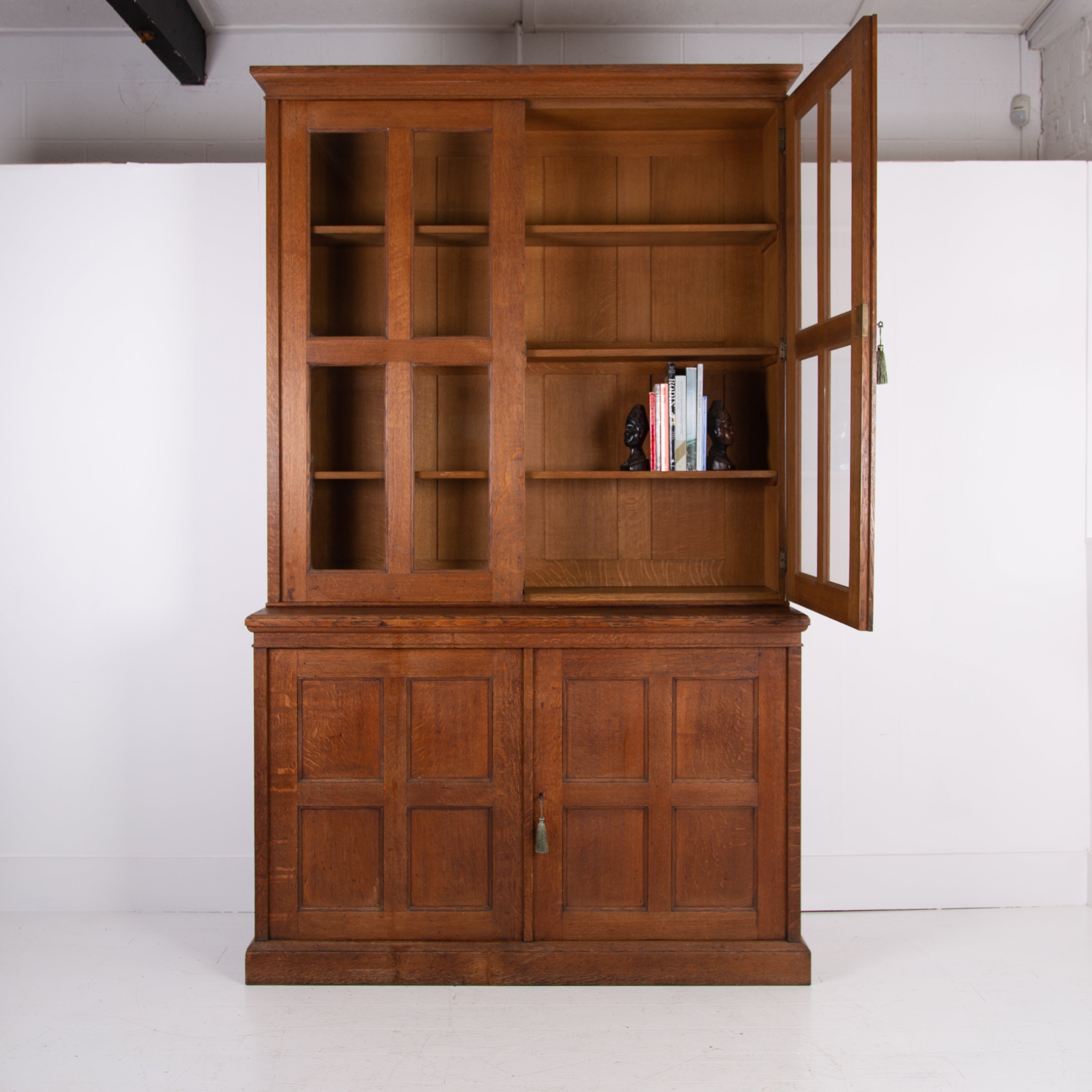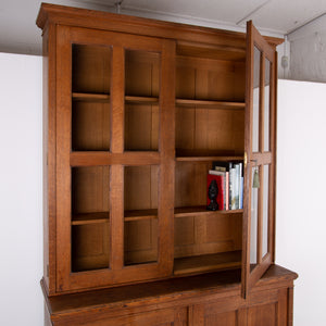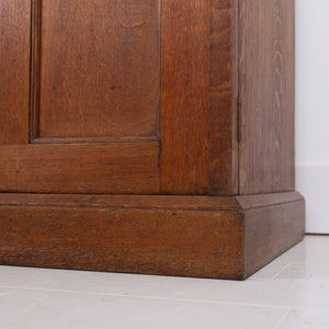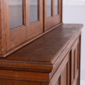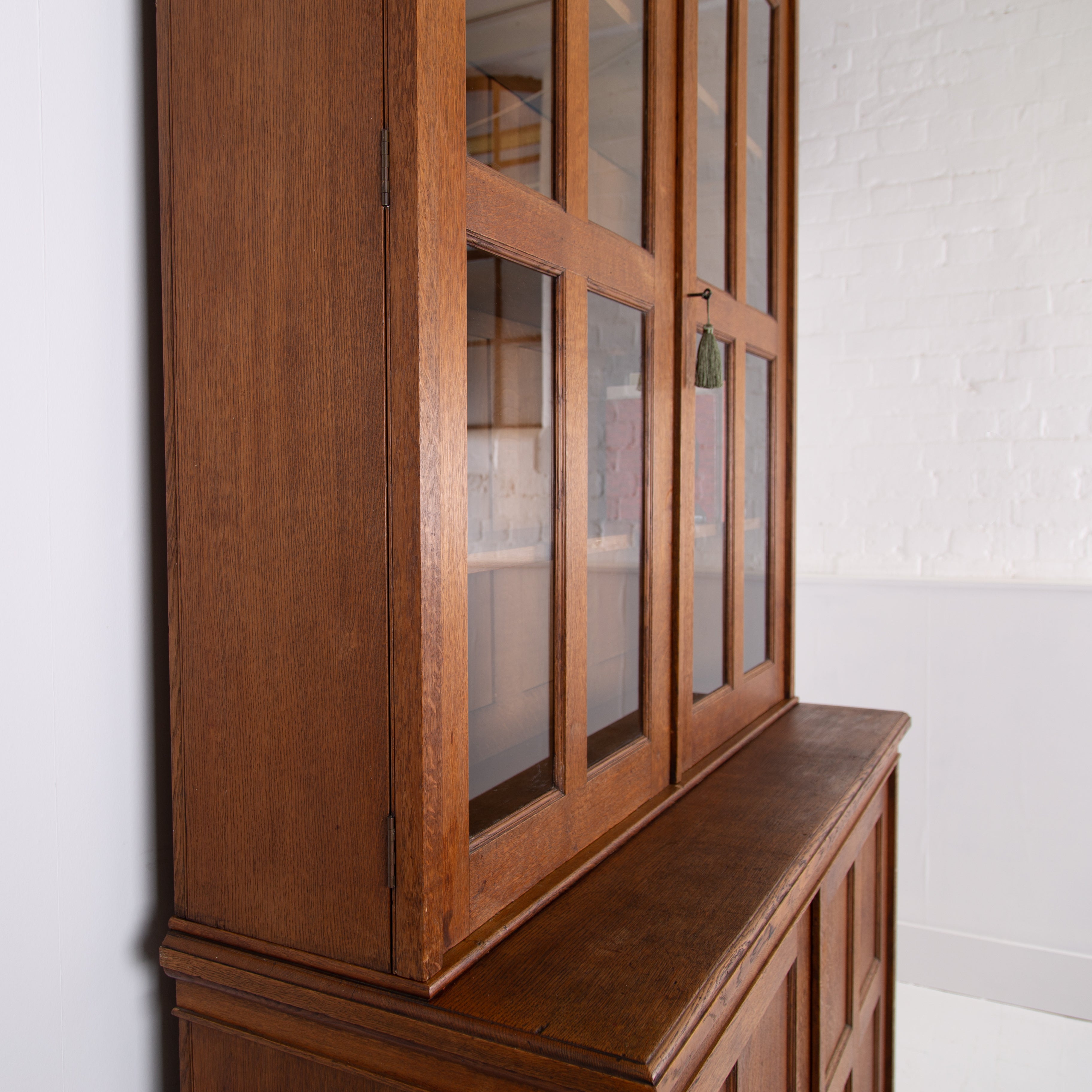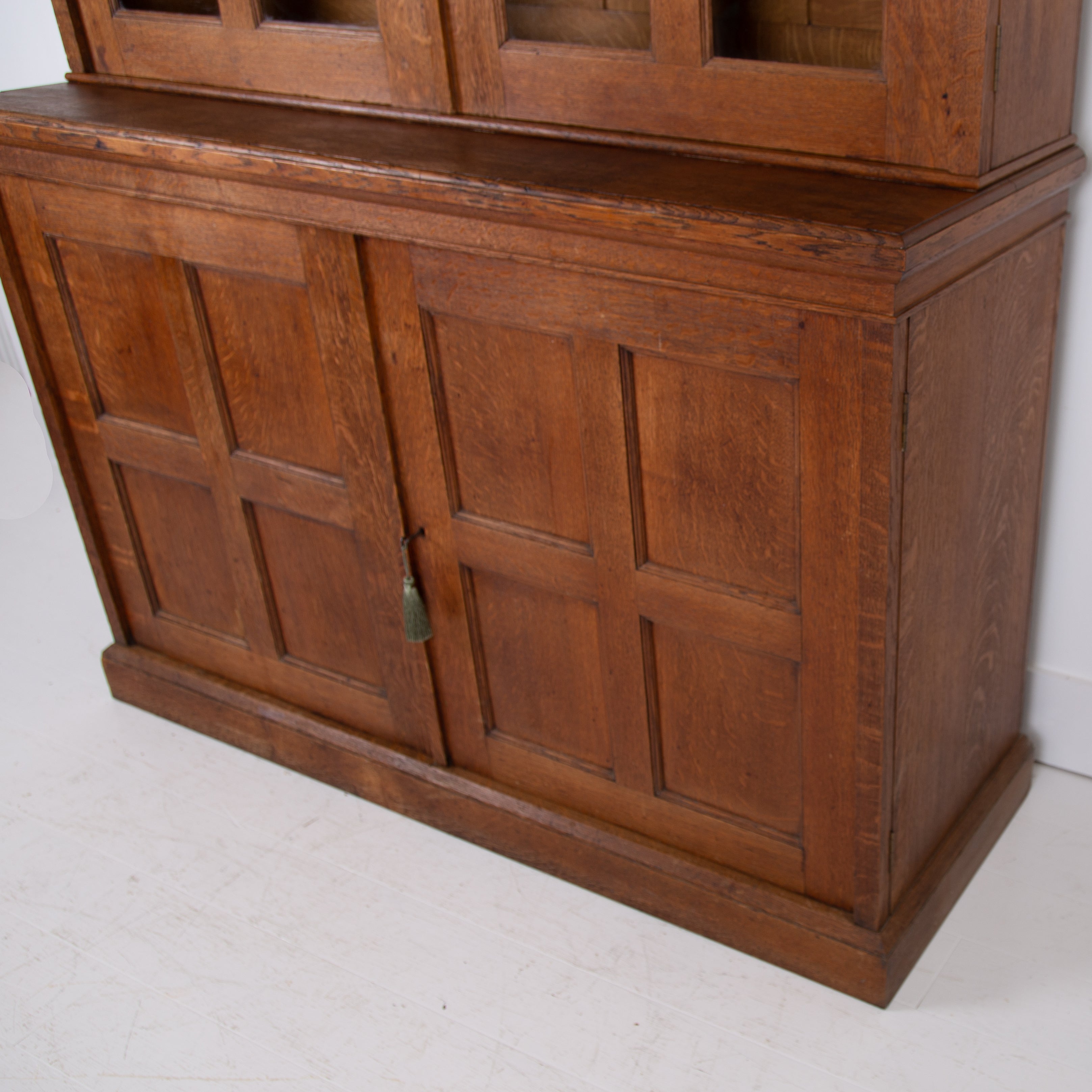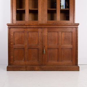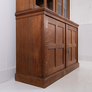 The piece incorporates a pair of panelled oak cupboard doors at the lower level which possesses a solid oak removable shelf; these are topped with a pair of oak framed glazed doors which reveal a flight of 3 solid oak shelves. We have a deep plinth to the bottom and the top has a deep decorative moulding which is all complete. The piece makes use of some quality English oak and the back is panelled. We have working locks and keys to the top and base. In all a very nice piece of furniture. Please note the bookcase does split into 2 and will be delivered as such, it's a solid and heavy piece. Please expect sensible historic wear.