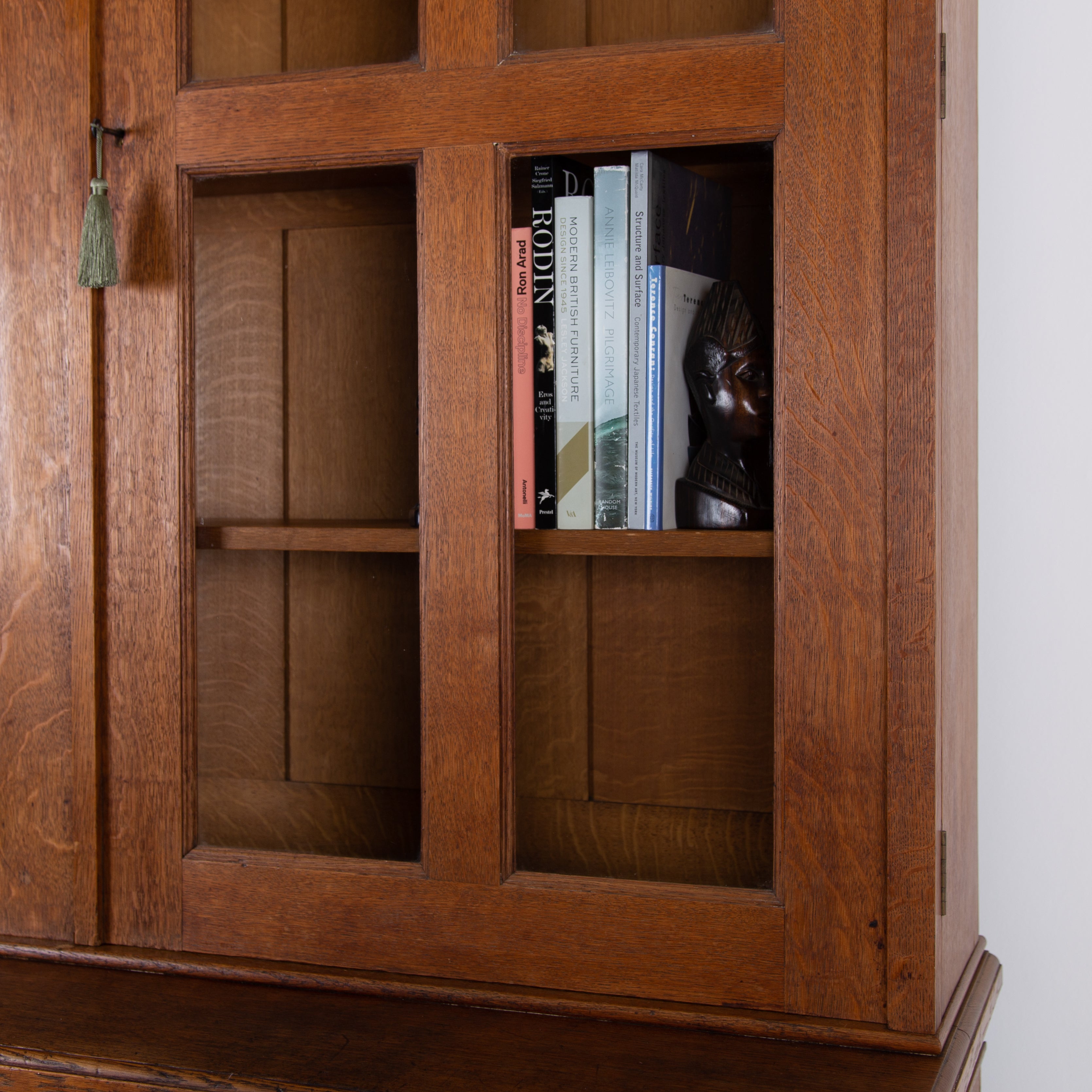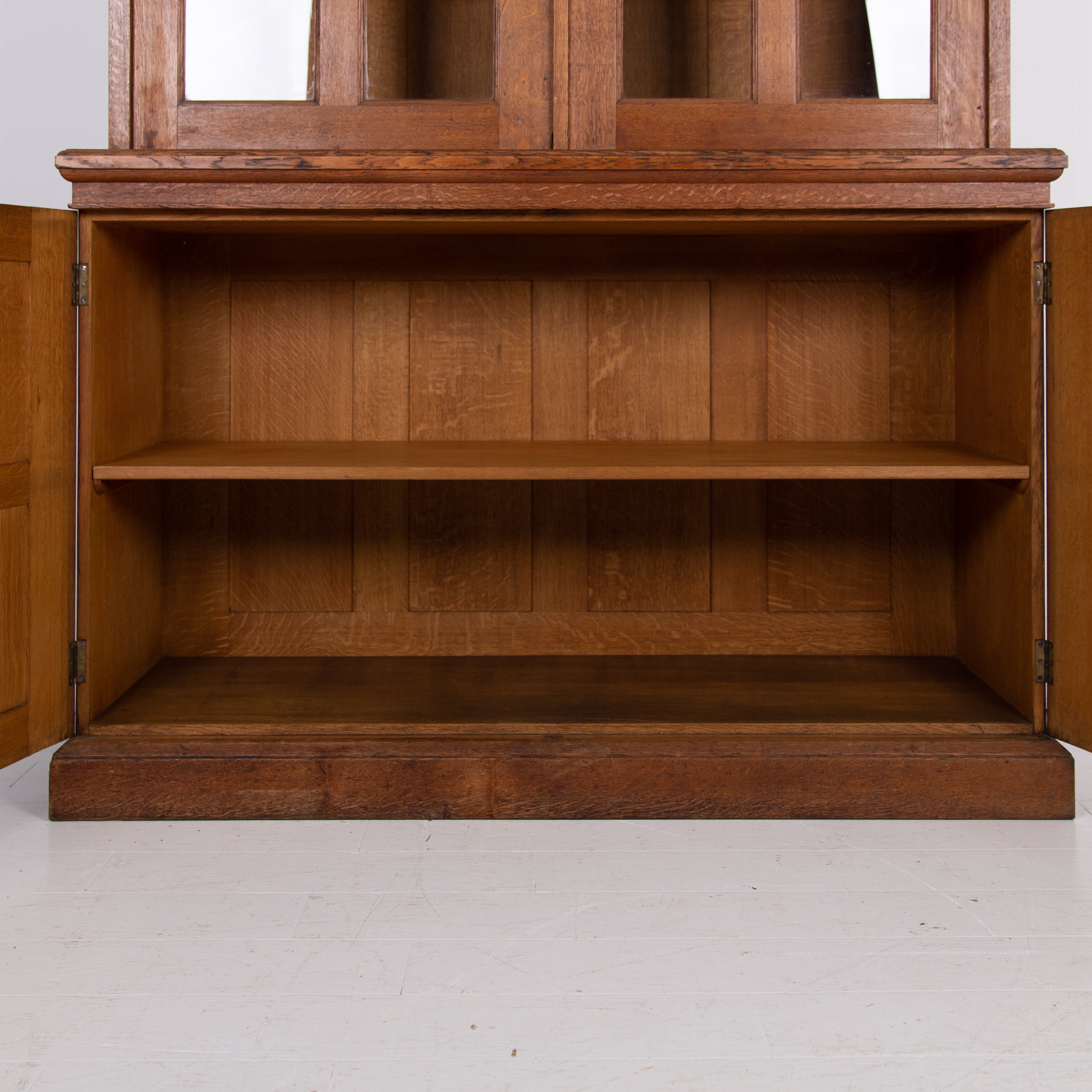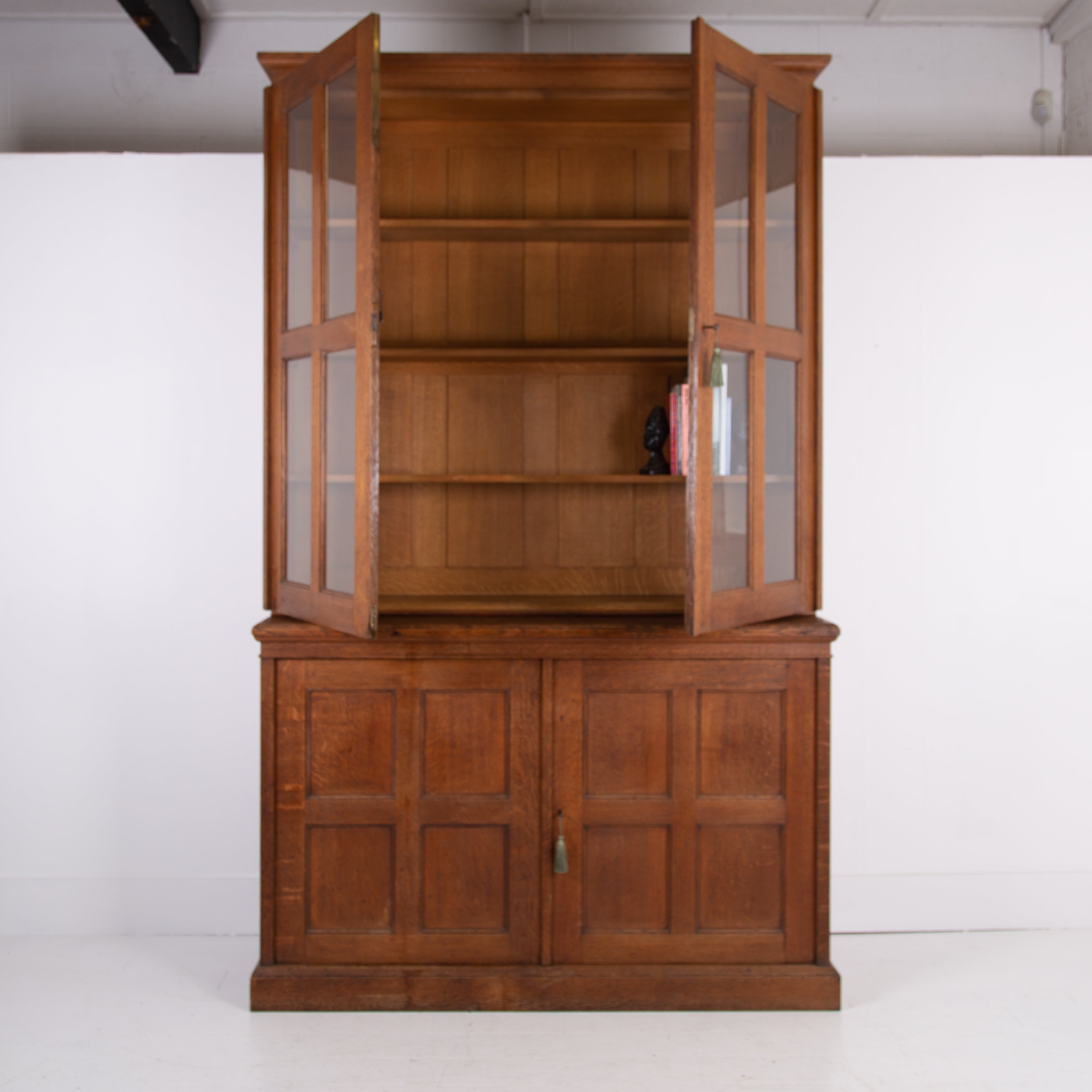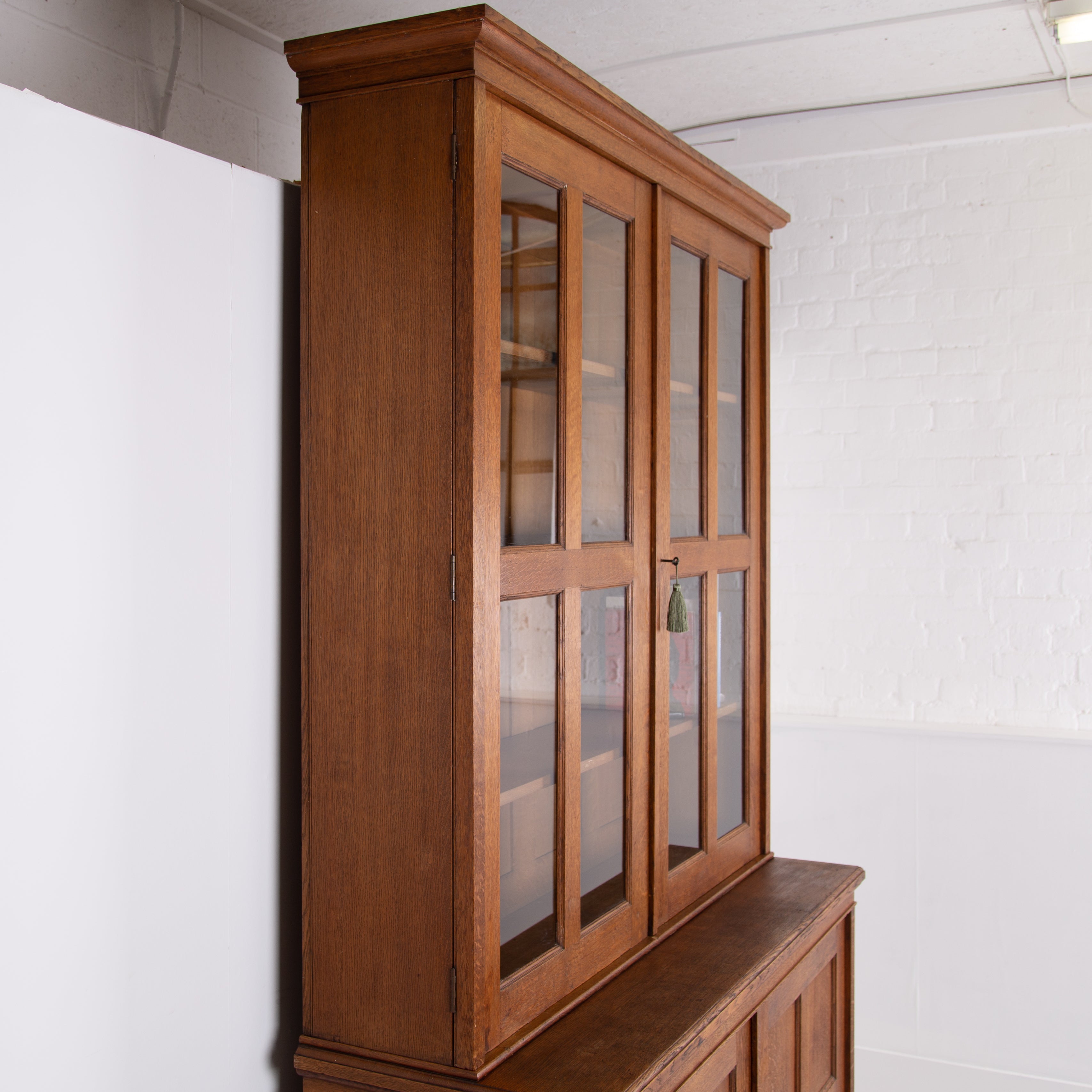 The piece incorporates a pair of panelled oak cupboard doors at the lower level which possesses a solid oak removable shelf; these are topped with a pair of oak framed glazed doors which reveal a flight of 3 solid oak shelves. We have a deep plinth to the bottom and the top has a deep decorative moulding which is all complete. The piece makes use of some quality English oak and the back is panelled. We have working locks and keys to the top and base. In all a very nice piece of furniture. Please note the bookcase does split into 2 and will be delivered as such, it's a solid and heavy piece. Please expect sensible historic wear.