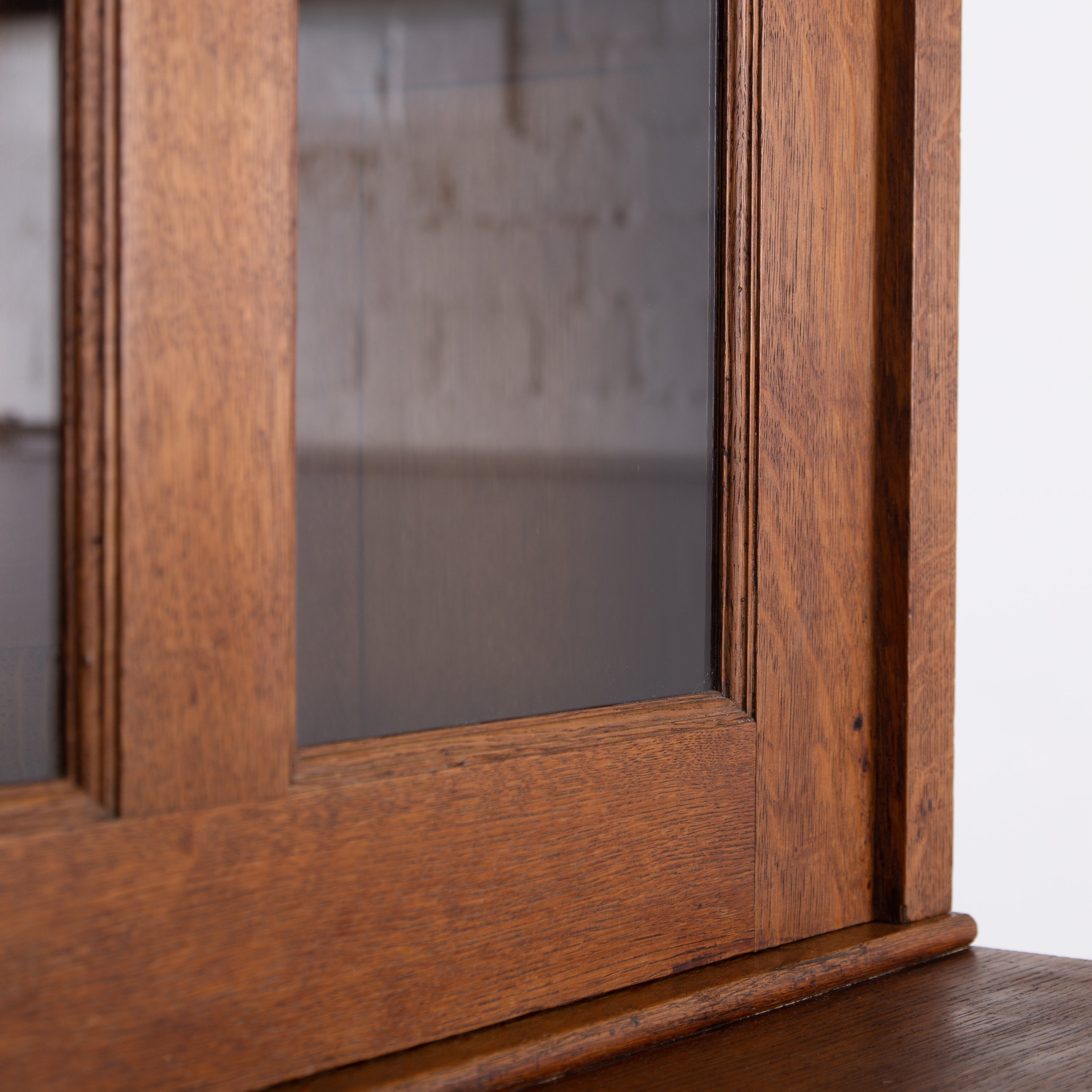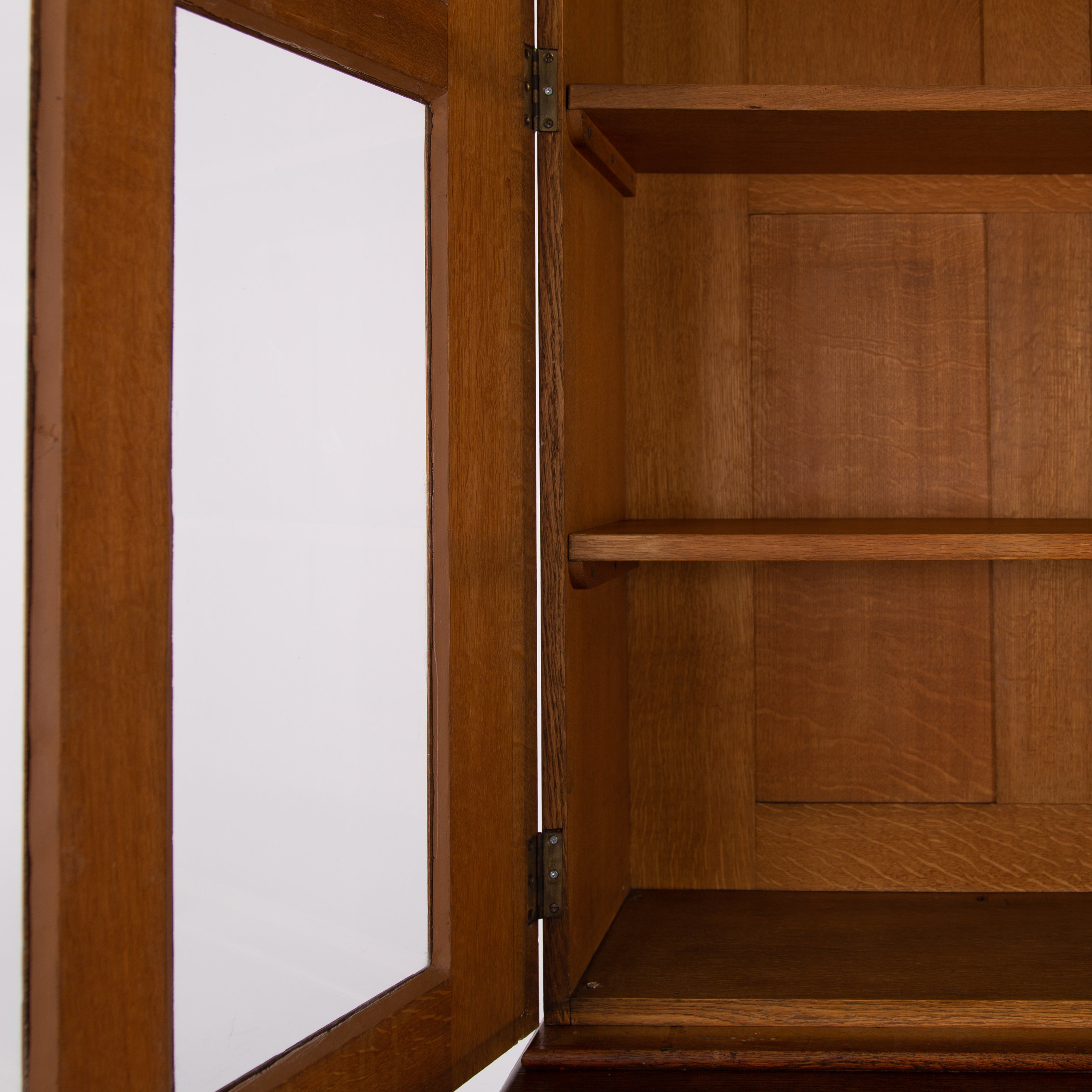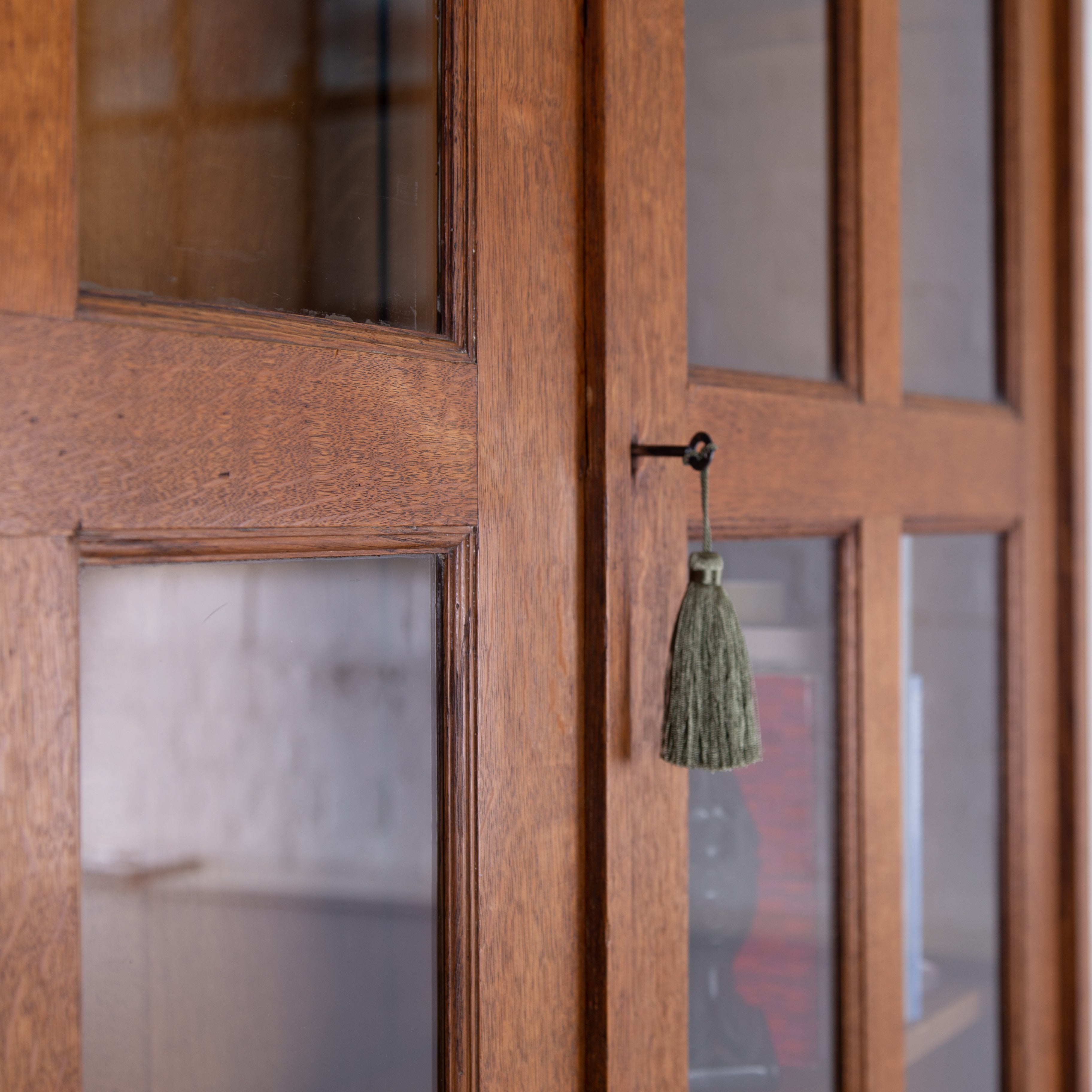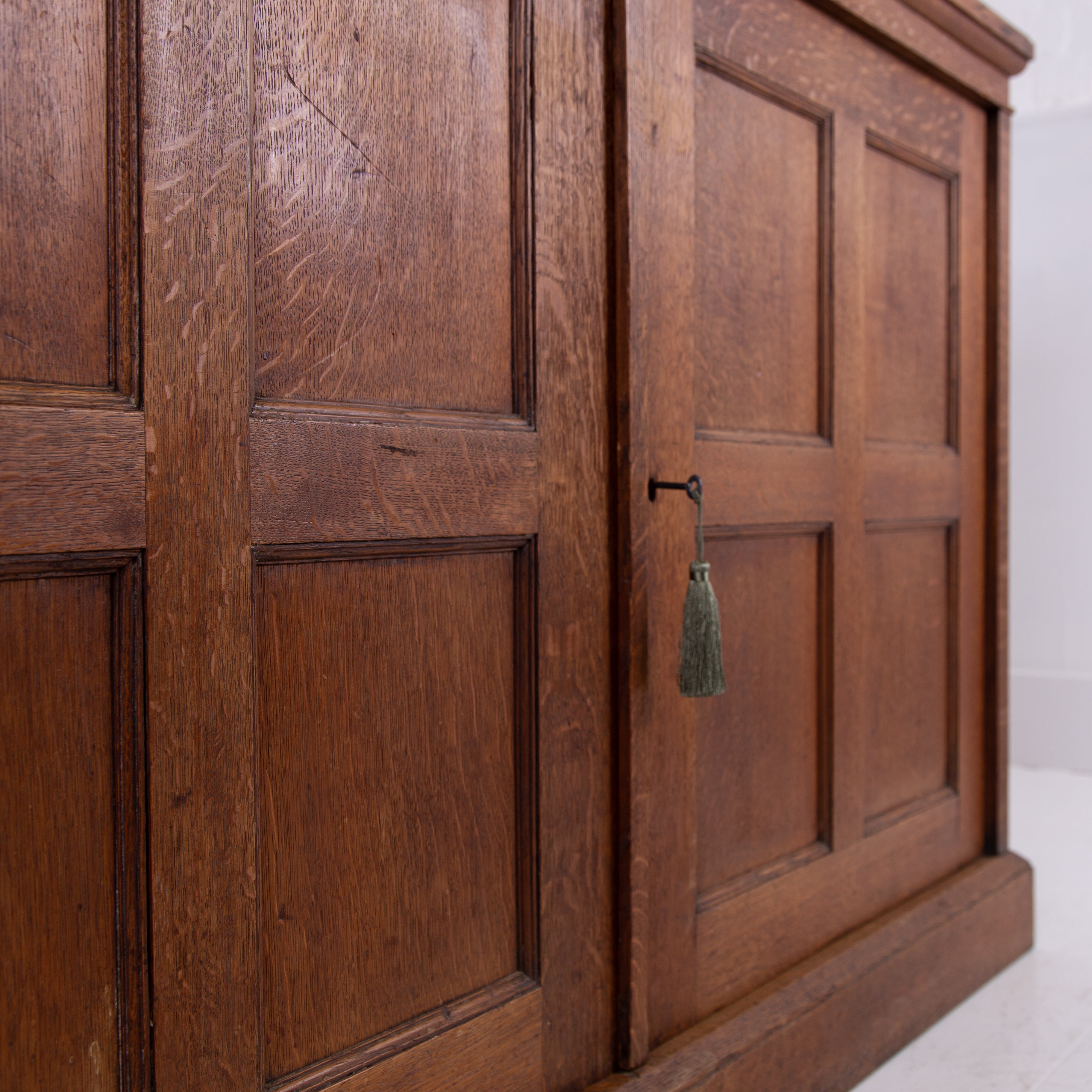 The piece incorporates a pair of panelled oak cupboard doors at the lower level which possesses a solid oak removable shelf; these are topped with a pair of oak framed glazed doors which reveal a flight of 3 solid oak shelves. We have a deep plinth to the bottom and the top has a deep decorative moulding which is all complete. The piece makes use of some quality English oak and the back is panelled. We have working locks and keys to the top and base. In all a very nice piece of furniture. Please note the bookcase does split into 2 and will be delivered as such, it's a solid and heavy piece. Please expect sensible historic wear.
