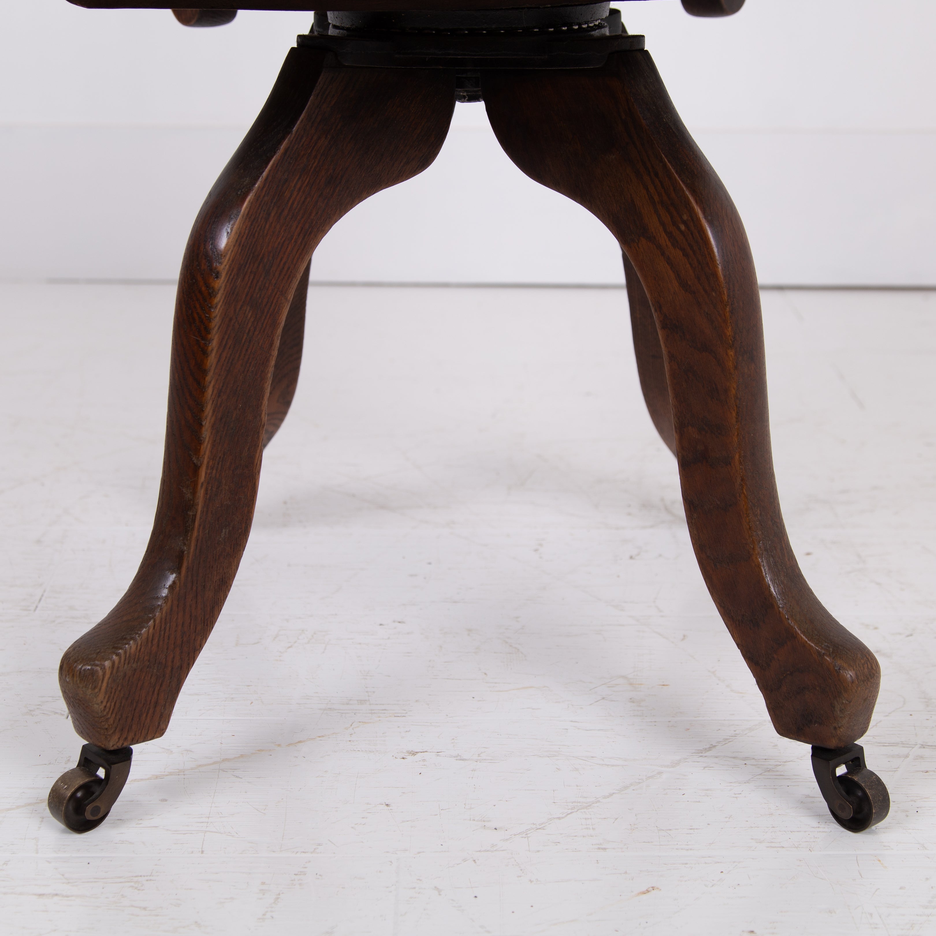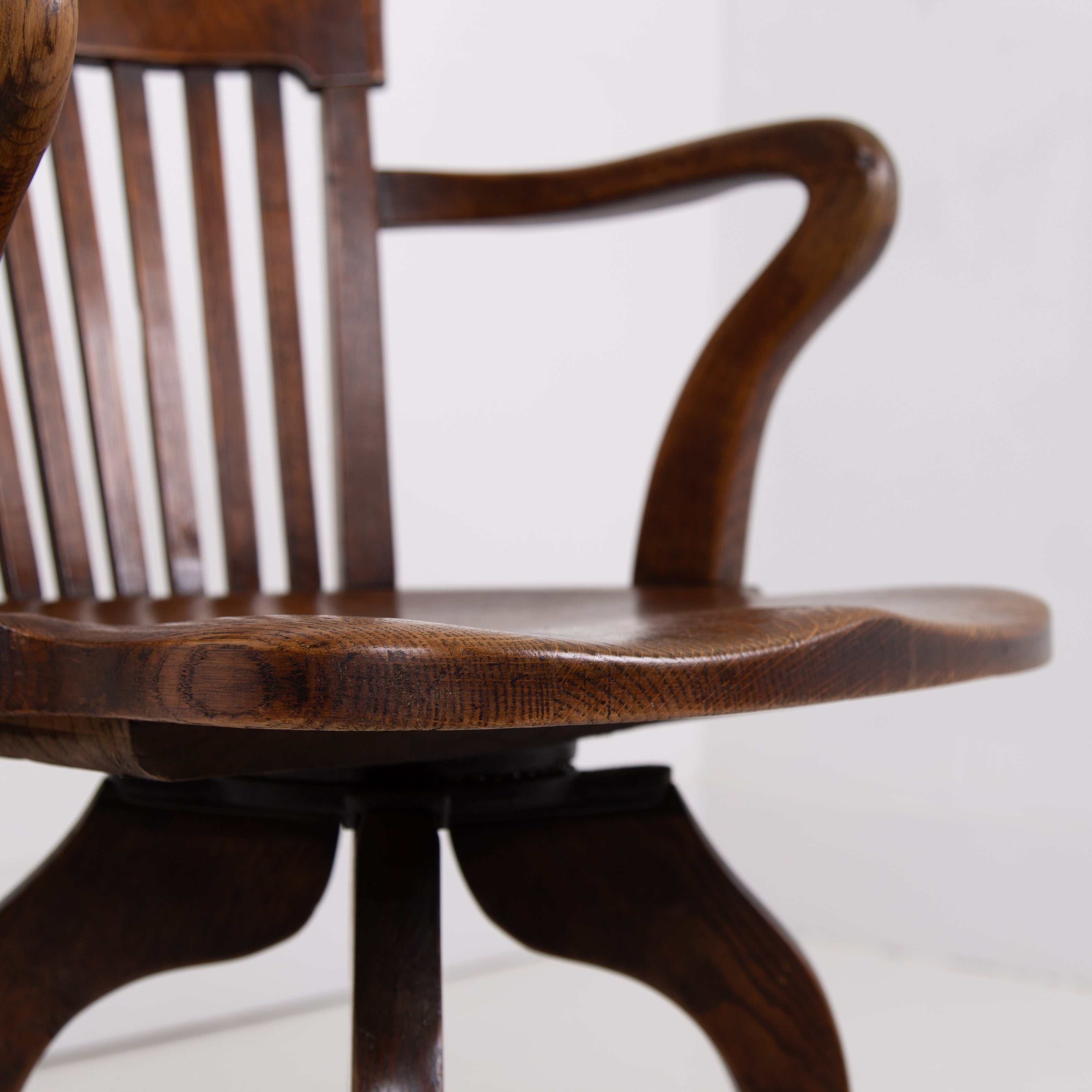 This one sits in lovely historic order with wear in the right places. The swivel mechanism is working well and the shaped seat makes it more comfortable than some. It also is a little smaller than some of its counterparts with a fixed seat height. We have lightly waxed the chair and ensured it is ready for use.