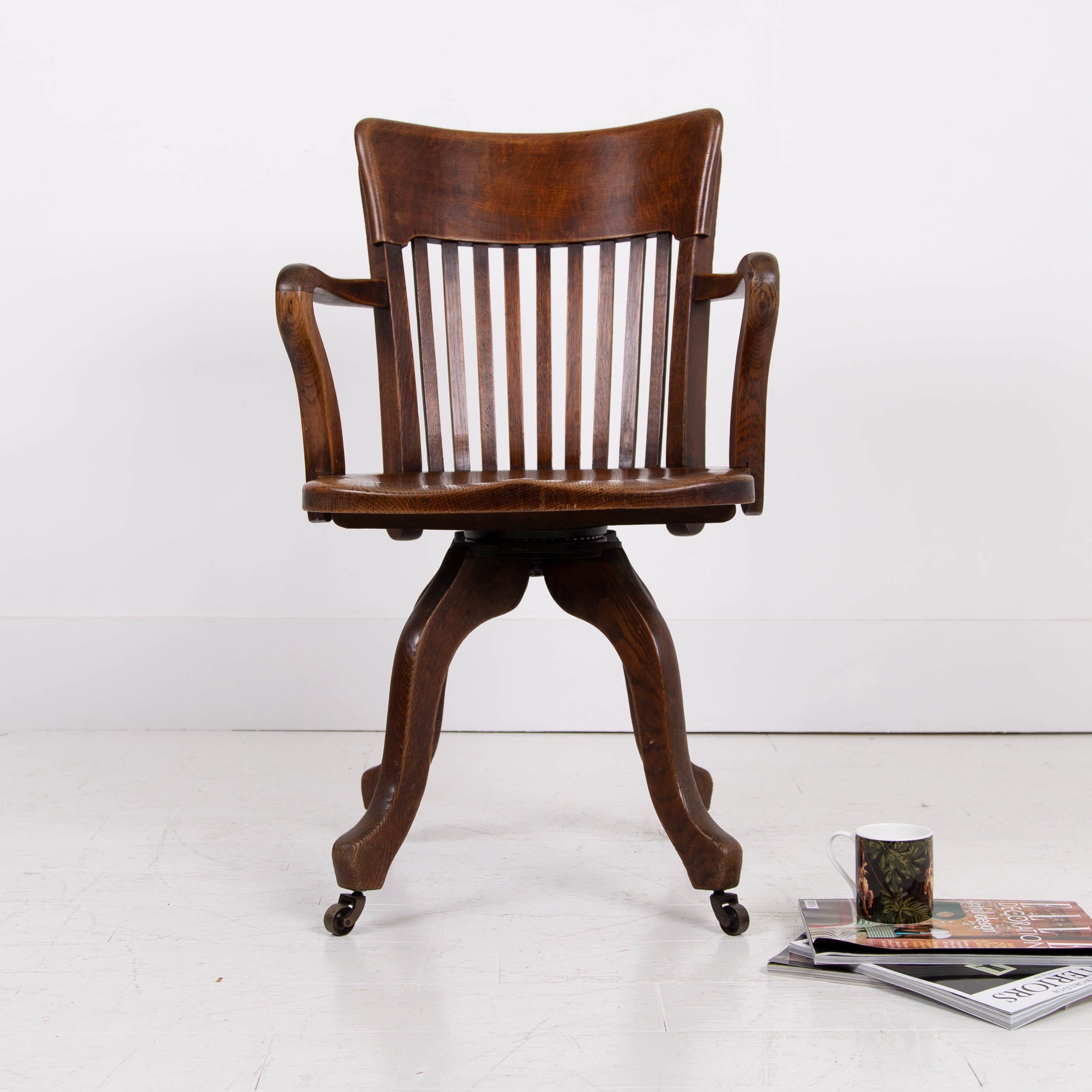 A rather handsome English oak swivel desk chair with pleasing on the eye design and ready for work after a light session in our workshop. Very likely Cookes of Finsbury.