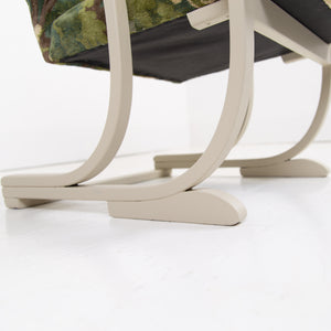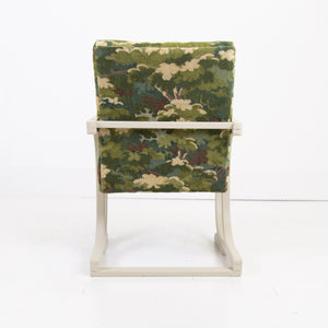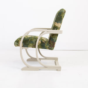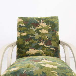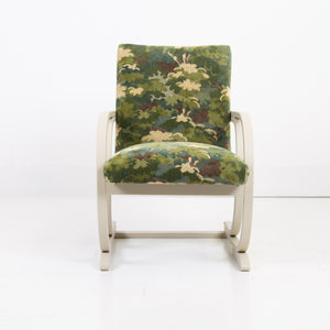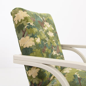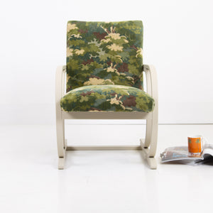It has enjoyed a full professional reupholstery by our upholsterer. The fabric is by Duresta, in a tree top foliage pattern which works very nicely with the frame and the deco era.
