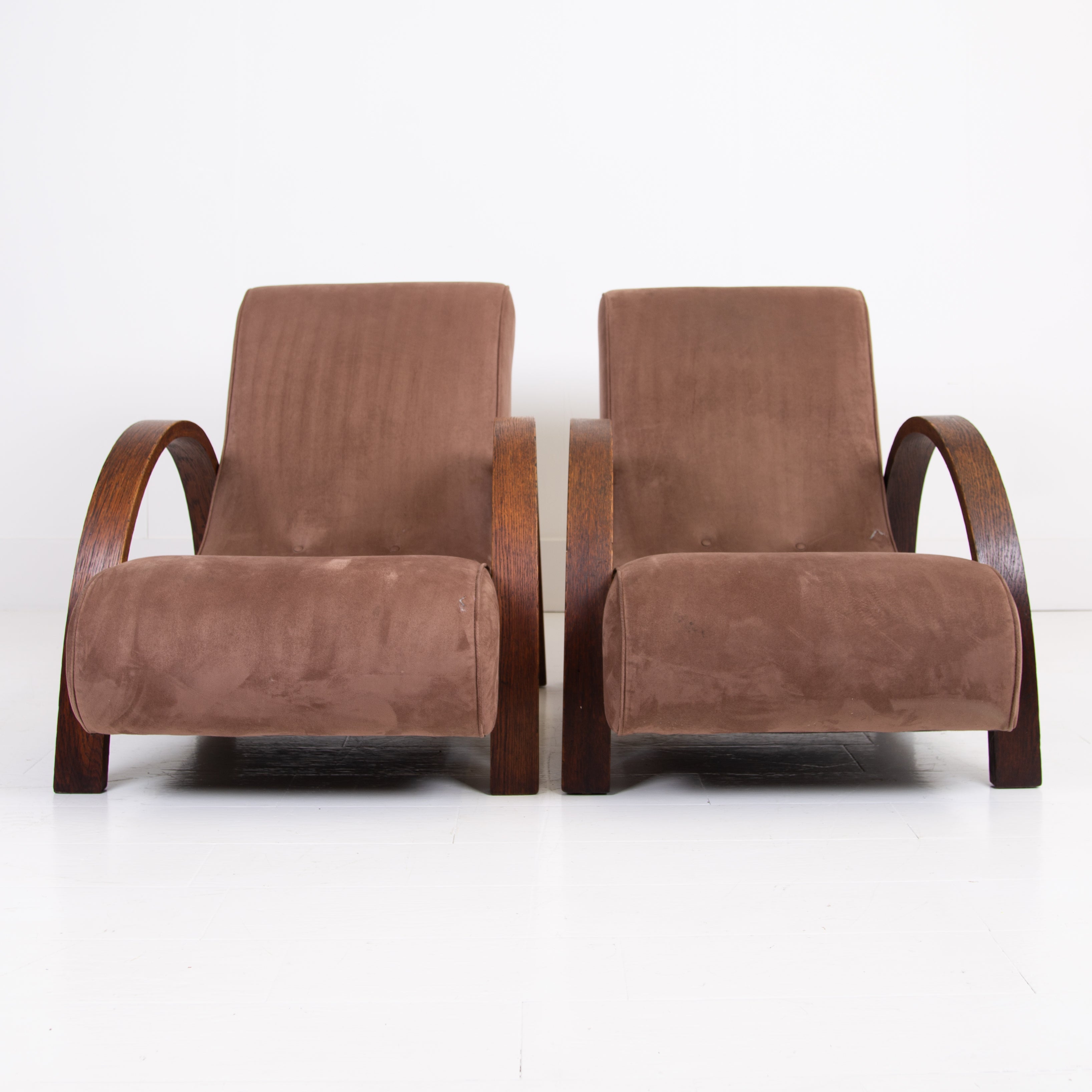 Both armchairs with those great looking sweeping deco inspired oak bentwood arms are in similar condition - the current fabric a milk chocolate toned faux suede is usable if you want with wear and with small rips in both. We have lightly waxed the oak and they sit firm with tight joints etc.